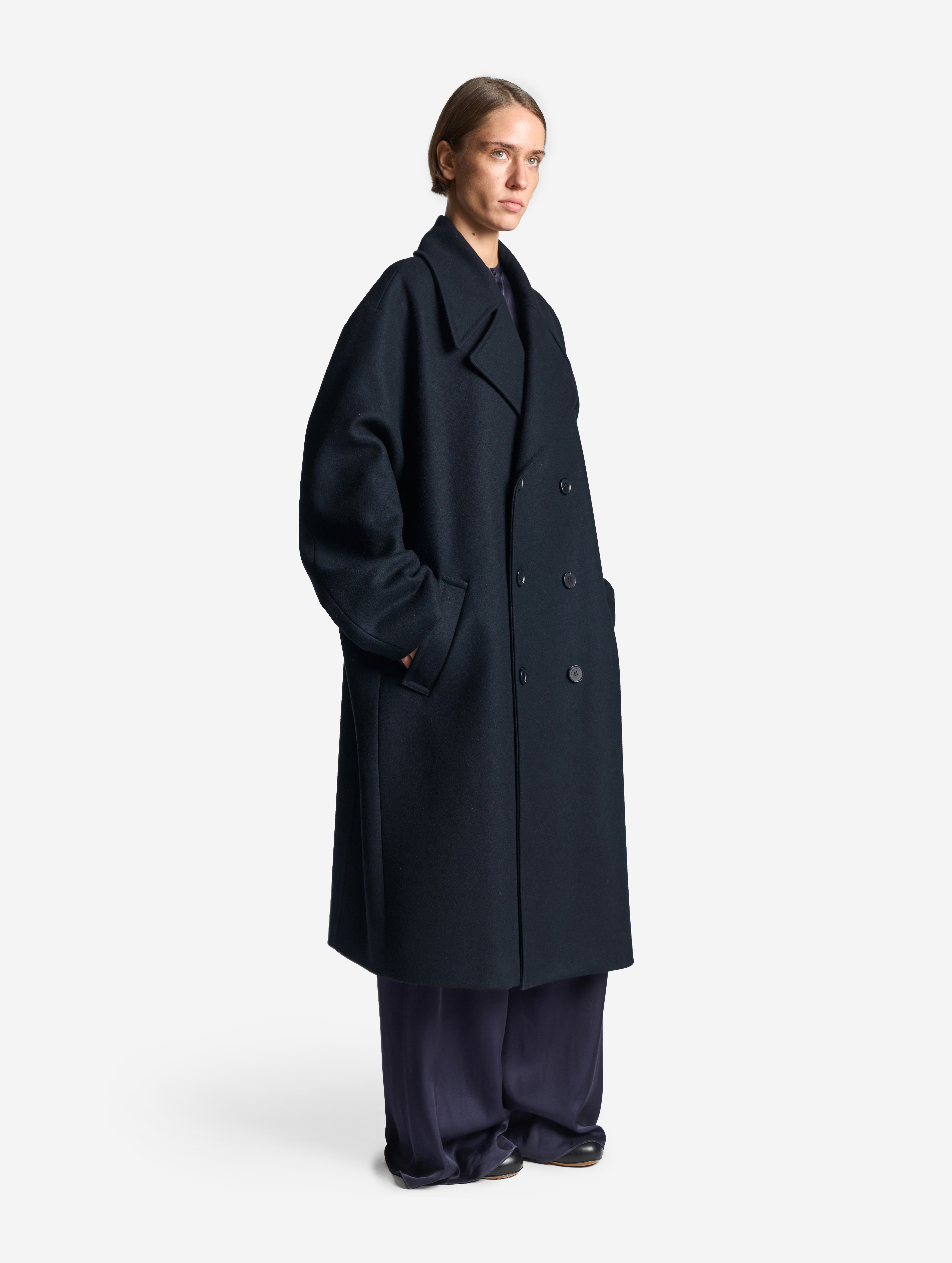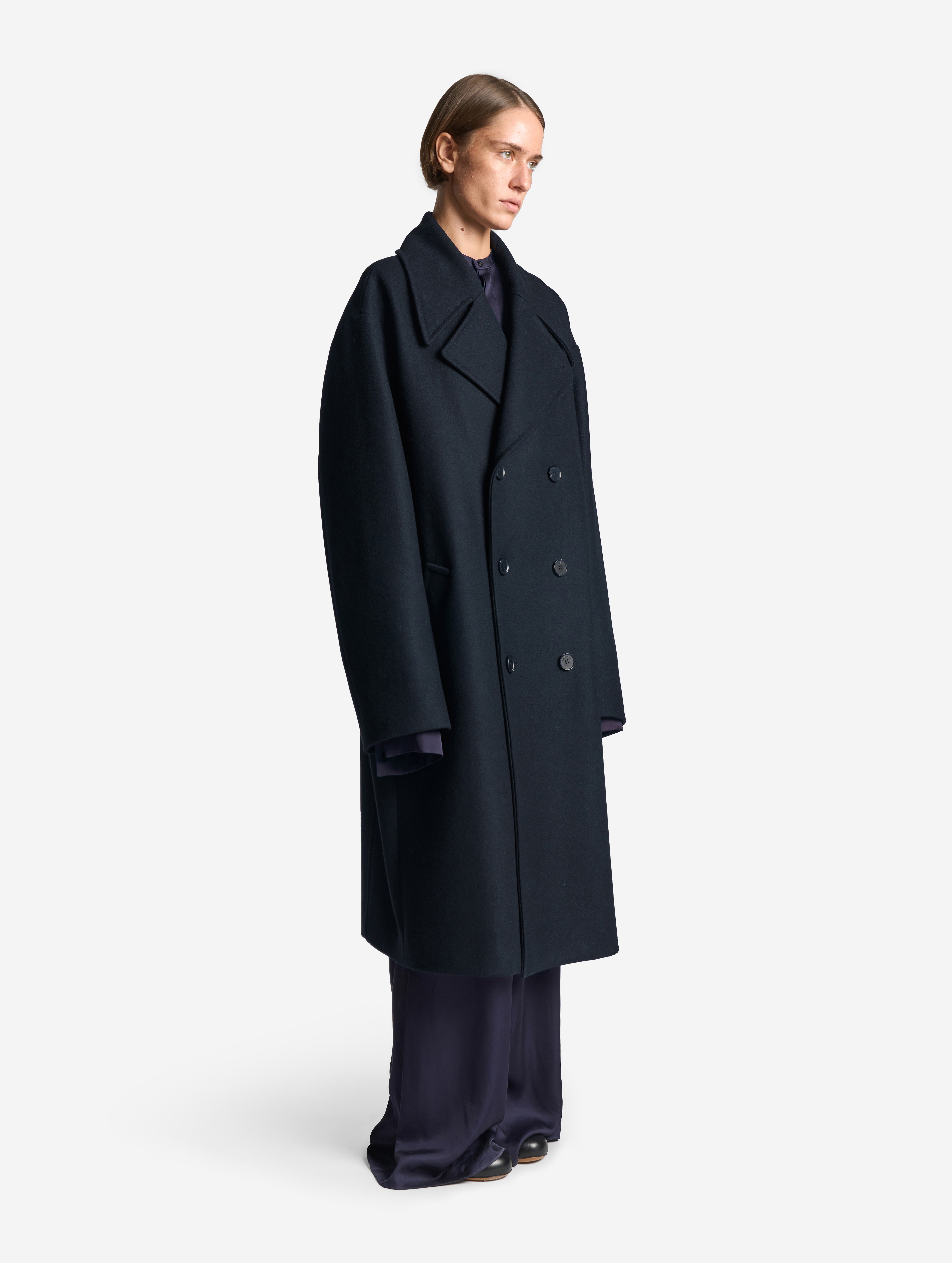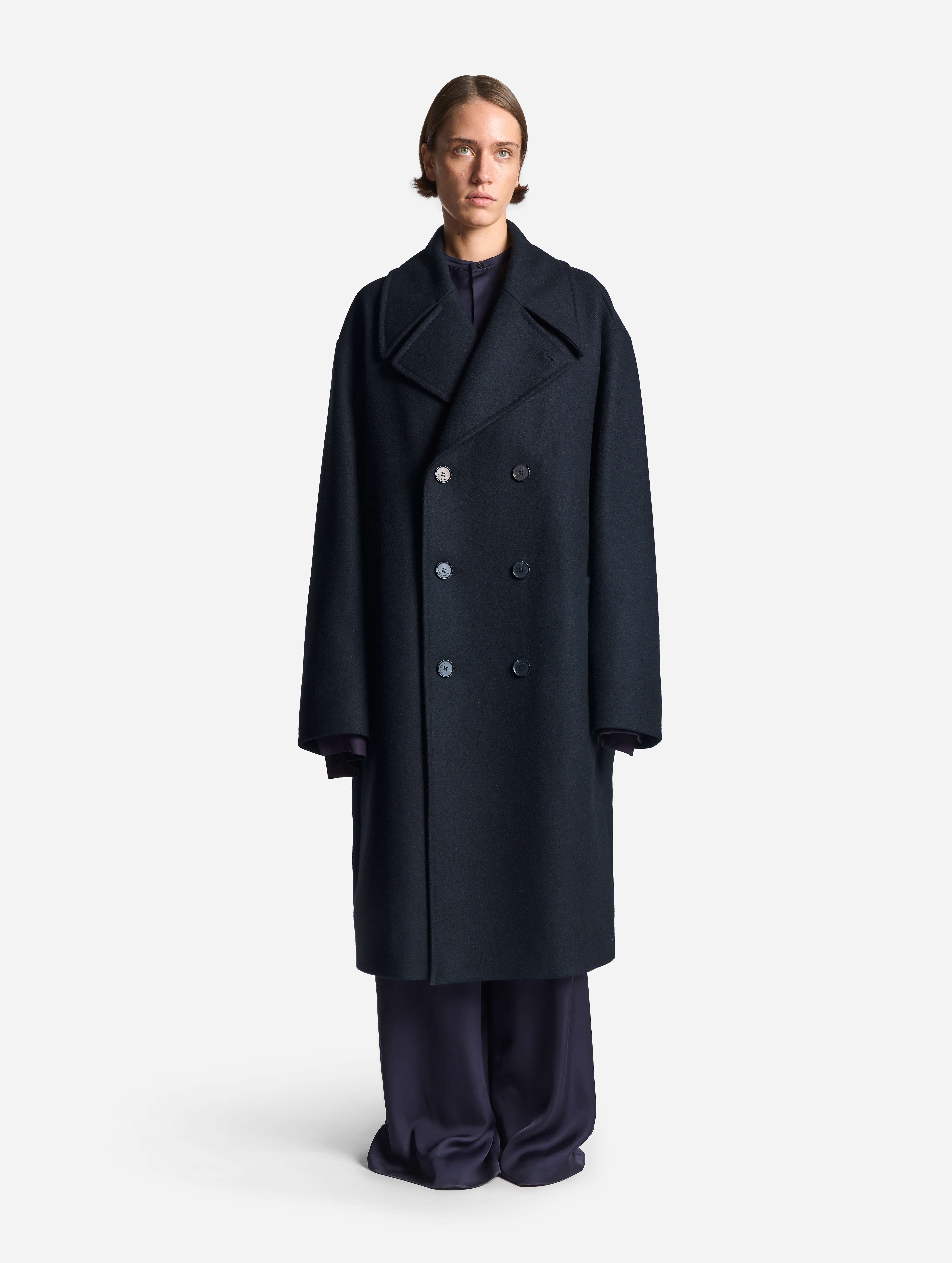 A coat with a voluminous English collar is made of thick cloth. The piece has a straight voluminous silhouette and rolled shoulder. Universal fit makes the coat suitable not only for women, but for men too. The long sleeves can be rolled up if you want – the lower part of the sleeve lining is made of shirt cotton for this exact case. The coat is lined with polyviscose lining. It fastens with buttons reinforced with counterbuttons. The left sleeve is decorated with a branded Garderobe patch.
