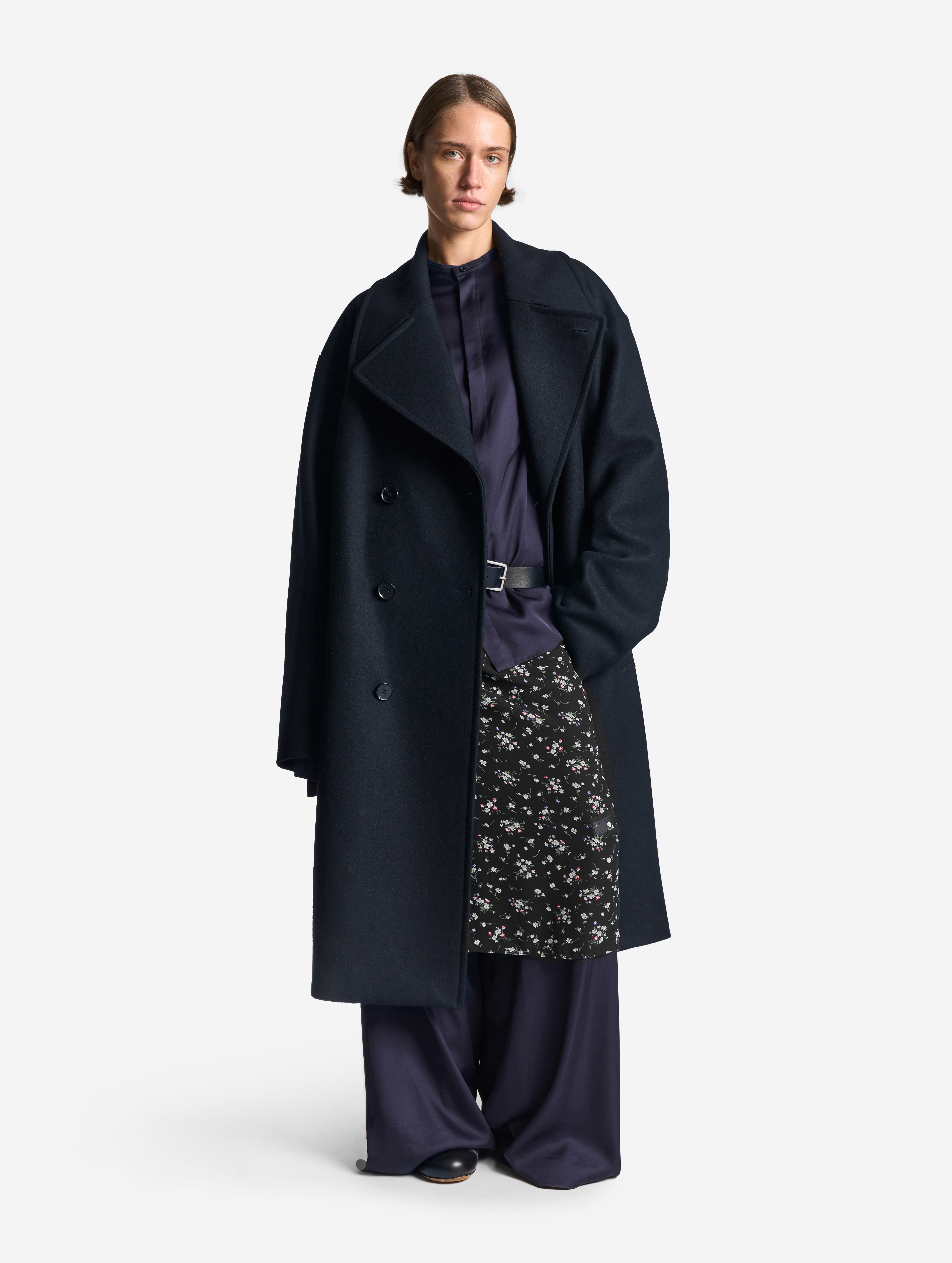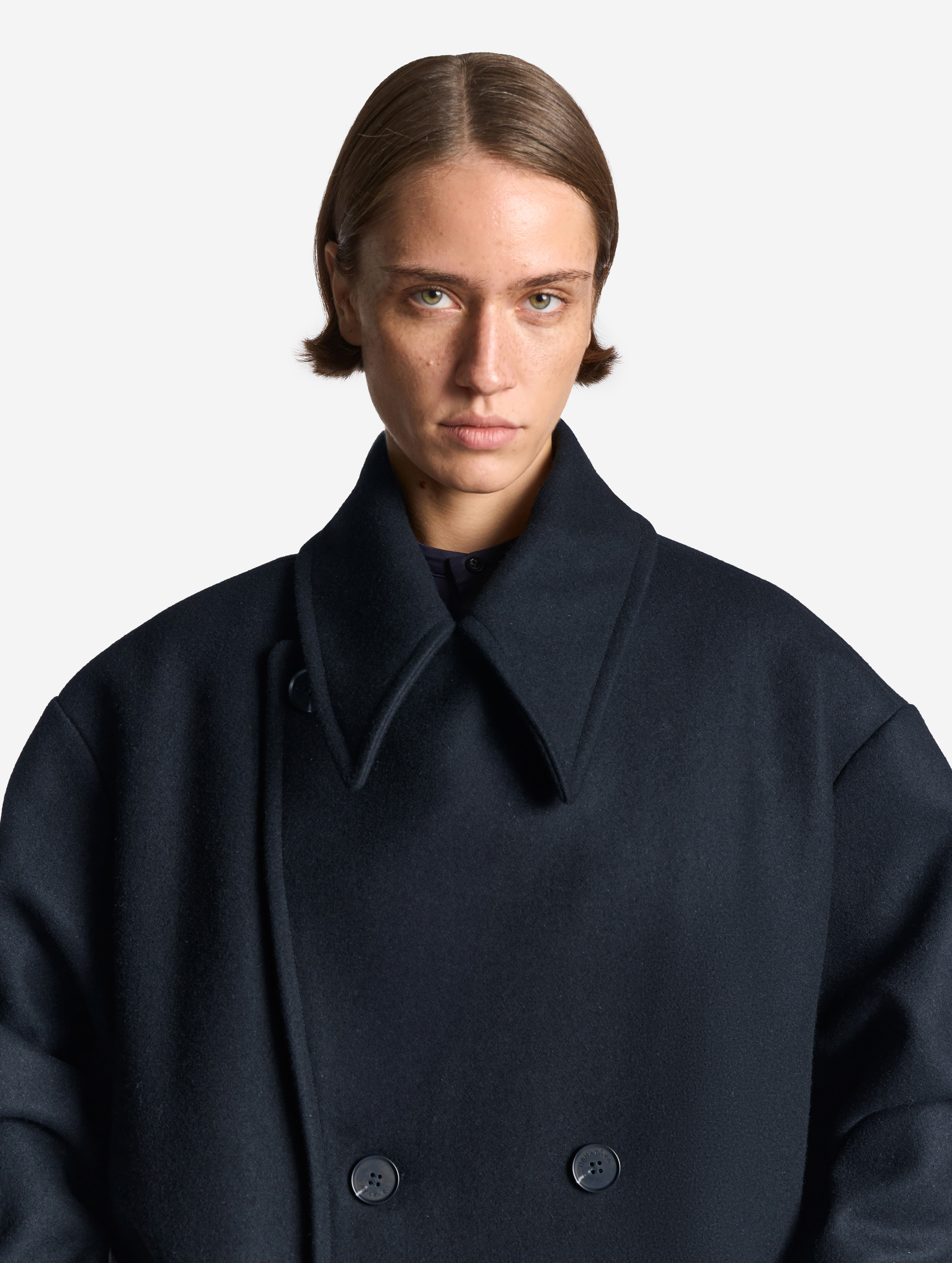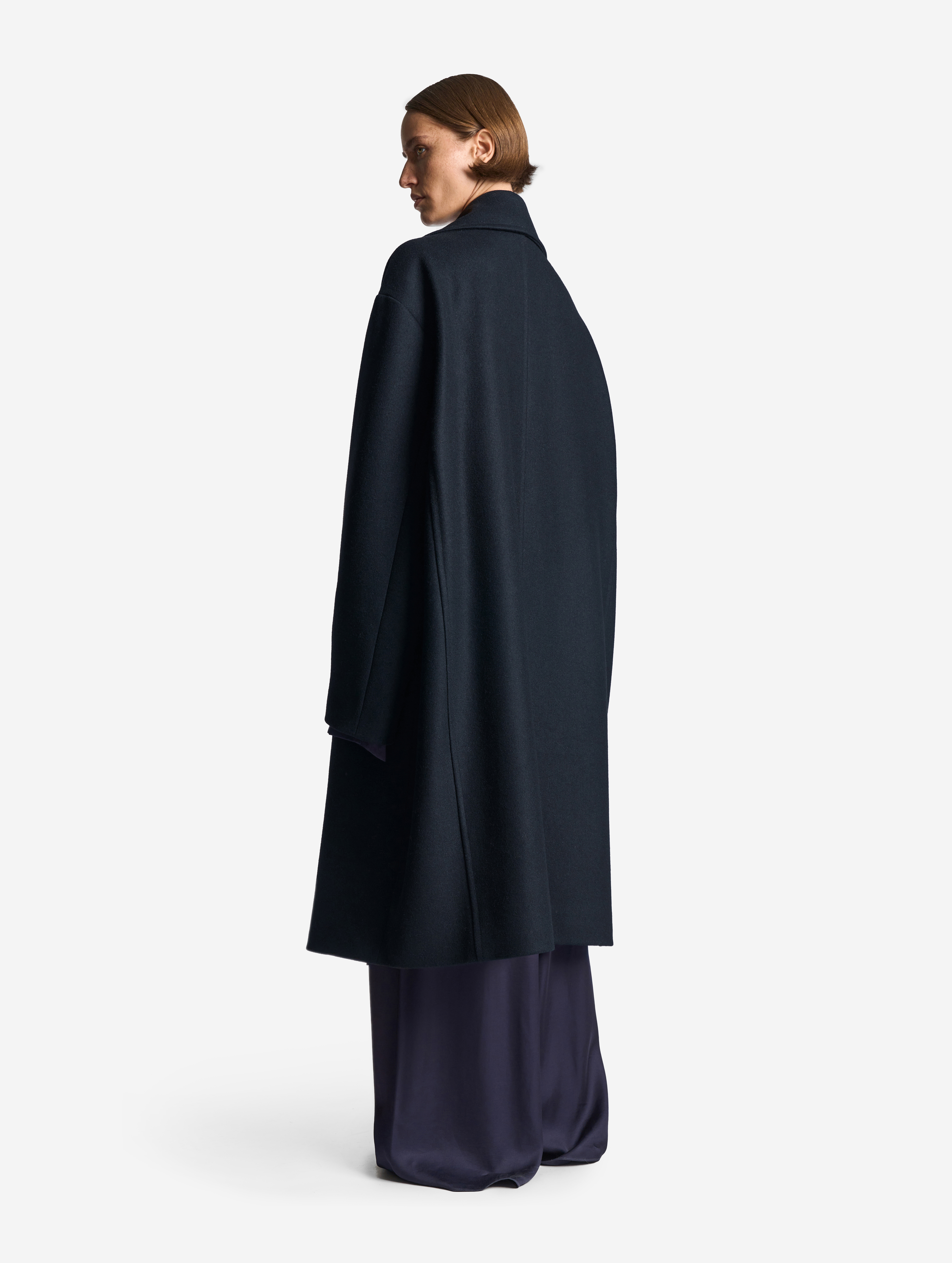 A coat with a voluminous English collar is made of thick cloth. The piece has a straight voluminous silhouette and rolled shoulder. Universal fit makes the coat suitable not only for women, but for men too. The long sleeves can be rolled up if you want – the lower part of the sleeve lining is made of shirt cotton for this exact case. The coat is lined with polyviscose lining. It fastens with buttons reinforced with counterbuttons. The left sleeve is decorated with a branded Garderobe patch.