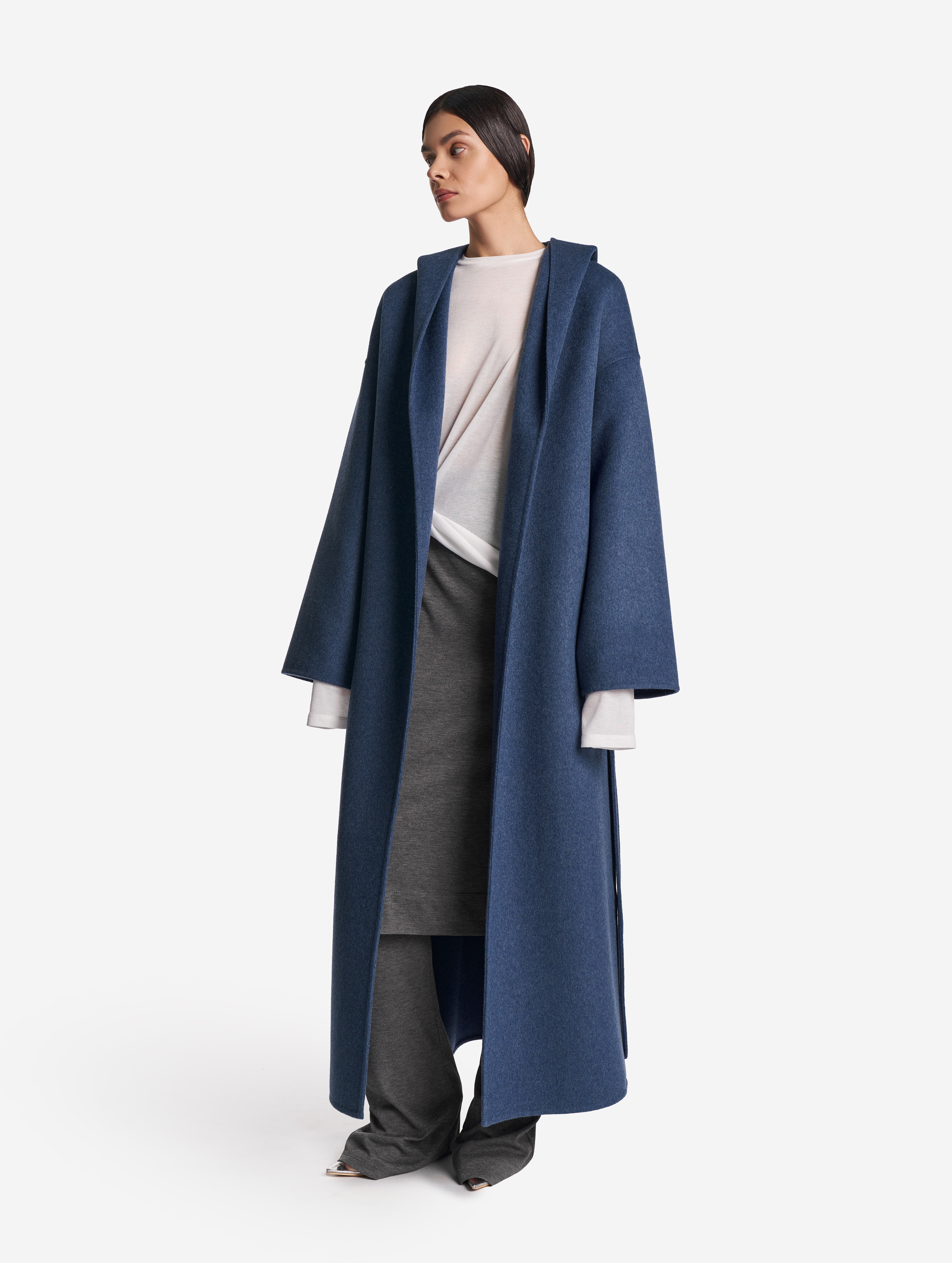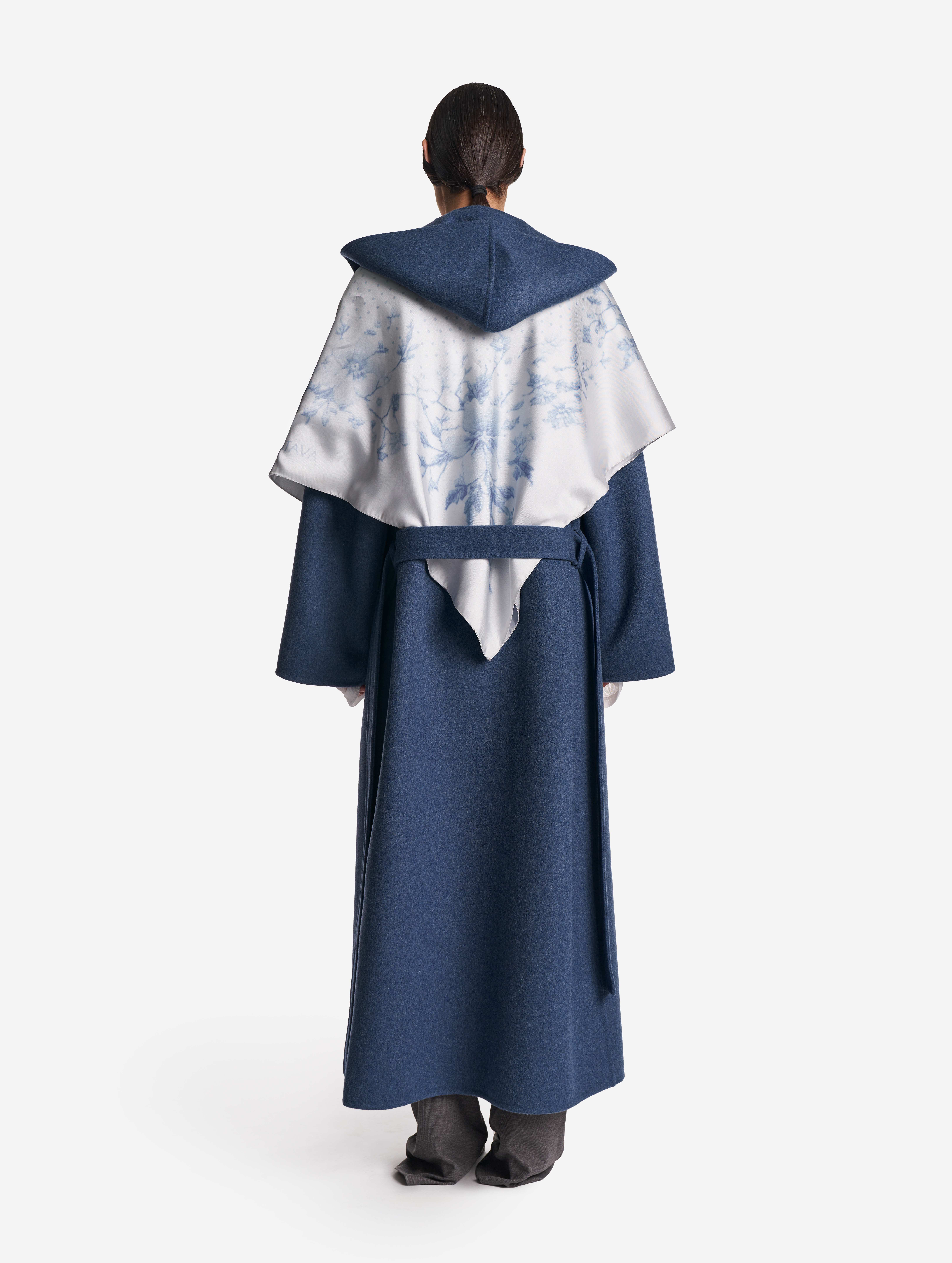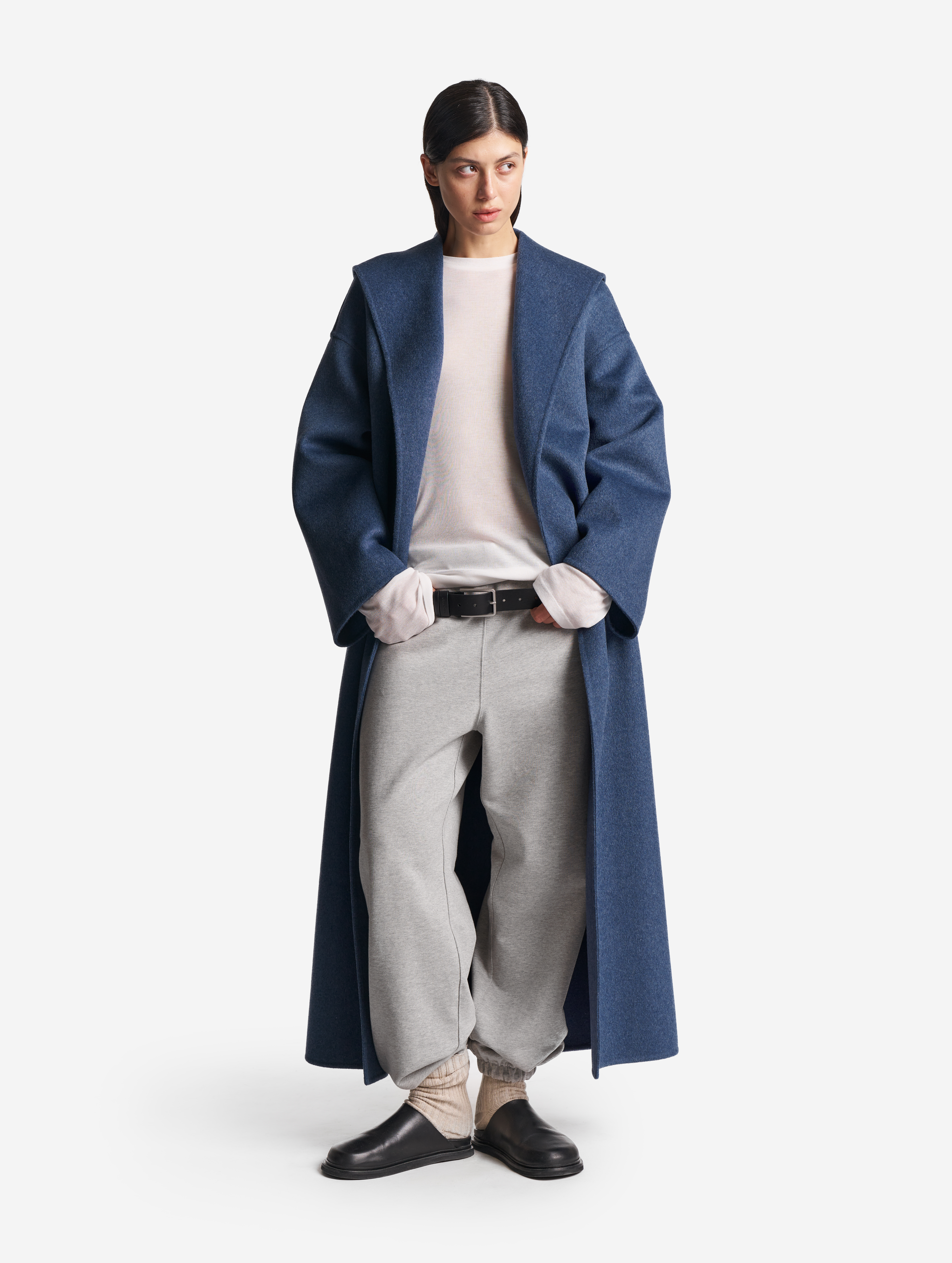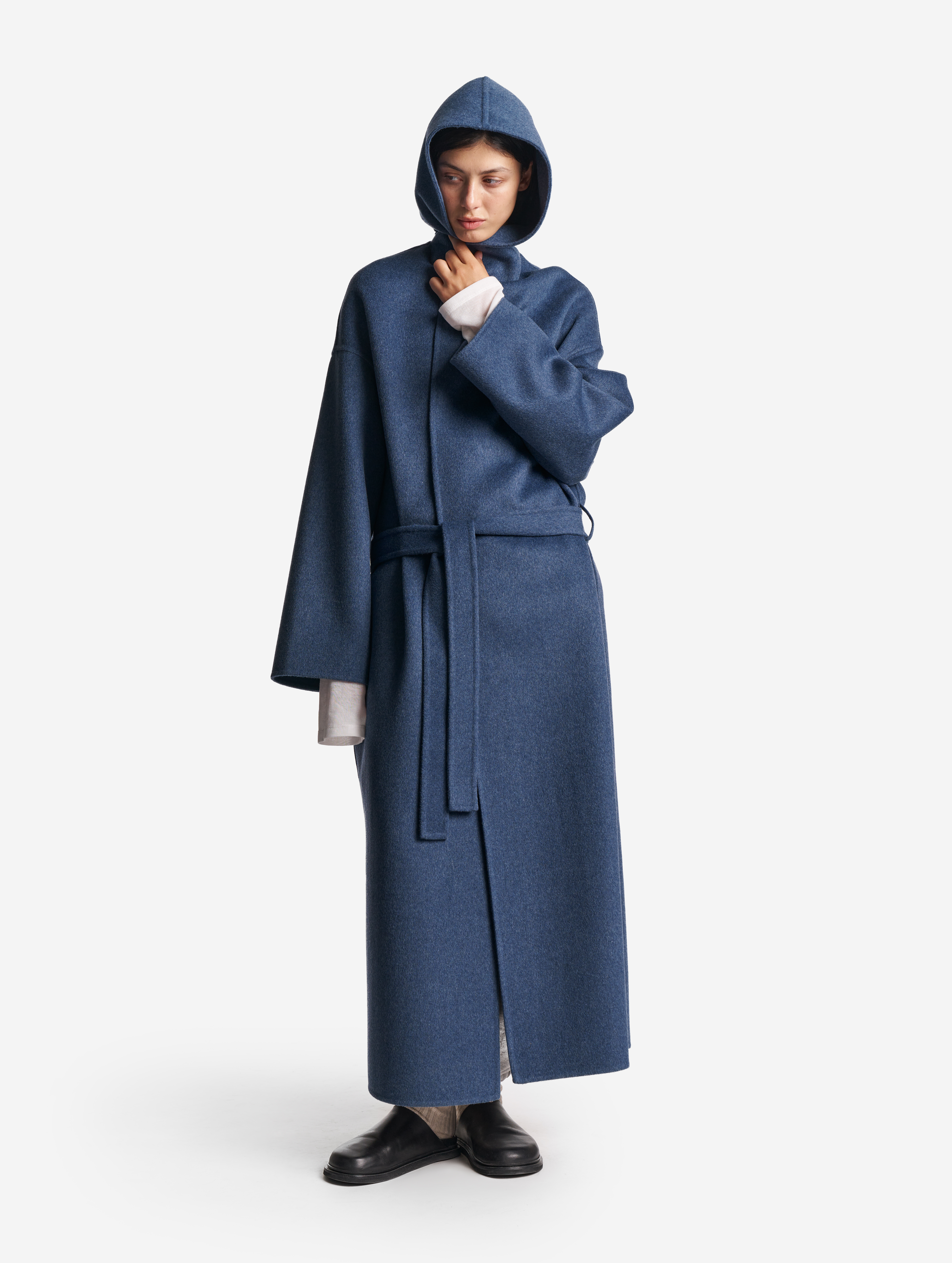 The gown-style trench coat is created using the same technology as our shawl collar coat – all seams are sealed and invisible to the eye. This piece has a big hood and wide, kimono-like sleeves. Formal minimalism is embodied not only in the silhouette – the coat has no pockets or fasteners. Comes with a long belt. Recommended temperature range: worn with a warm sweater – from +5°C to -5°C.
