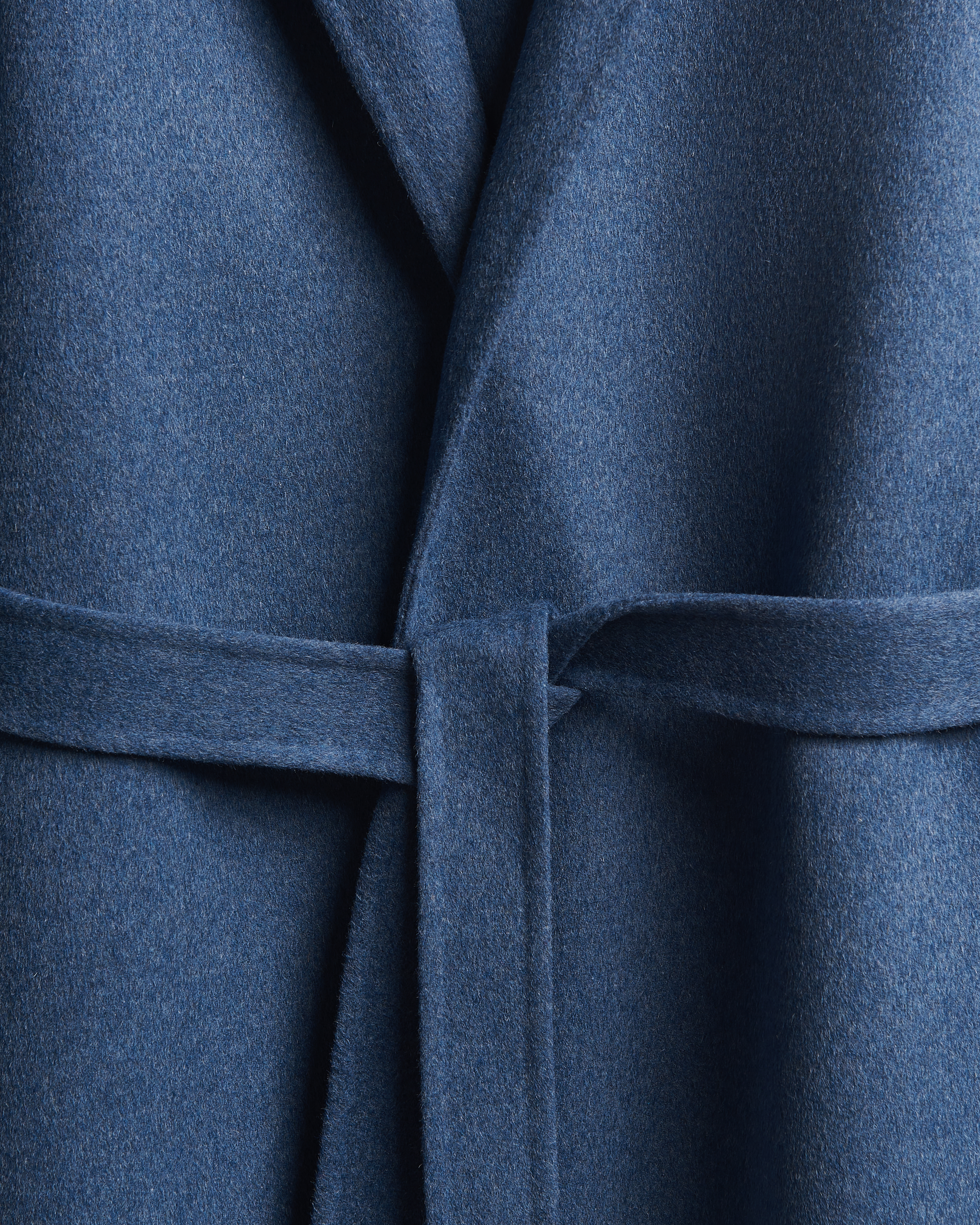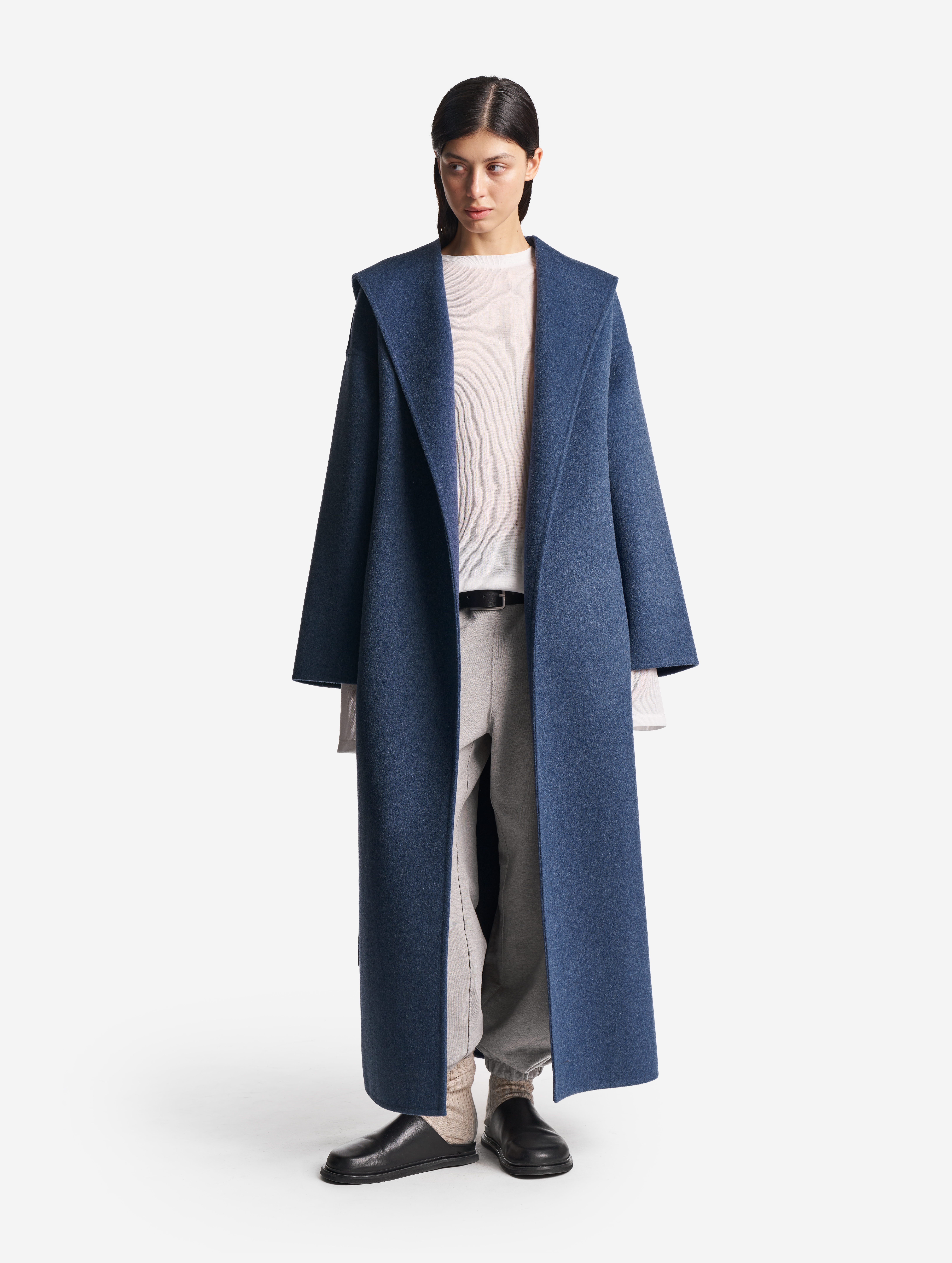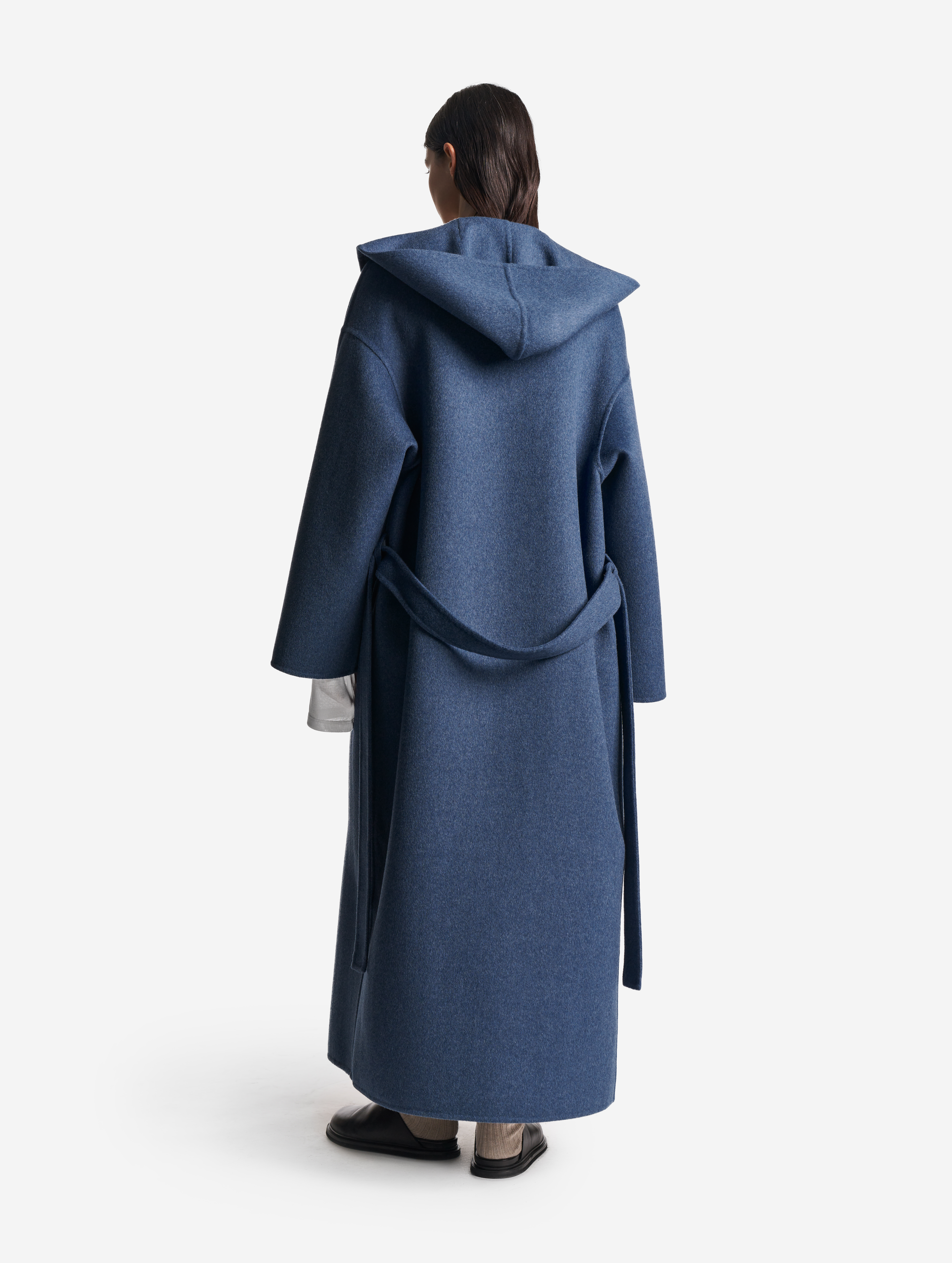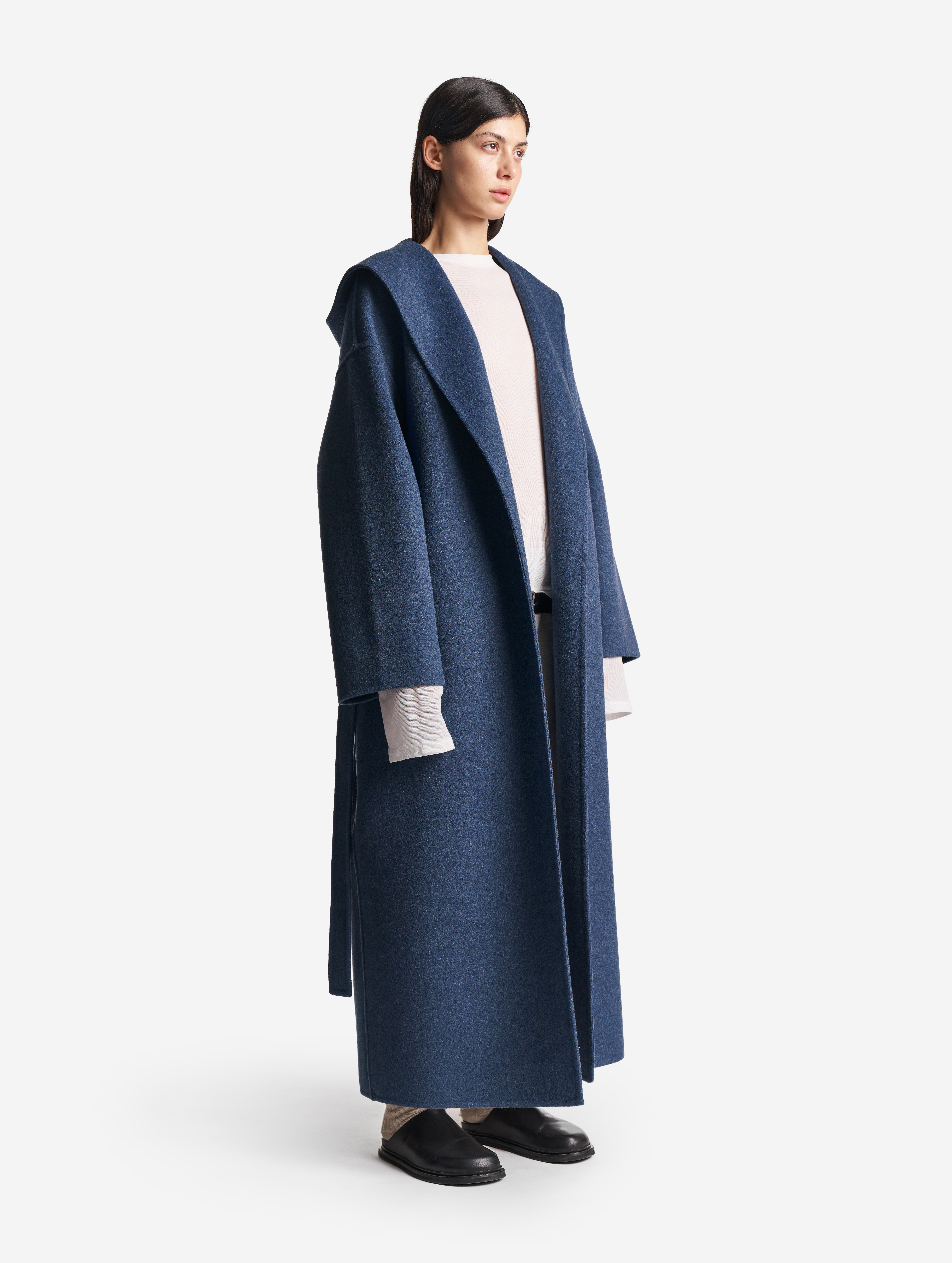 The gown-style trench coat is created using the same technology as our shawl collar coat – all seams are sealed and invisible to the eye. This piece has a big hood and wide, kimono-like sleeves. Formal minimalism is embodied not only in the silhouette – the coat has no pockets or fasteners. Comes with a long belt. Recommended temperature range: worn with a warm sweater – from +5°C to -5°C.