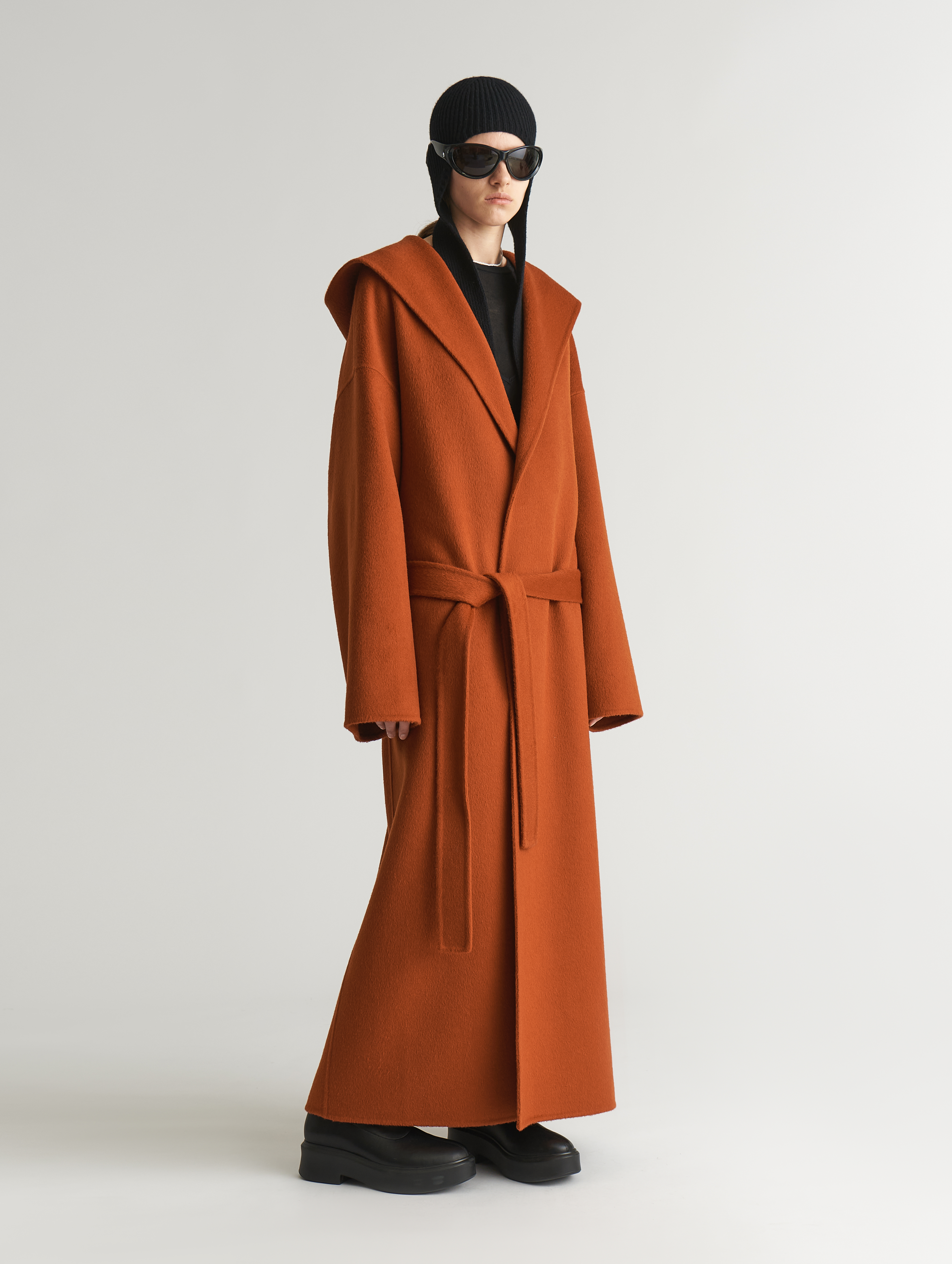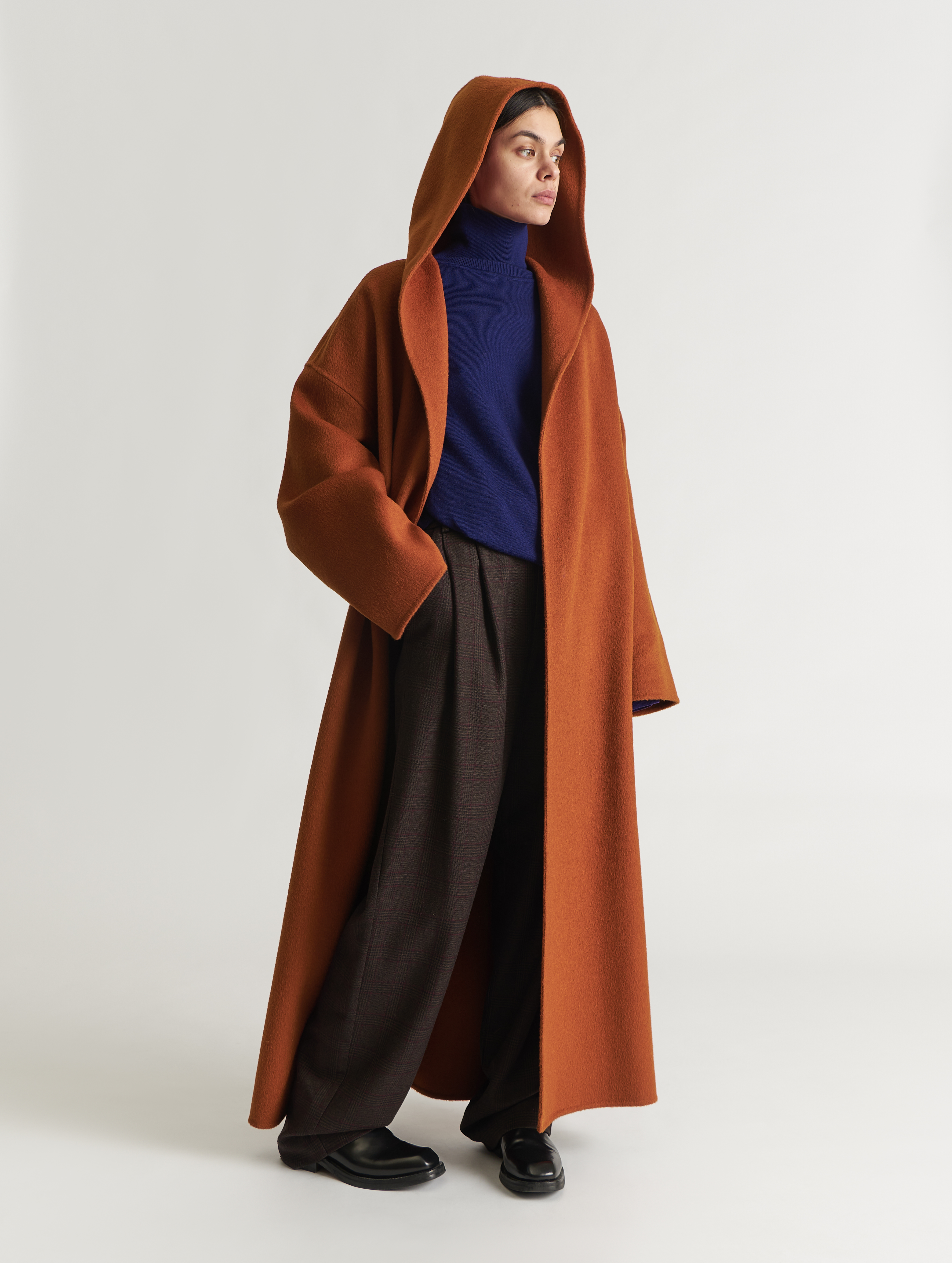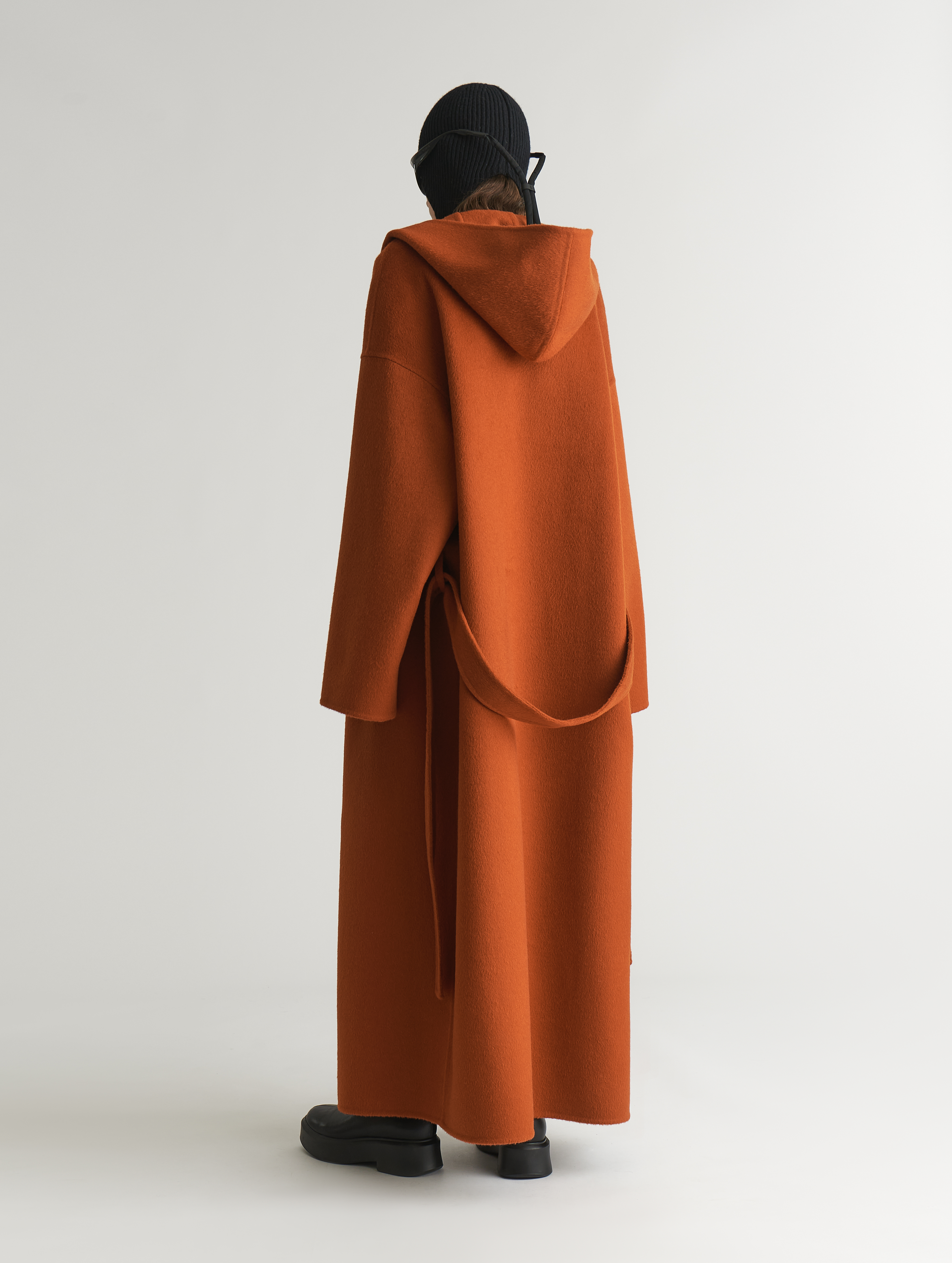 The gown-style trench coat is created using the same technology as our shawl collar coat – all seams are sealed and invisible to the eye. This piece has a big hood and wide, kimono-like sleeves. Formal minimalism is embodied not only in the silhouette – the coat has no pockets or fasteners. Comes with a long belt. Recommended temperature range: worn with a warm sweater – from +5°C to -5°C.