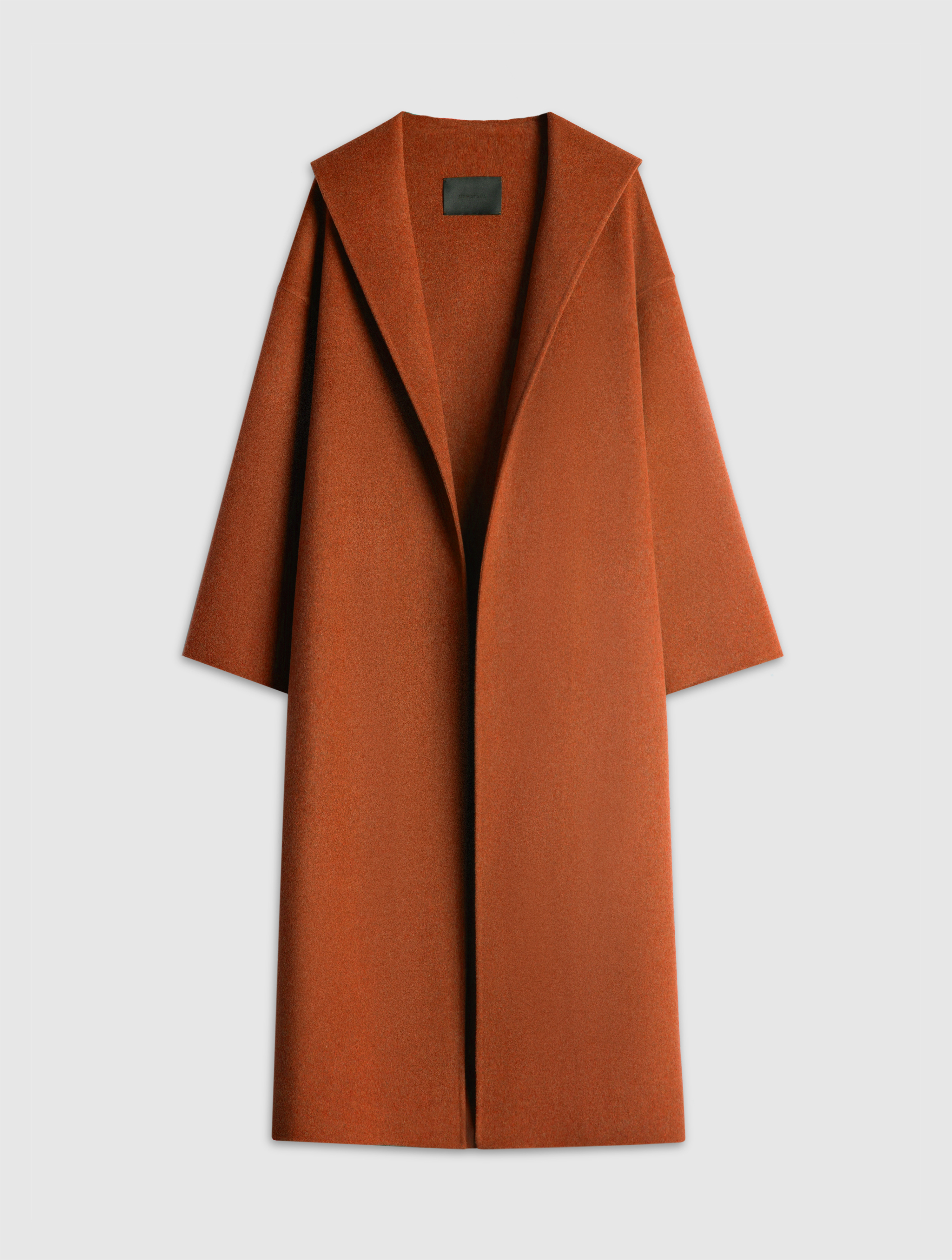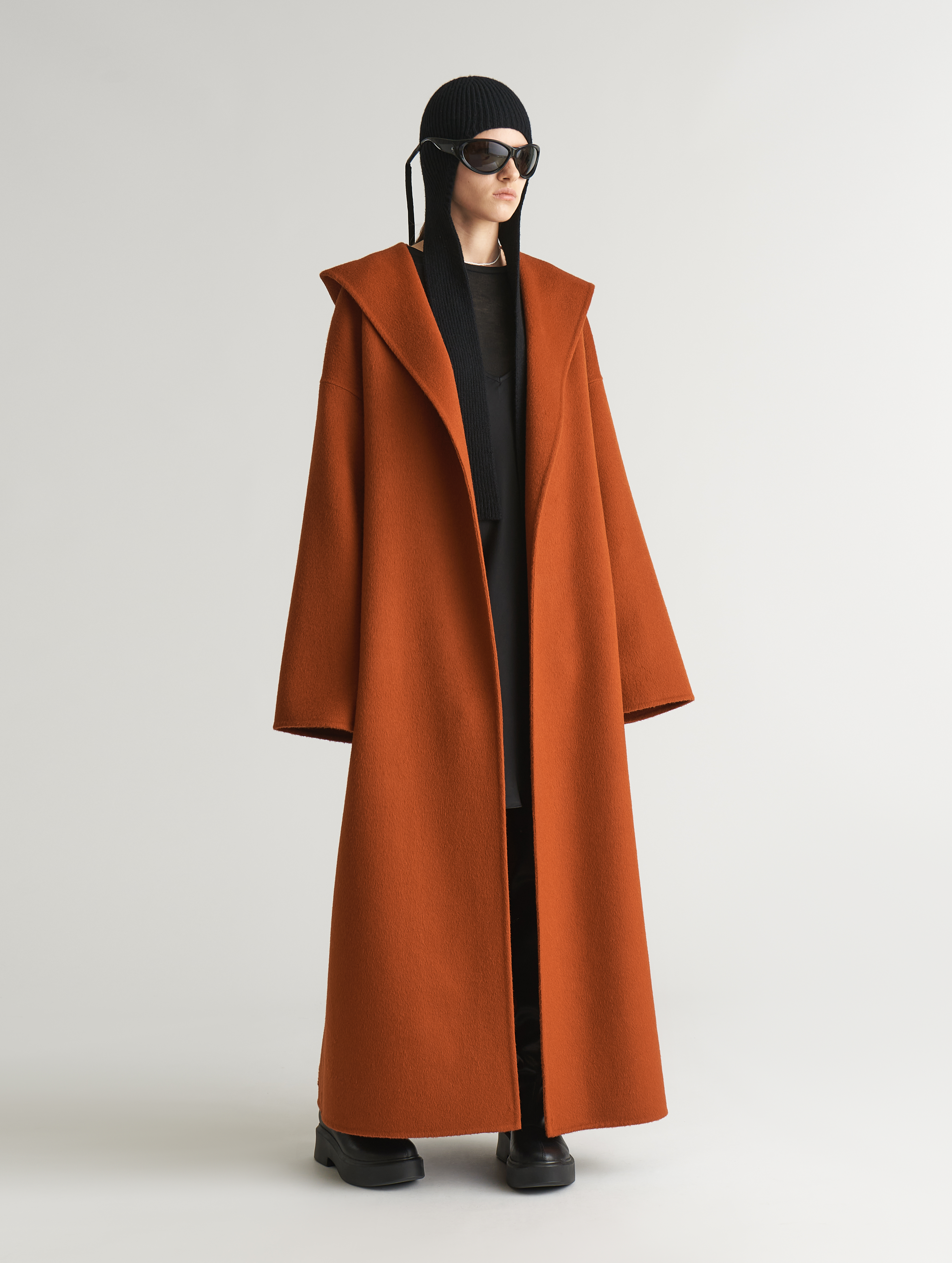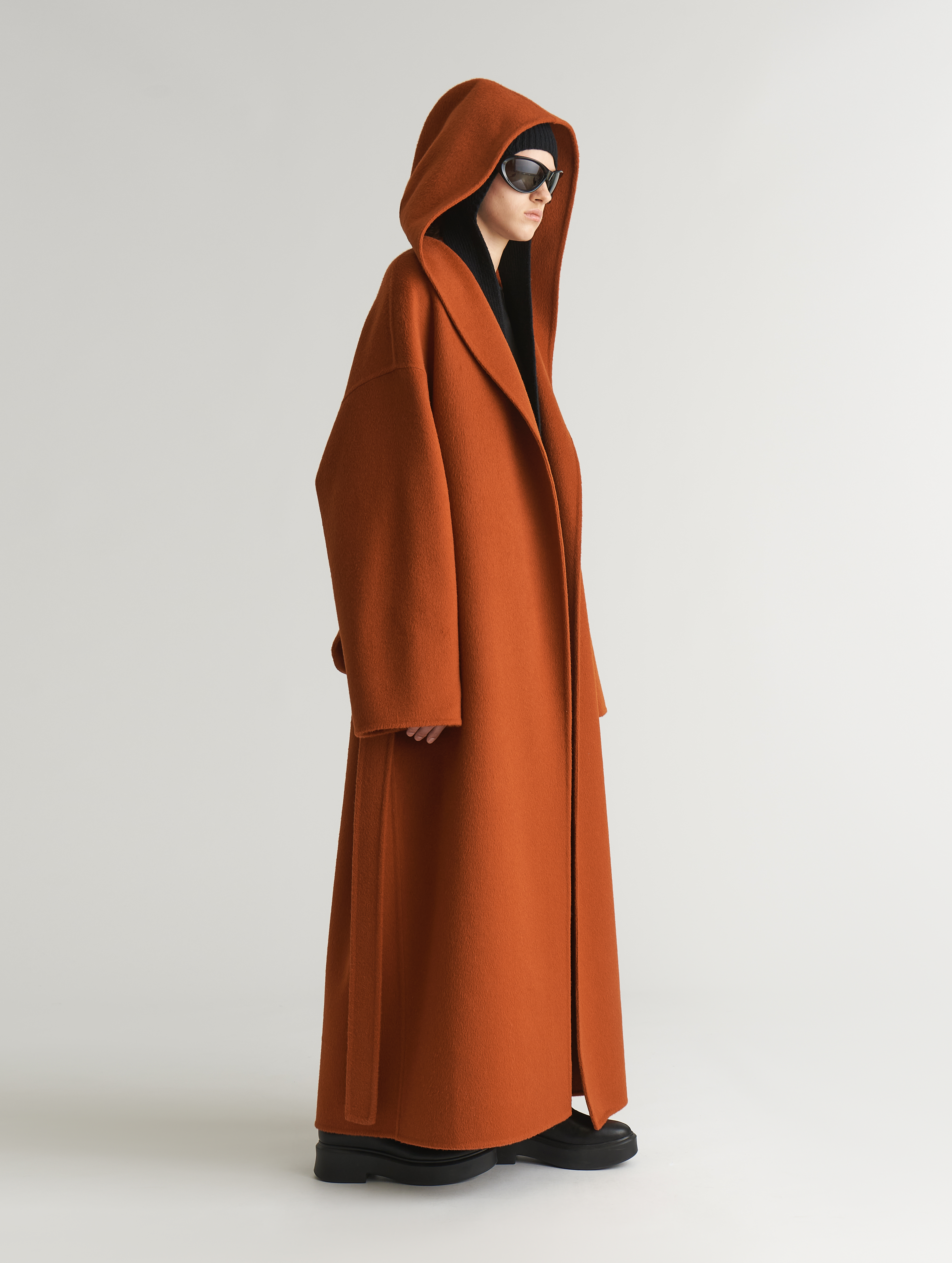 The gown-style trench coat is created using the same technology as our shawl collar coat – all seams are sealed and invisible to the eye. This piece has a big hood and wide, kimono-like sleeves. Formal minimalism is embodied not only in the silhouette – the coat has no pockets or fasteners. Comes with a long belt. Recommended temperature range: worn with a warm sweater – from +5°C to -5°C.