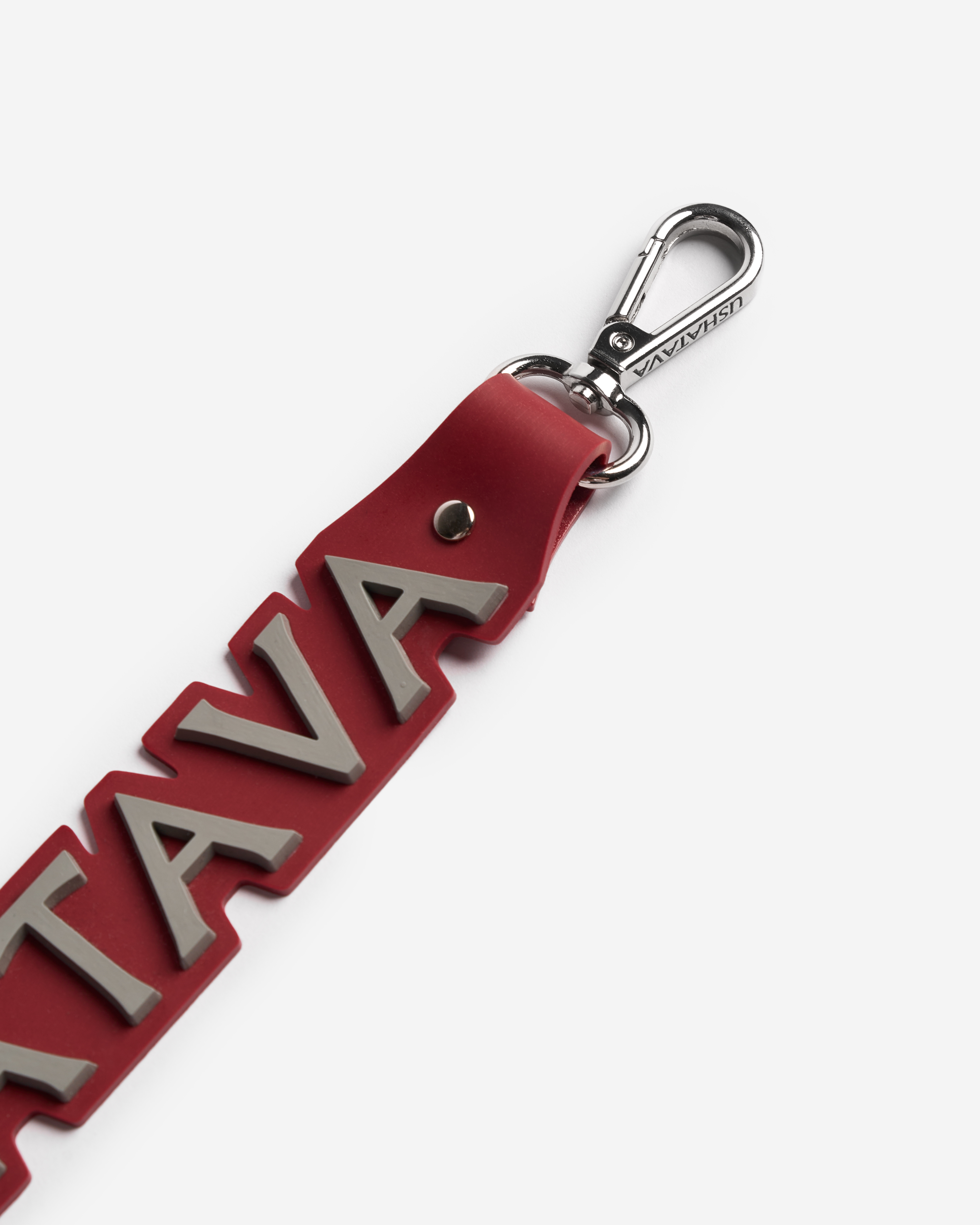 The current spelling of the fashion house's name is inspired by the very first Ushatava logo pulled from the archive. “It has a tinge of nostalgia, and at the same time it embodies our desire for the new,” says Nino Shamatava, the brand's creative director. A lobster clasp allows you to attach the silicone keychain to your keys, bag, or a jeans belt loop. It is light, durable, and pliable.
