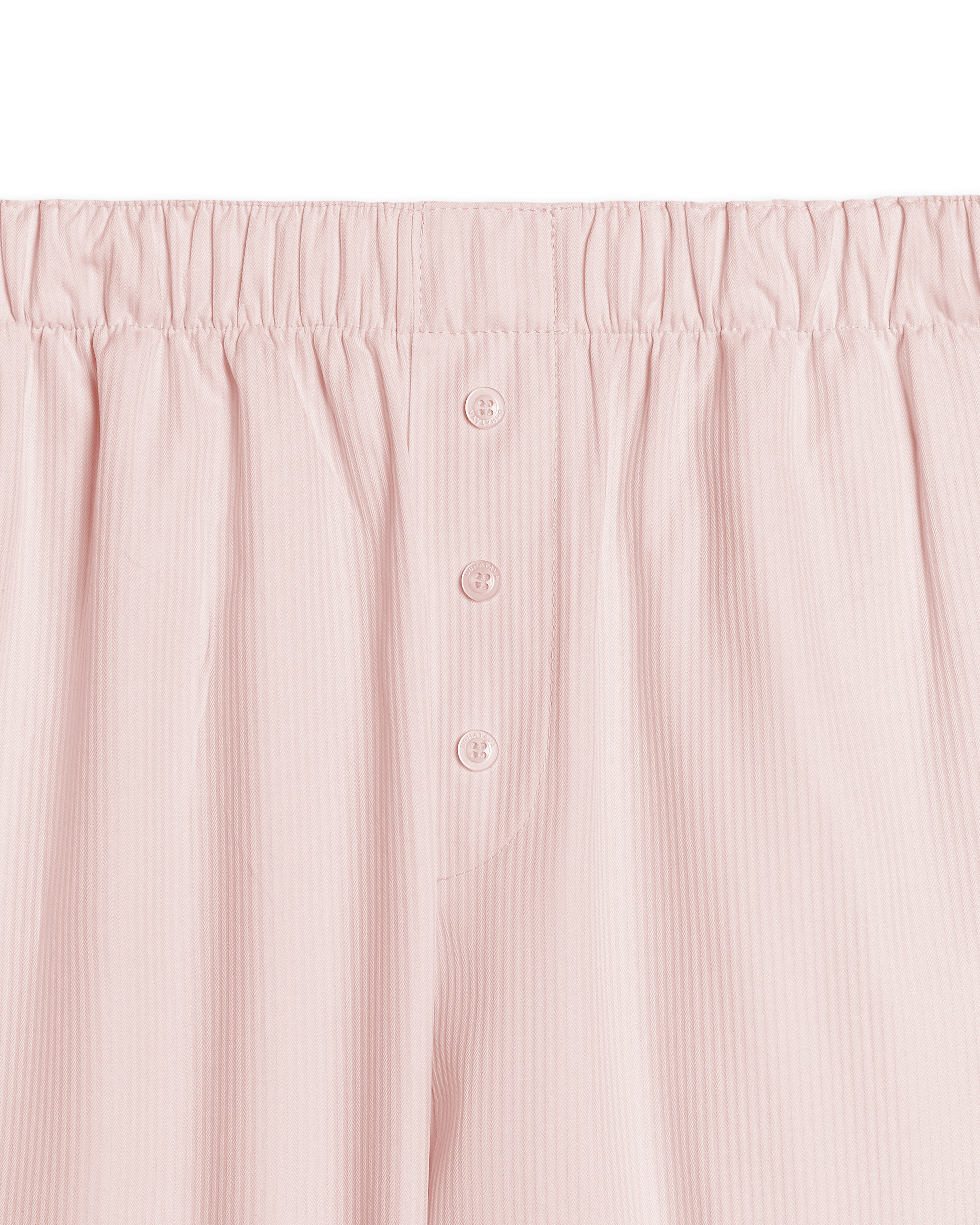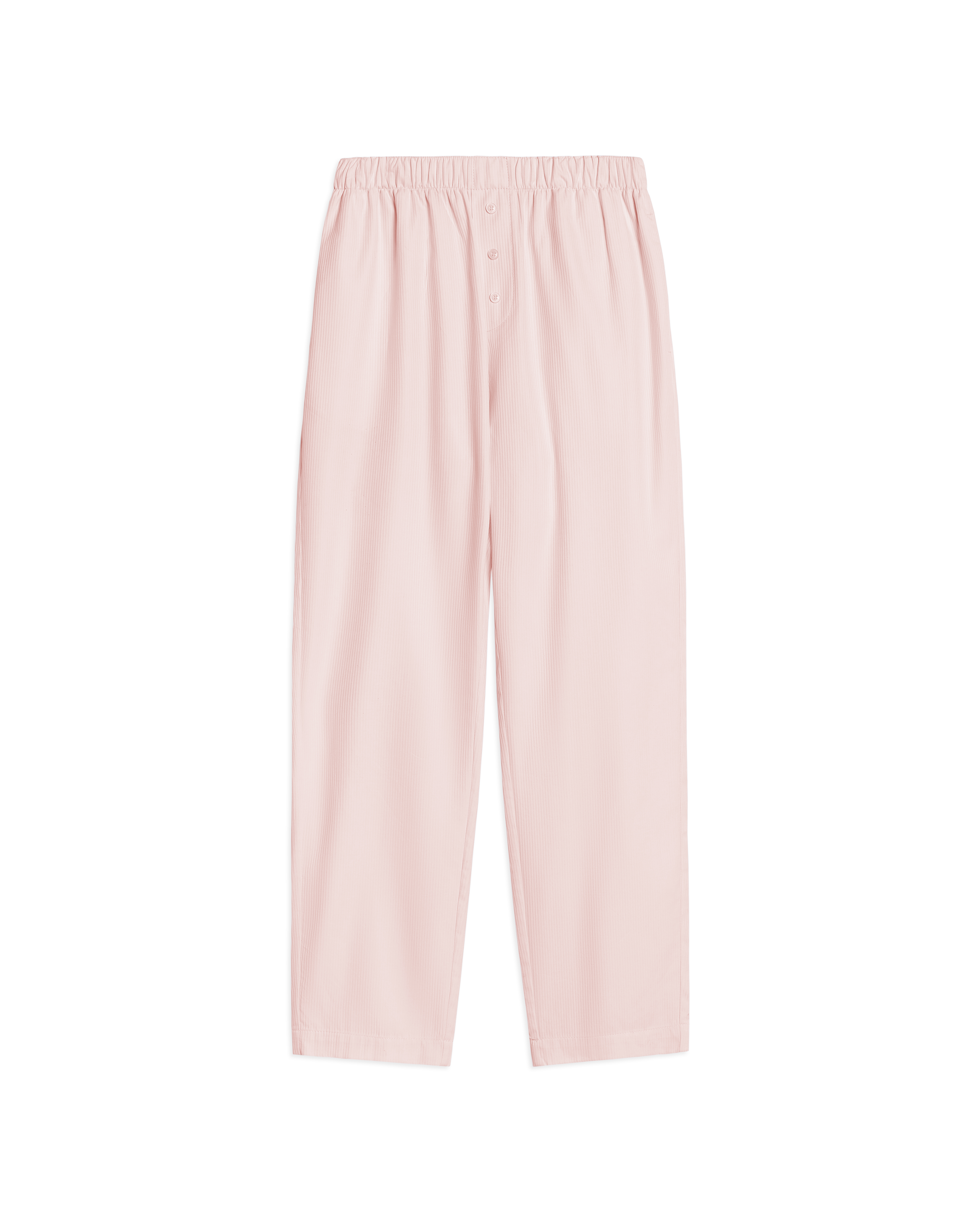 These are straight-silhouette trousers that sit on a soft elastic band. We conceived of this model as agender — it is suitable for both women and men. The piece is made of dense, shape-stable cotton. The imitation of a blind fly with decorative buttons references classic men's pajama pants. There are two pockets in the side seams.