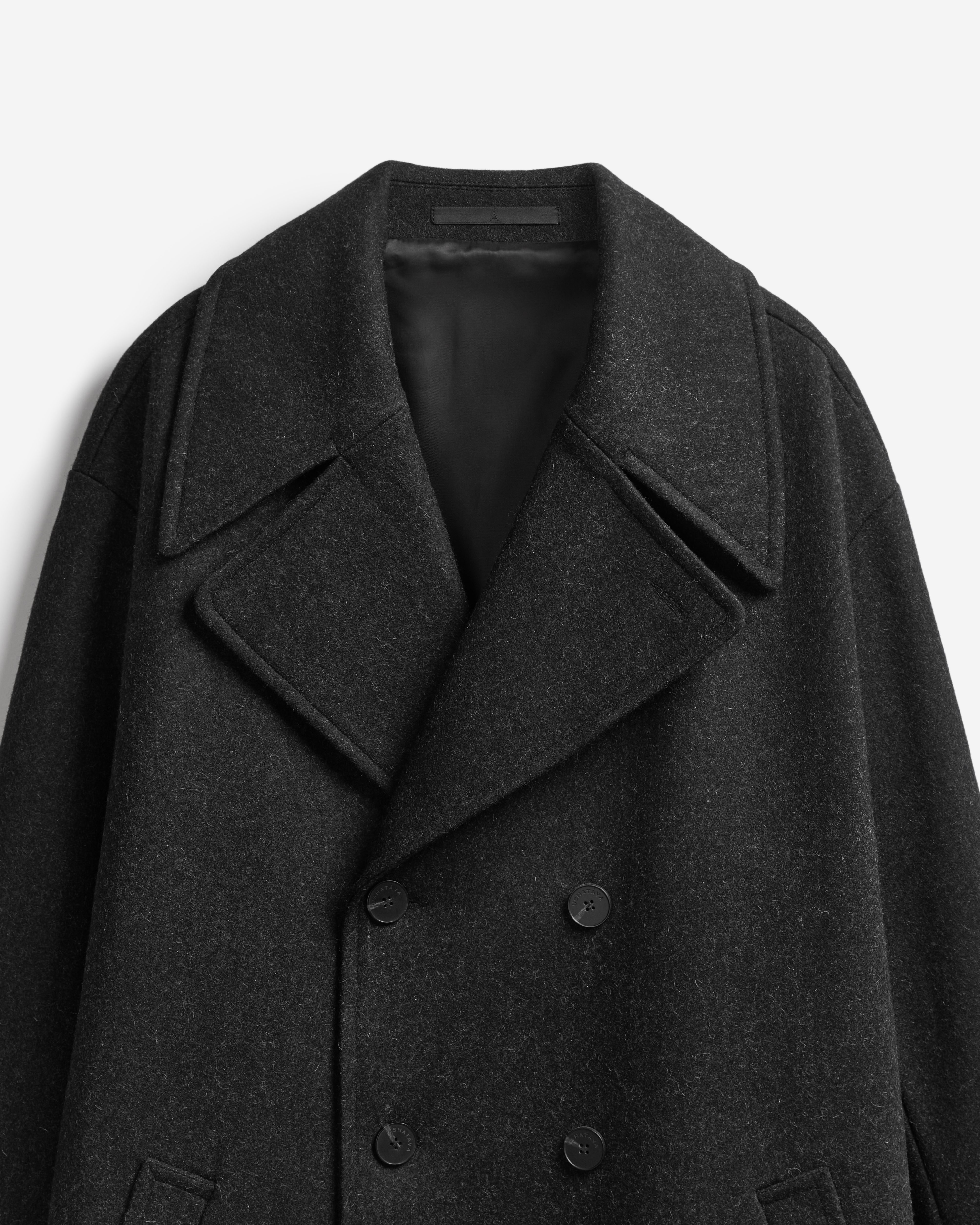 A coat with a voluminous English collar is made of thick cloth. The piece has a straight voluminous silhouette and rolled shoulder. Universal fit makes the coat suitable not only for women, but for men too. The long sleeves can be rolled up if you want – the lower part of the sleeve lining is made of shirt cotton for this exact case. The coat is lined with polyviscose lining. It fastens with buttons reinforced with counterbuttons. The left sleeve is decorated with a branded Garderobe patch.