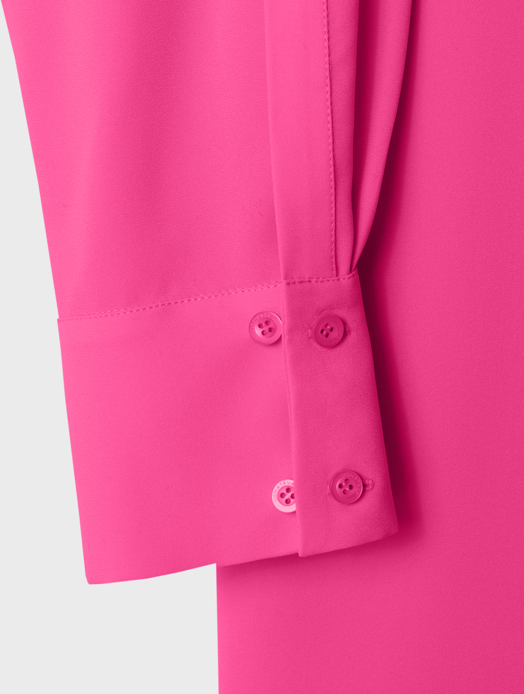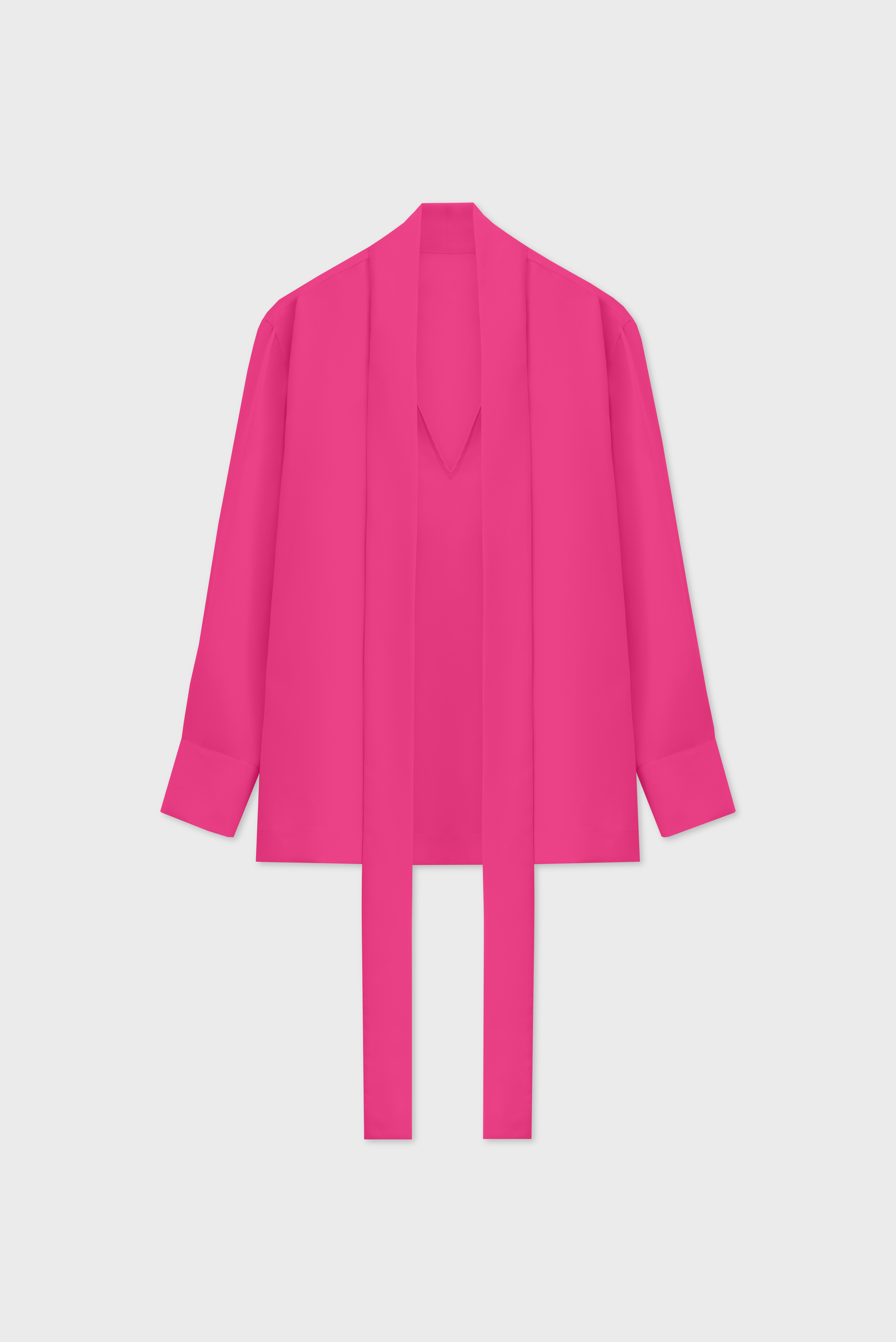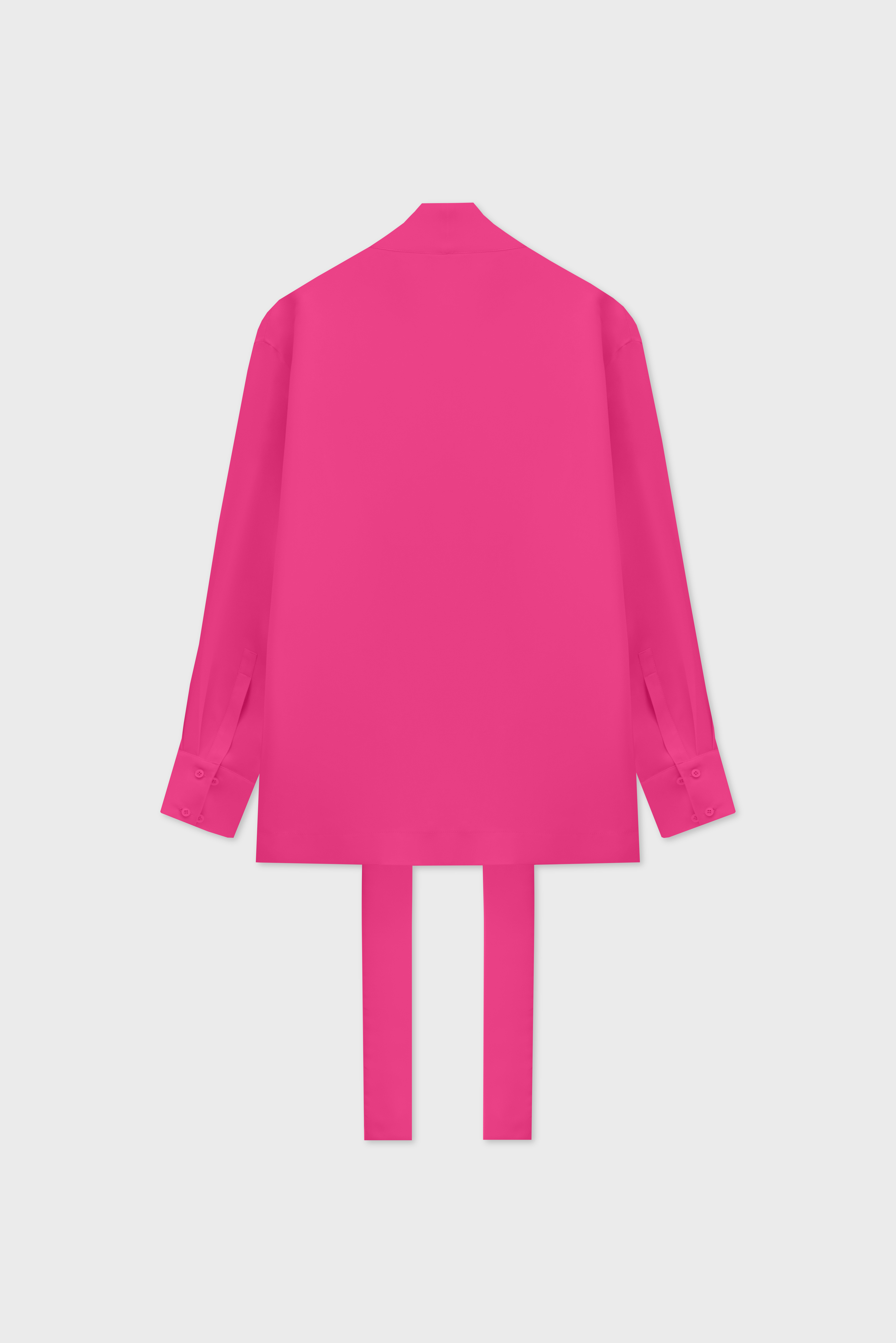 The blouse is a transformer. The ribbons are a continuation of the collar. They can be left undone or crisscrossed over the chest. The design team calls this styling option a ‘Georgian dress’. The blouse has a V-neckline. The cuffs are fastened with buttons; the item fastens with a hook-and-eye fastener.