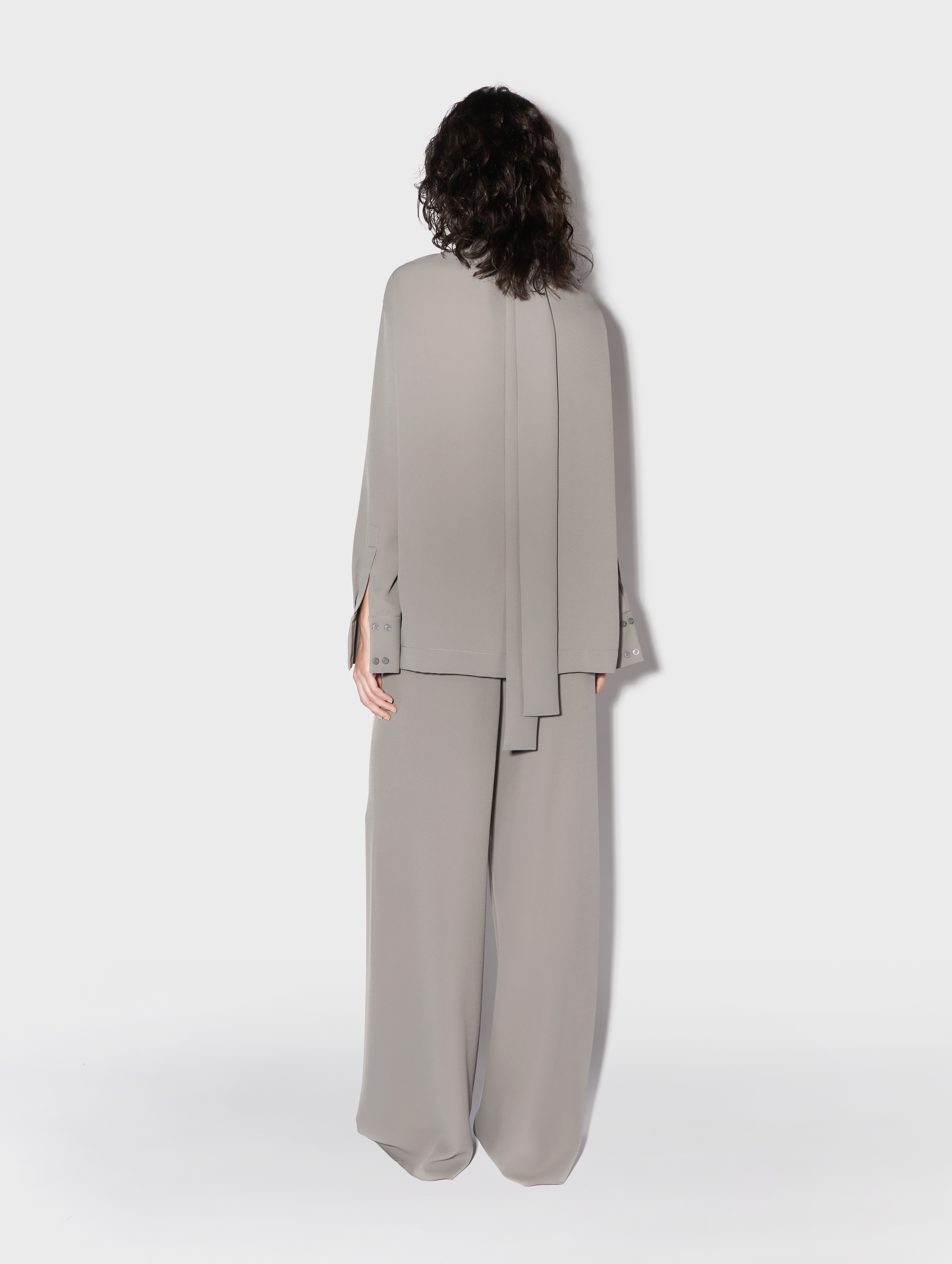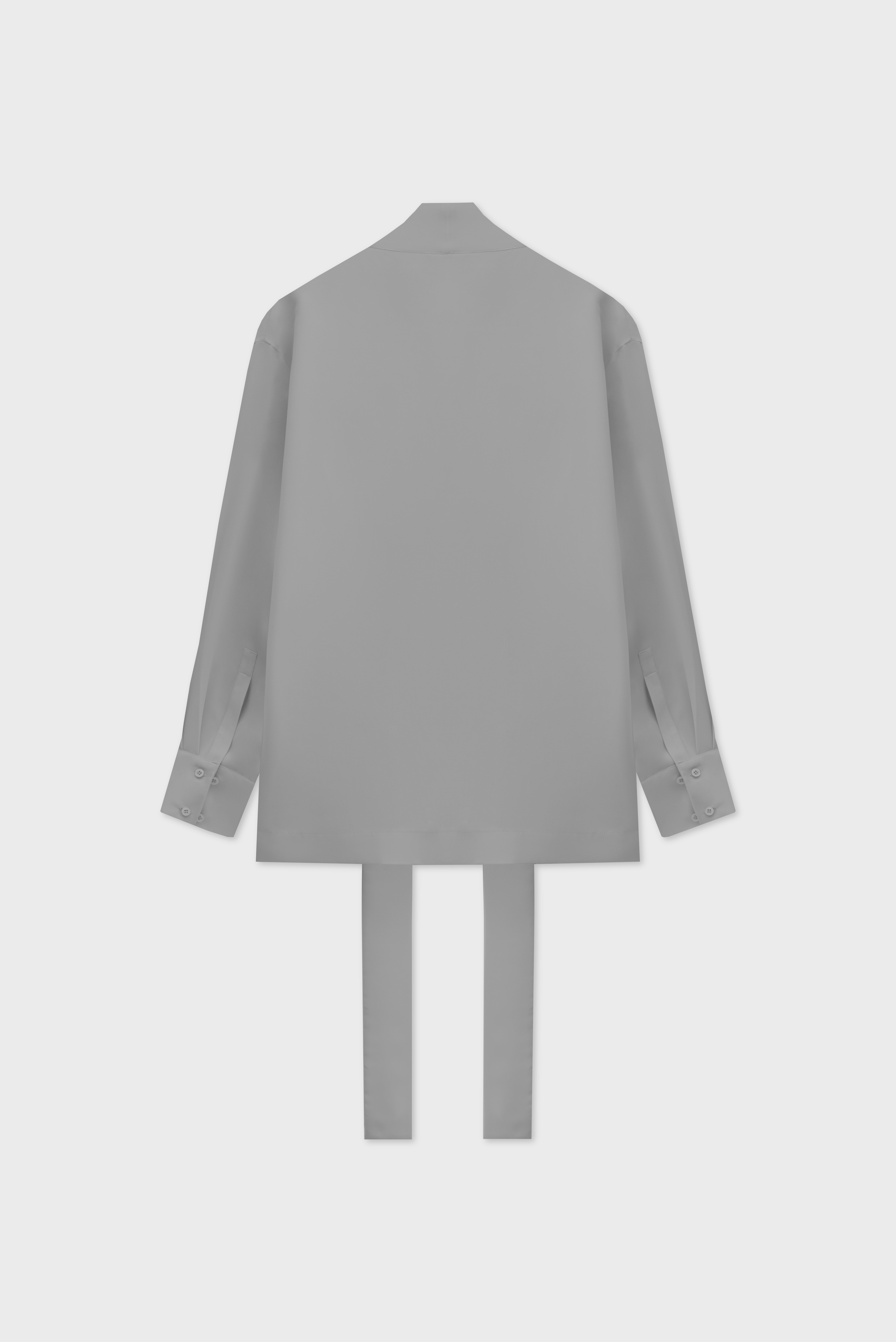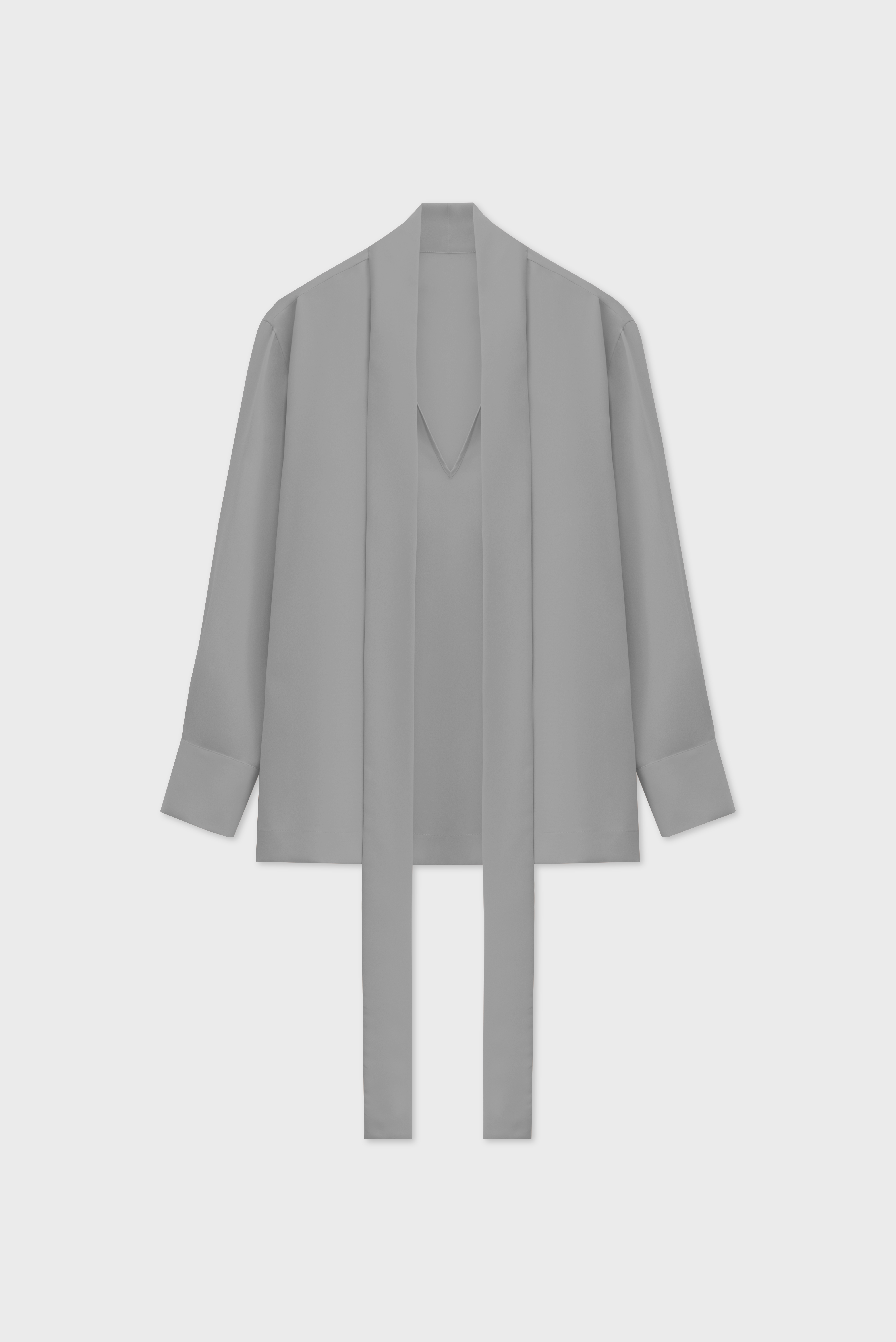 The blouse is a transformer. The ribbons are a continuation of the collar. They can be left undone or crisscrossed over the chest. The design team calls this styling option a ‘Georgian dress’. The blouse has a V-neckline. The cuffs are fastened with buttons; the item fastens with a hook-and-eye fastener.