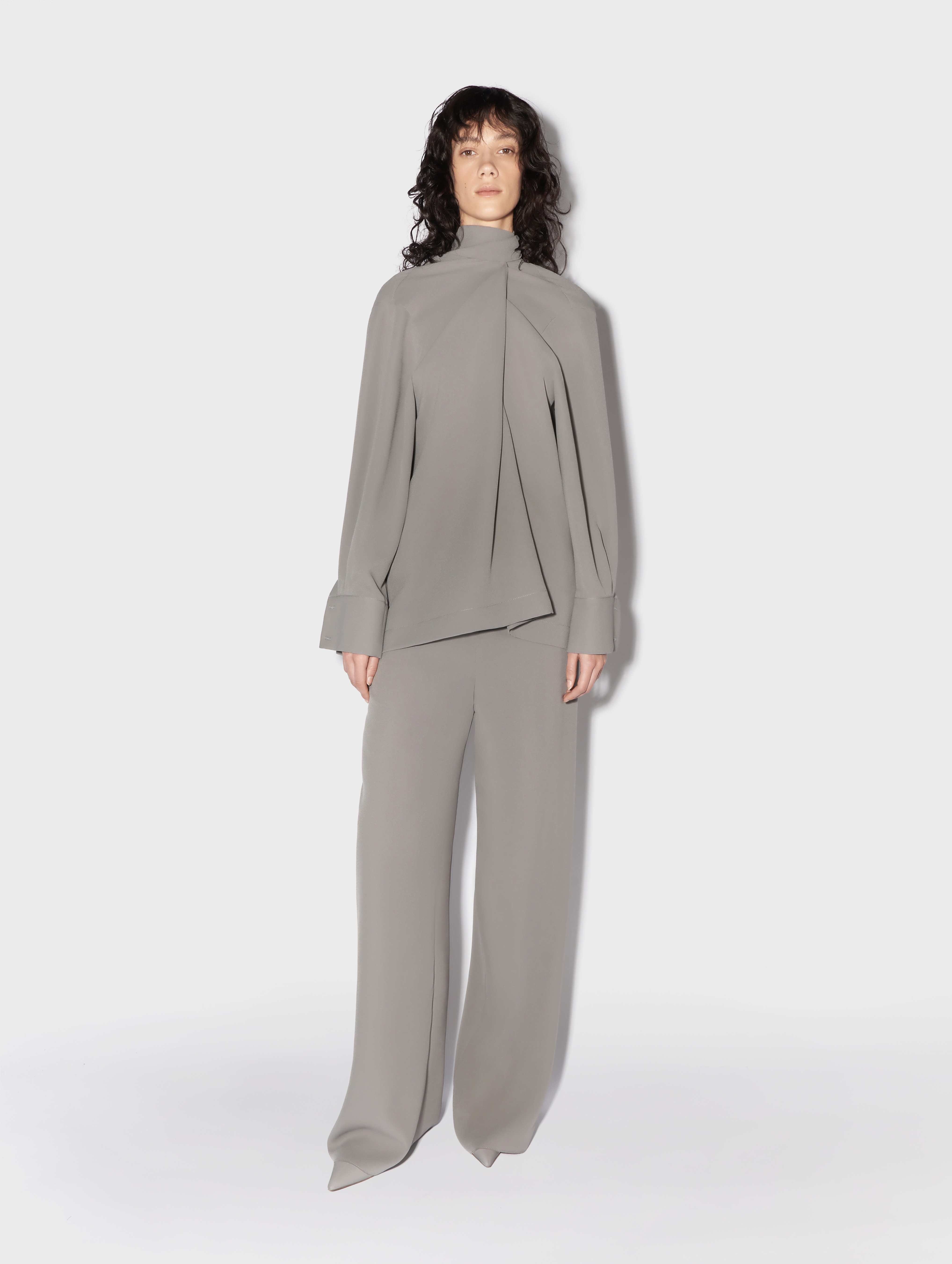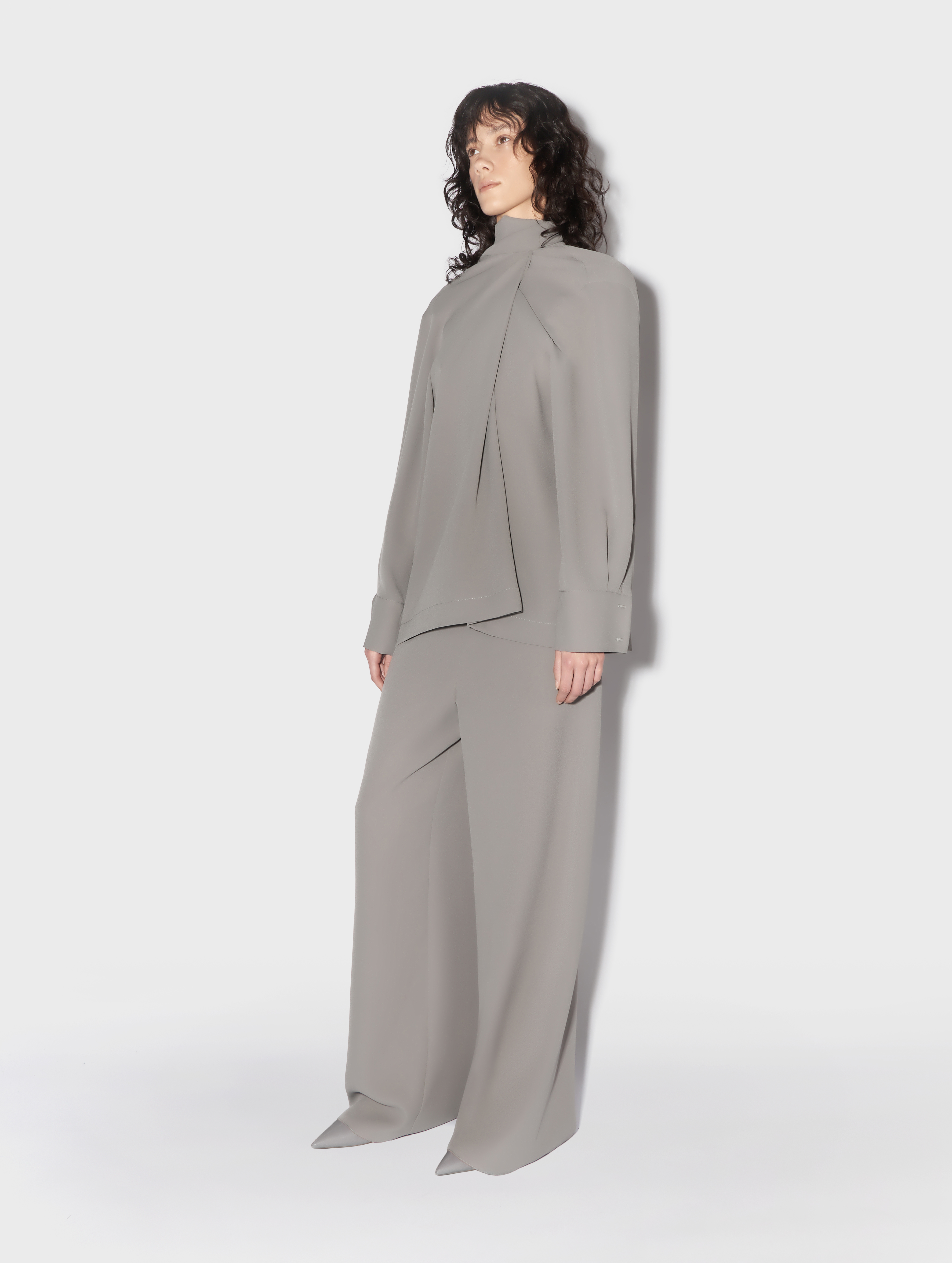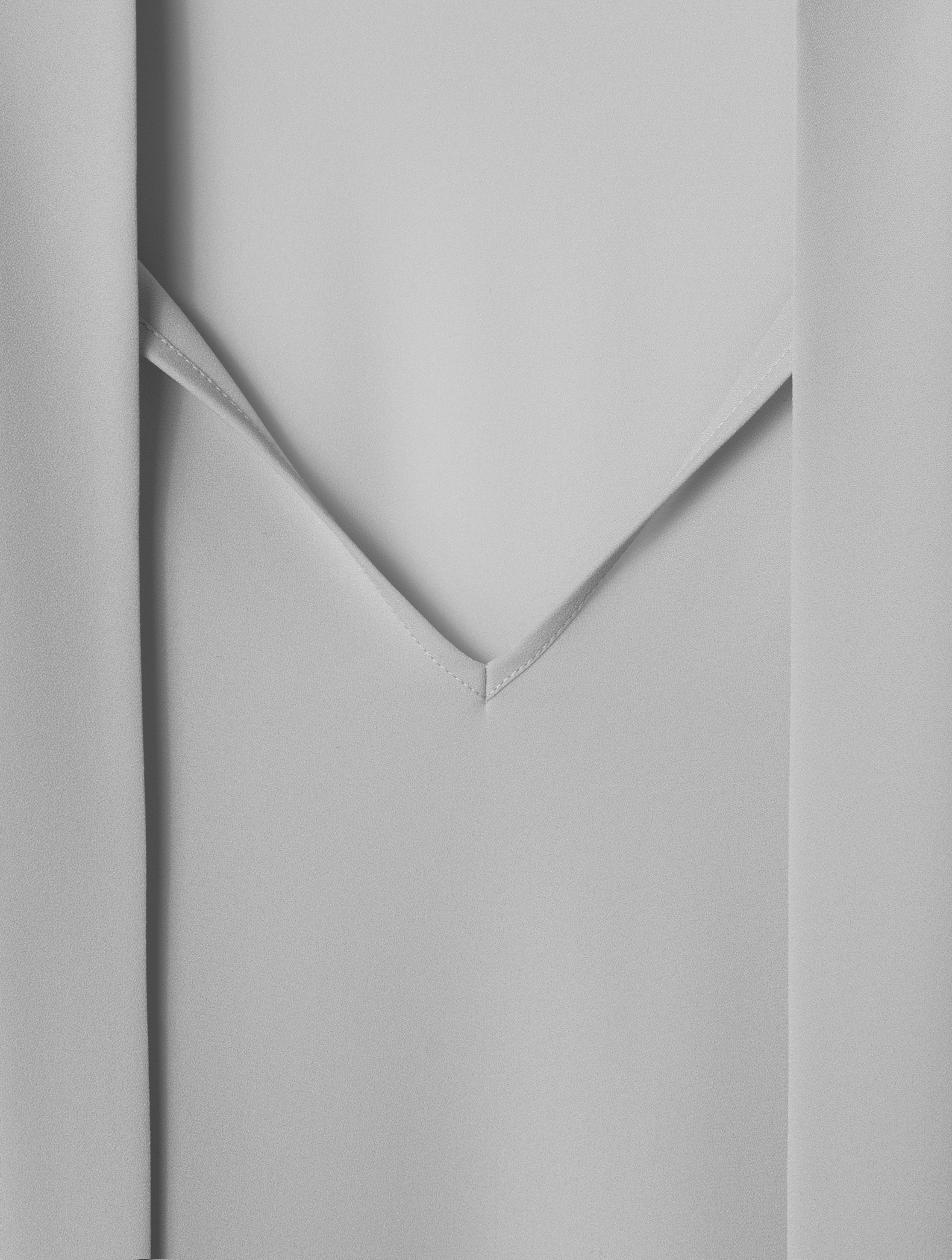 The blouse is a transformer. The ribbons are a continuation of the collar. They can be left undone or crisscrossed over the chest. The design team calls this styling option a ‘Georgian dress’. The blouse has a V-neckline. The cuffs are fastened with buttons; the item fastens with a hook-and-eye fastener.