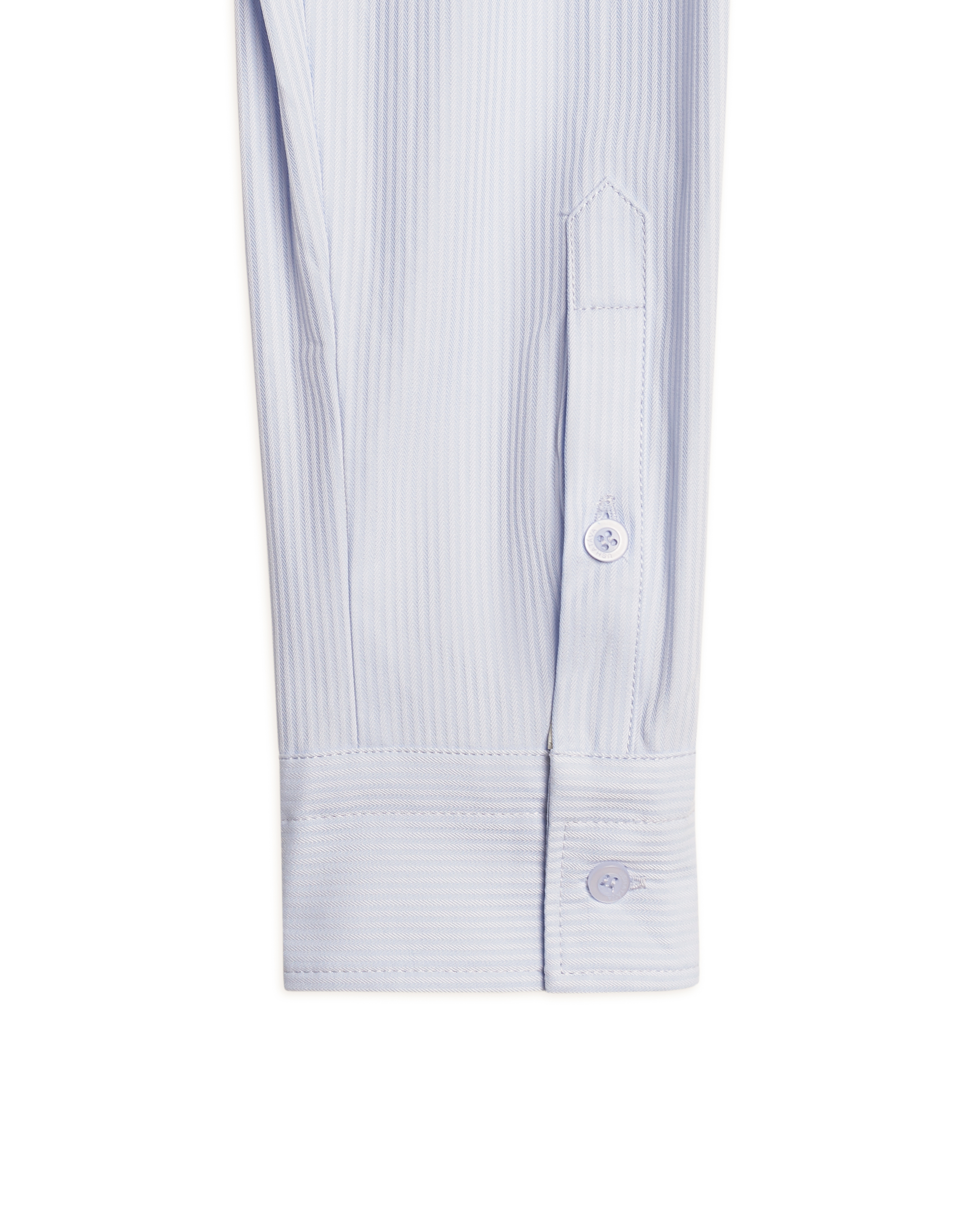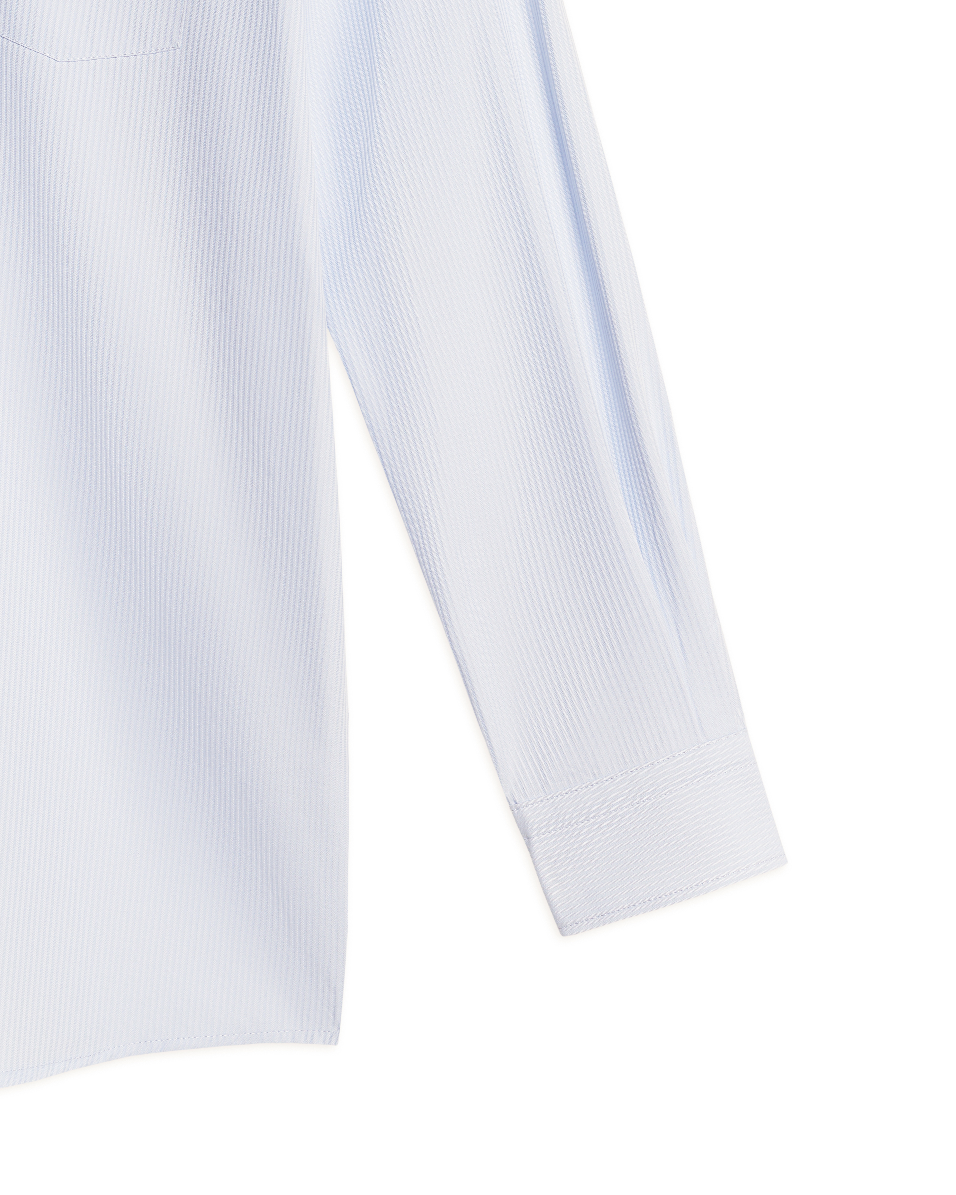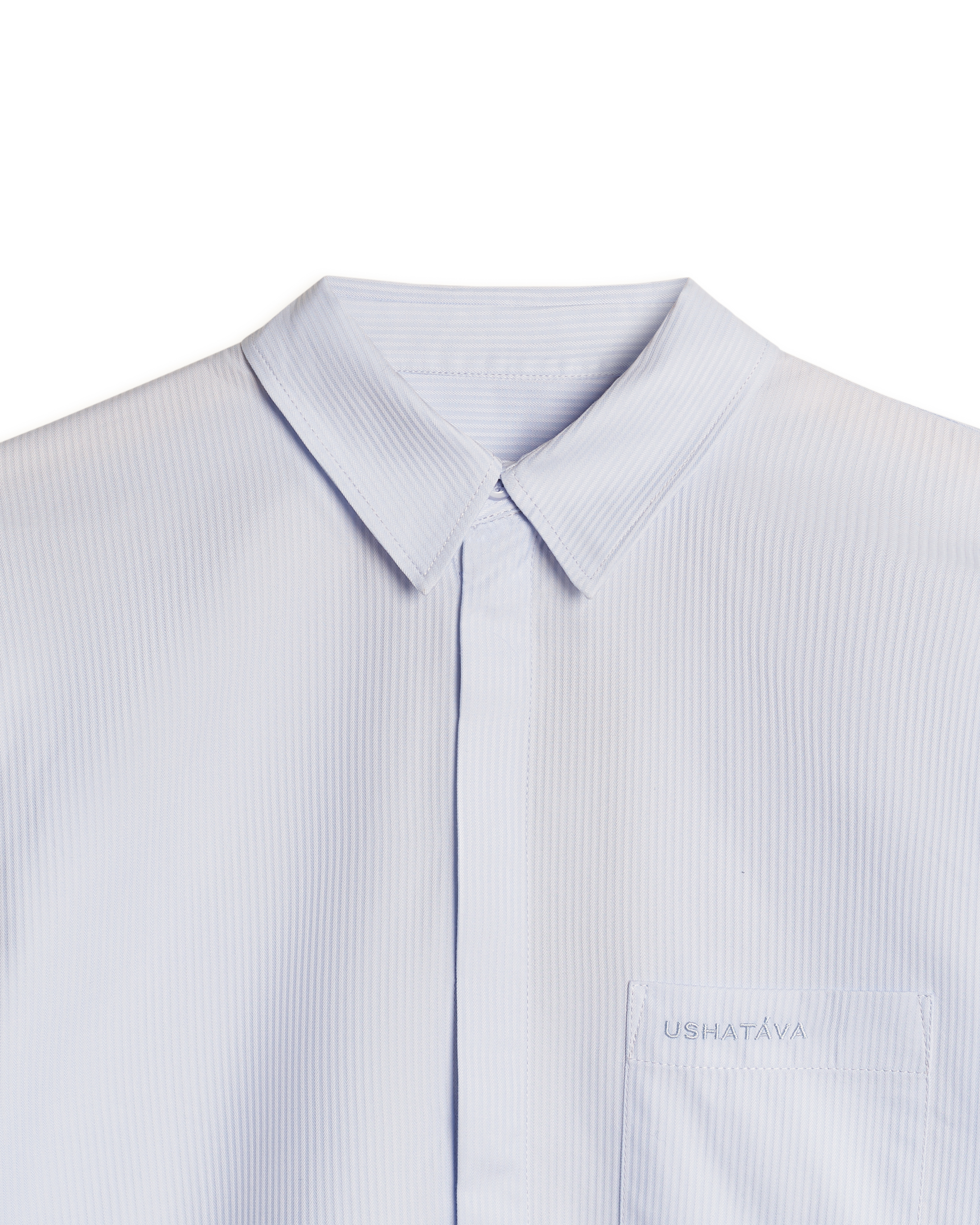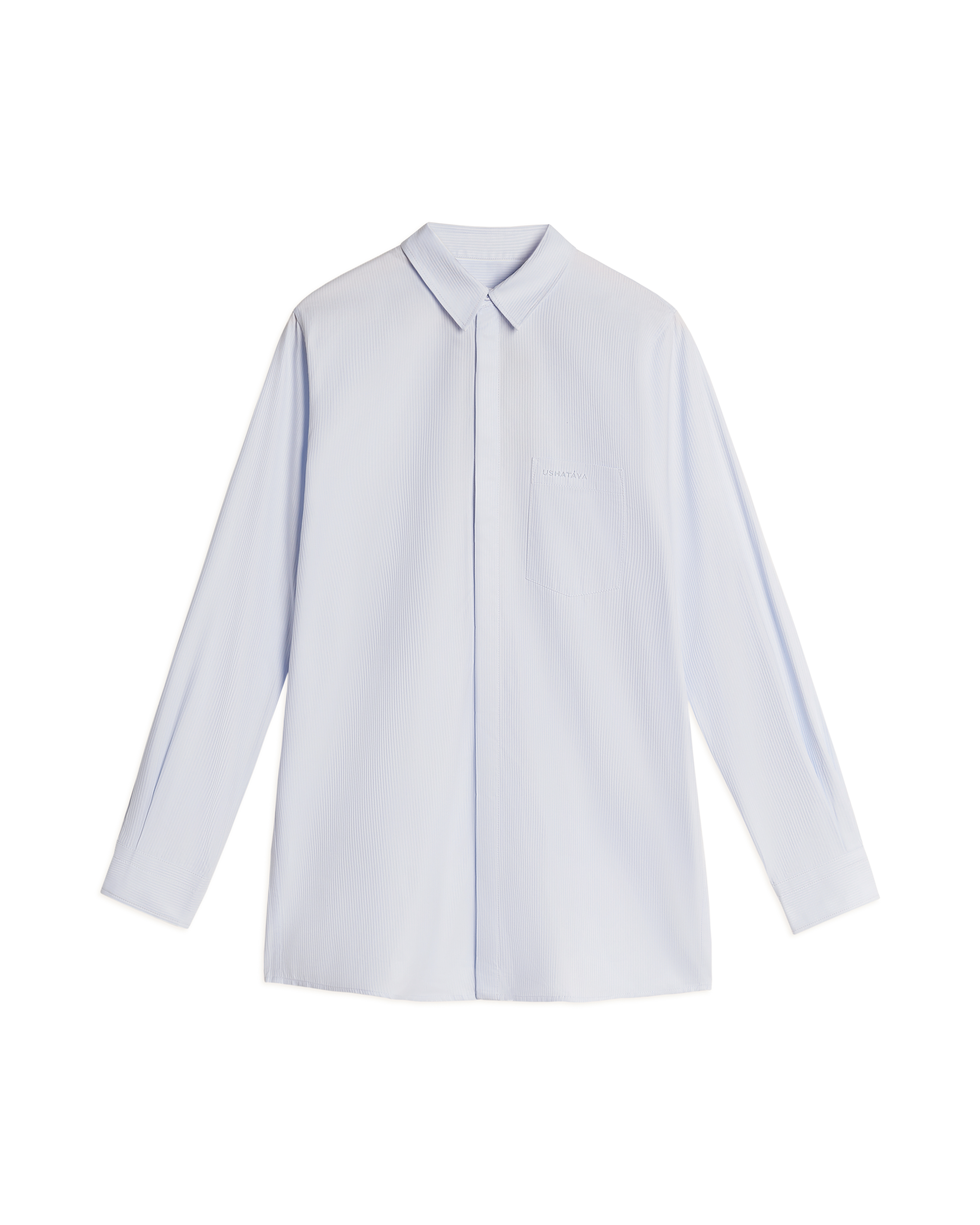This regular-fit shirt has a more elongated and loose silhouette compared to other models. The piece has elongated sleeves, a flat back with two pleats, and a rounded hem. The shirt buttons up and has a chest pocket with branded embroidery in the color of the main fabric.