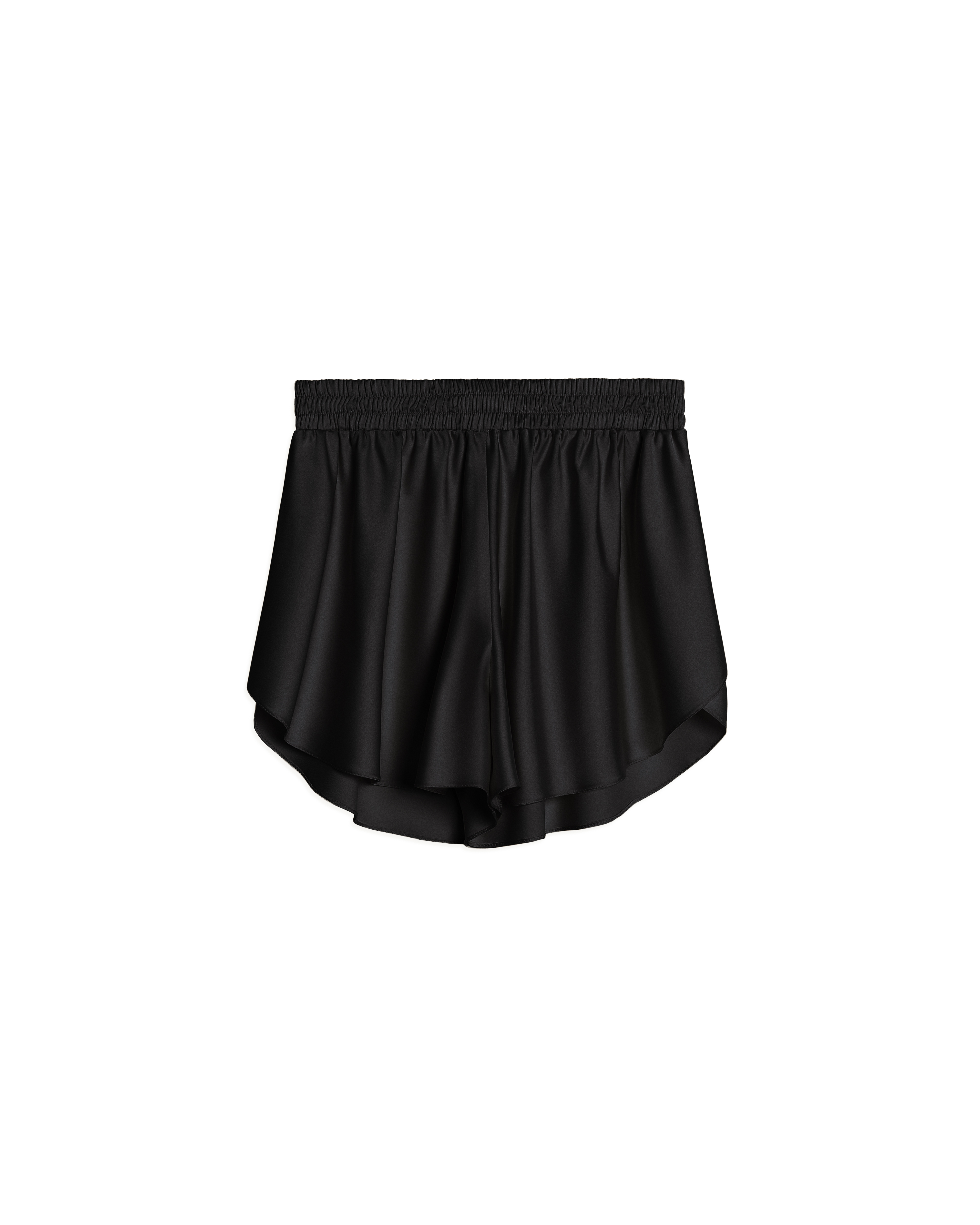 These are short shorts with an intricate hem made of thin flowing satin. Thanks to the loose fit and precise proportions, the shorts visually elongate the figure. There is a soft stitched elastic band inside the waistband.