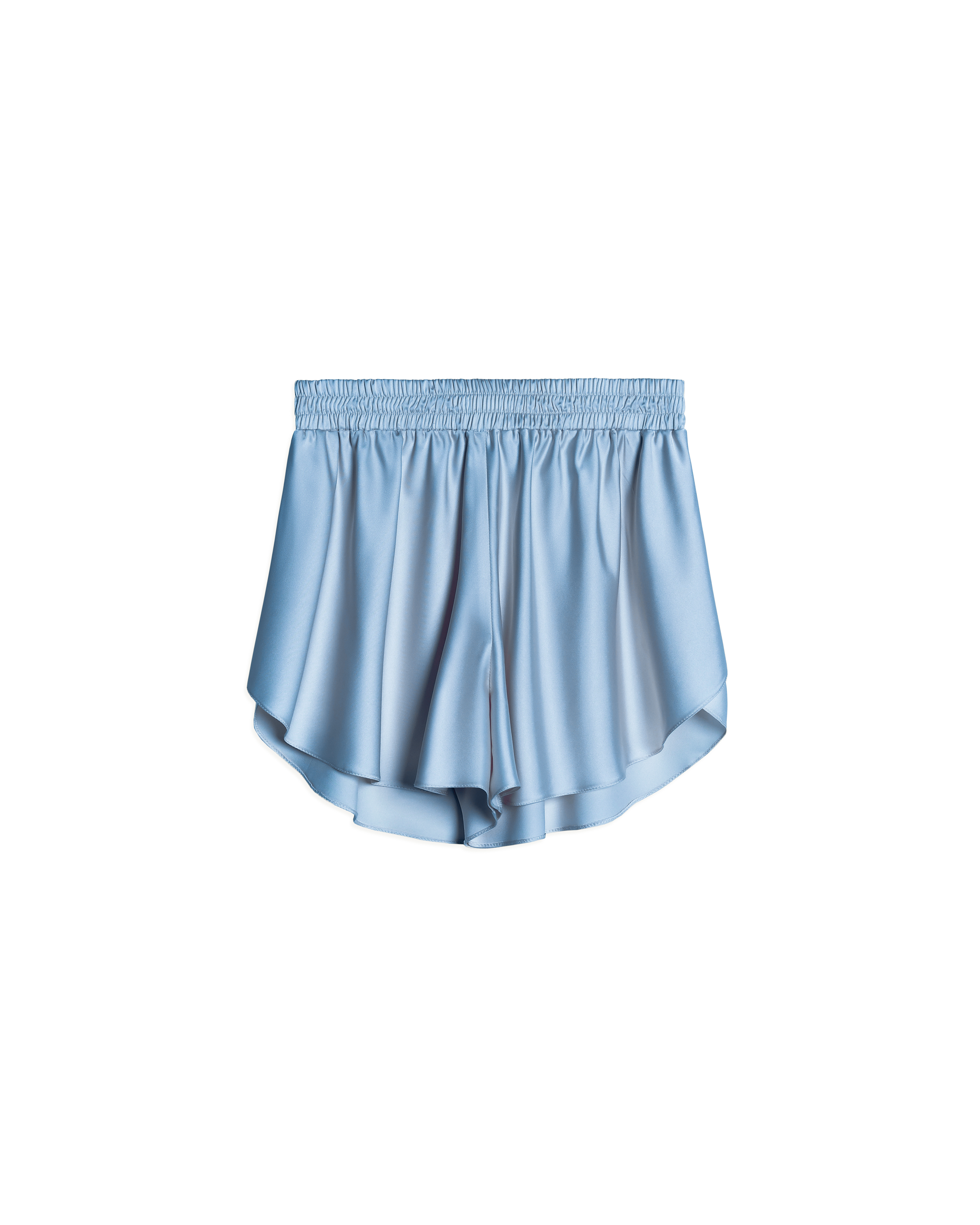 These are short shorts with an intricate hem made of thin flowing satin. Thanks to the loose fit and precise proportions, the shorts visually elongate the figure. There is a soft stitched elastic band inside the waistband.