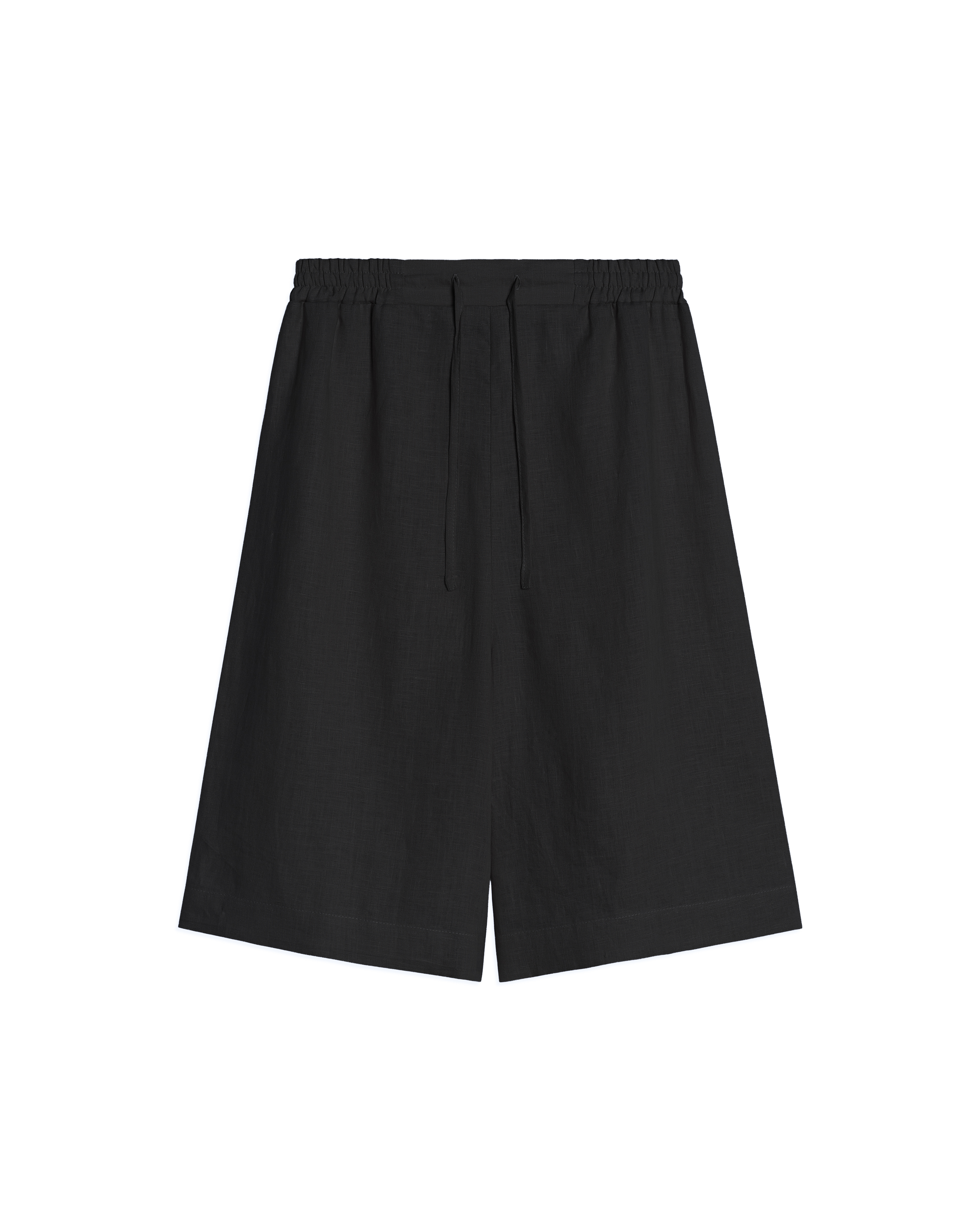 The shorts have an elongated silhouette and are made of fine linen. We conceived of this model as agender — it is suitable for both women and men. The shorts are designed to be free and flowing. They have only one internal seam, so the piece looks solid from the side. The upper cut is treated with an elastic band which is stitched to prevent twisting. There is also a drawstring inside the waistband that allows you to adjust and secure the fit.