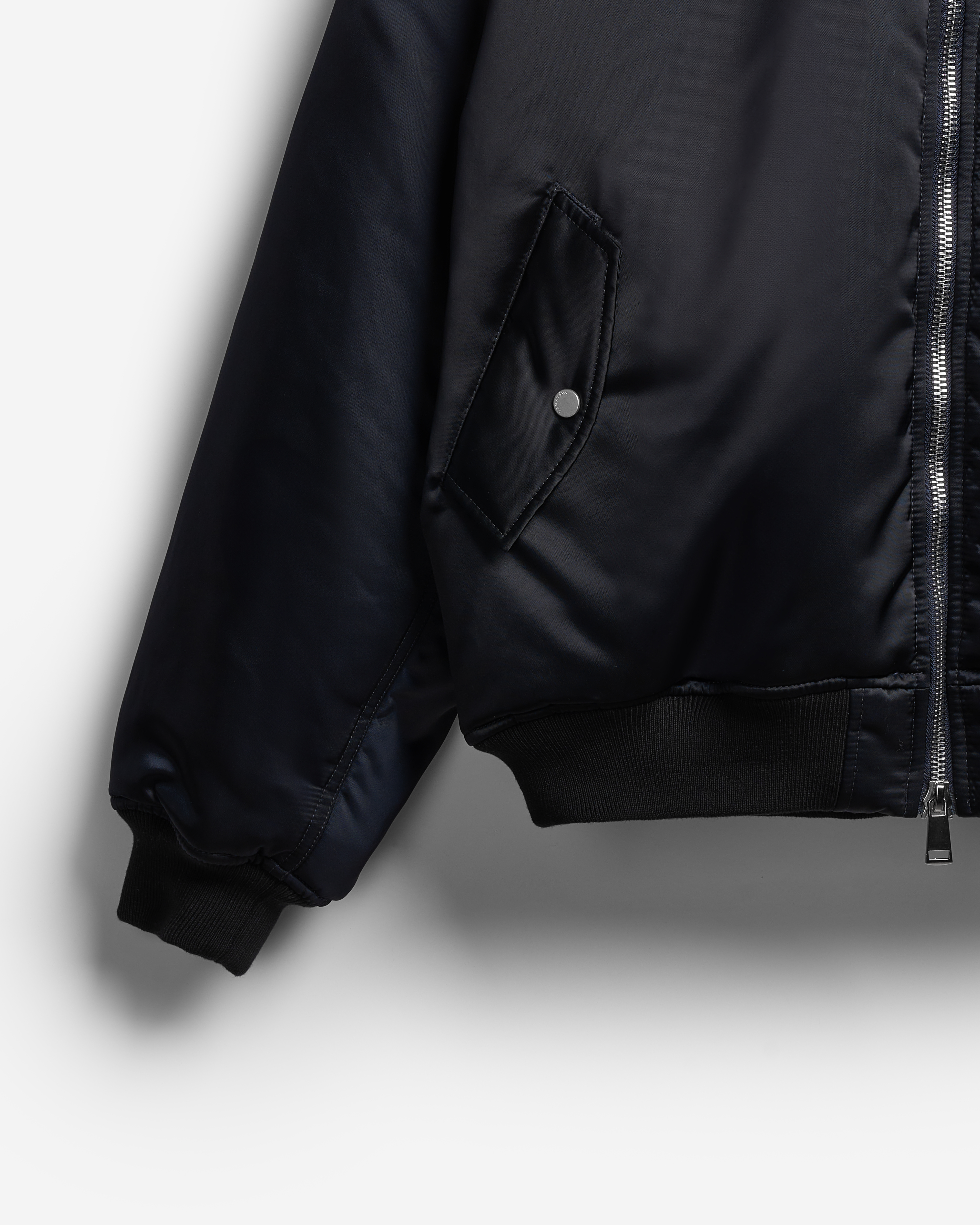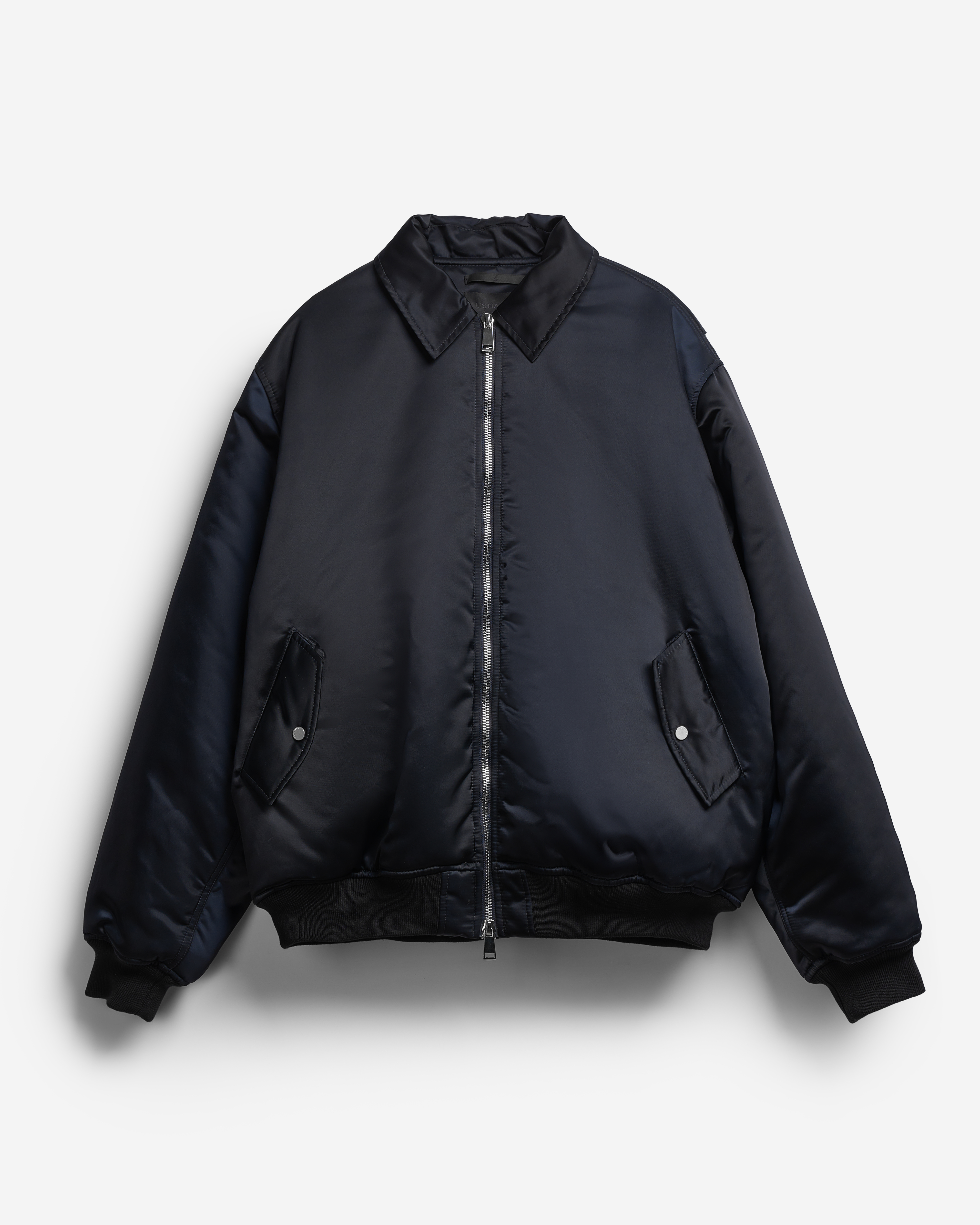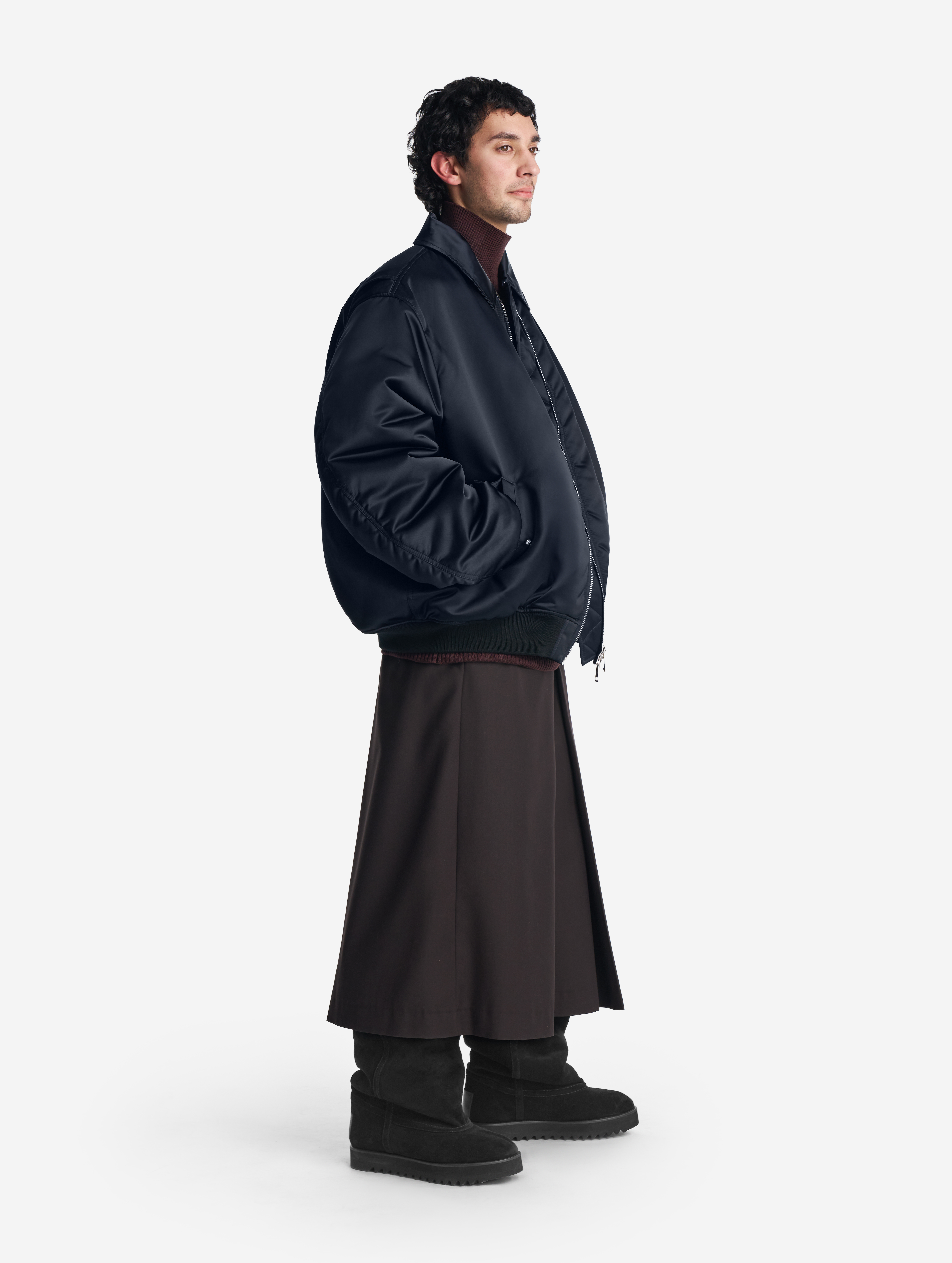 This is an oversized bomber jacket with a shirt collar. The piece is made of dense waterproof raincoat fabric, which has a smooth texture and soft shine, making it look lowkey and expressive at the same time. The jacket is lined with the ShelterSport® insulation. The bomber jacket is reversible. There is an insulated wind flap under the zipper for additional windproofing. The vest comes with two functional flap pockets. The elongated sleeve is finished with a knitted wristband, and the bottom of the piece is treated with a kashkorse elastic band.