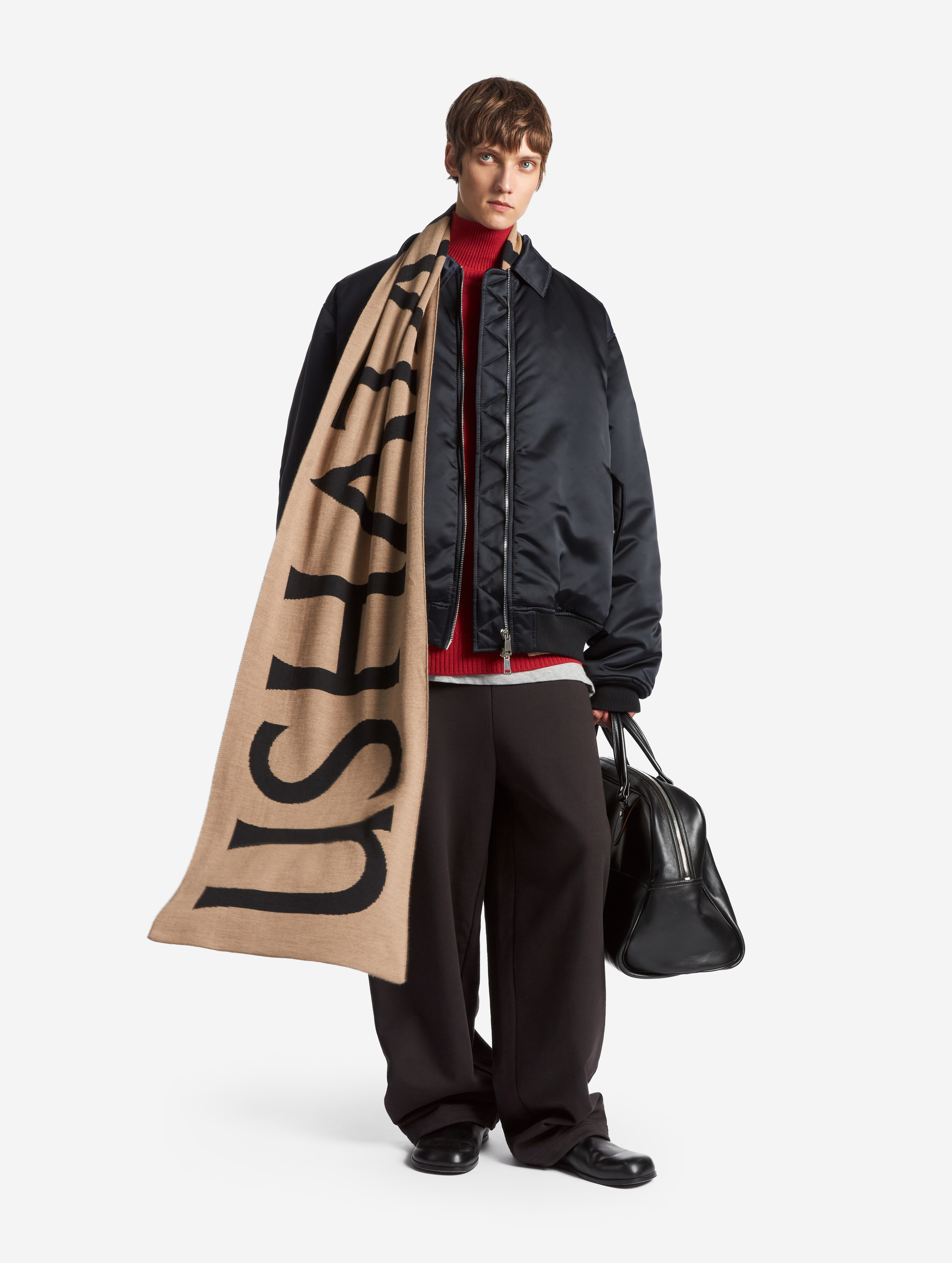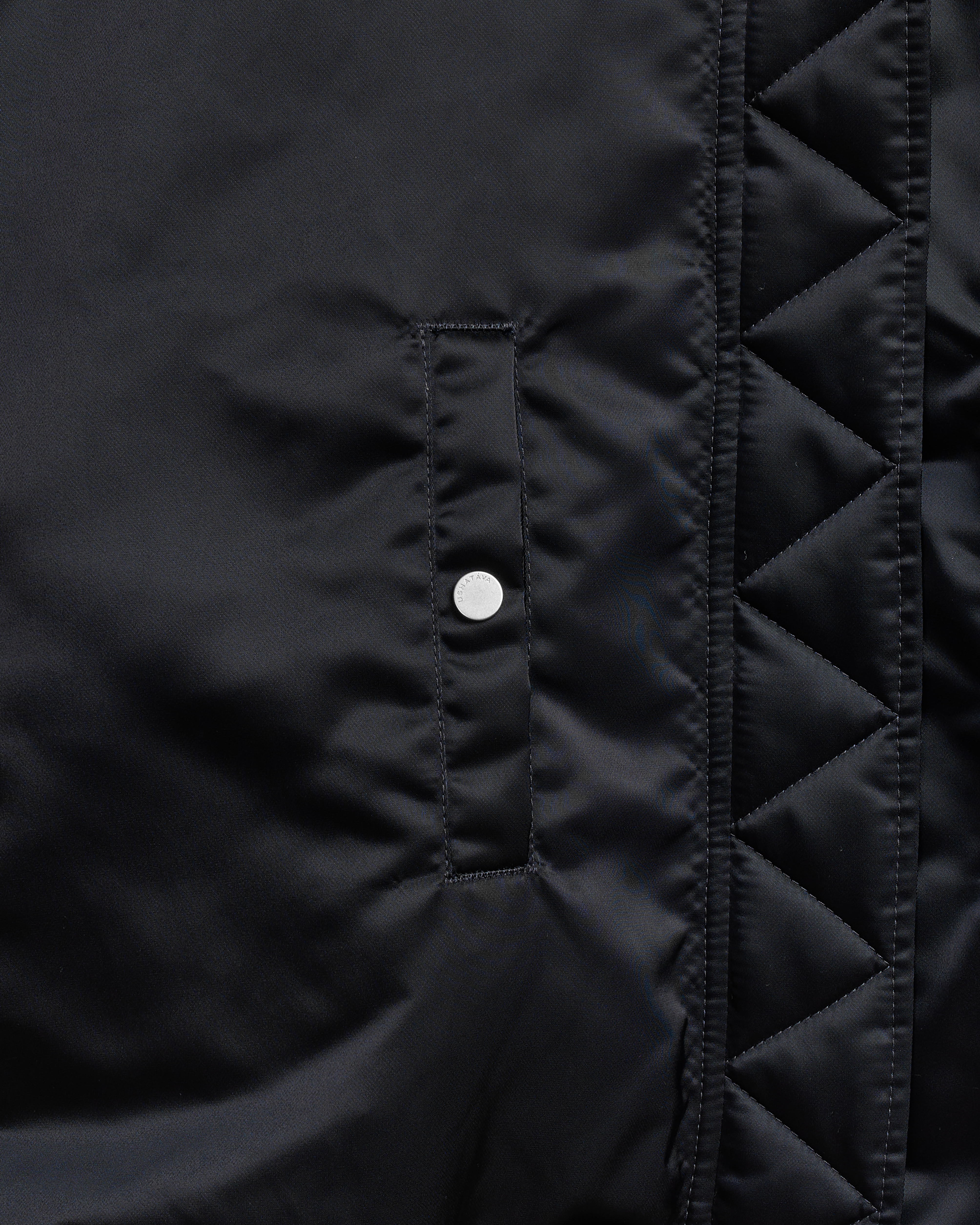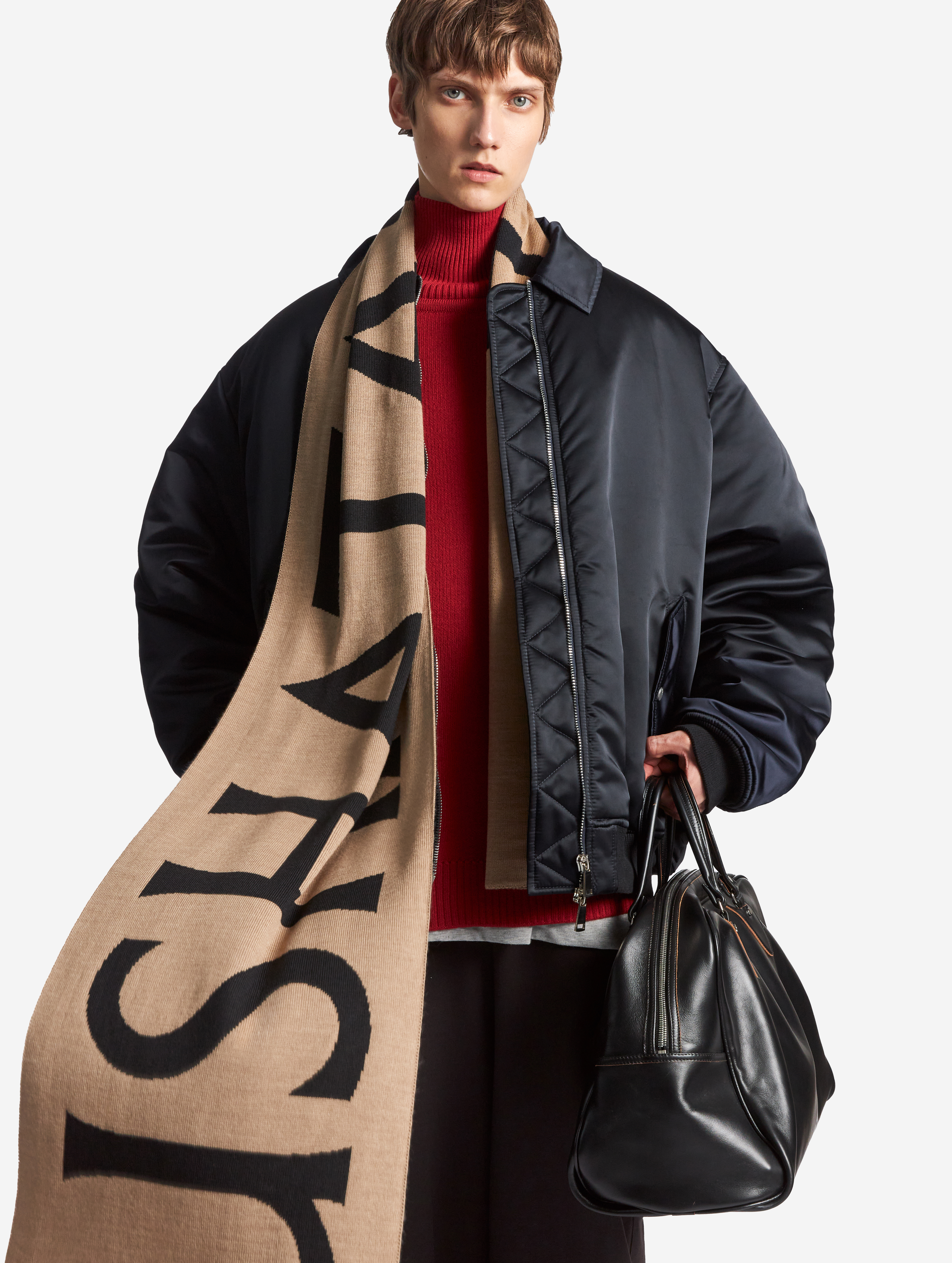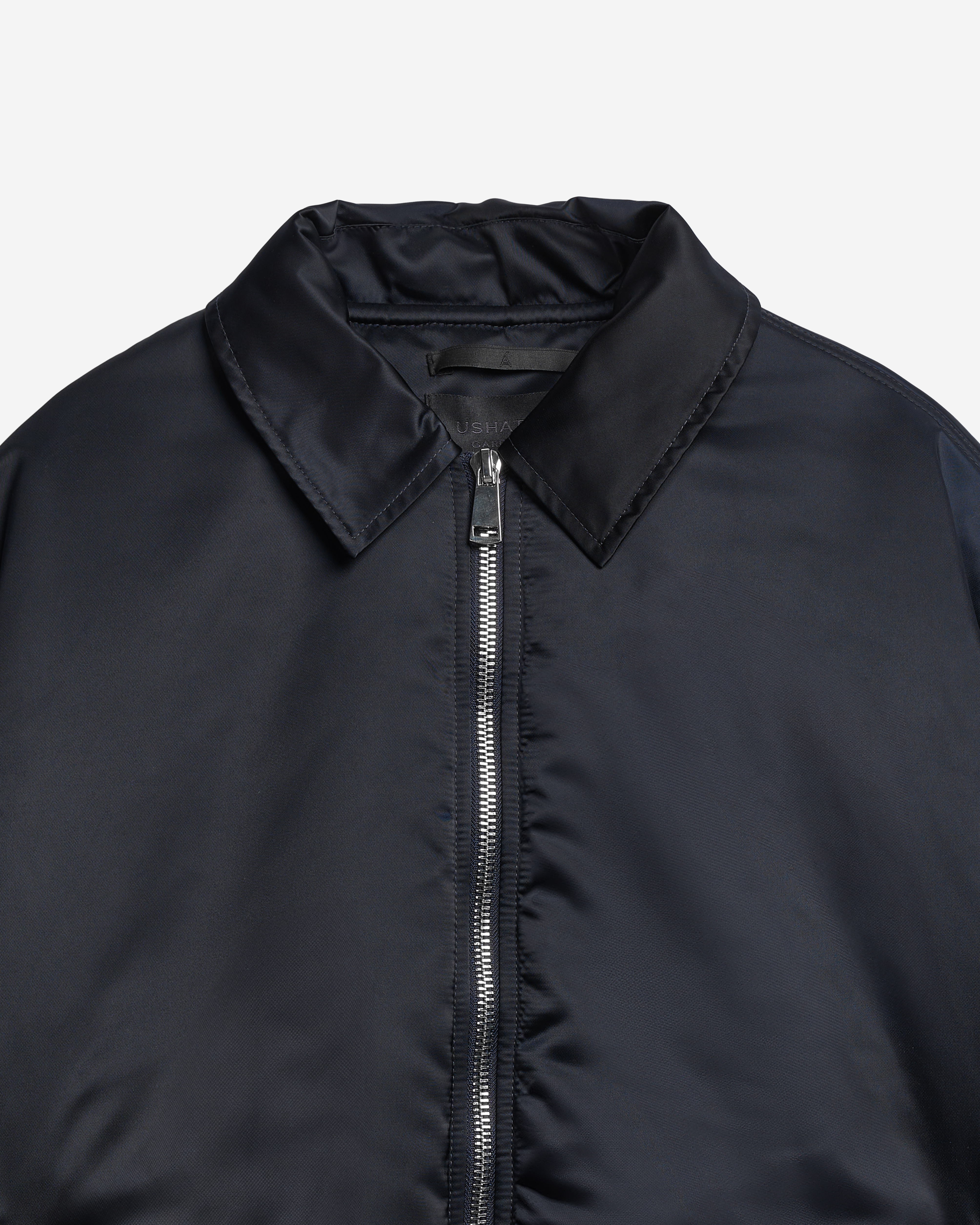 This is an oversized bomber jacket with a shirt collar. The piece is made of dense waterproof raincoat fabric, which has a smooth texture and soft shine, making it look lowkey and expressive at the same time. The jacket is lined with the ShelterSport® insulation. The bomber jacket is reversible. There is an insulated wind flap under the zipper for additional windproofing. The vest comes with two functional flap pockets. The elongated sleeve is finished with a knitted wristband, and the bottom of the piece is treated with a kashkorse elastic band.