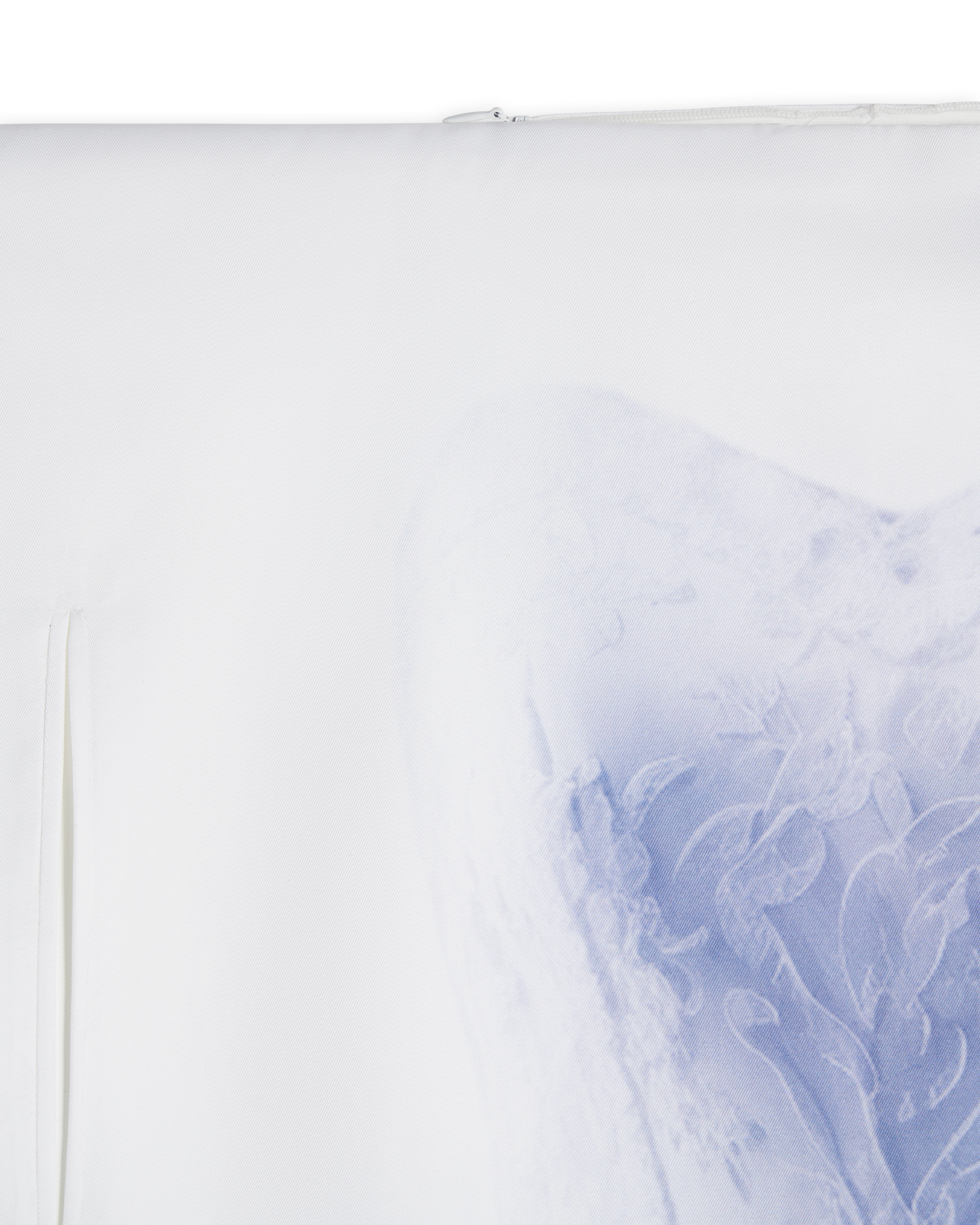 In the process, the piece transformed into a full-fledged garment that summarized our love for clean forms and the illusion of a three-dimensional object on a two-dimensional surface. The dress is a reimagining of a garment bag used to store clothes in the closet. But unlike the ordinary clothes bag, this one has armholes and a wide neck finished with a two-way zipper. When it is unzipped, you can pull the dress down and wear it off the shoulders so that the image of the gown matches the contours of the body. The poofy dress printed on the fabric does not exist. The image is an ironic fantasy: it is how artificial intelligence sees this wedding cliche — the complete antipode of the Second Dress collection.