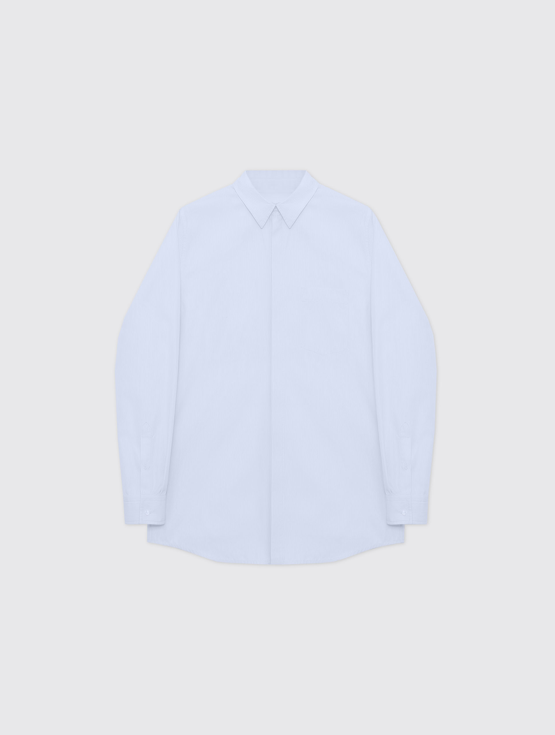 This regular-fit shirt has an elongated and loose silhouette. The garment is designed to fit both women and men. The piece has elongated sleeves, a flat back with two pleats, and a rounded hem. The shirt buttons up and has a chest pocket.