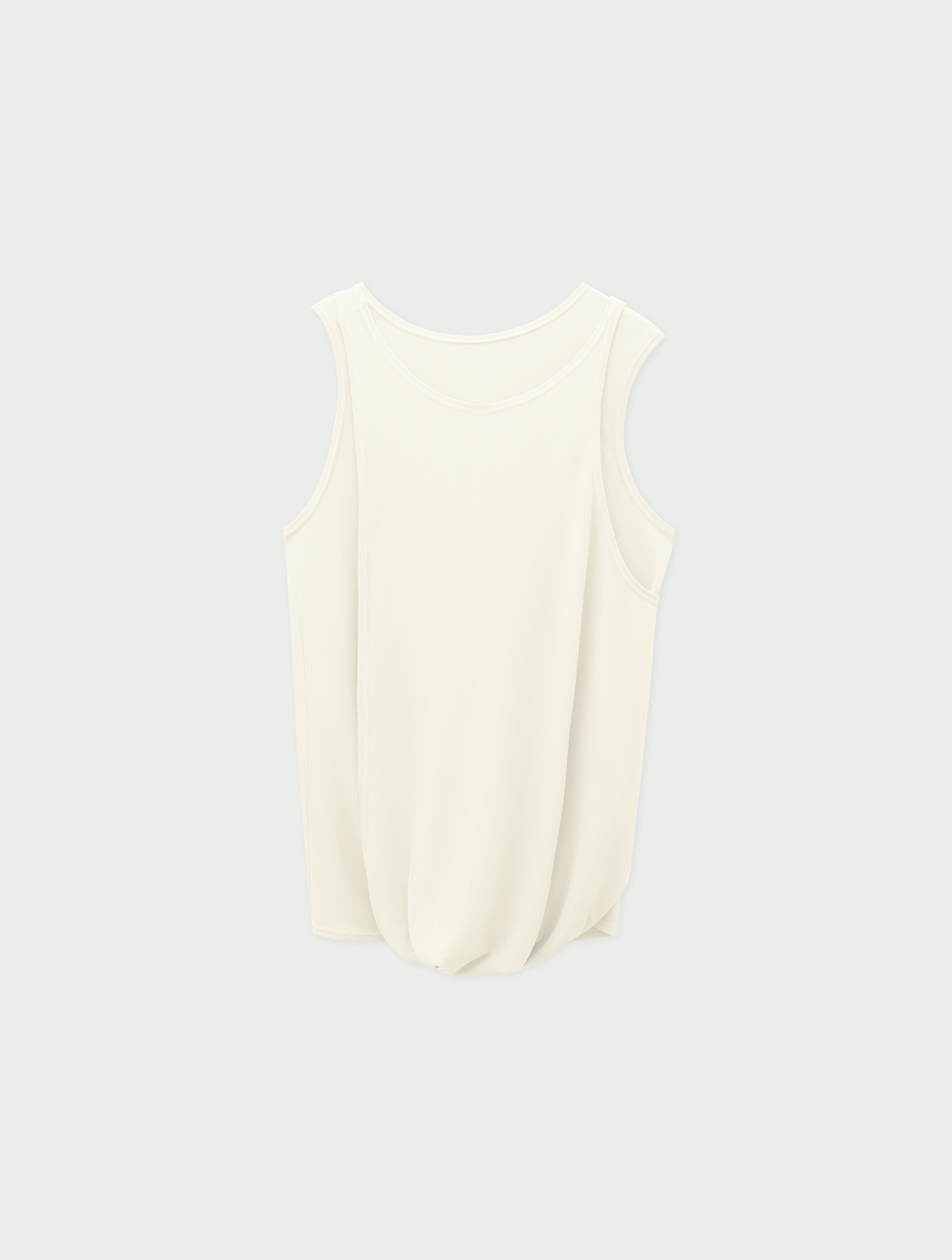 The layering is created a game of proportions due to the asymmetric shoulder configuration of the tank top. The upper tank top neckline is a wide enough, so it can be styled as a one-shoulder tank top.