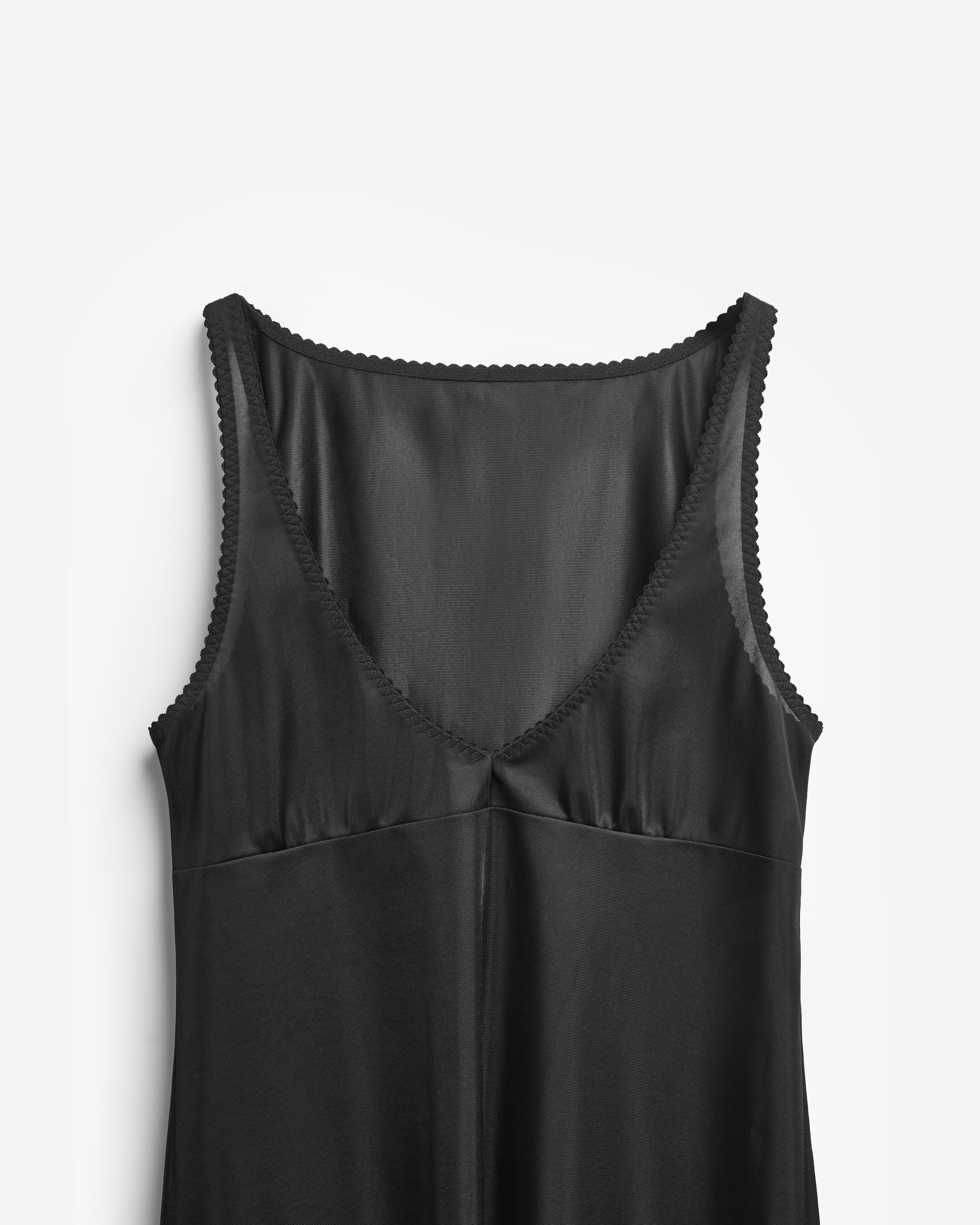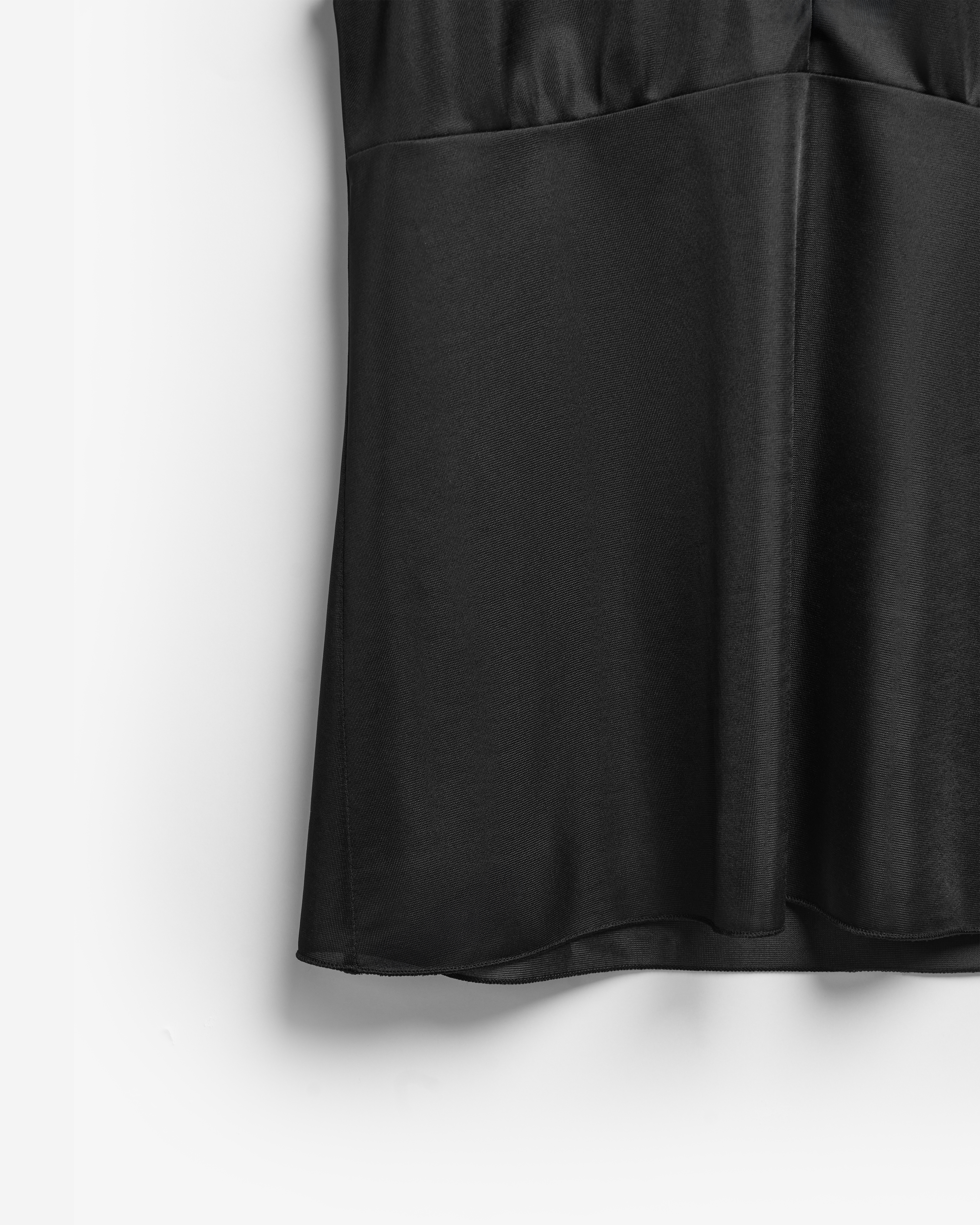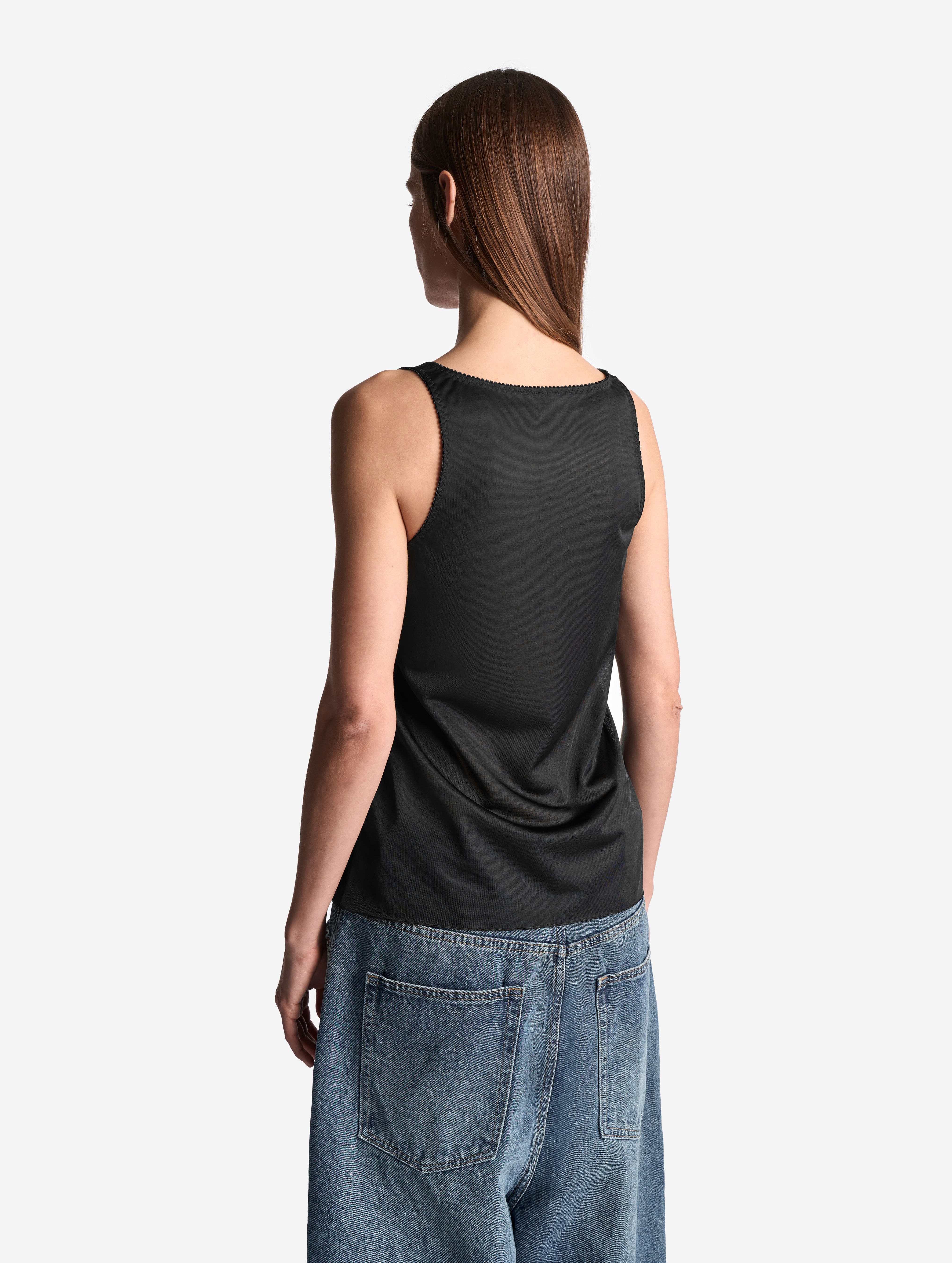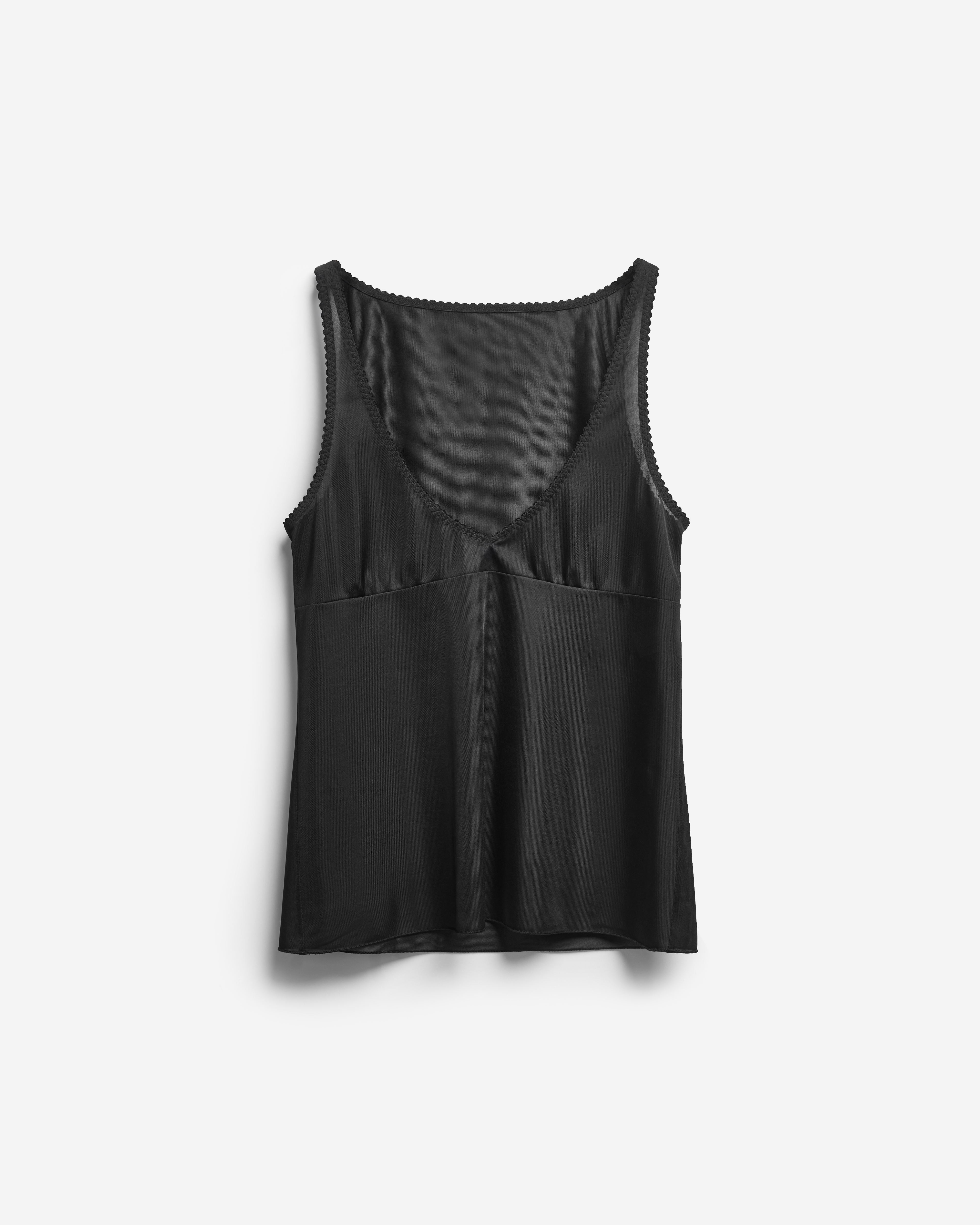 The lingerie-inspired elements in the Garderobe line are united by the evocative prefix “negligee.” In this collection, you'll find retro silhouettes that feel both familiar and refreshing. This tank top features a straight cut, a deep neckline, and a closed back. The armholes and the neckline are finished with lacy lingerie elastic stitched in a three-needle zigzag, a detail typically used in lingerie design.