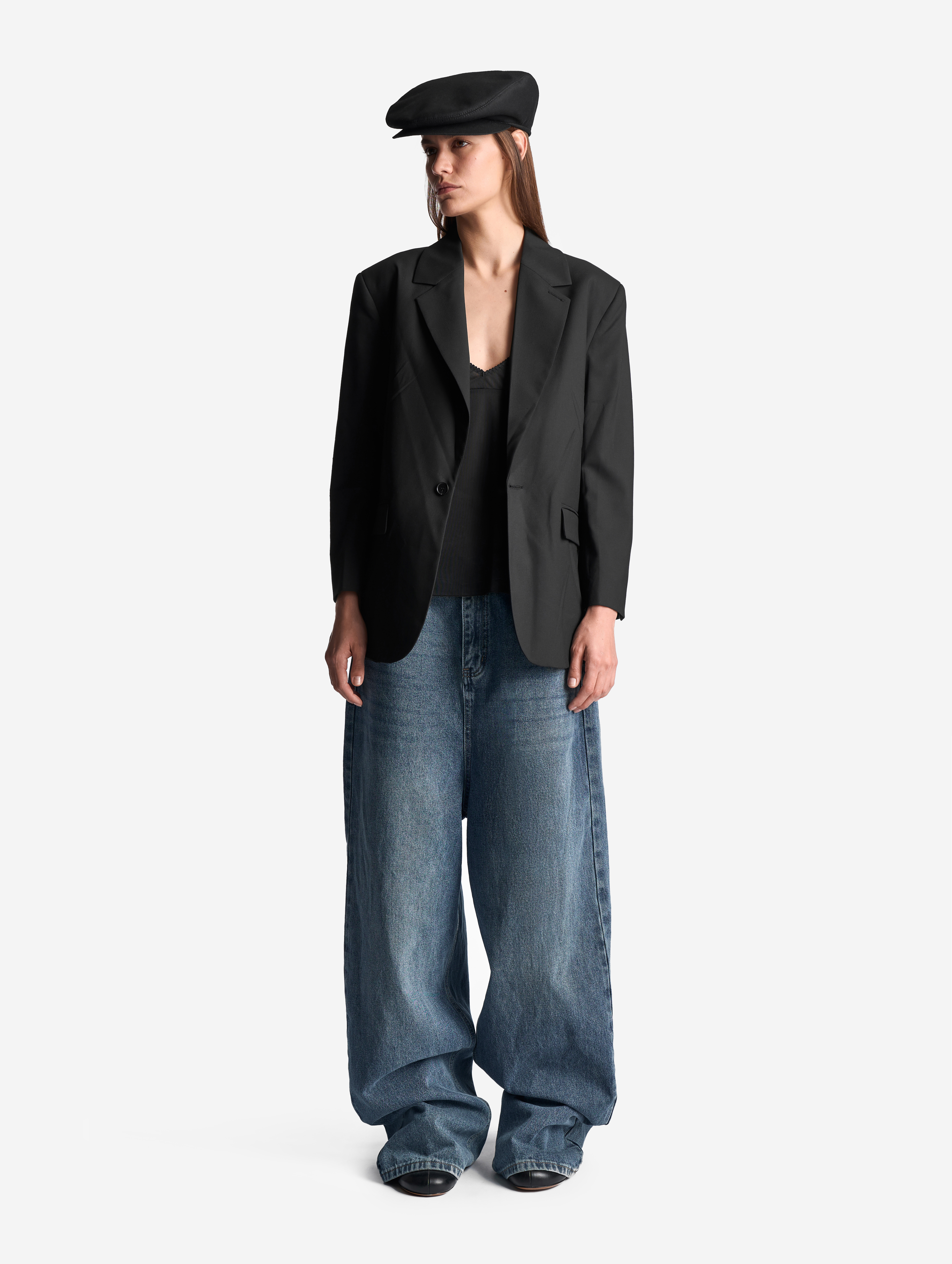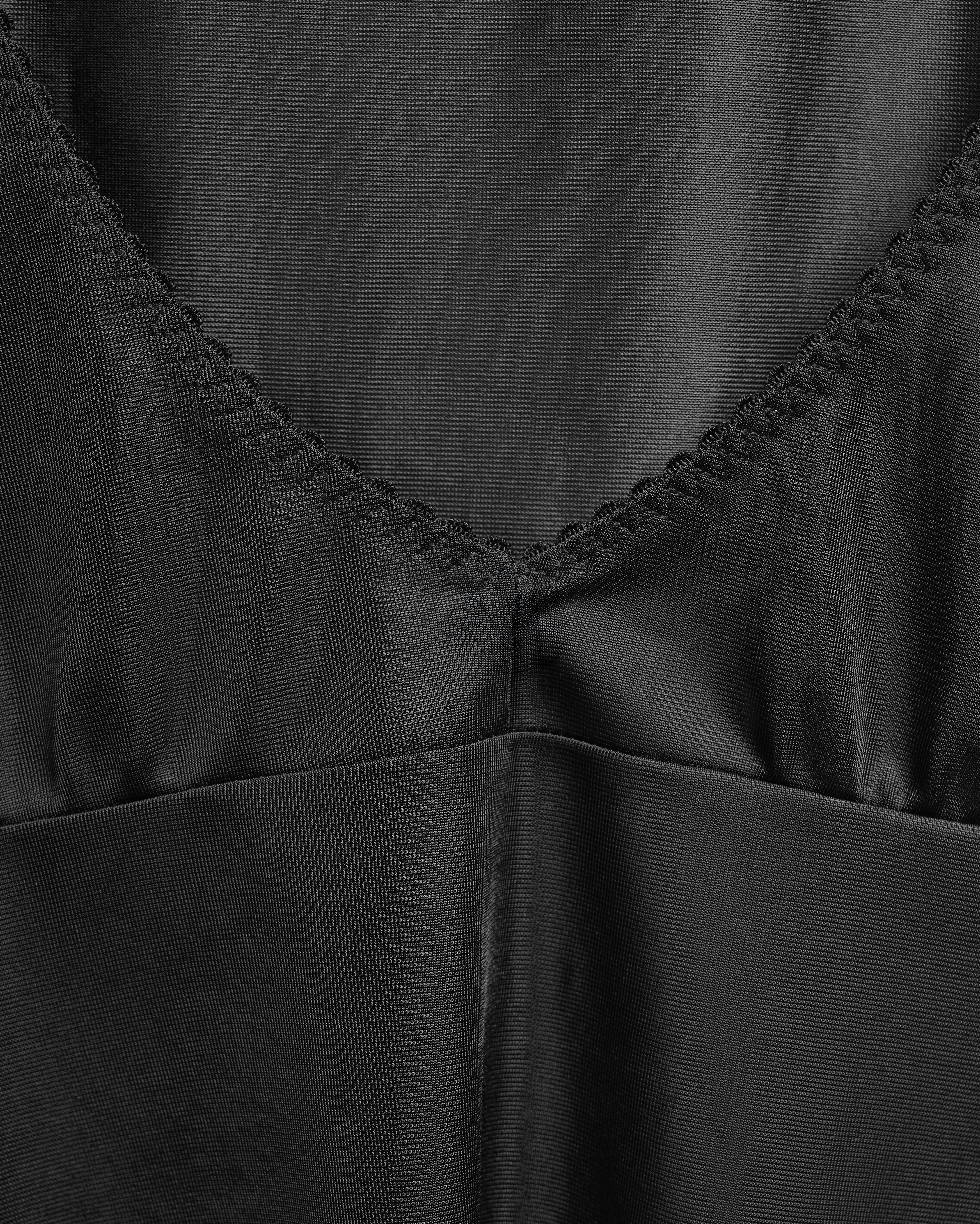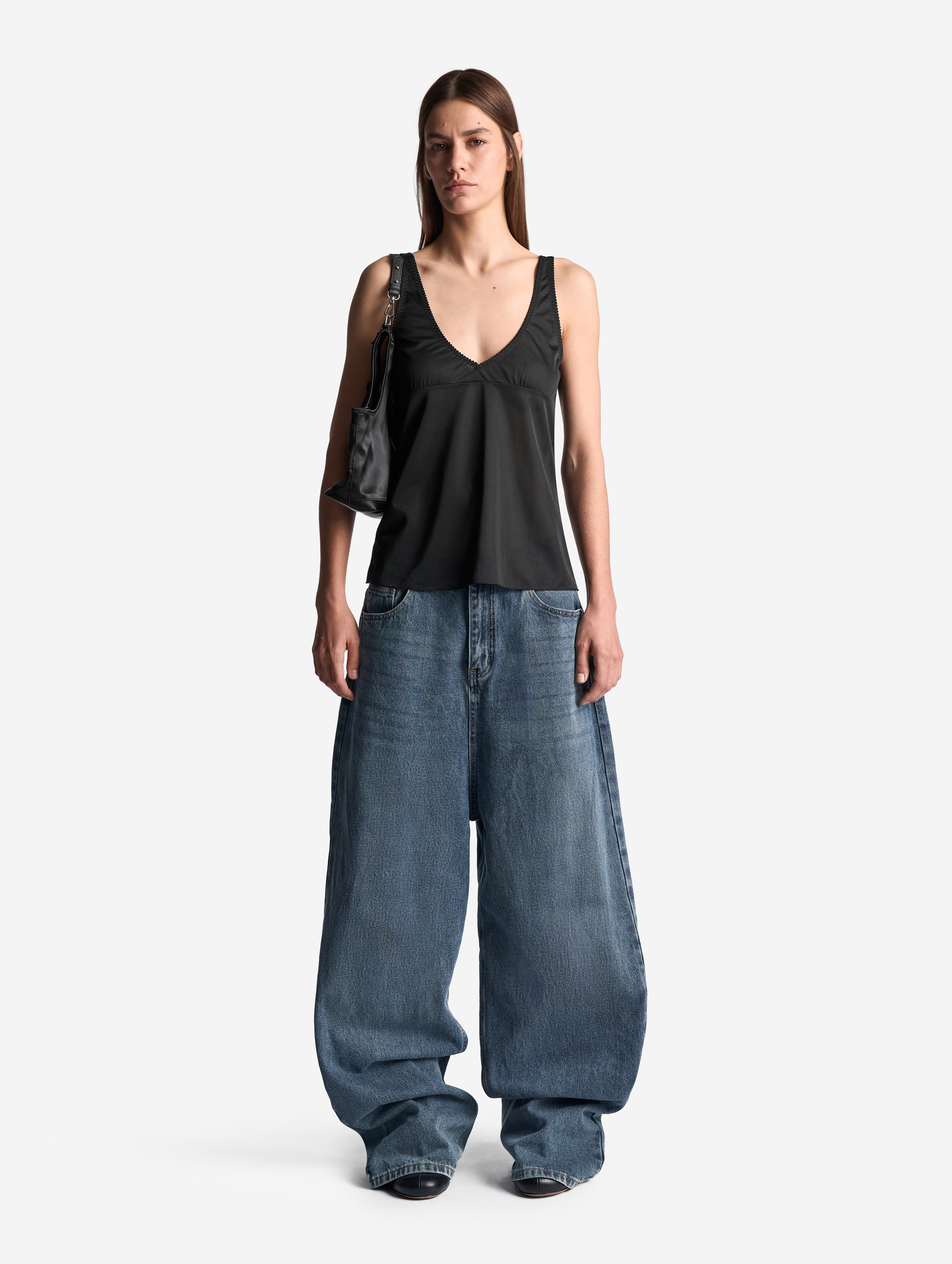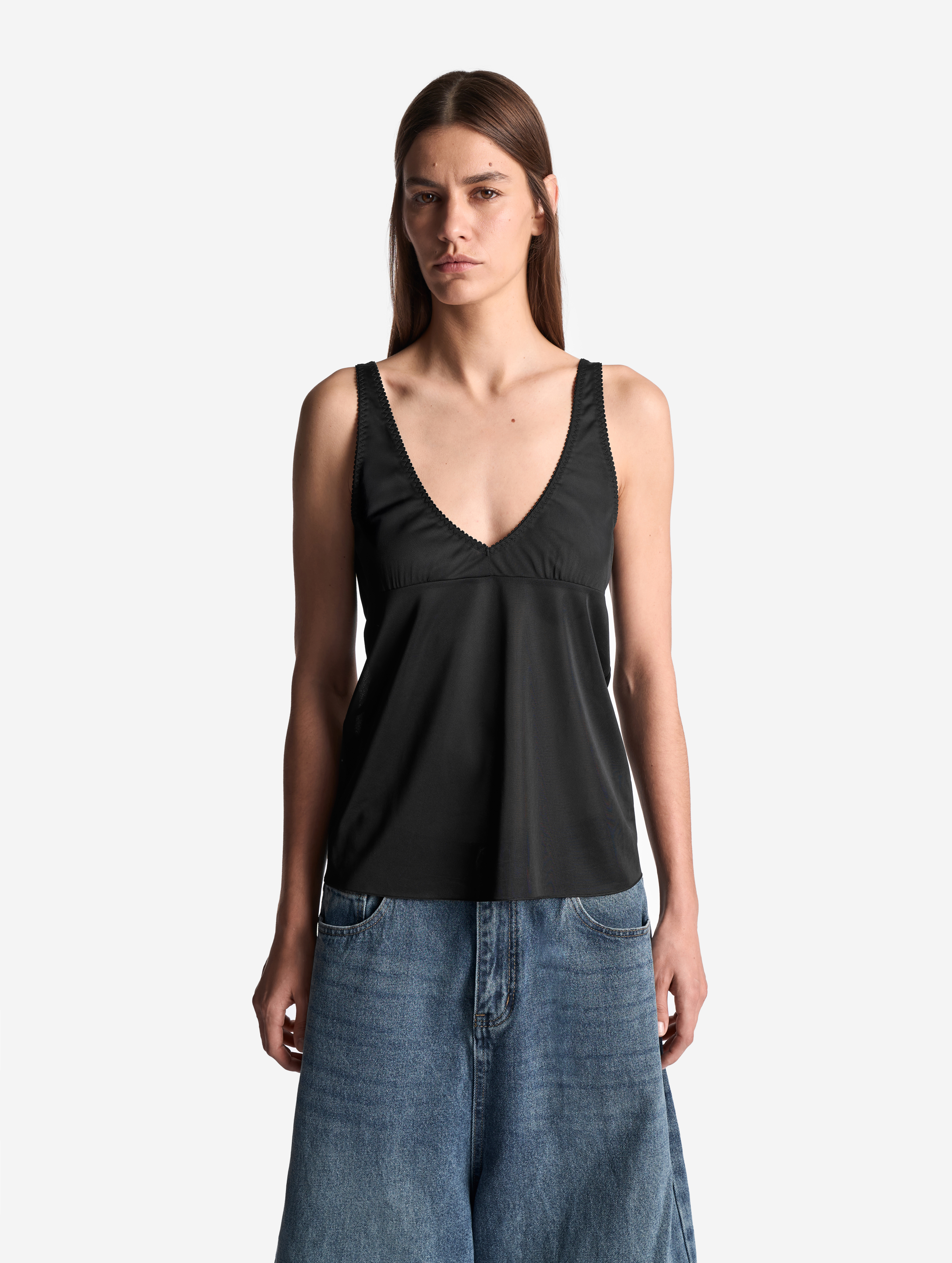 The lingerie-inspired elements in the Garderobe line are united by the evocative prefix “negligee.” In this collection, you'll find retro silhouettes that feel both familiar and refreshing. This tank top features a straight cut, a deep neckline, and a closed back. The armholes and the neckline are finished with lacy lingerie elastic stitched in a three-needle zigzag, a detail typically used in lingerie design.