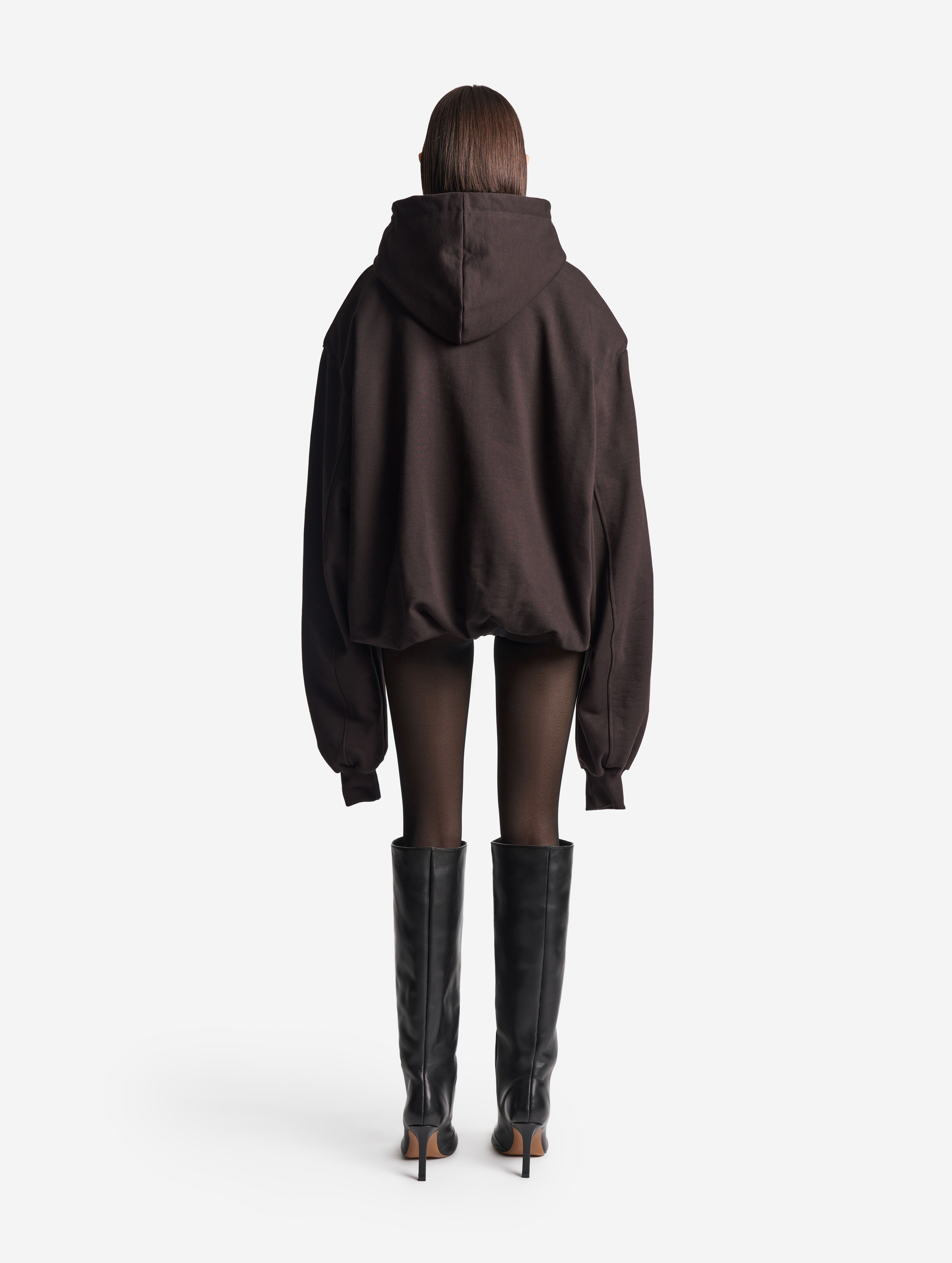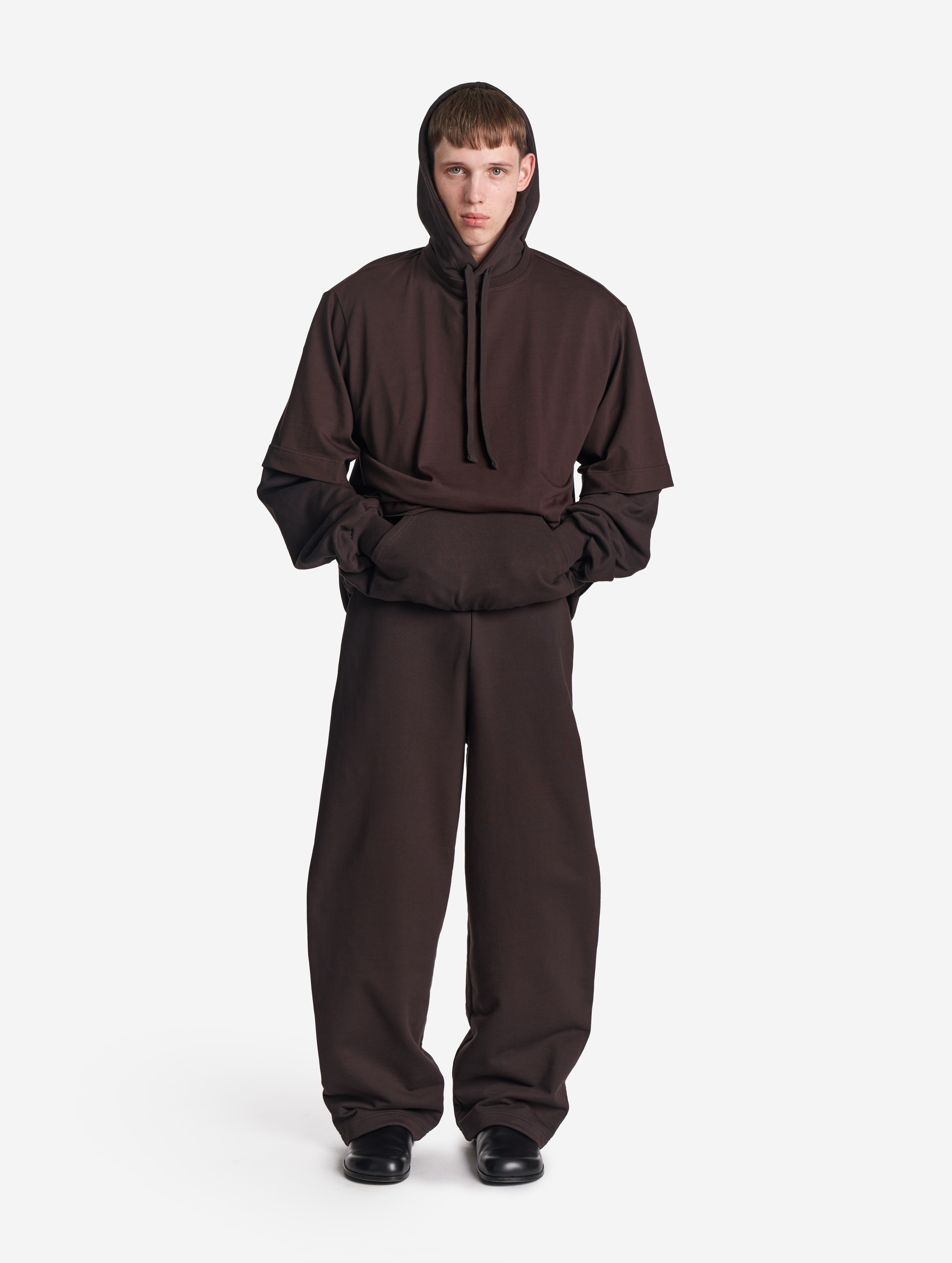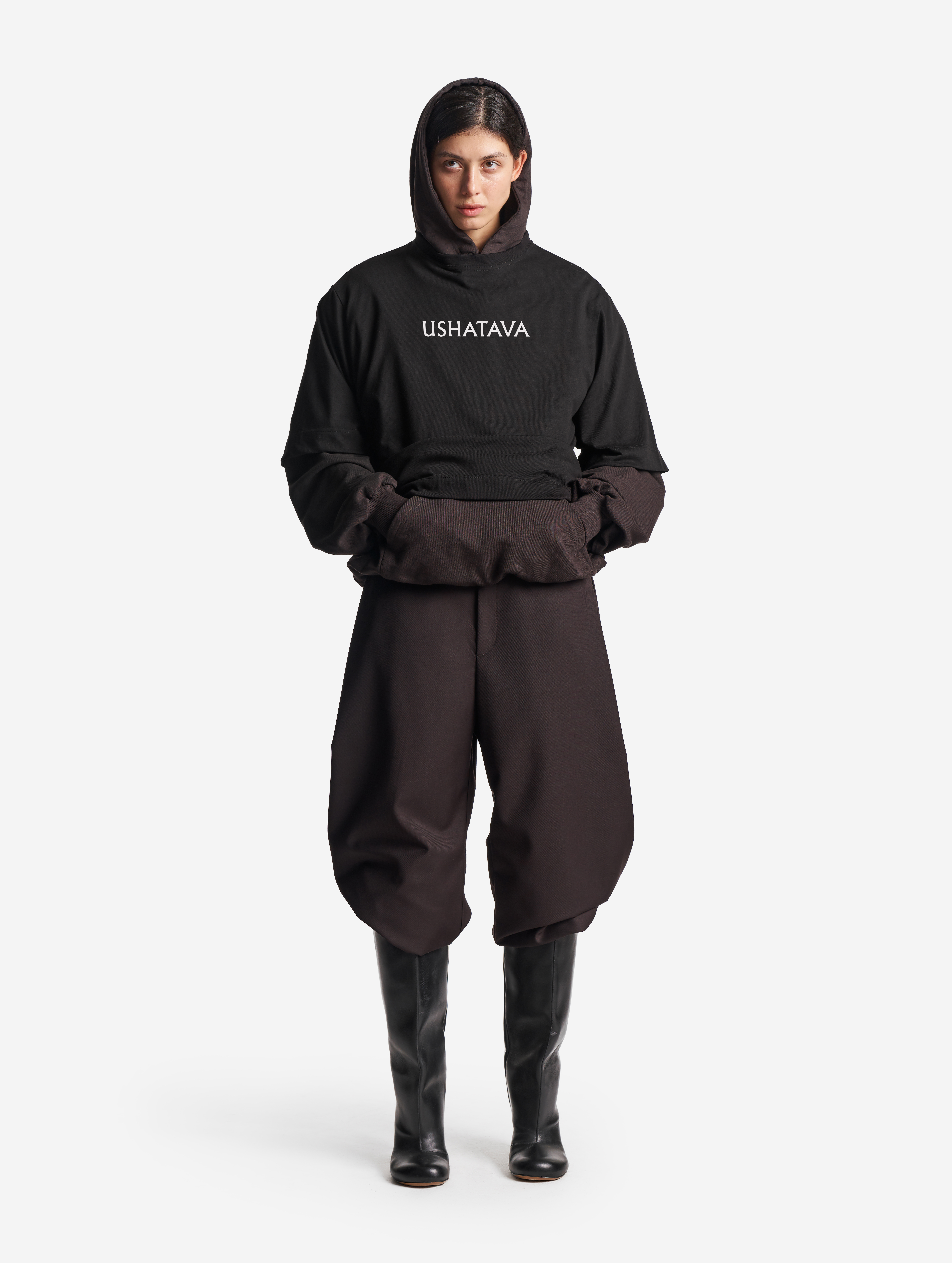 Это худи оверсайз-силуэта можно носить на две стороны. Изделие выполнено из футера, а внутри обработано тонким трикотажем. Вывернутая наизнанку, эта вещь выглядит так, будто поверх худи надели футболку. На подкладке находятся плечевые карманы, предназначенные для фиксации мягких подплечников, которые при желании можно убрать. Удлиненный рукав и низ изделия обработаны резинкой из кашкорсе. Спинка худи украшена фирменной нашивкой Ushatava. Из деталей: карман-кенгуру, капюшон на шнурке.