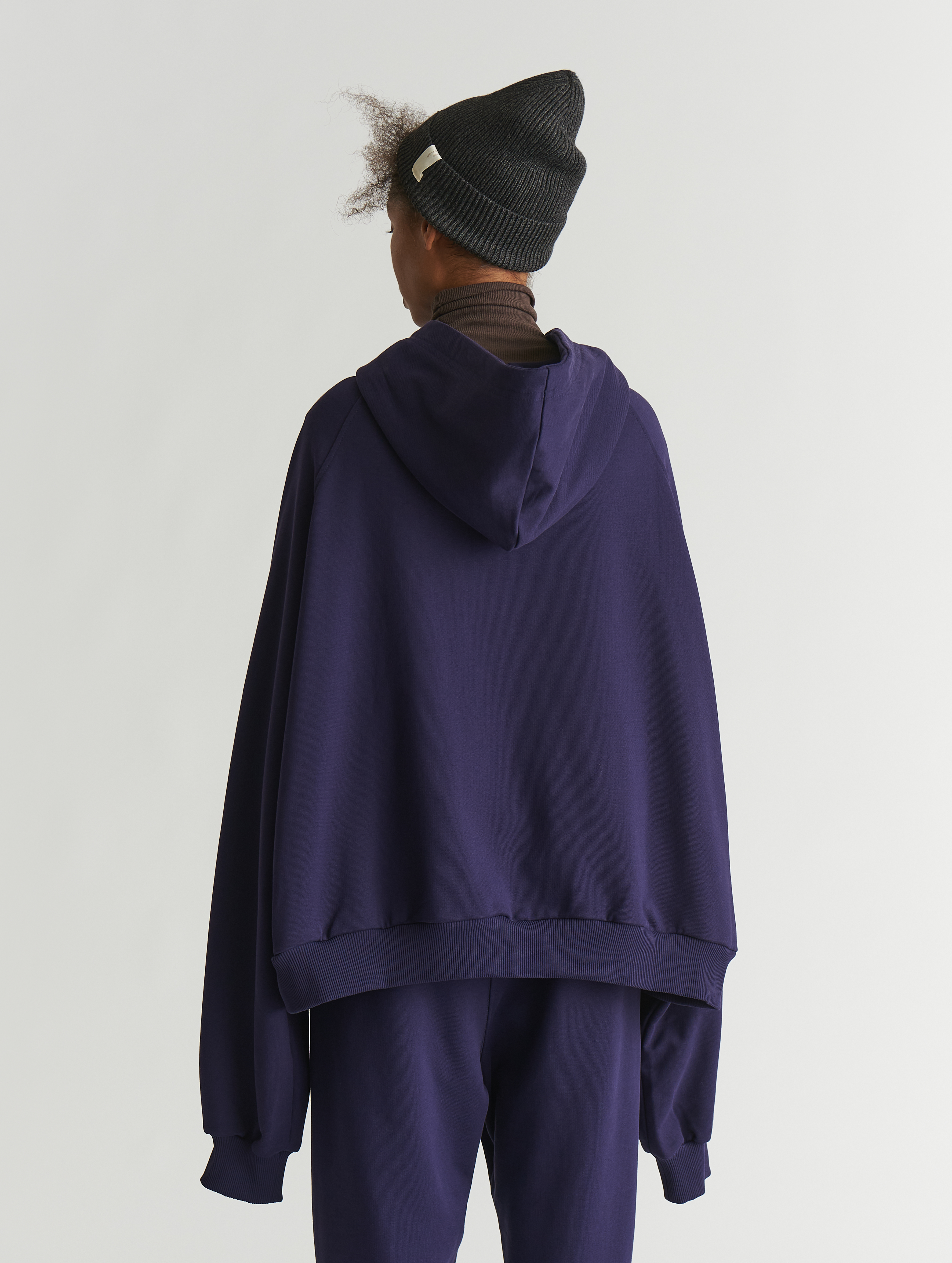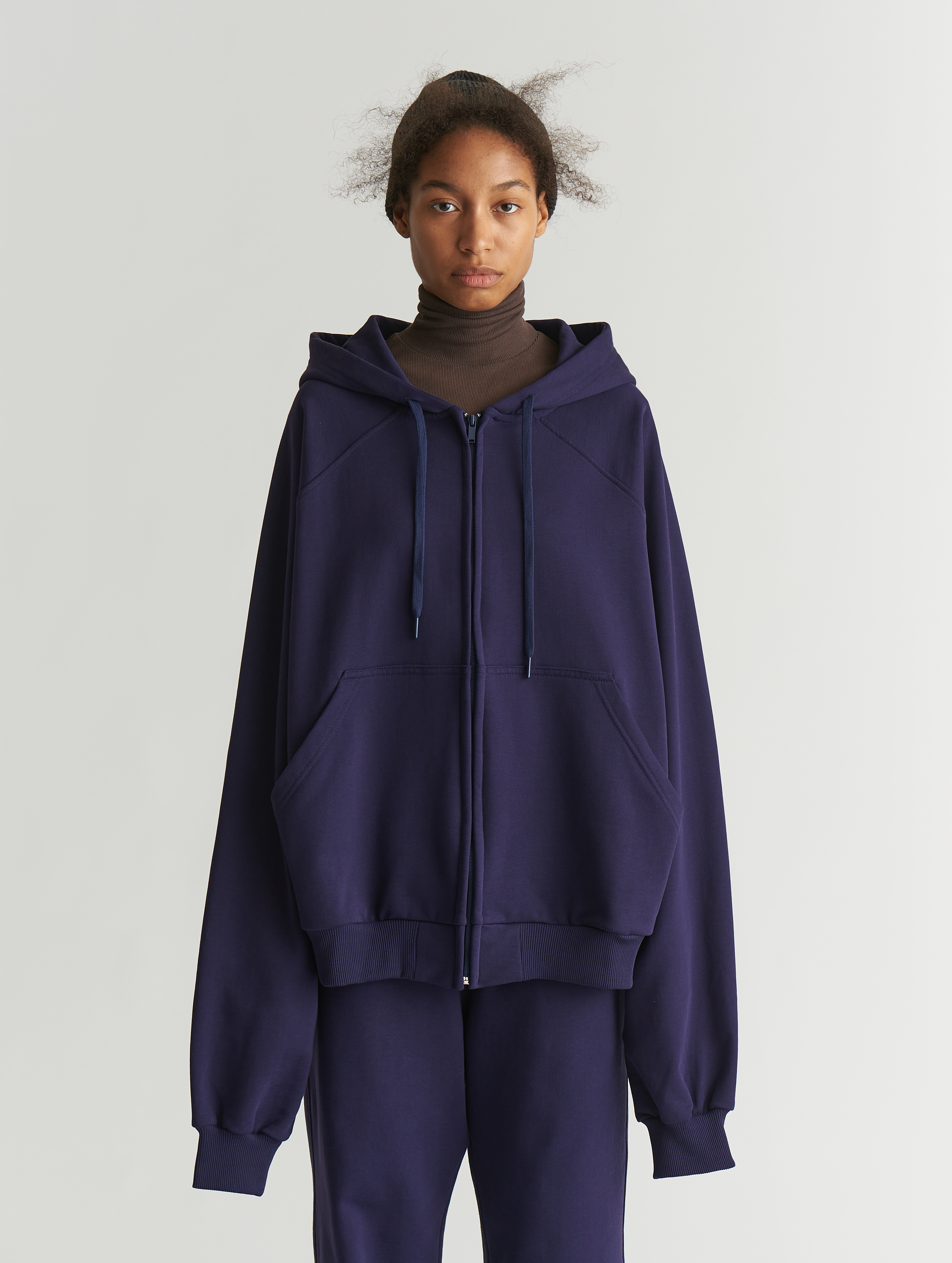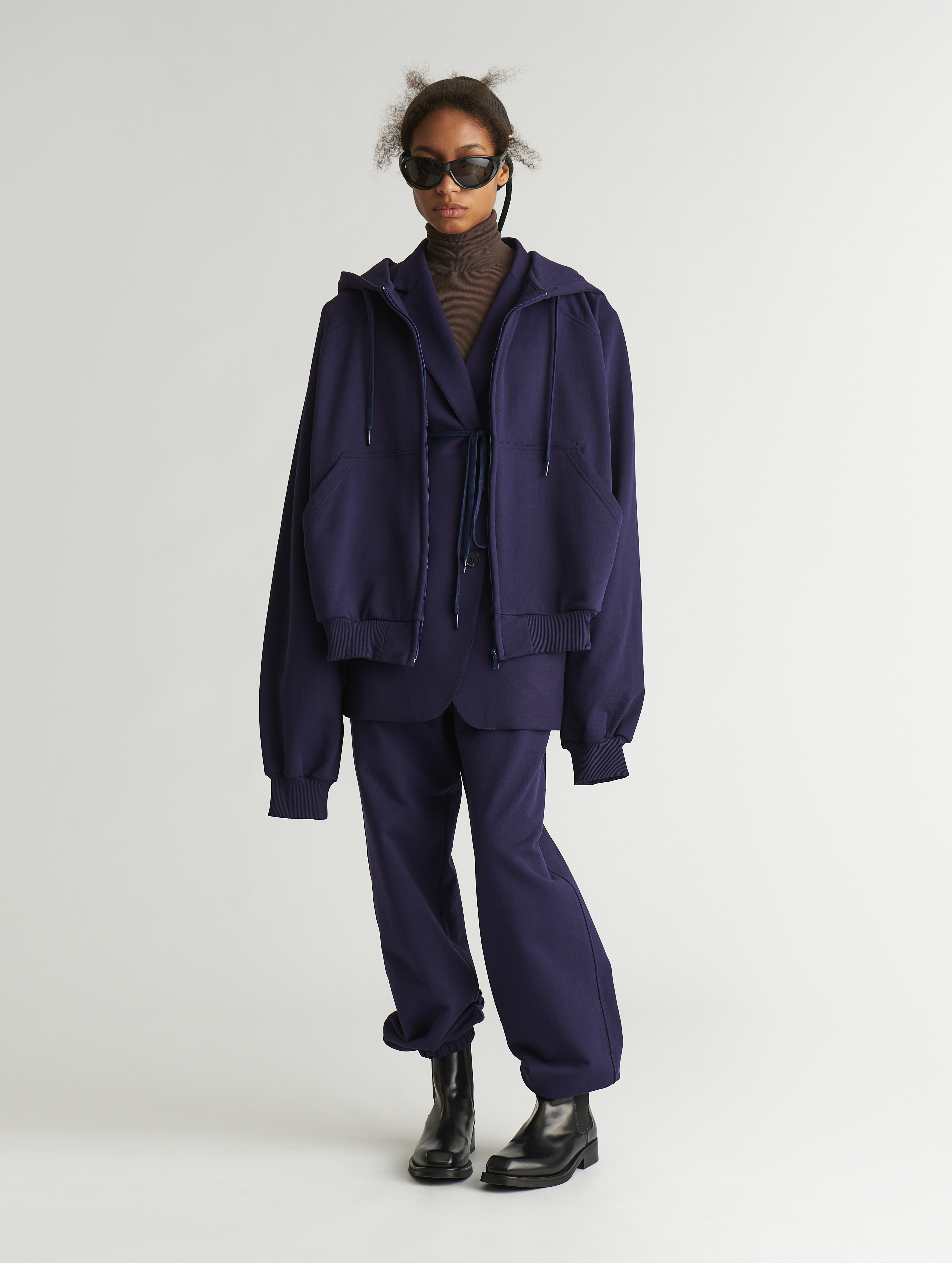 Олимпийка оверсайз-силуэта и умеренной длины. Она выполнена из плотного формоустойчивого футера. Ее ключевая особенность — в утрированно вытянутых рукавах. Застегивается на молнию, капюшон затягивается шнурком, есть накладной карман-кенгуру.