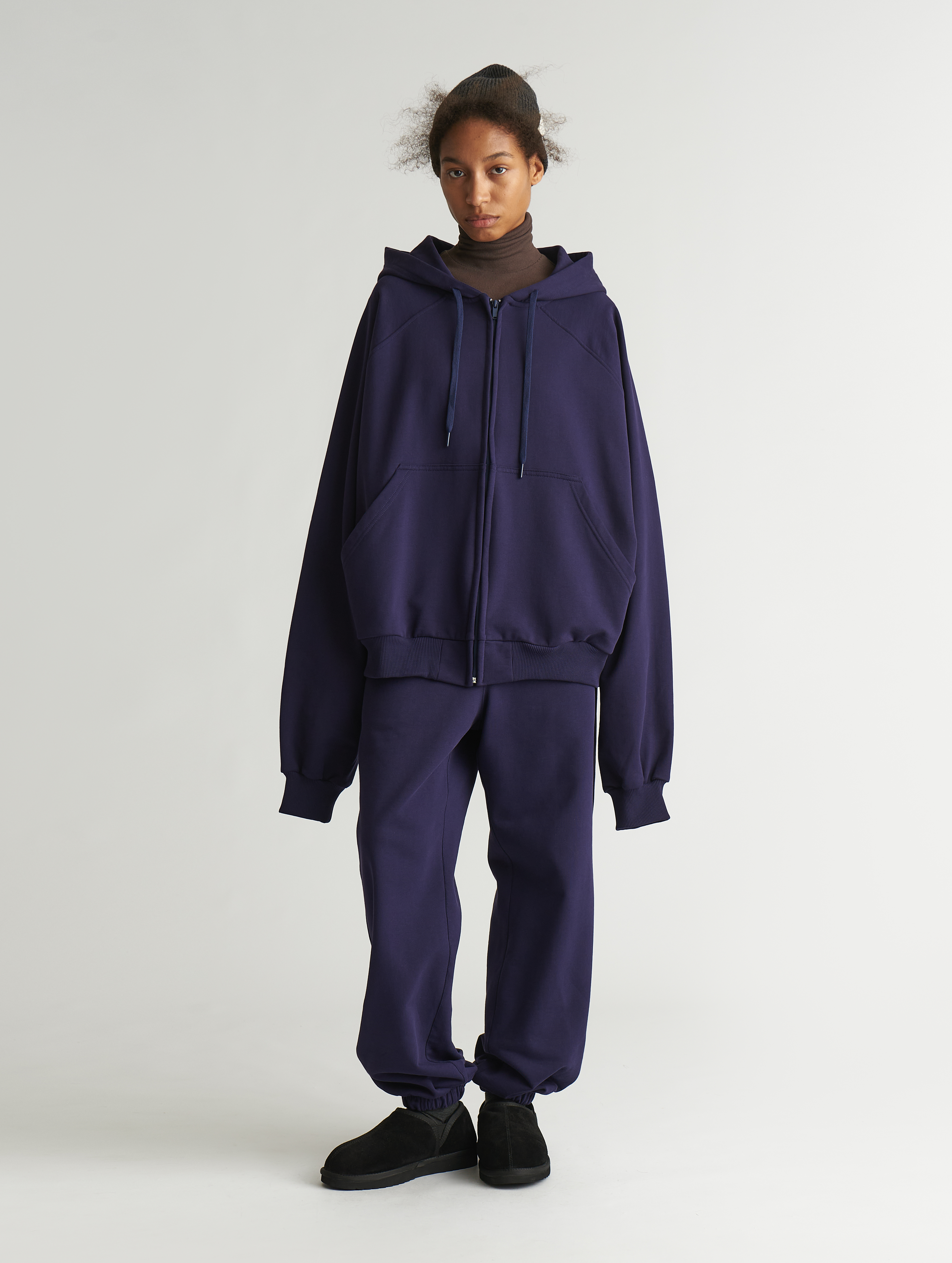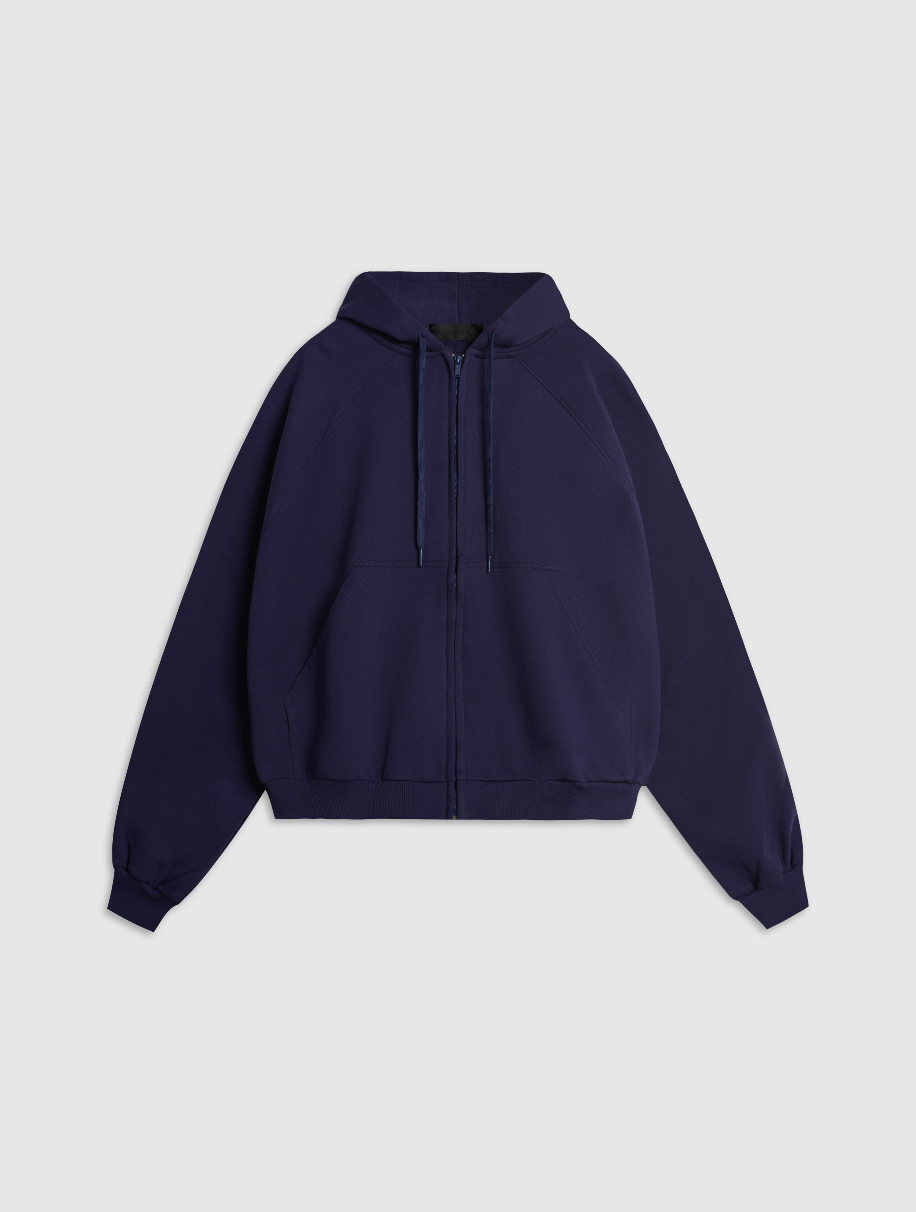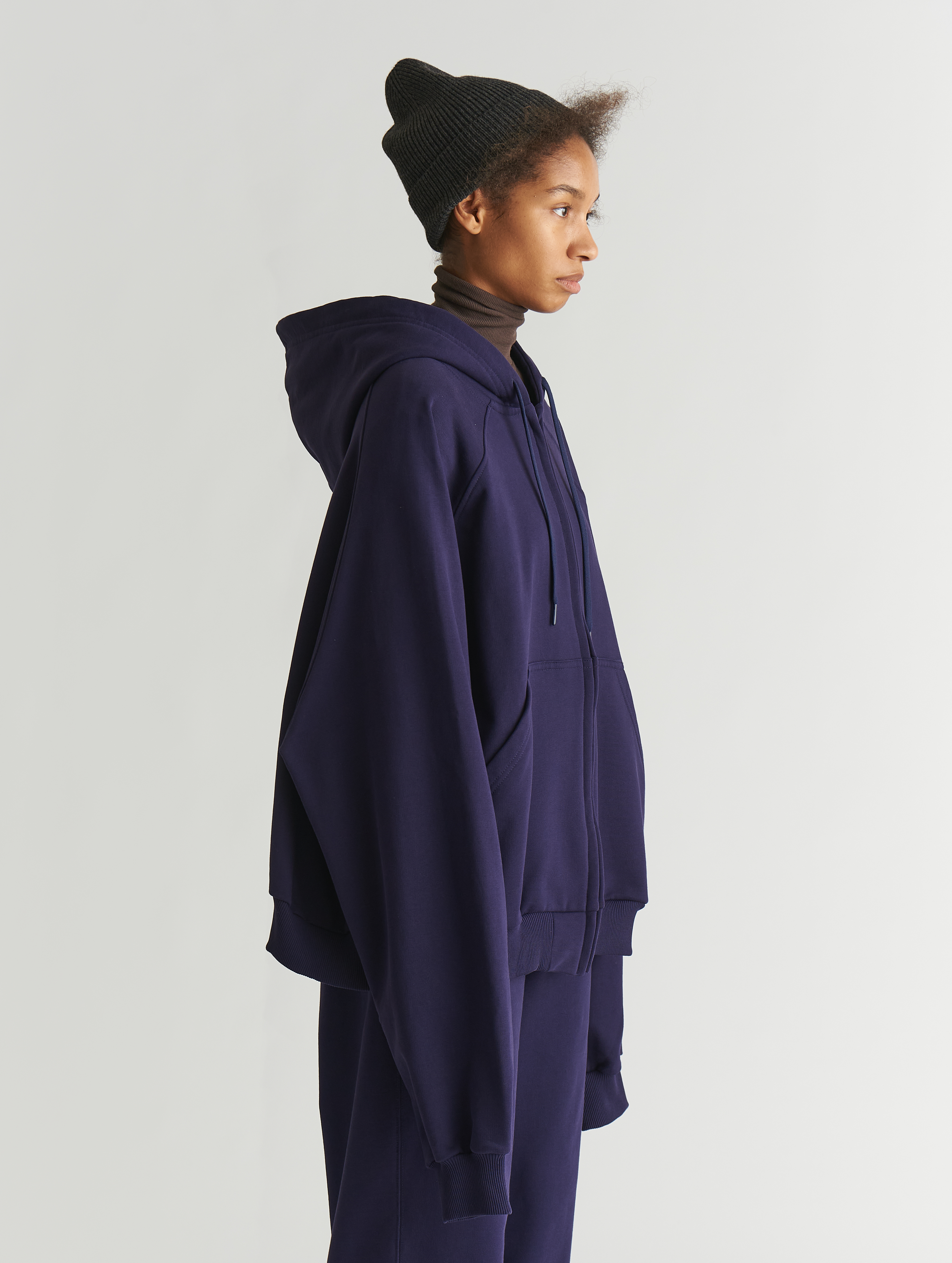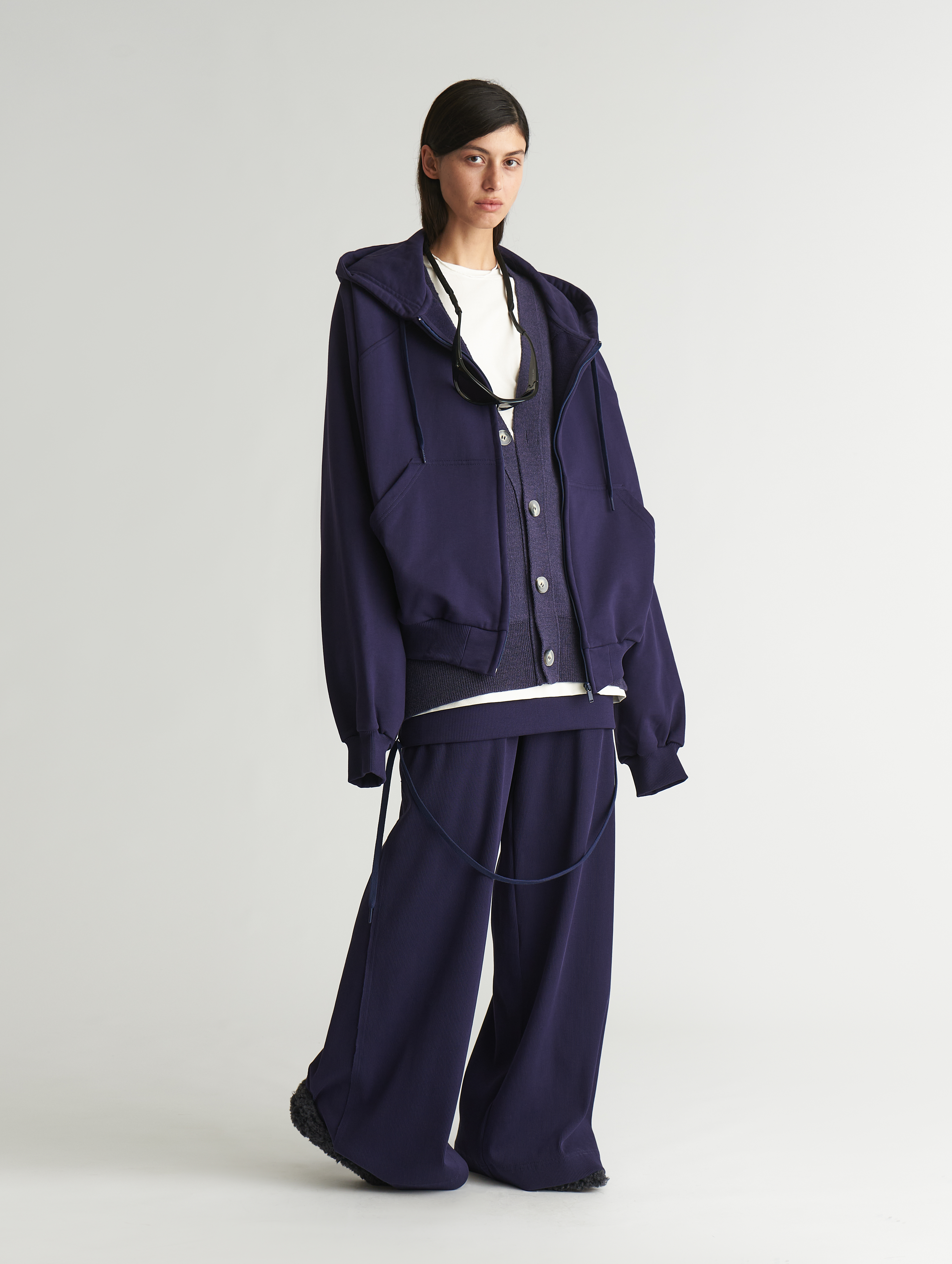 Олимпийка оверсайз-силуэта и умеренной длины. Она выполнена из плотного формоустойчивого футера. Ее ключевая особенность — в утрированно вытянутых рукавах. Застегивается на молнию, капюшон затягивается шнурком, есть накладной карман-кенгуру.
