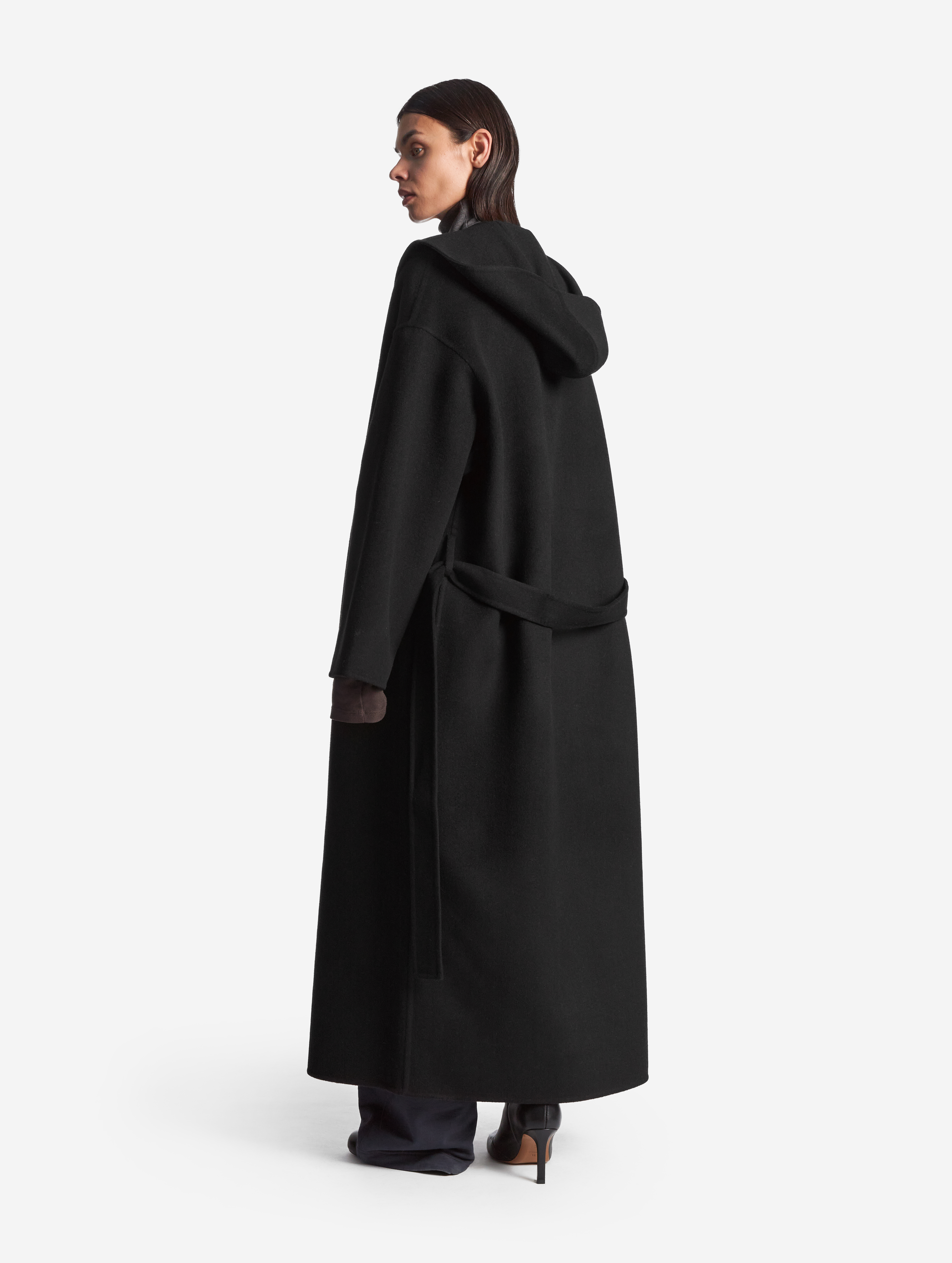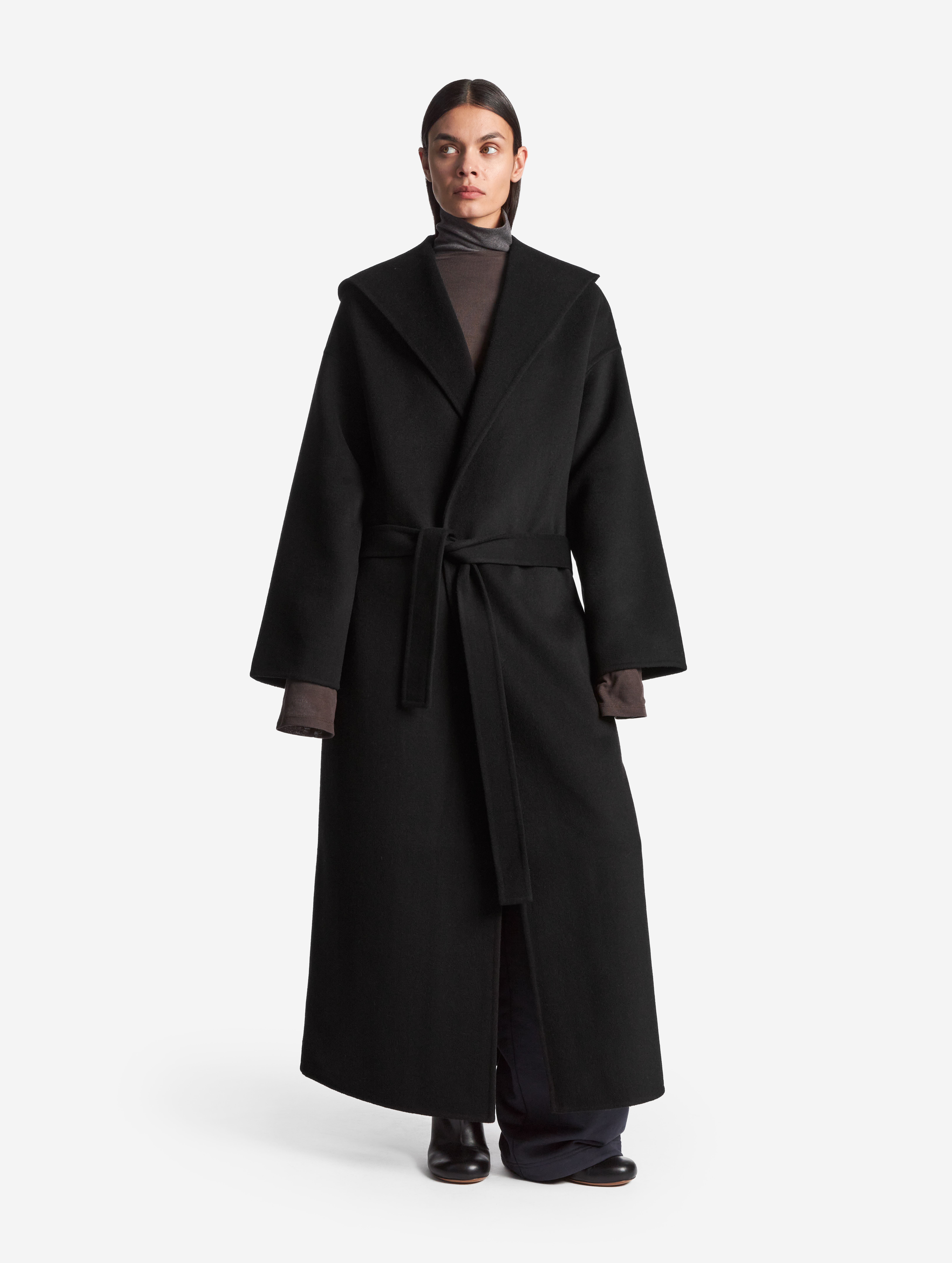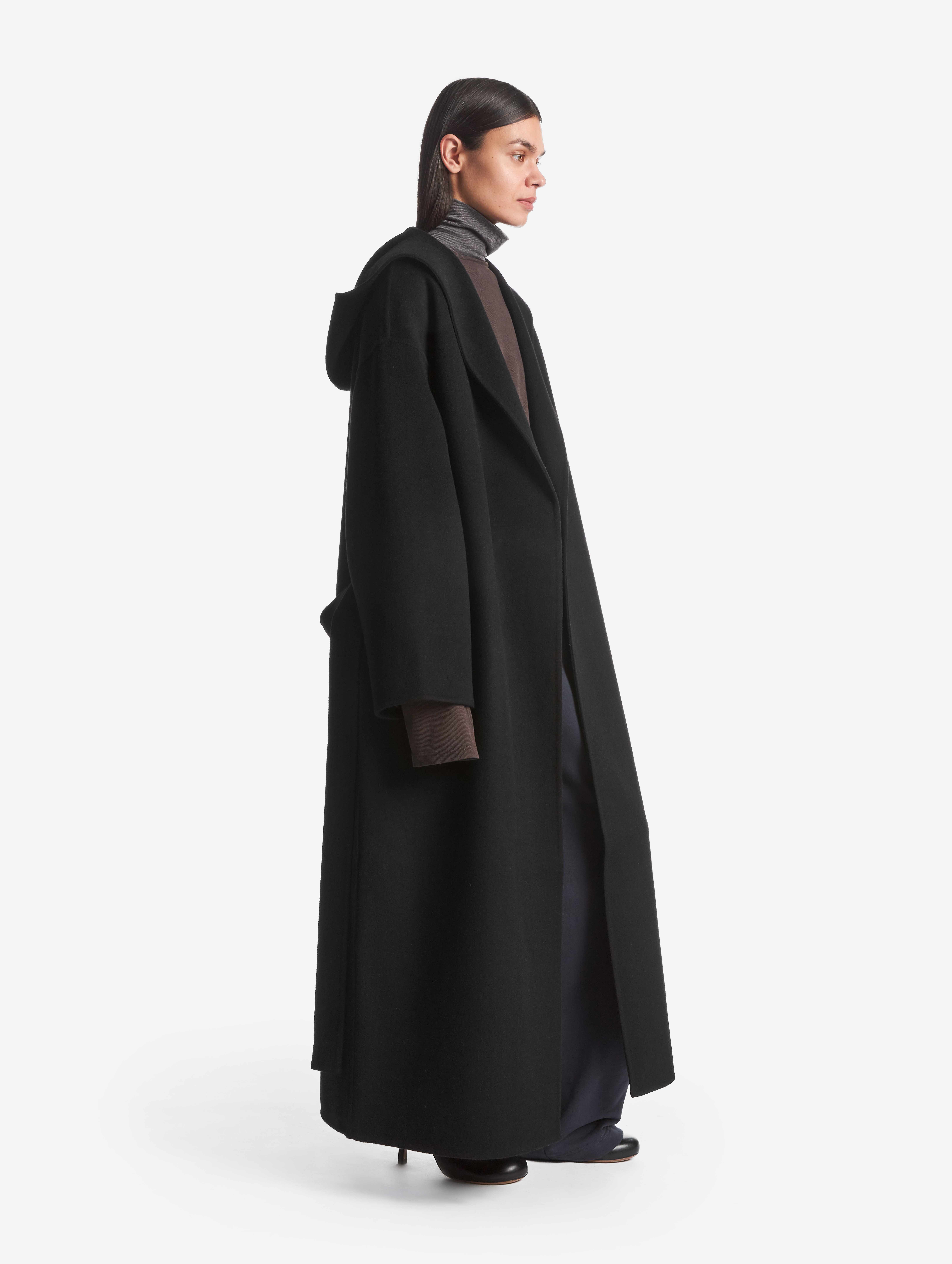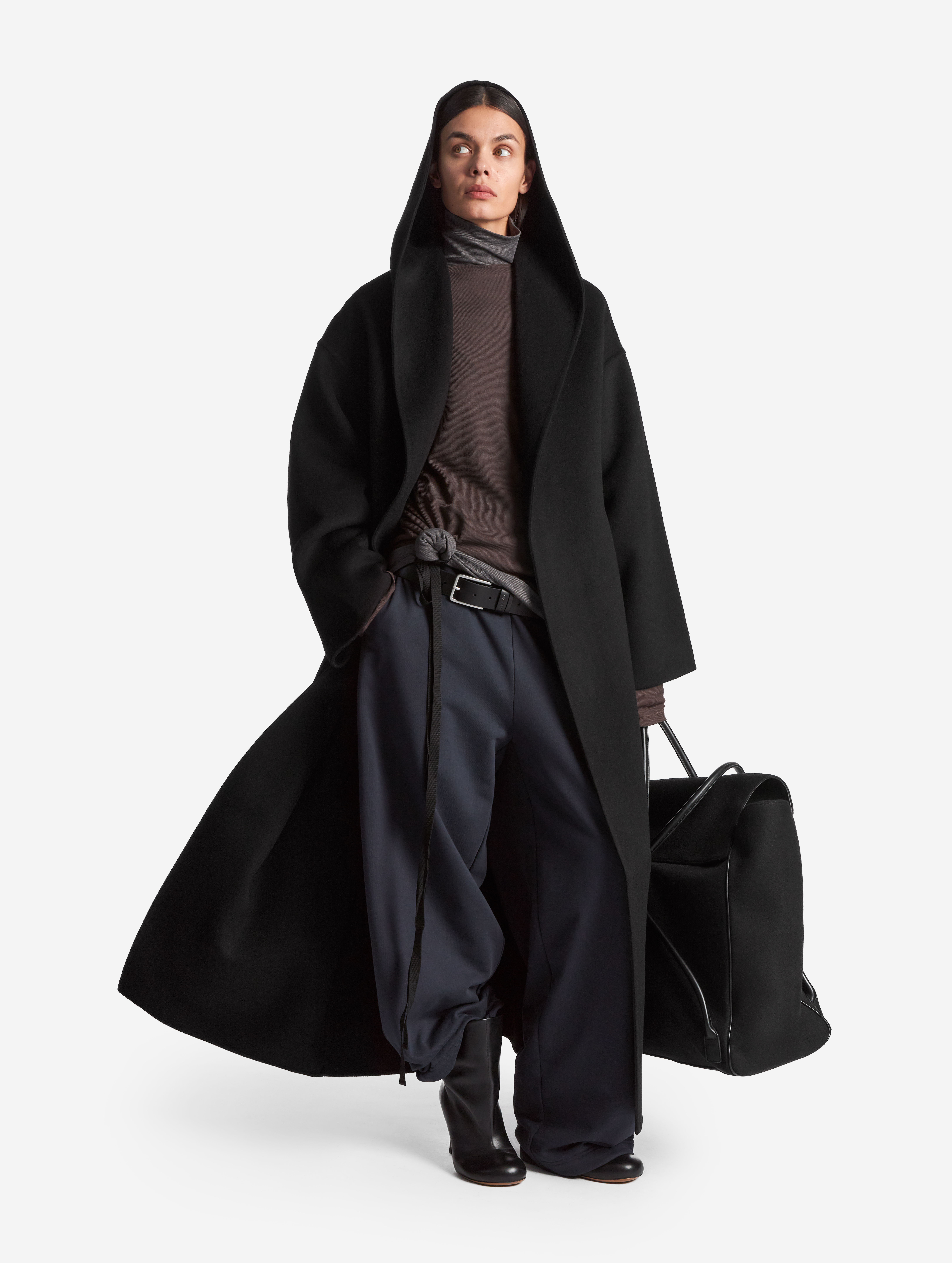 Пальто-халат создано по той же технологии, что и пальто с шалевым воротником — все швы запакованы и незаметны глазу. У этого изделия объемный капюшон и широкий, как у кимоно, рукав. Минимализм форм воплощен не только в силуэте — у пальто нет карманов и застежек. В комплекте есть длинный пояс. Рекомендуемый диапазон температур для носки: с теплым свитером — от +5°C до −5°C.