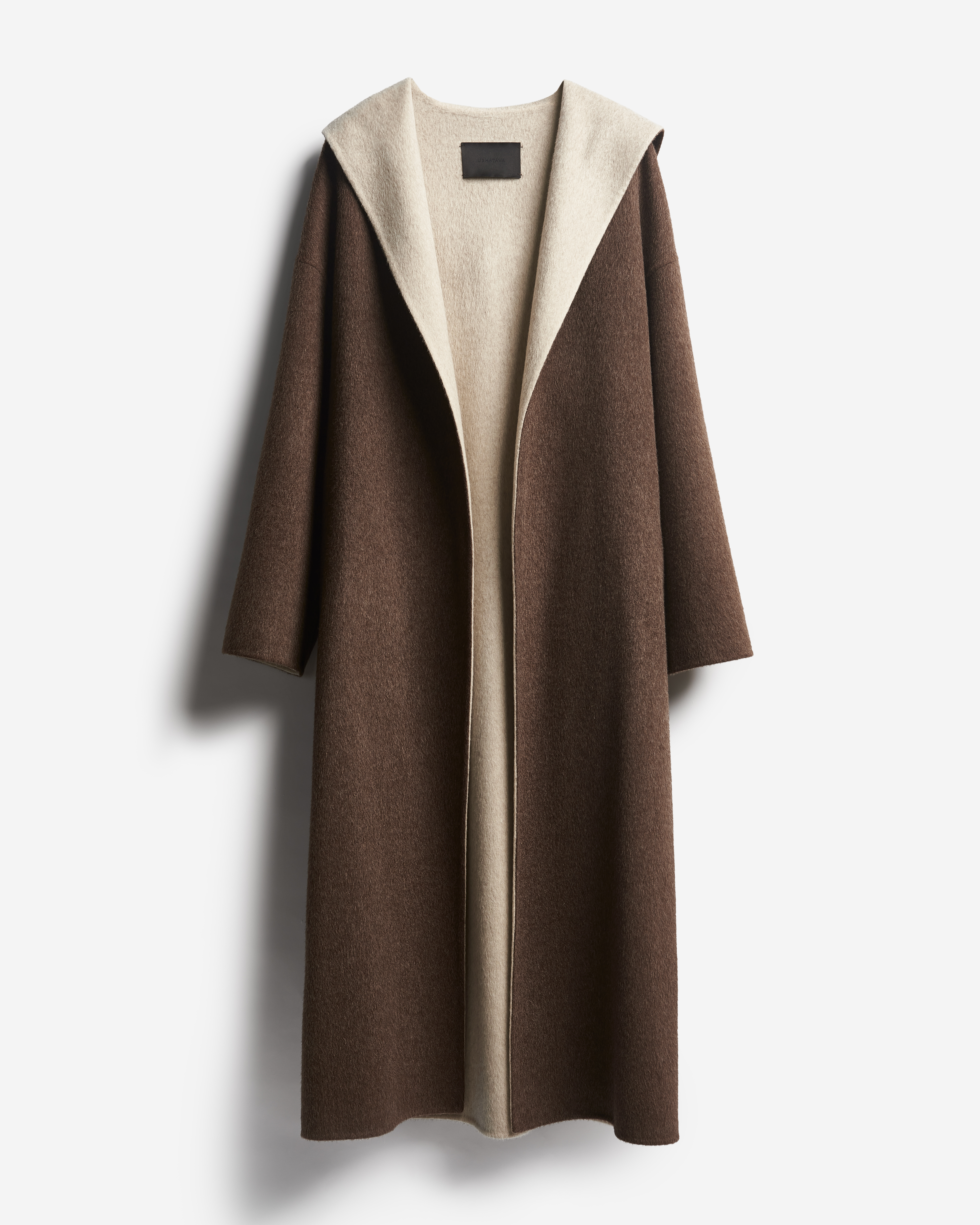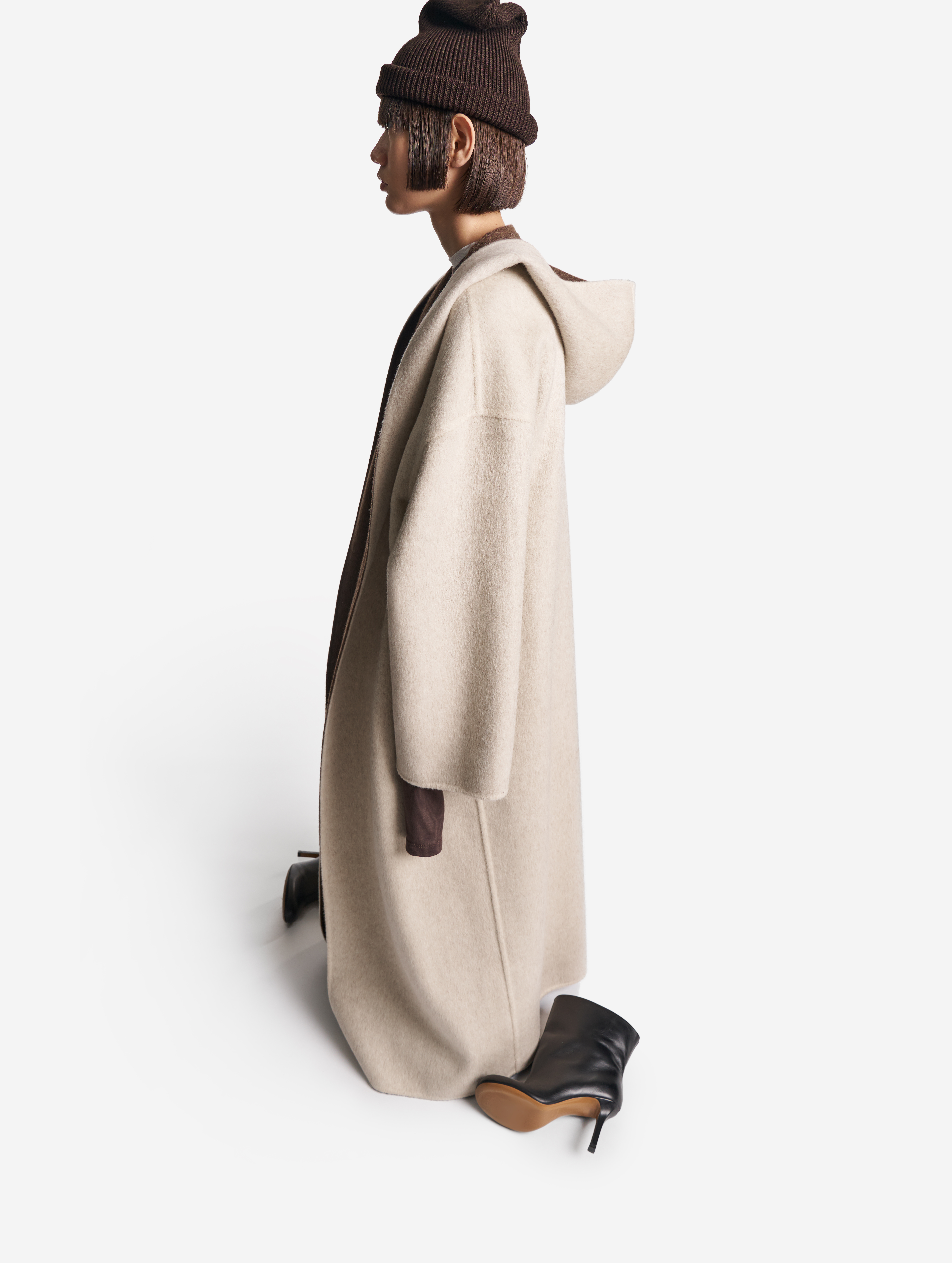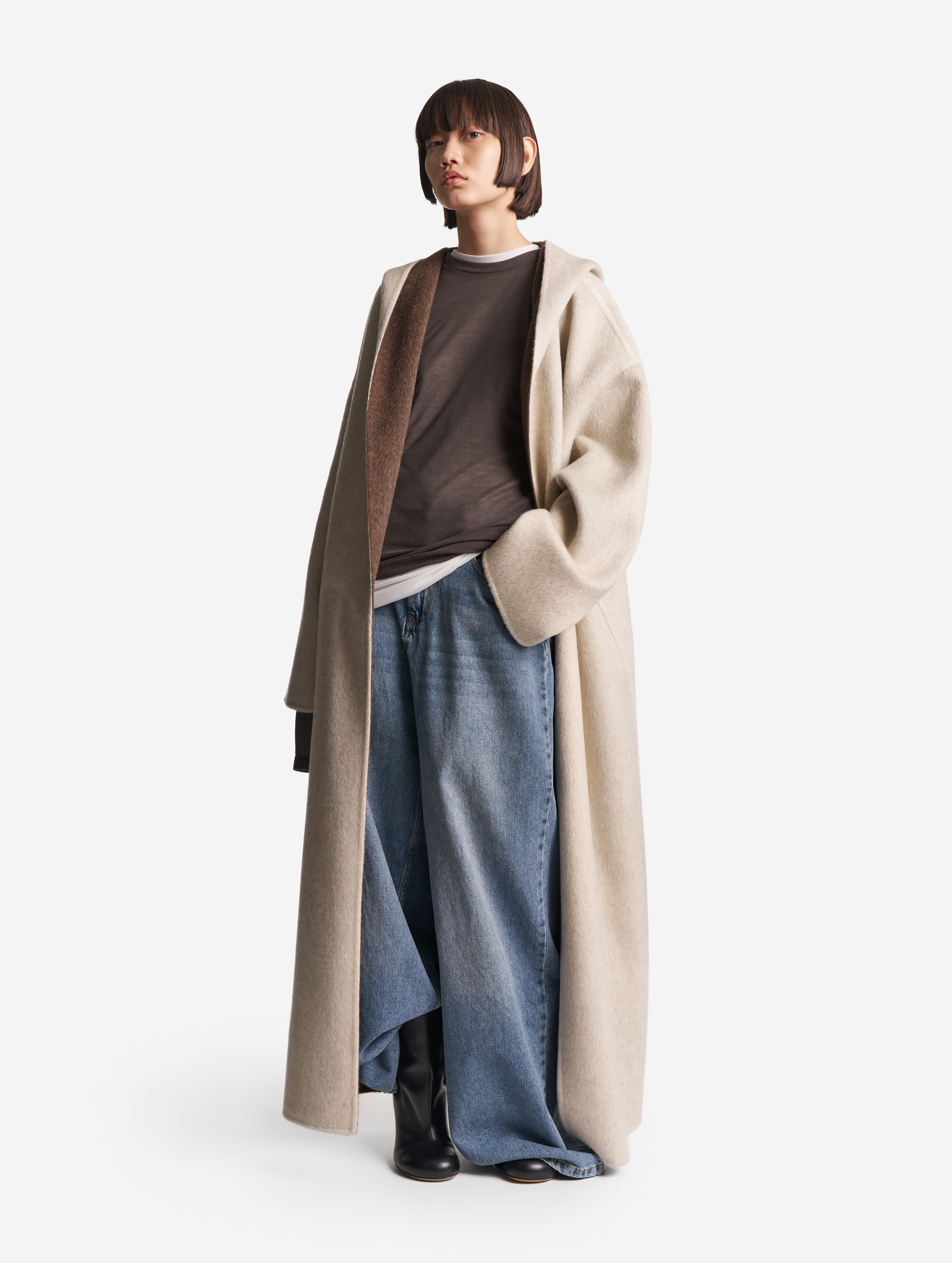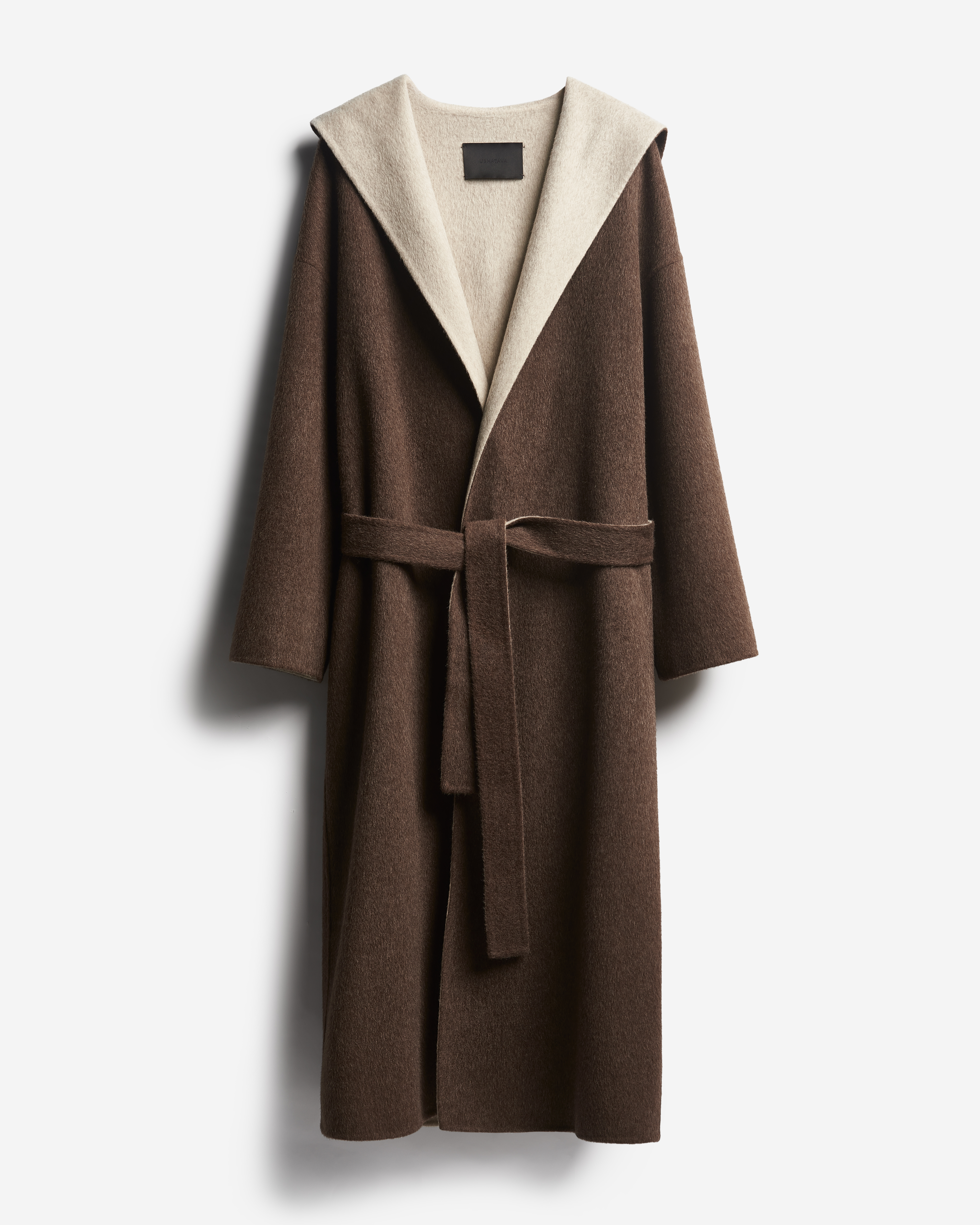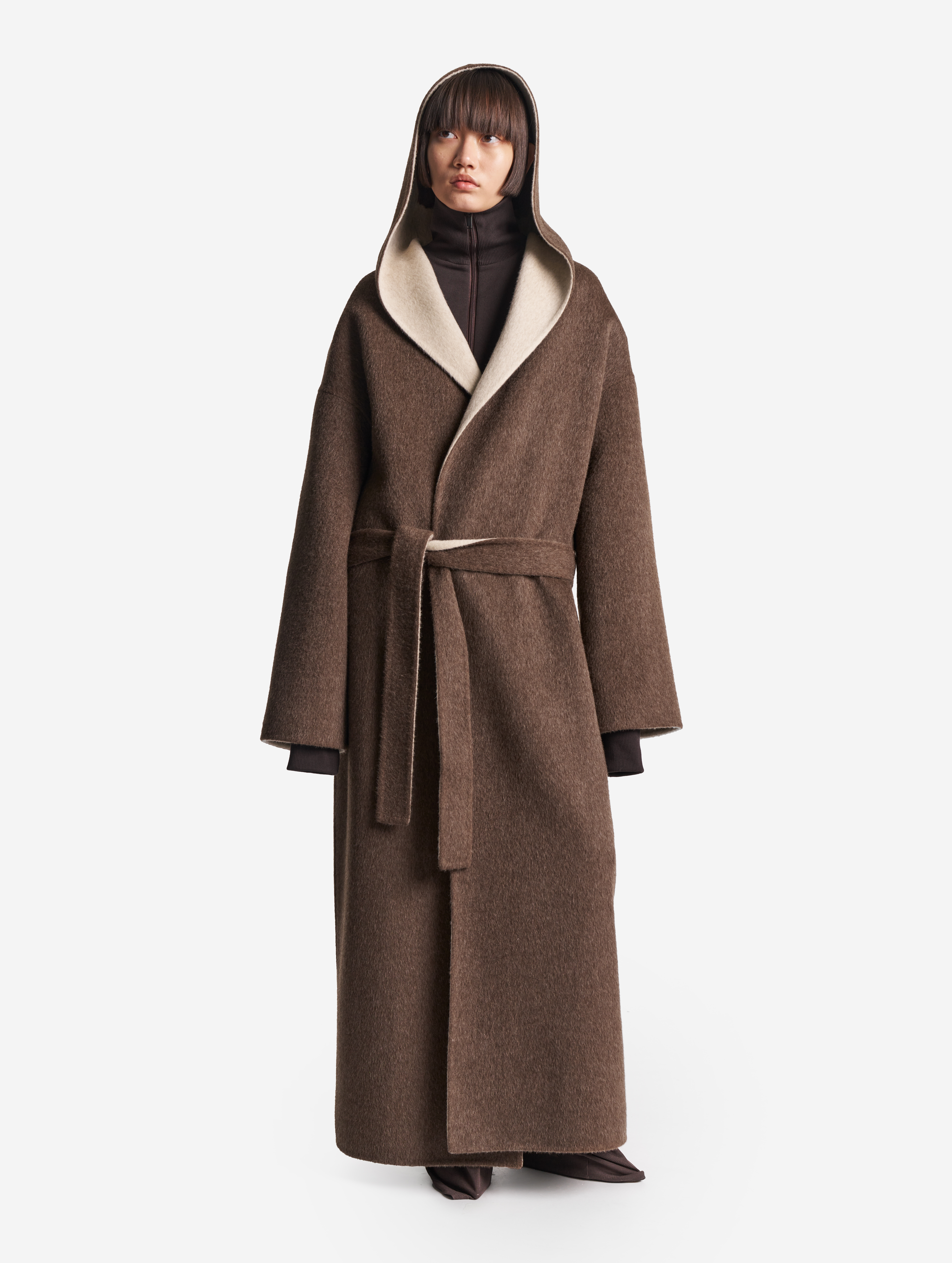 Пальто-халат создано по той же технологии, что и пальто с шалевым воротником — все швы запакованы и незаметны глазу. У этого изделия объемный капюшон и широкий, как у кимоно, рукав. Минимализм форм воплощен не только в силуэте — у пальто нет карманов и застежек. В комплекте есть длинный пояс. Рекомендуемый диапазон температур для носки: с теплым свитером — от +5°C до −5°C.