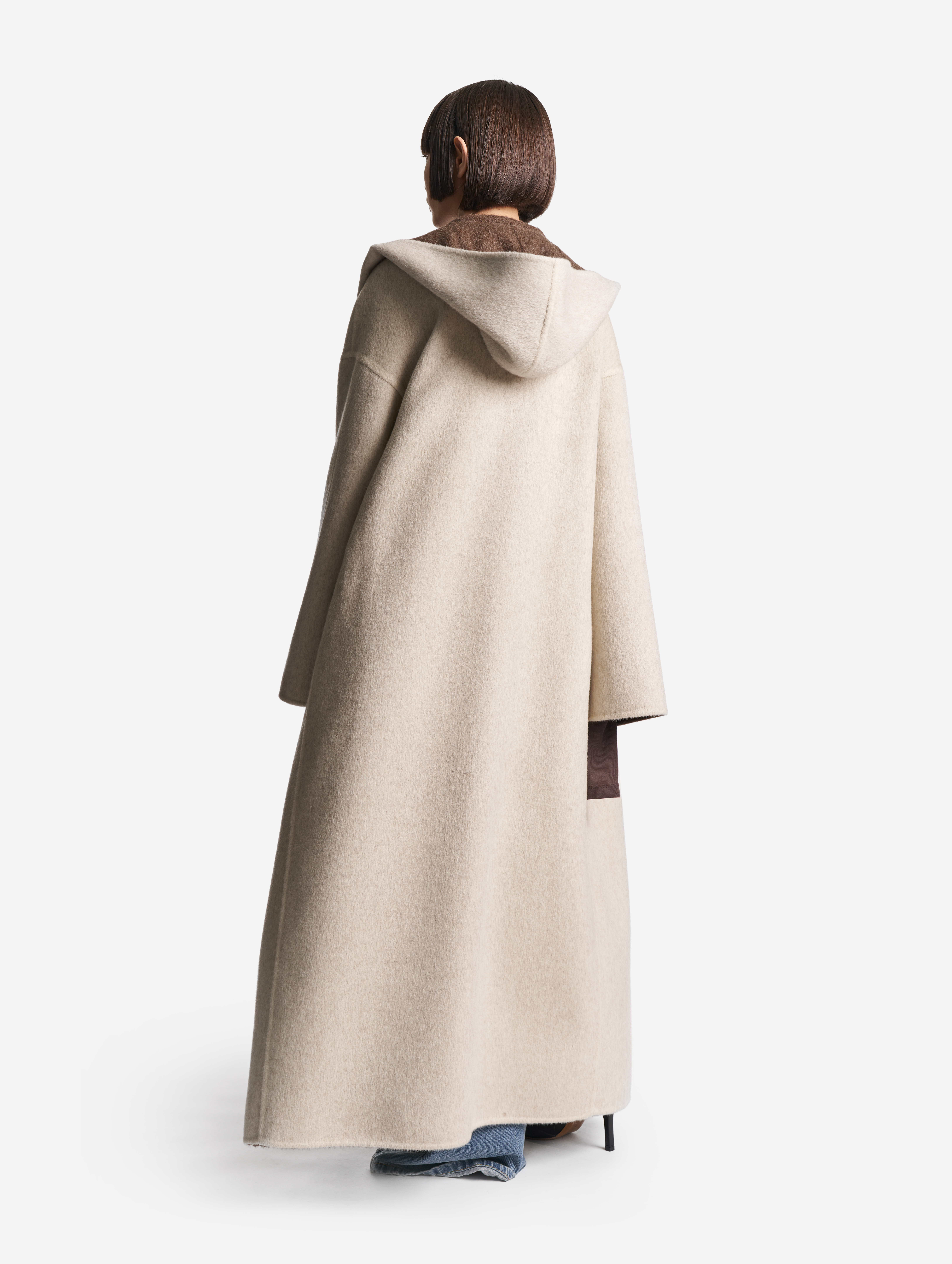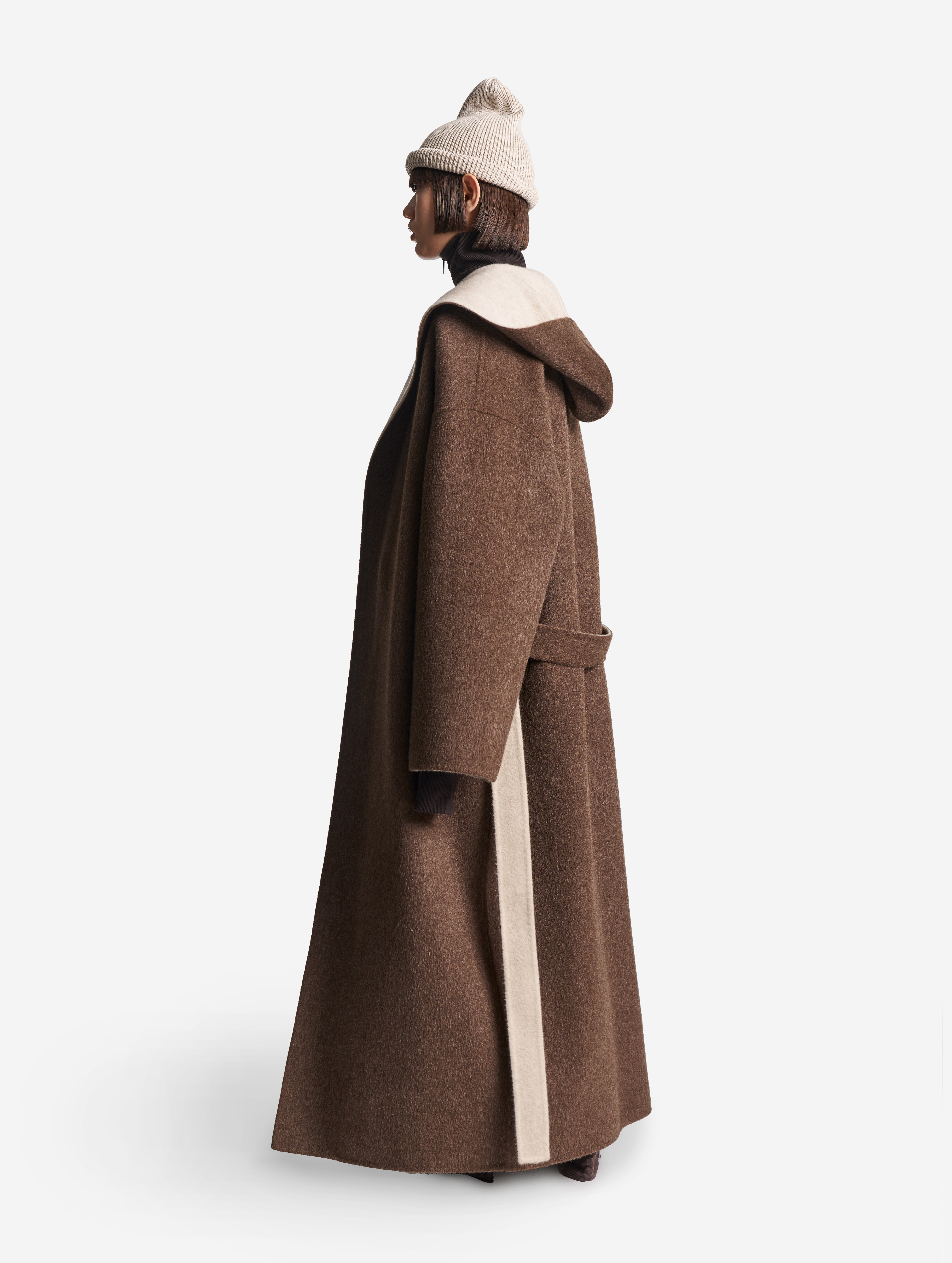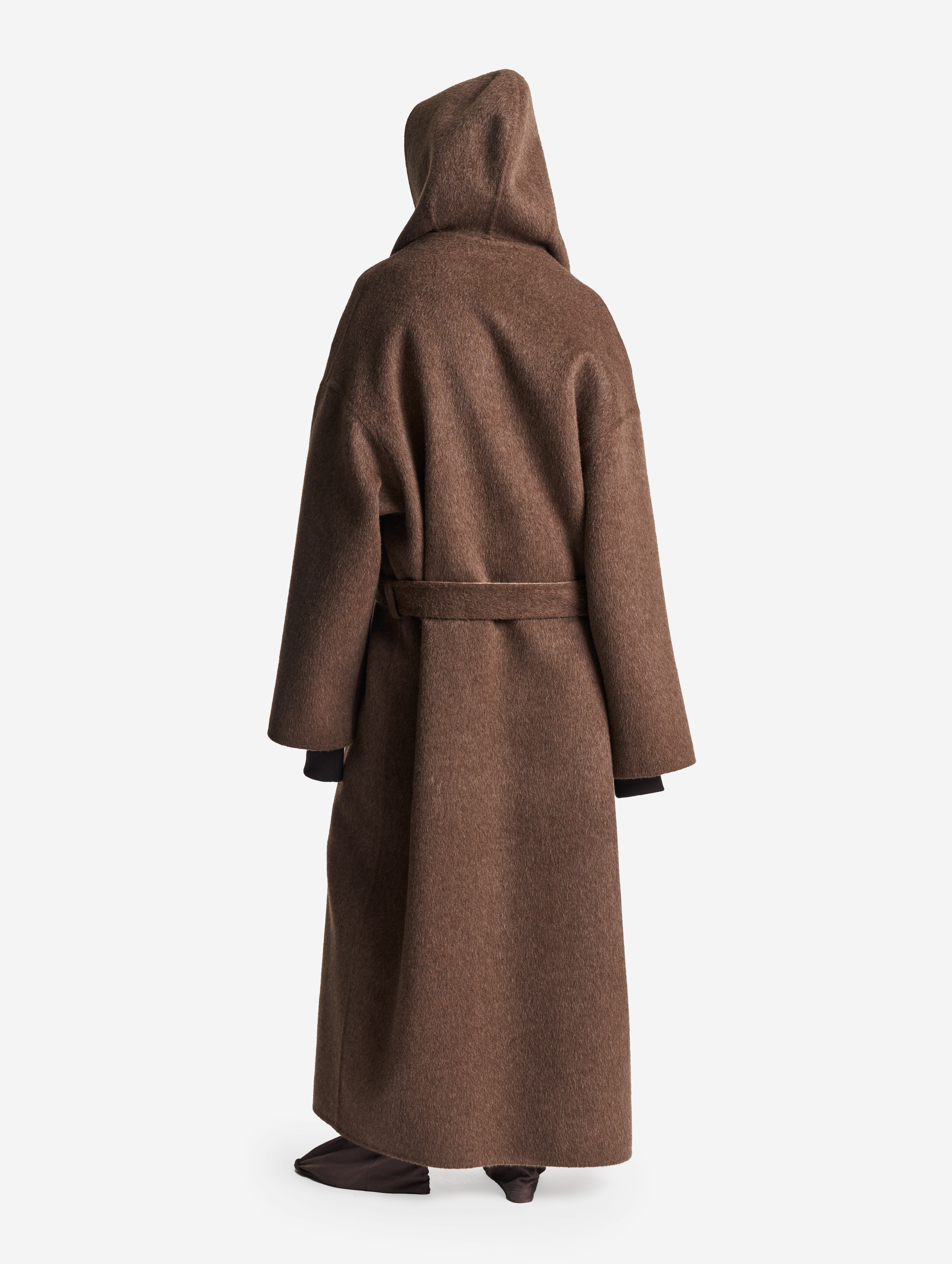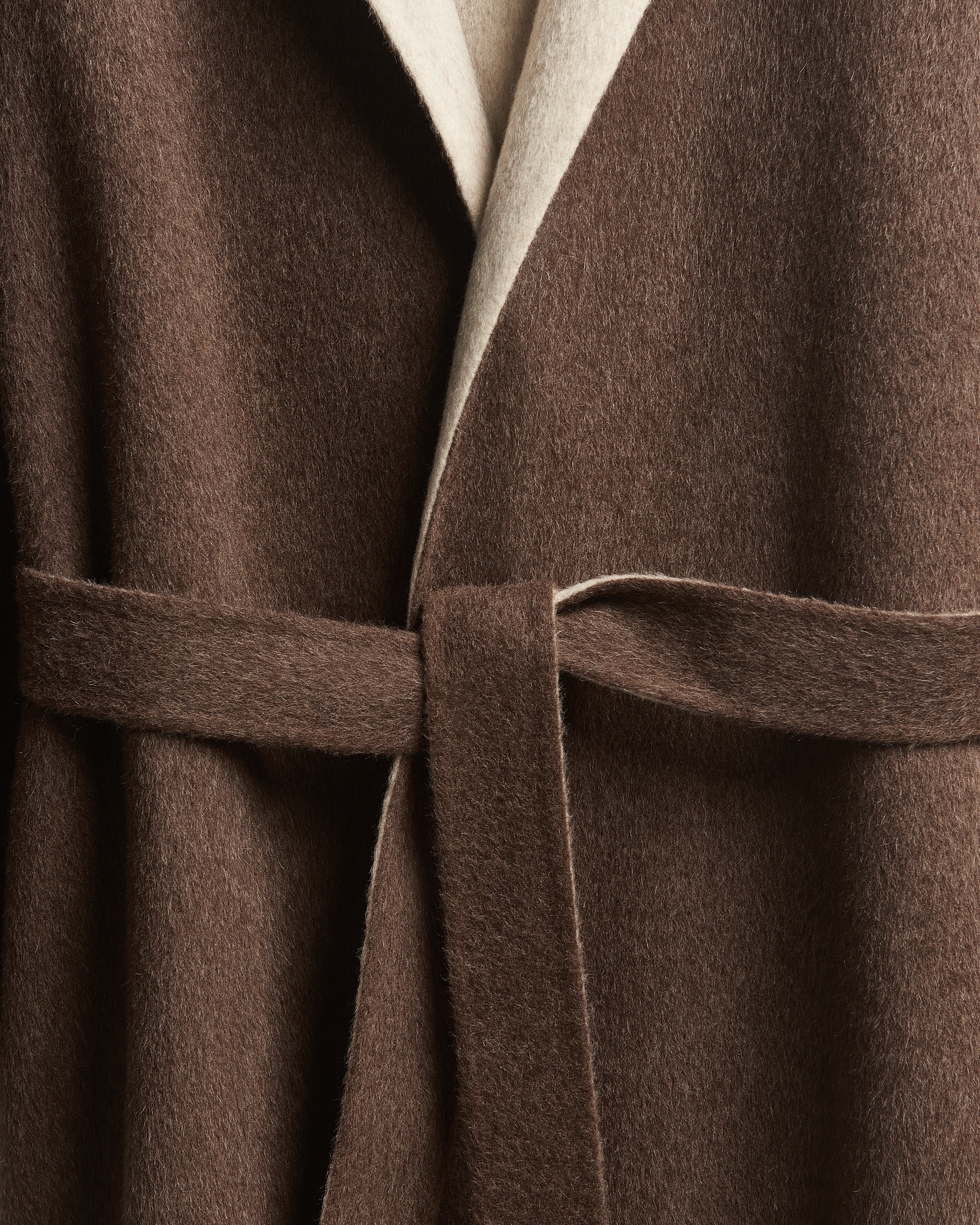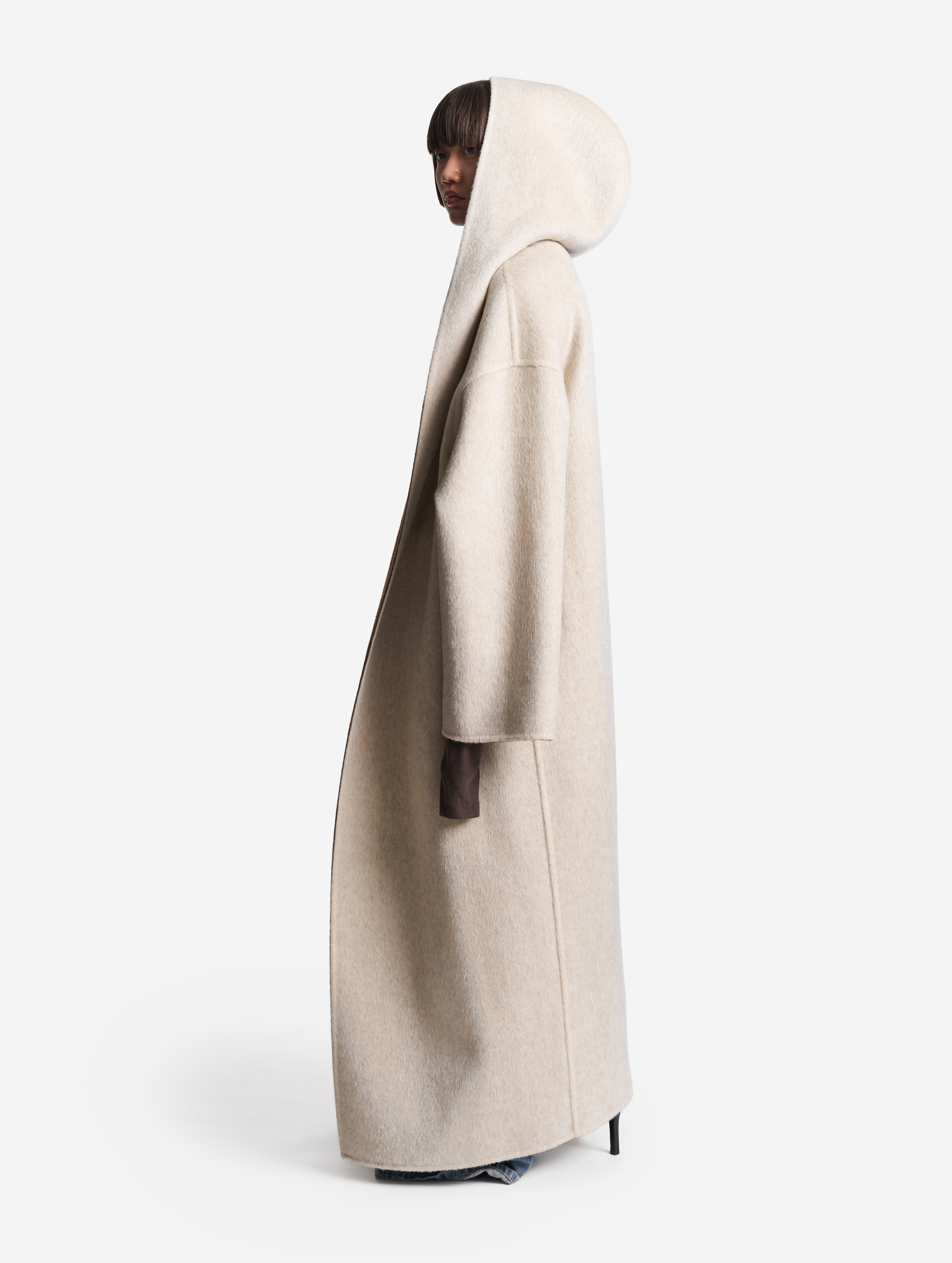 Пальто-халат создано по той же технологии, что и пальто с шалевым воротником — все швы запакованы и незаметны глазу. У этого изделия объемный капюшон и широкий, как у кимоно, рукав. Минимализм форм воплощен не только в силуэте — у пальто нет карманов и застежек. В комплекте есть длинный пояс. Рекомендуемый диапазон температур для носки: с теплым свитером — от +5°C до −5°C.