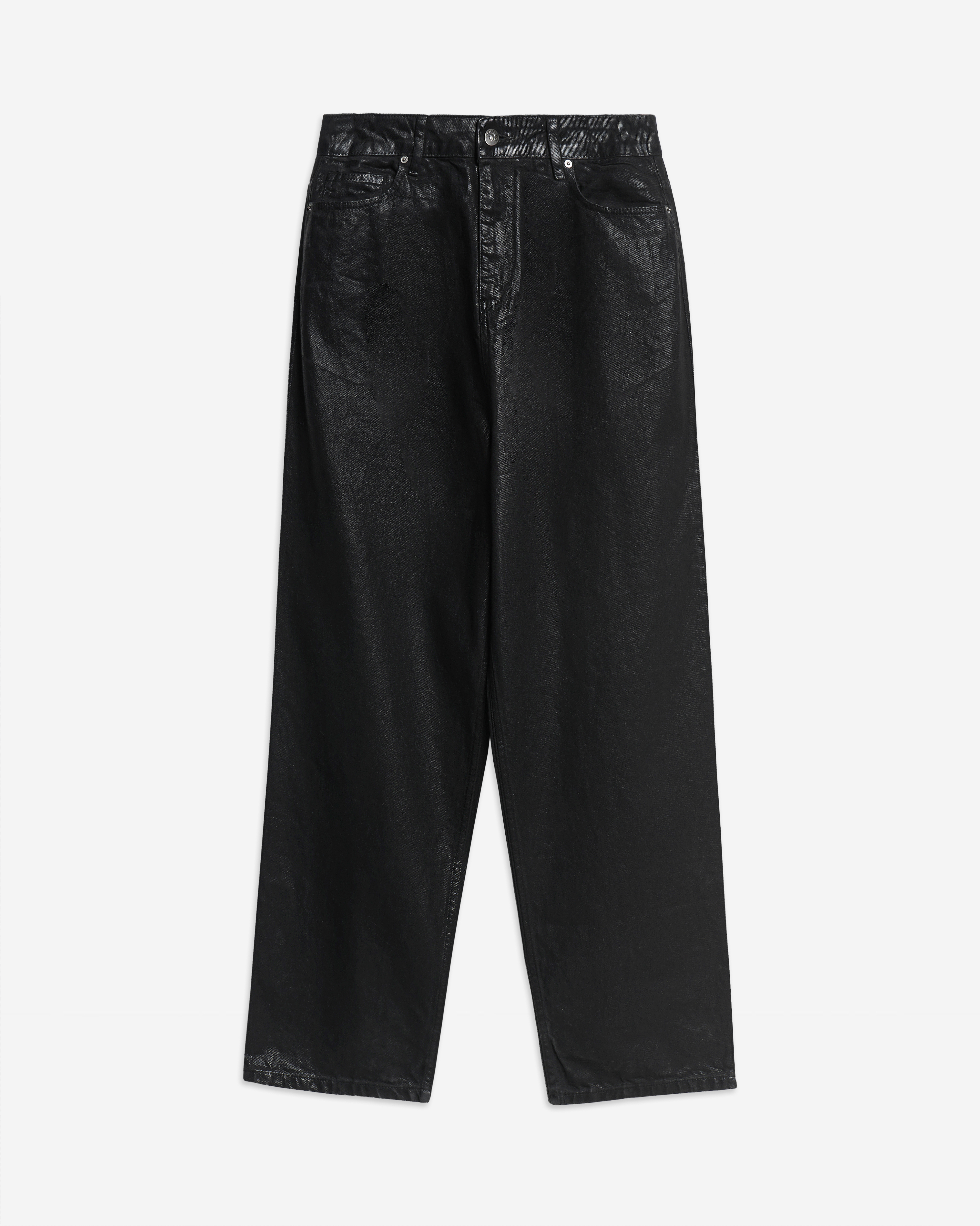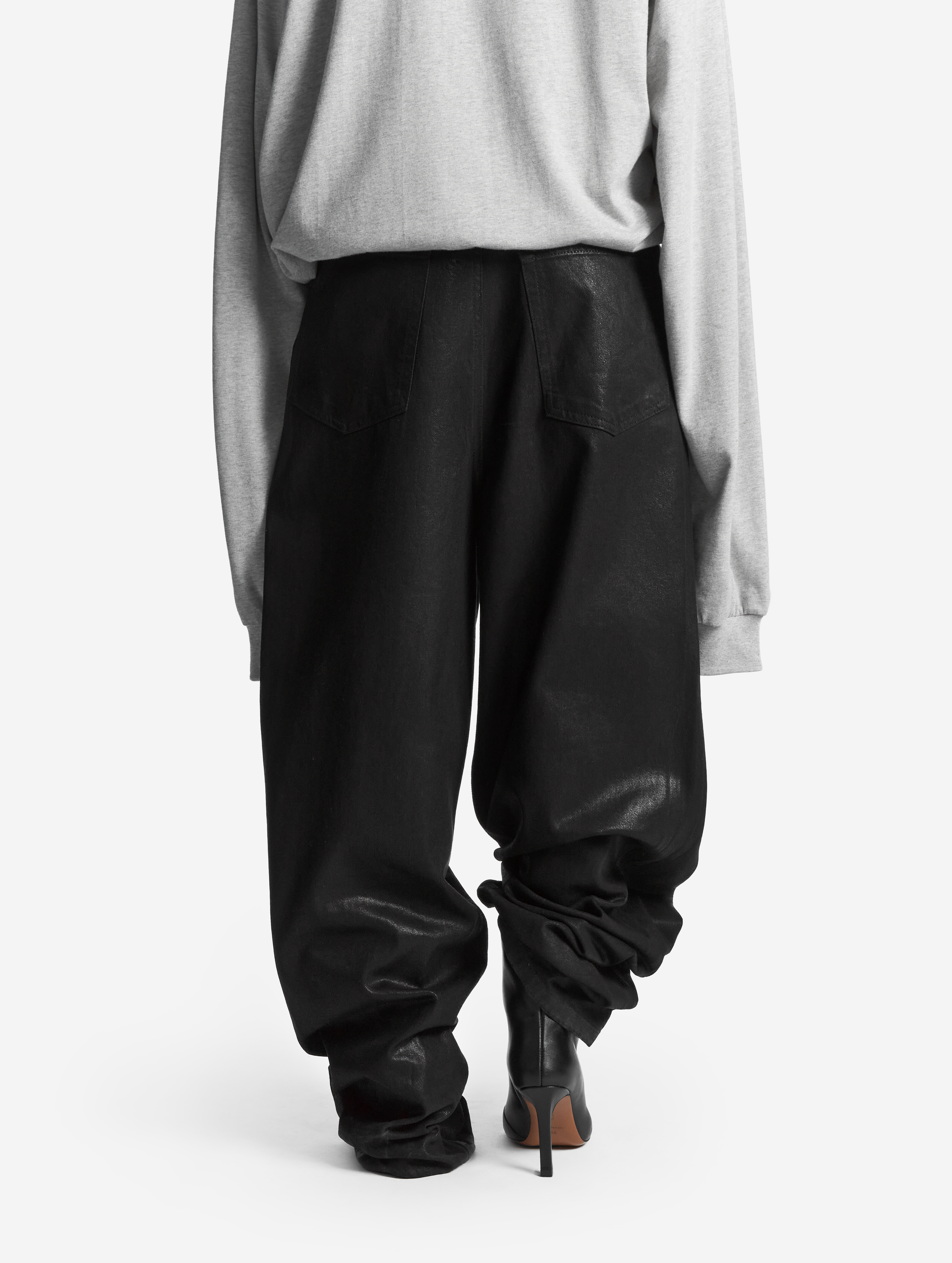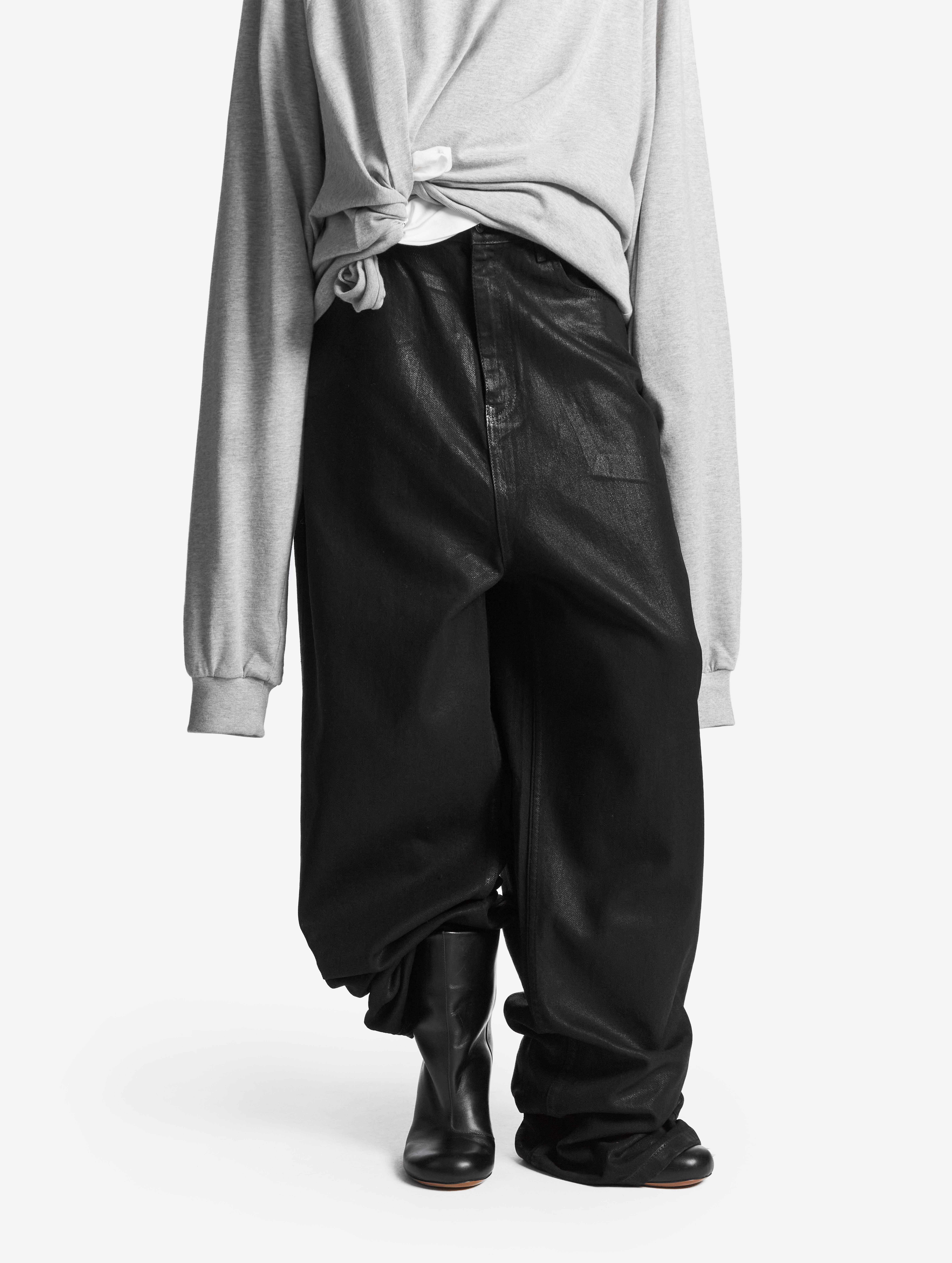 Широкие джинсы с равномерным клешем, идущим от бедра и сужающимся книзу. Изделие выполнено из плотного денима, покрытого воском, — благодаря ему джинсы получают характерный блеск, а ткань становится водонепроницаемой. Есть два кармана и один маленький для зажигалки спереди, а также два кармана сзади. Изделие маркируется только буквенной размерной сеткой и позиционируется нами как унисекс. Посадка варьируется в зависимости от выбранного размера. Модель застегивается на молнию и металлическую джинсовую пуговицу. Есть шлевки для ремня.