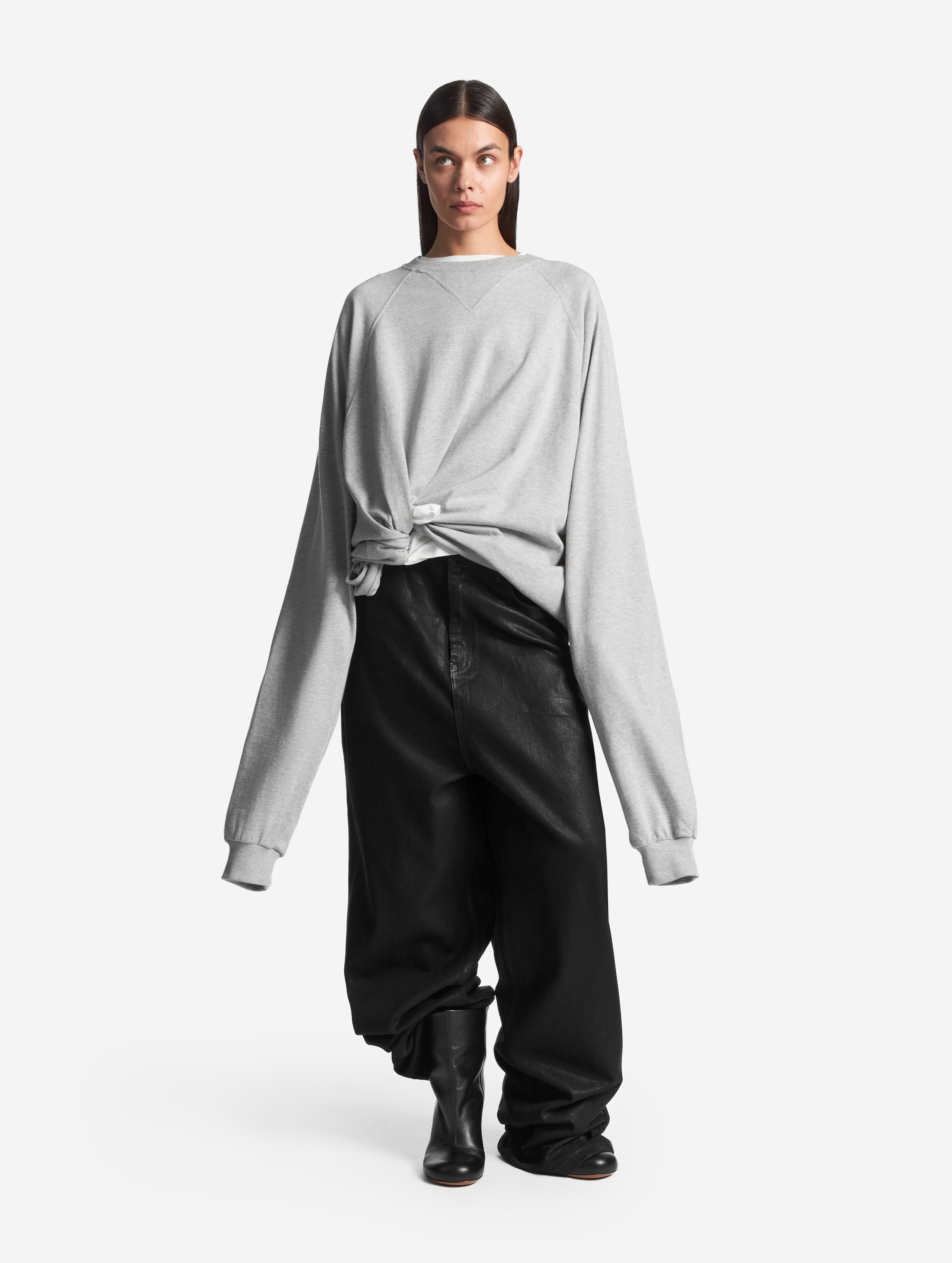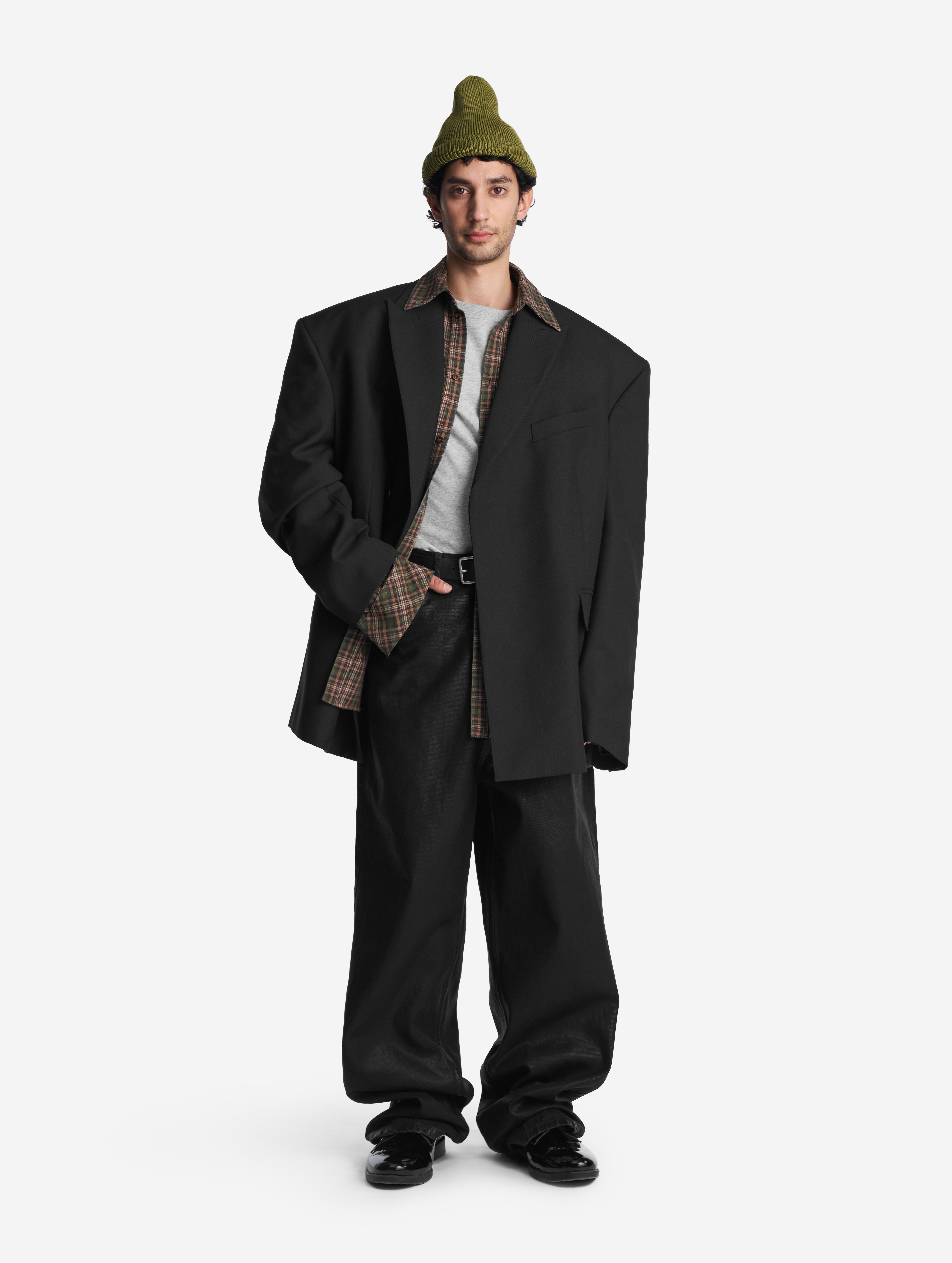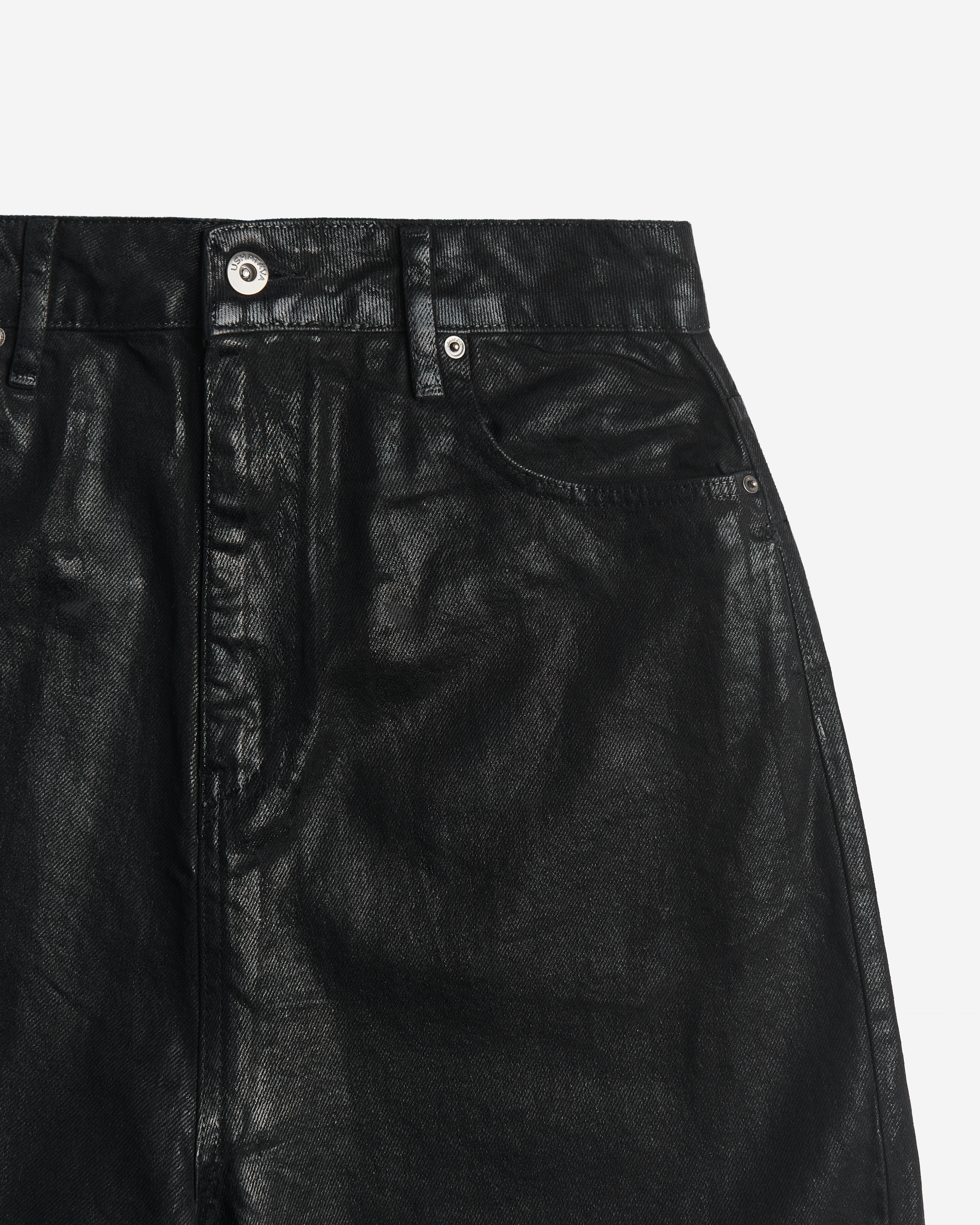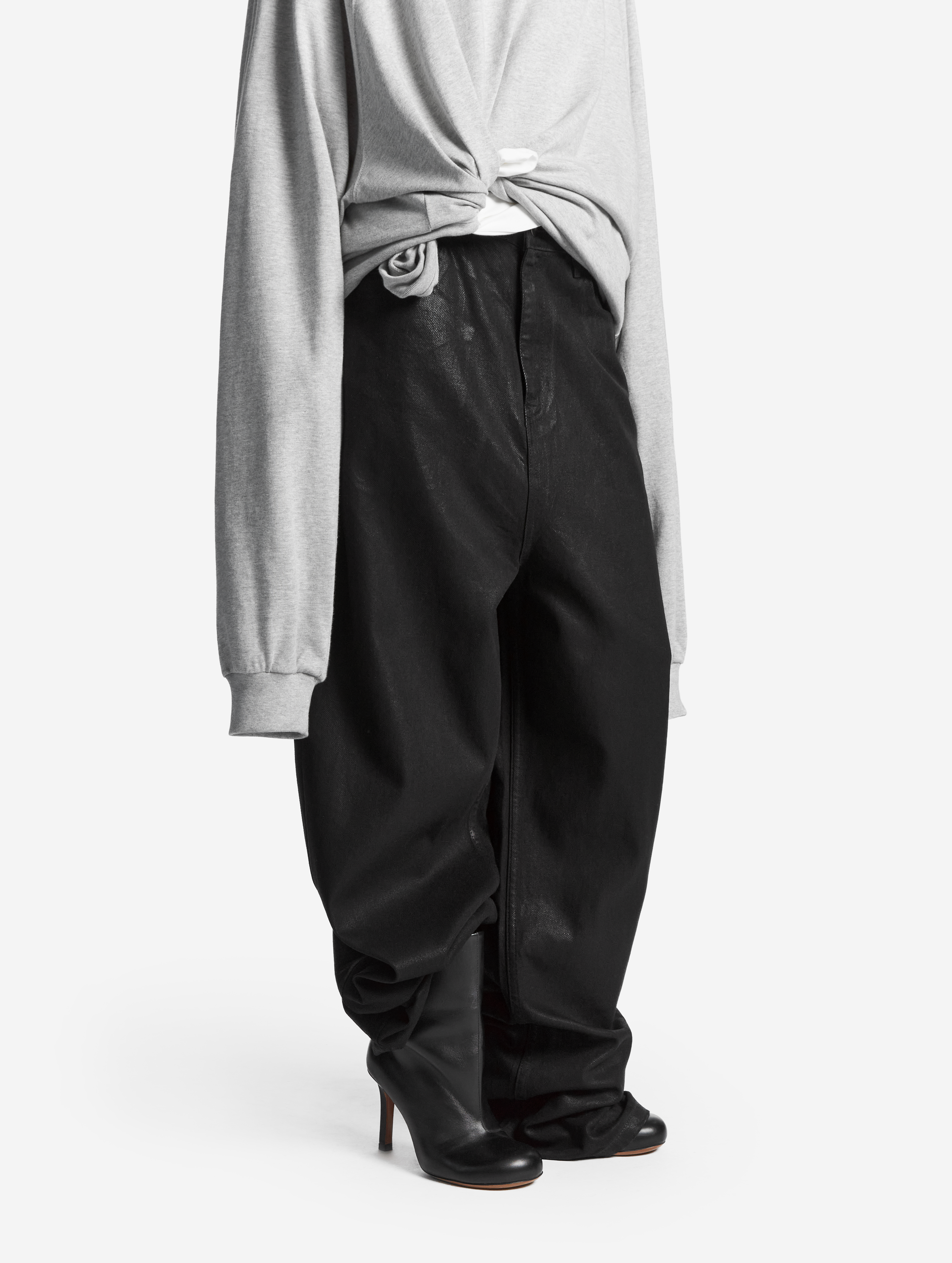 Широкие джинсы с равномерным клешем, идущим от бедра и сужающимся книзу. Изделие выполнено из плотного денима, покрытого воском, — благодаря ему джинсы получают характерный блеск, а ткань становится водонепроницаемой. Есть два кармана и один маленький для зажигалки спереди, а также два кармана сзади. Изделие маркируется только буквенной размерной сеткой и позиционируется нами как унисекс. Посадка варьируется в зависимости от выбранного размера. Модель застегивается на молнию и металлическую джинсовую пуговицу. Есть шлевки для ремня.