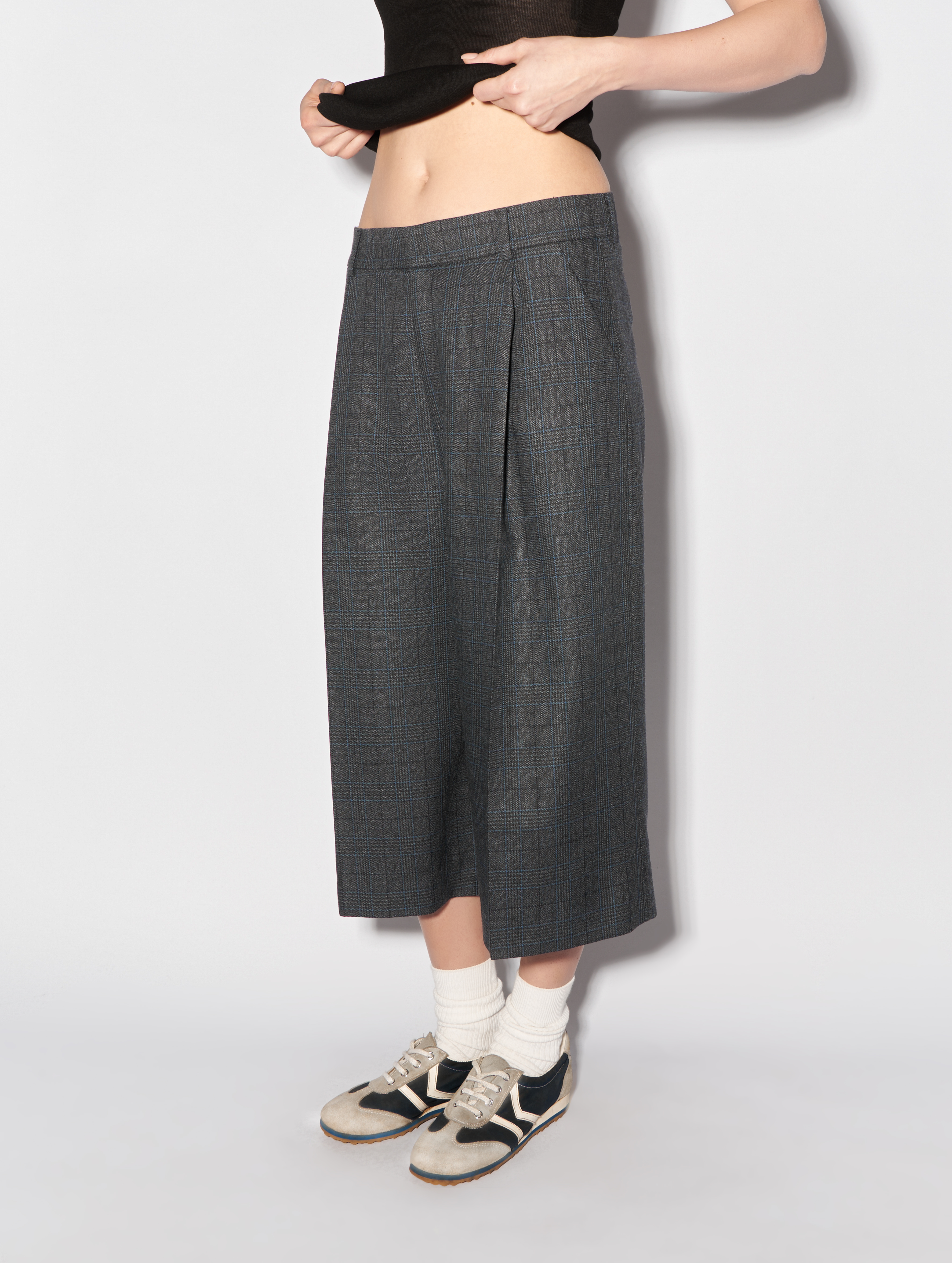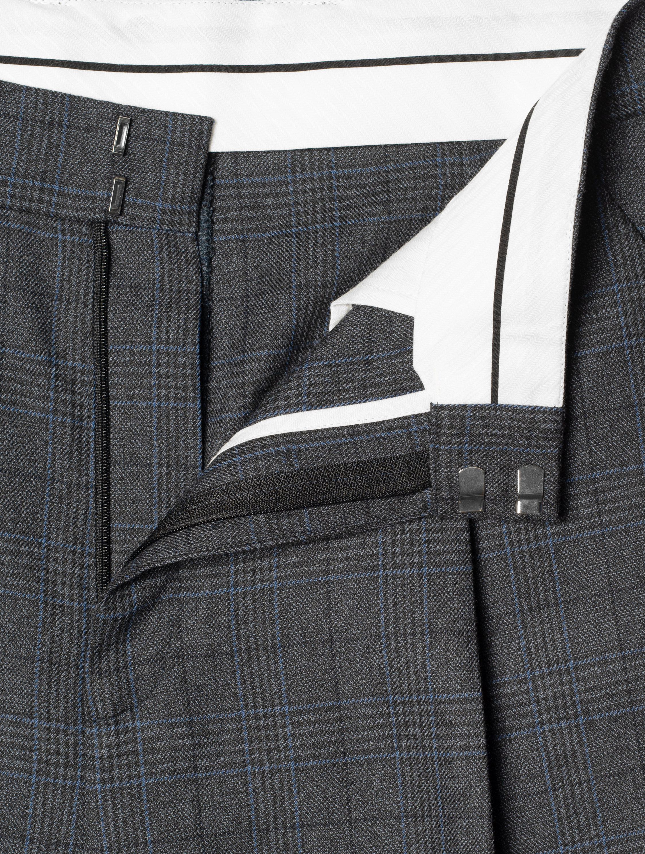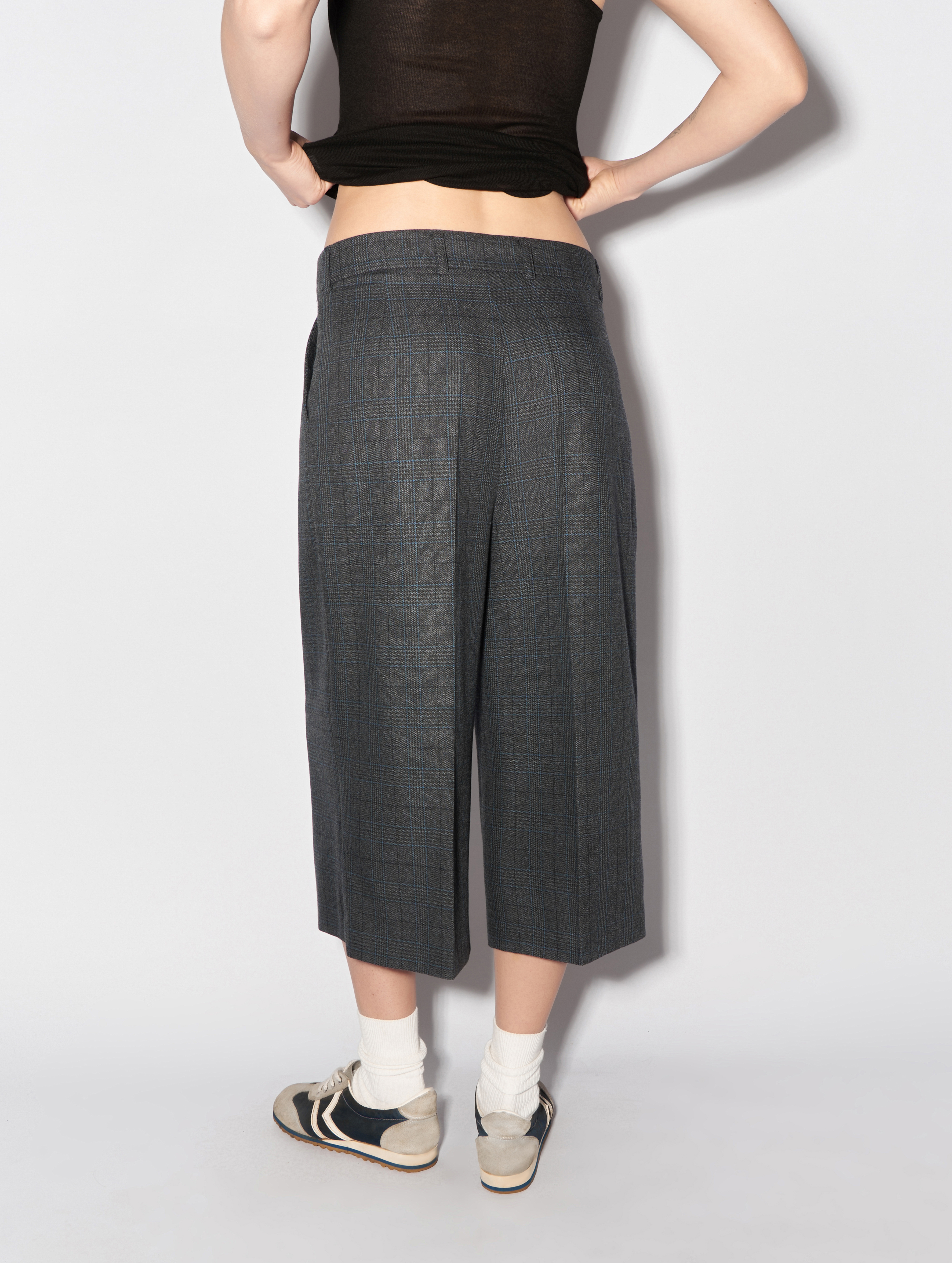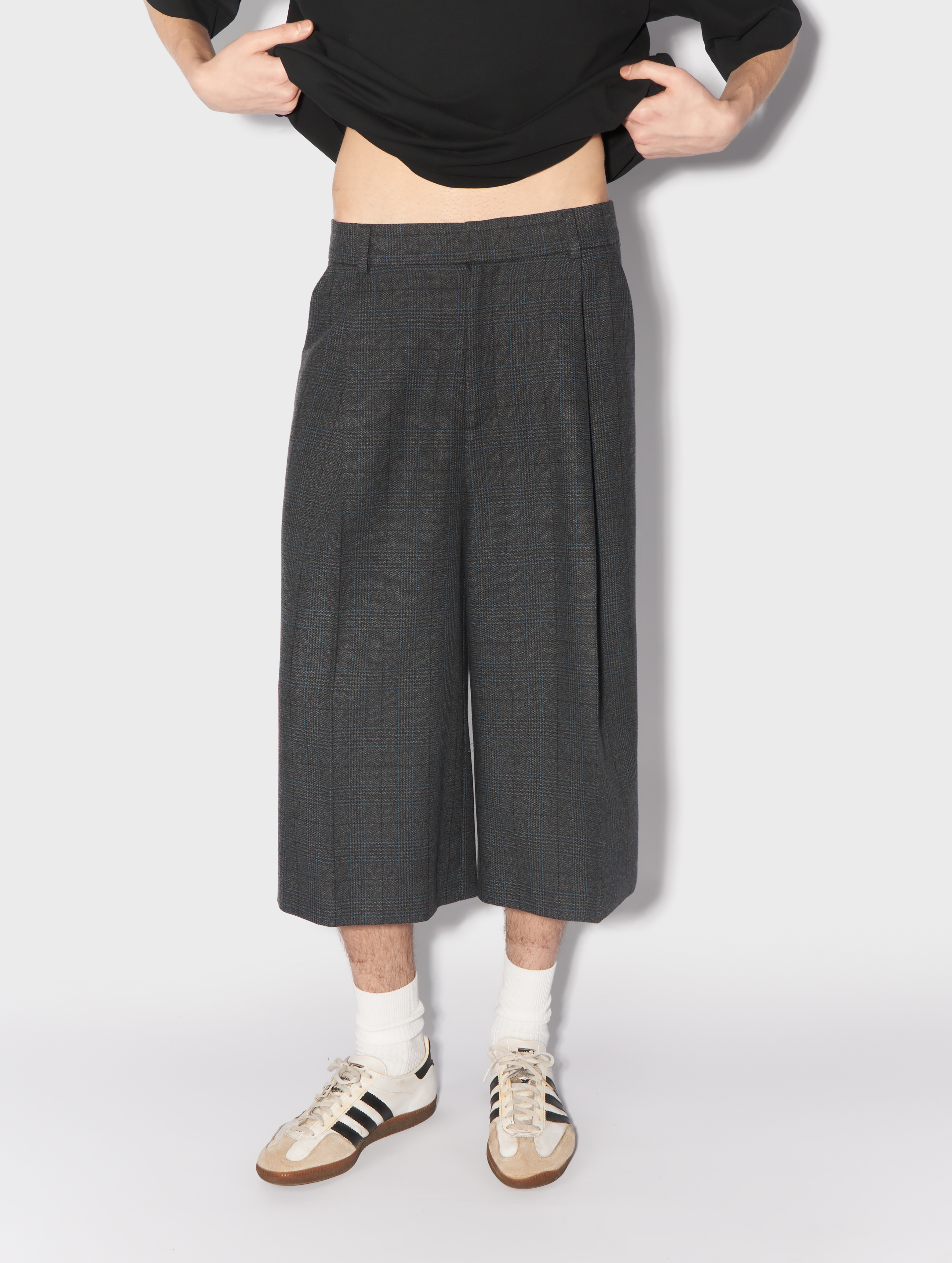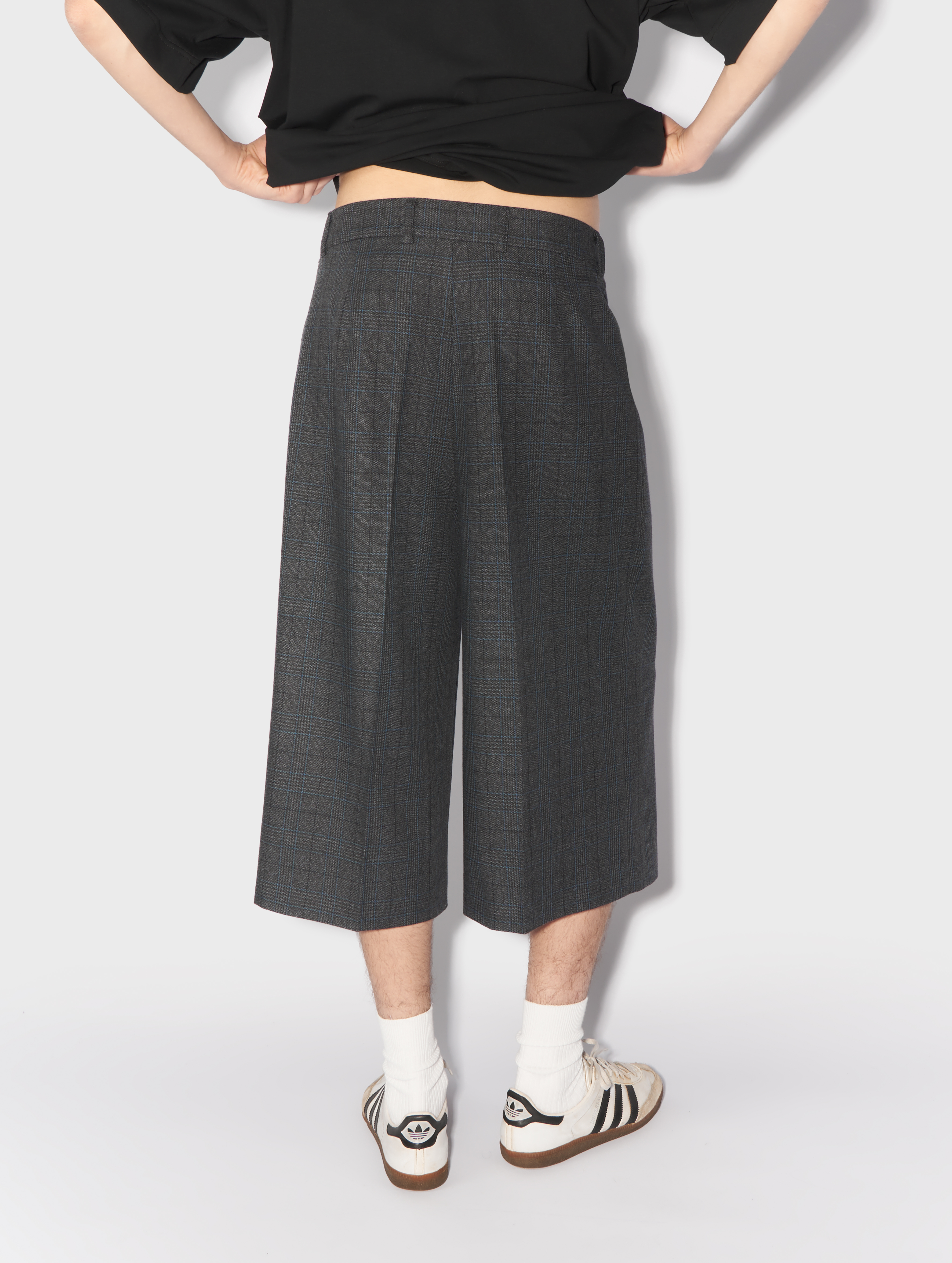 Агендерные классические бермуды свободного кроя. На передних половинах брюк имеются защипы, благодаря которым формируется силуэт. Сзади и спереди заутюжены классические стрелки, есть боковые карманы. Пояс на корсажной ленте, обеспечивающей безупречную посадку и формоустойчивость. Также имеются шлевки для ремня. Бермуды застегиваются на молнию, брючные крючки и пуговицу.