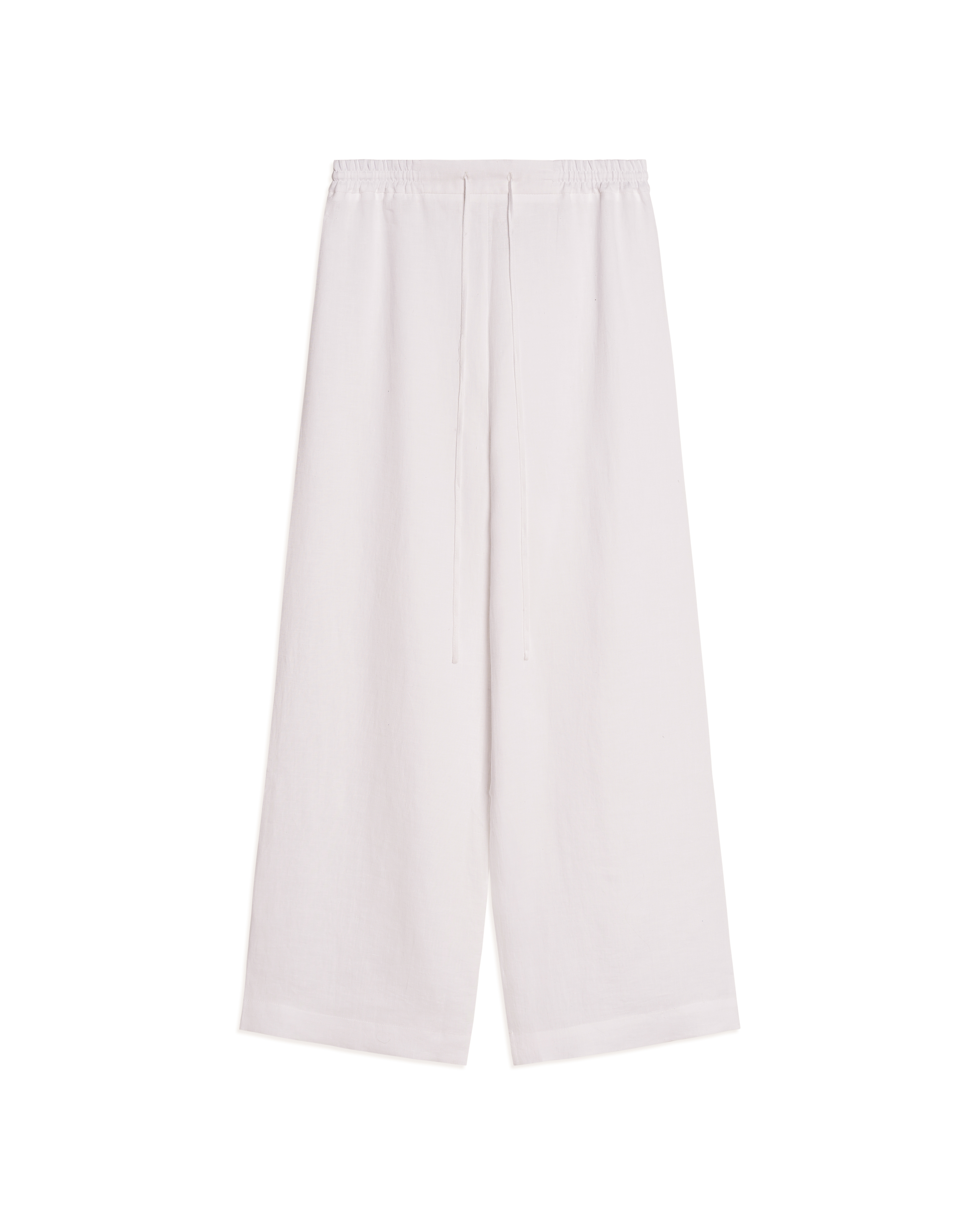 Прямые брюки выполнены из тонкого льна. Мы позиционируем это изделие как агендерное, поэтому его могут носить не только женщины, но и мужчины. Брюки задуманы свободными и летящими. У этой модели только один внутренний шов, поэтому сбоку она выглядит цельной. Верхний срез обработан эластичным поясом — он специально прострочен, чтобы внутренняя резинка не перекручивалась. Также внутрь пояса вставлен шнурок, позволяющий четко фиксировать посадку.