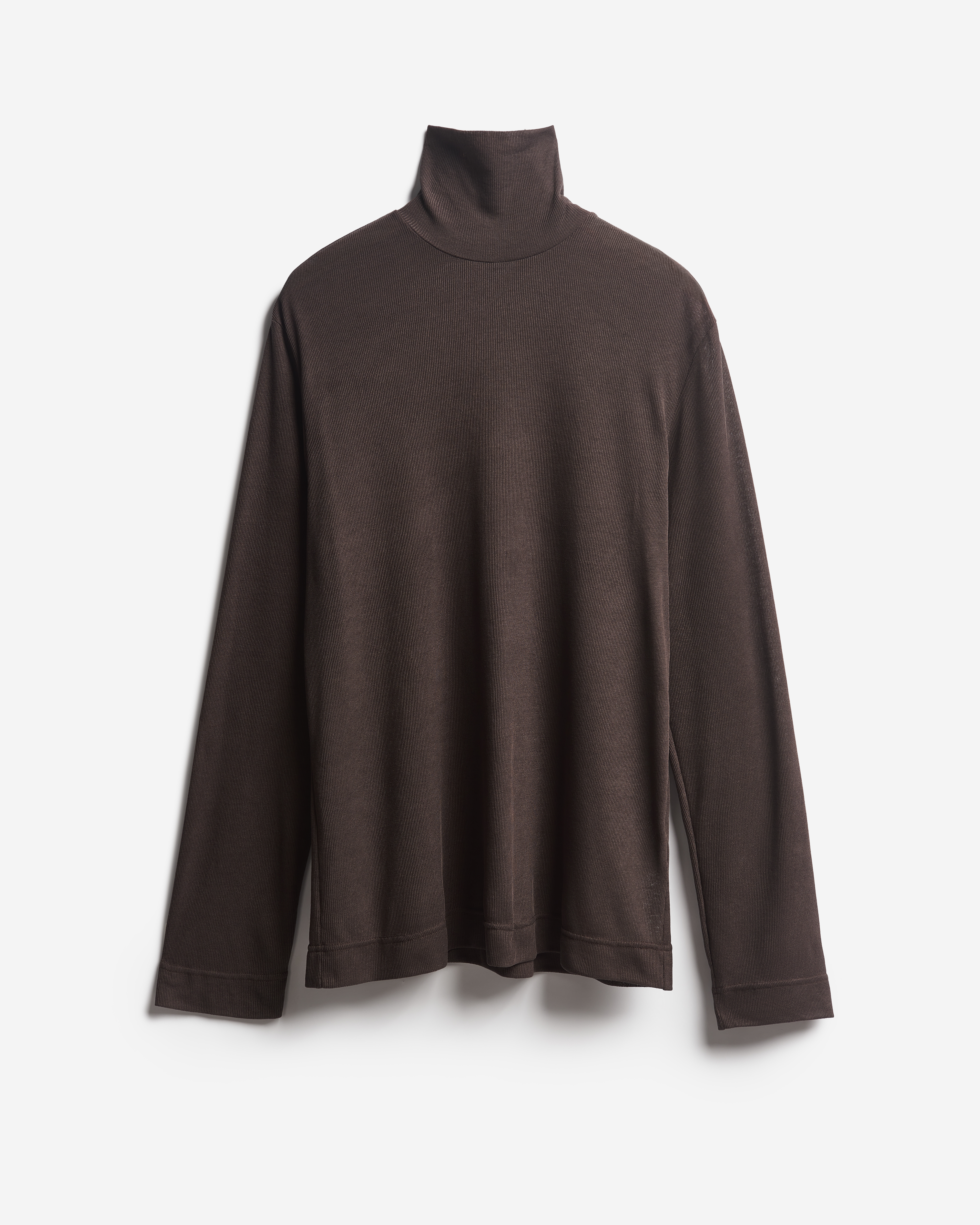 «Мы продолжаем развивать капсулу мягкого трикотажа, добавляя новые модели и цвета. Все изделия полупрозрачные, хорошо смотрятся как второй слой, а в сочетании друг с другом создают нежную фактуру», — говорит креативный директор Ushatava Нино Шаматава. У изделия вытянутый свободный силуэт и универсальная посадка — такую водолазку могут носить и мужчины.