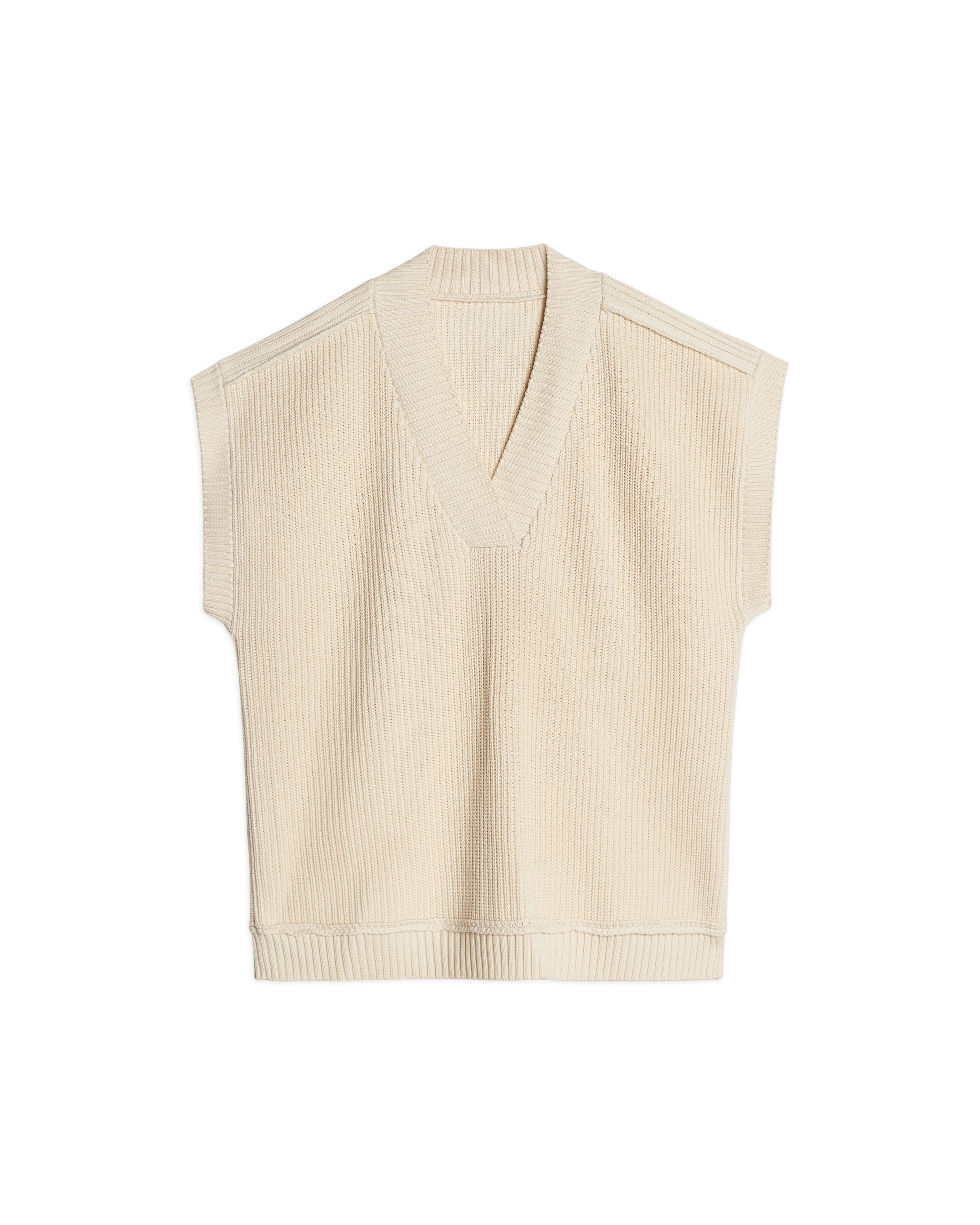 У жилета удлиненный силуэт и оверсайз-посадка. Ключевой дизайн-элемент здесь — швы, выведенные наружу. Это один из классических приемов деконструкции в Ushatava. Широкая пройма позволяет надевать под жилет несколько слоев одежды. Нижний край изделия обработан резинкой-манжетой. Благодаря наличию в составе акрила предмет не деформируется после продолжительной носки и многократных стирок.