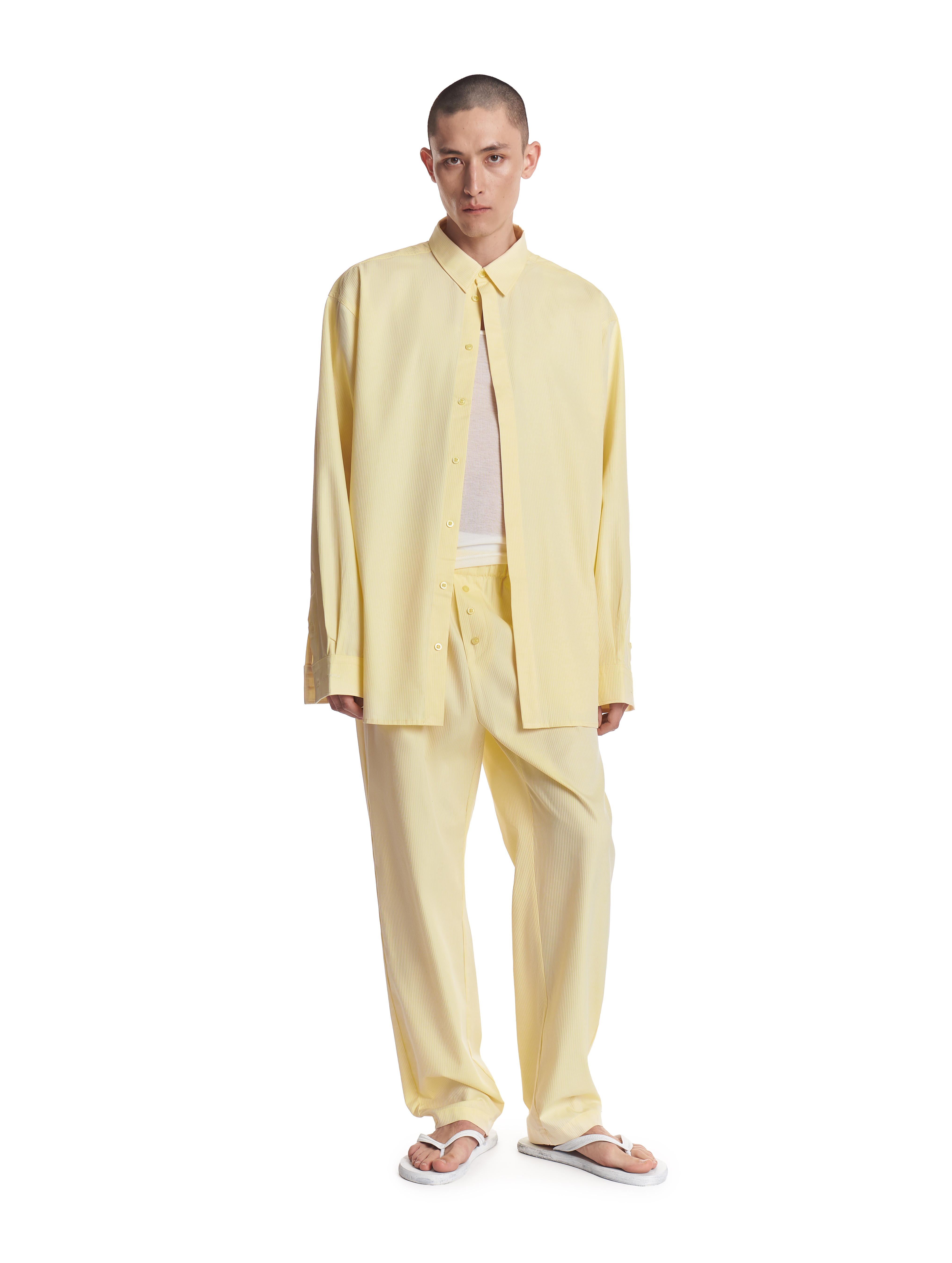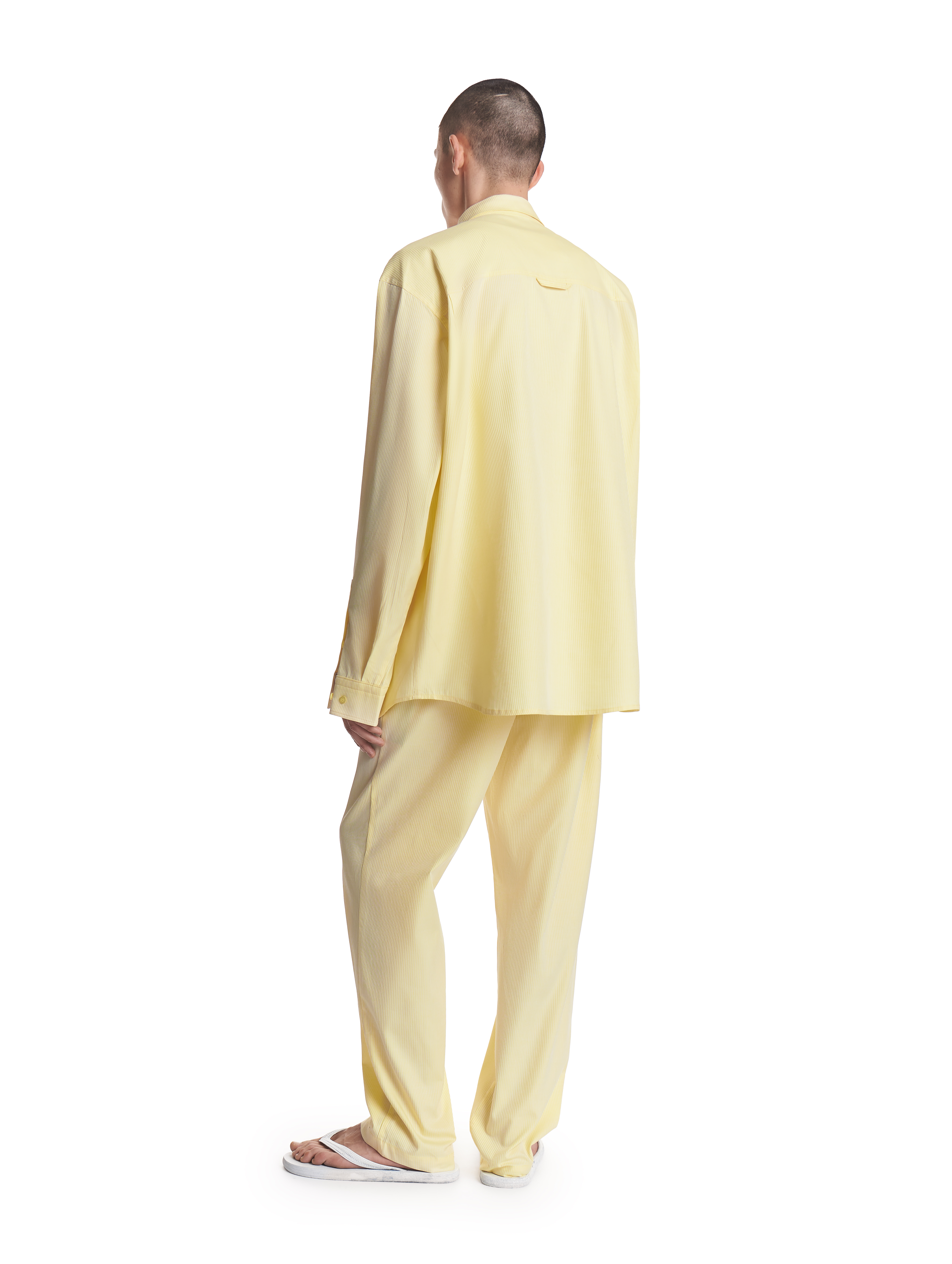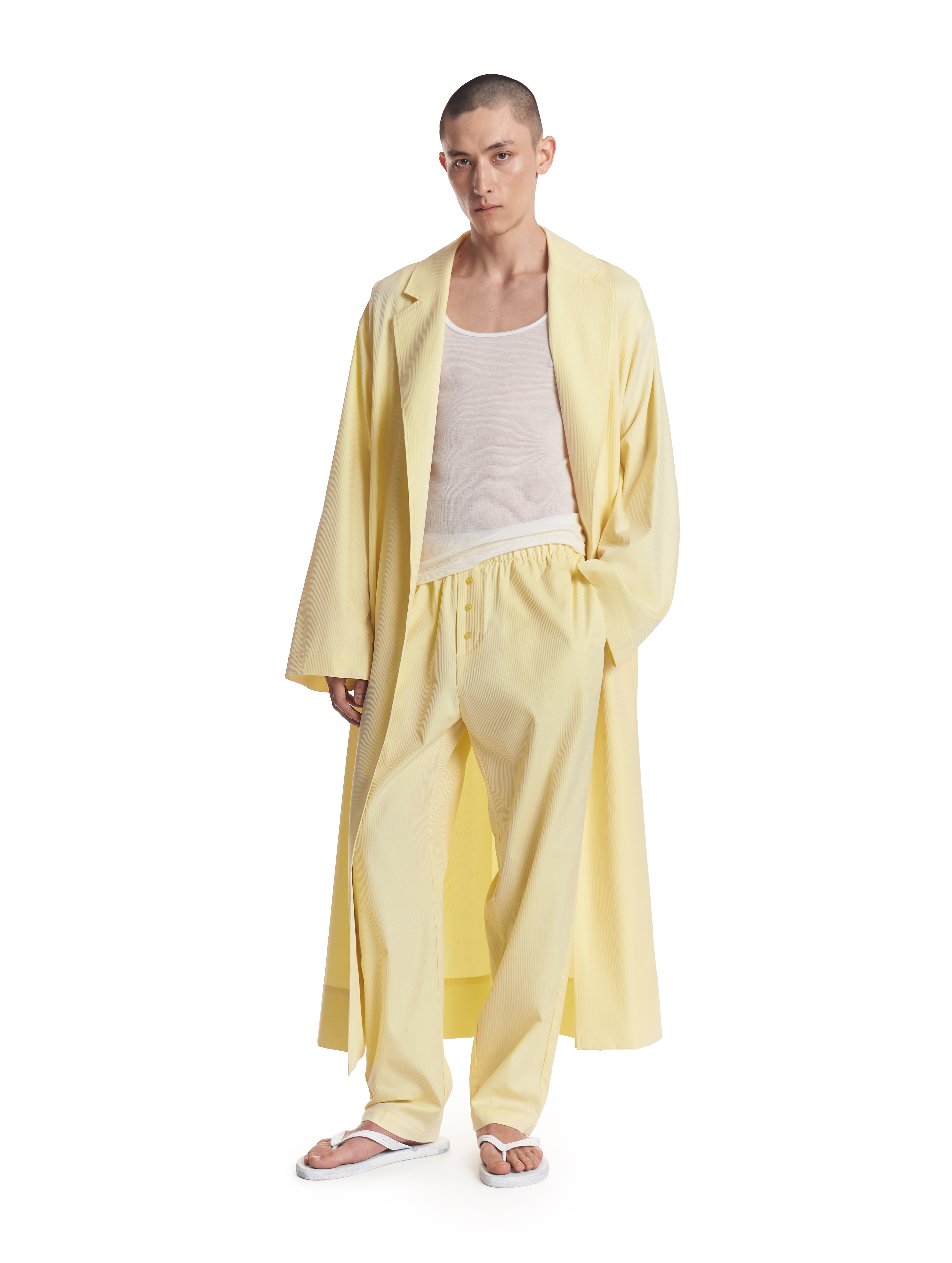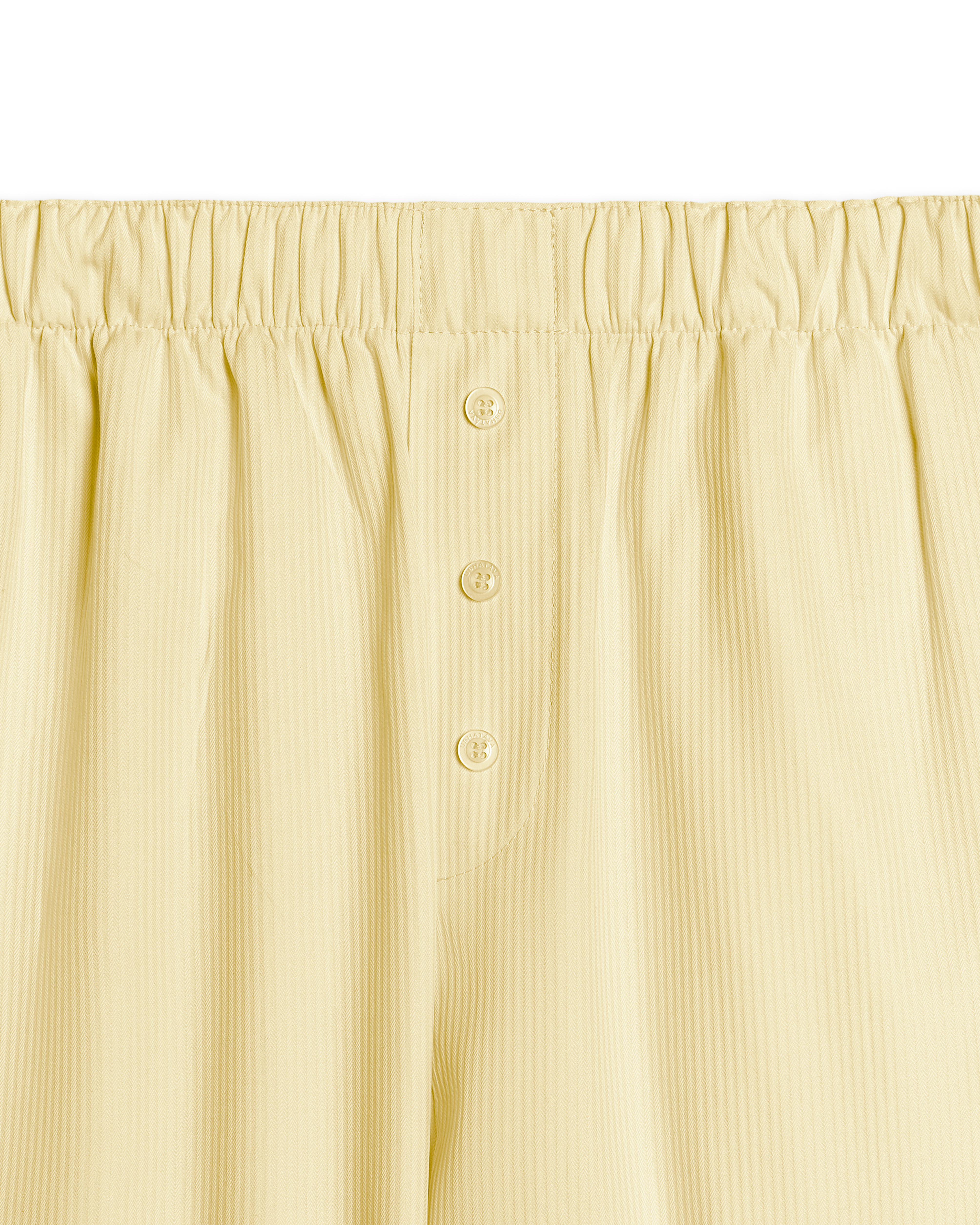 Брюки прямого силуэта на мягкой резинке. Мы позиционируем эту модель как агендерную — ее могут носить не только женщины, но и мужчины. Изделие выполнено из плотного формоустойчивого хлопка. Имитация гульфика с декоративными пуговицами отсылает к классическим мужским пижамным брюкам. В боковых швах есть два кармана.