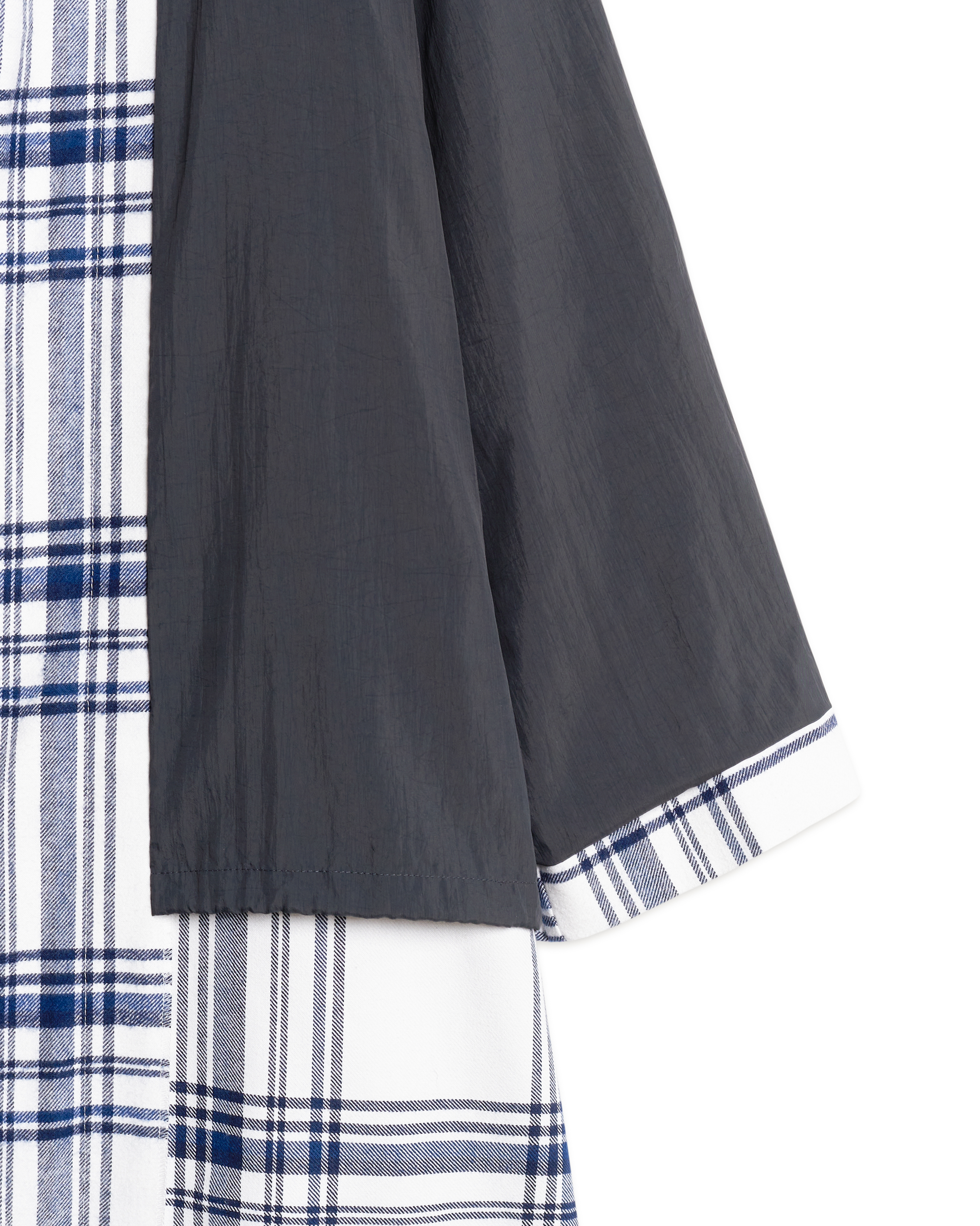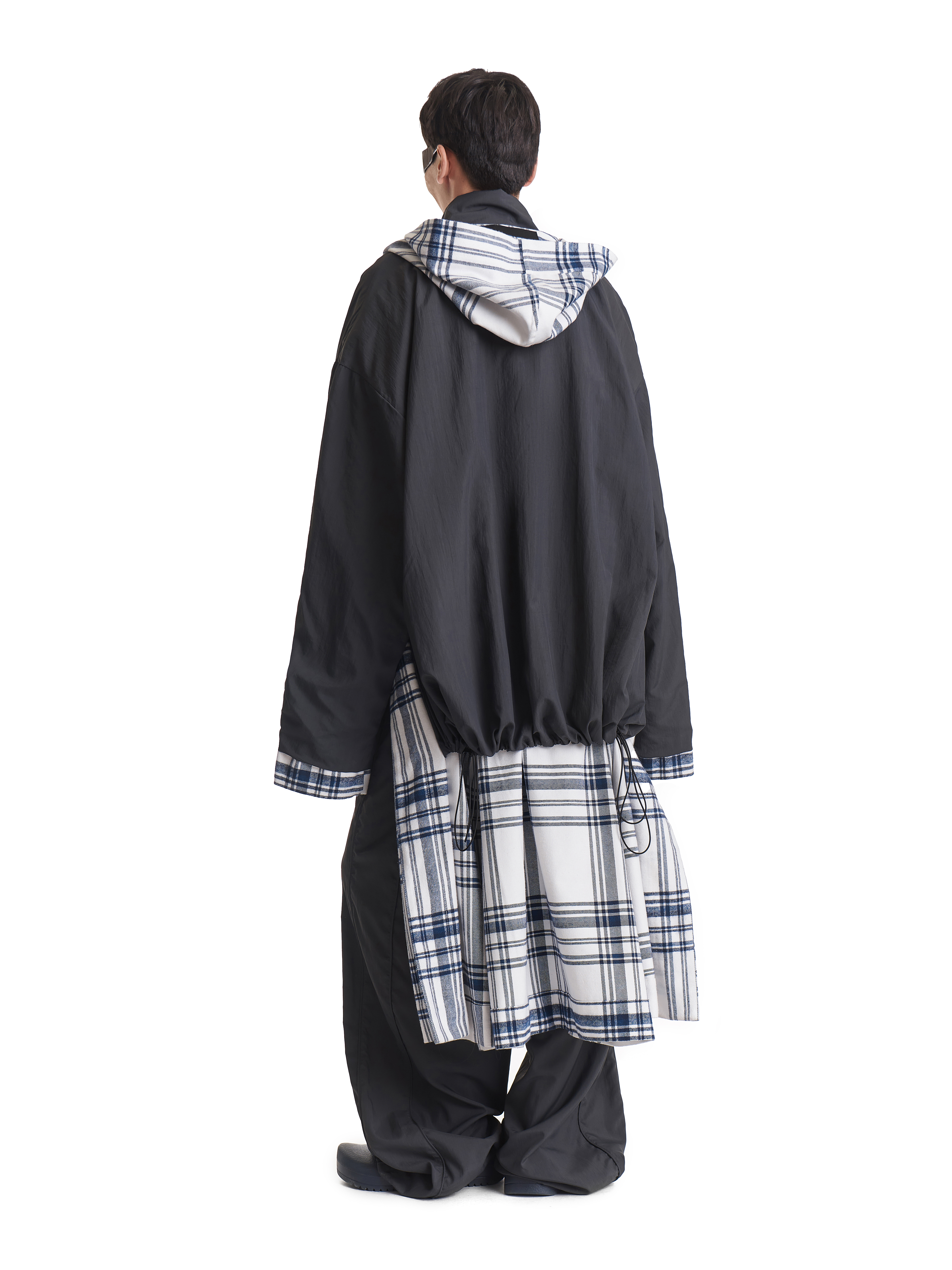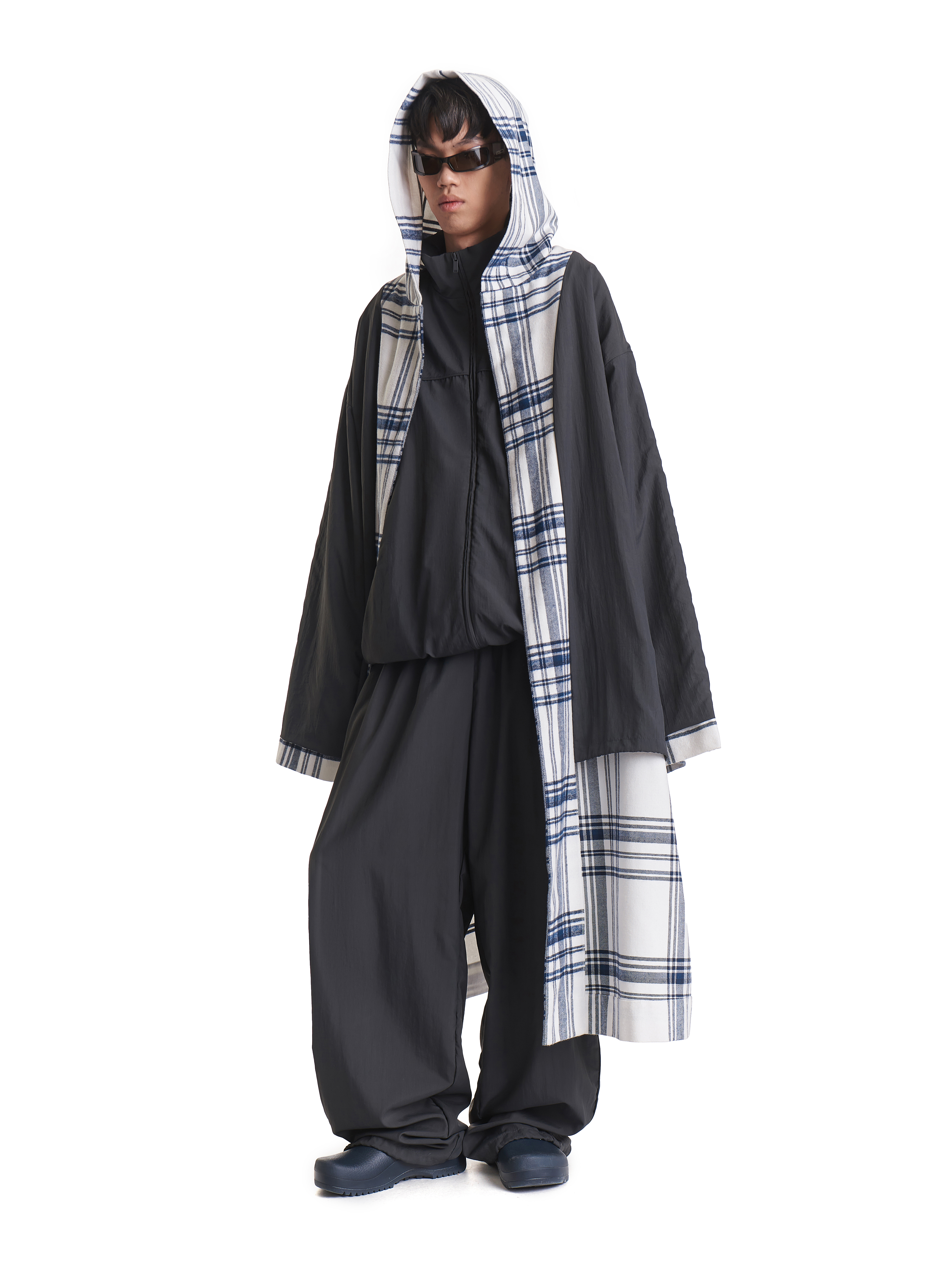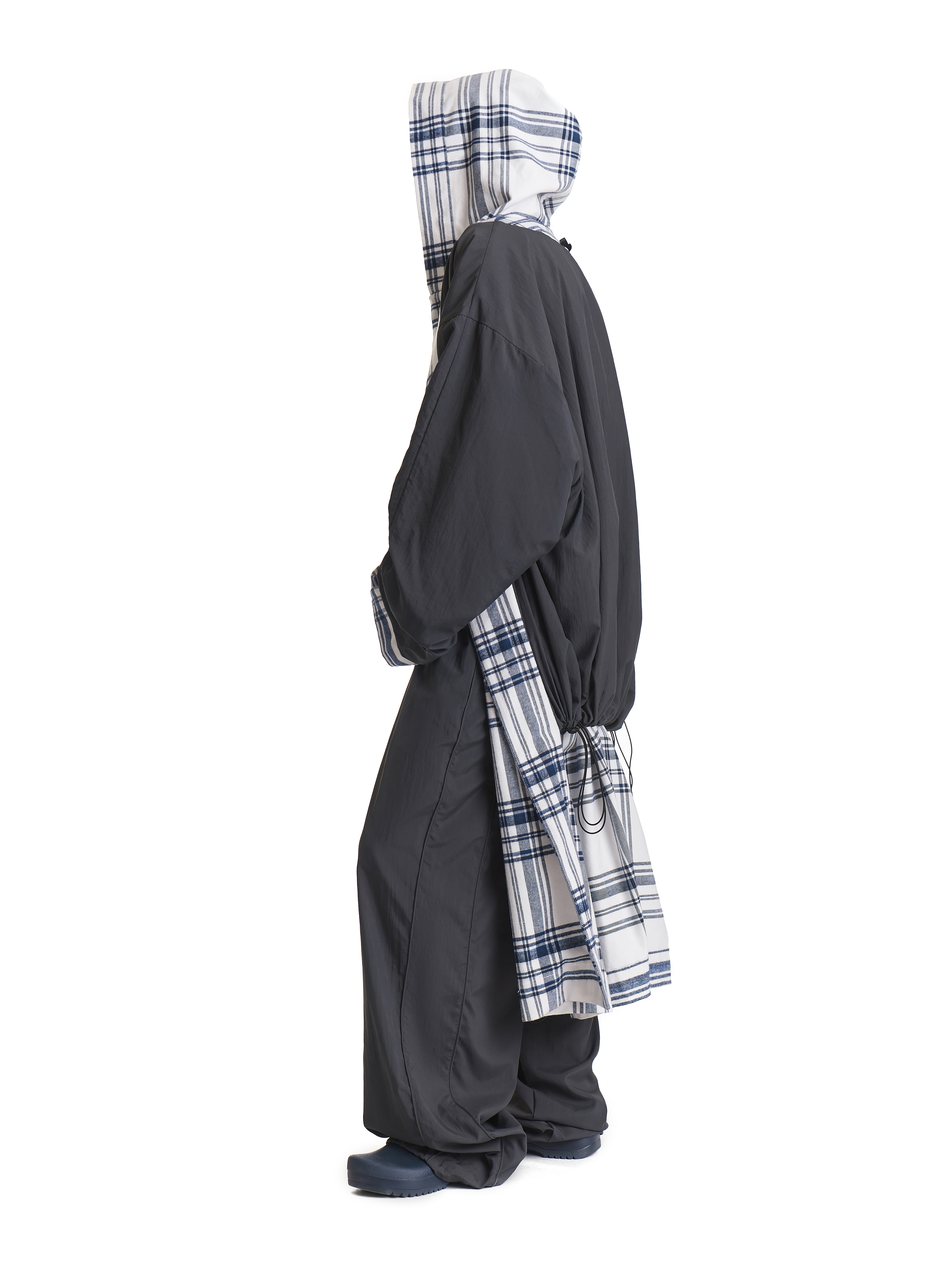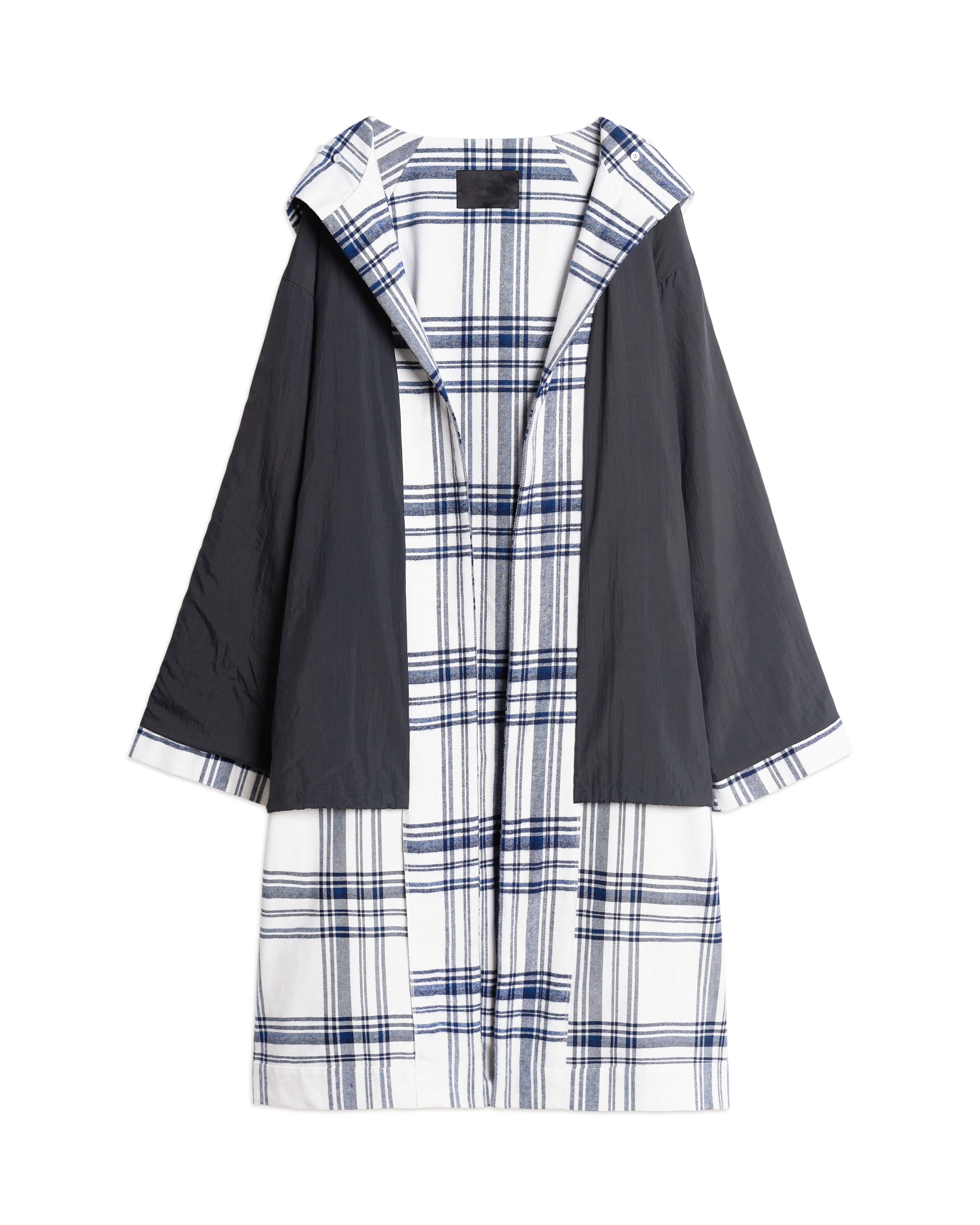 Пальто-халат входит в число иконических моделей модного Дома. Его можно носить на две стороны: лицевая выполнена из плотной фланели, изнаночная — из тонкой плащевой ткани. Низ подкладки обработан кулисой. У этого изделия объемный капюшон и широкий удлиненный рукав. С помощью штормовика можно зафиксировать воротник в закрытом положении для защиты от непогоды. Есть два боковых кармана. В комплекте идет длинный пояс, который можно протянуть сквозь шлевки. Рекомендуется носить при температуре от +10°C.