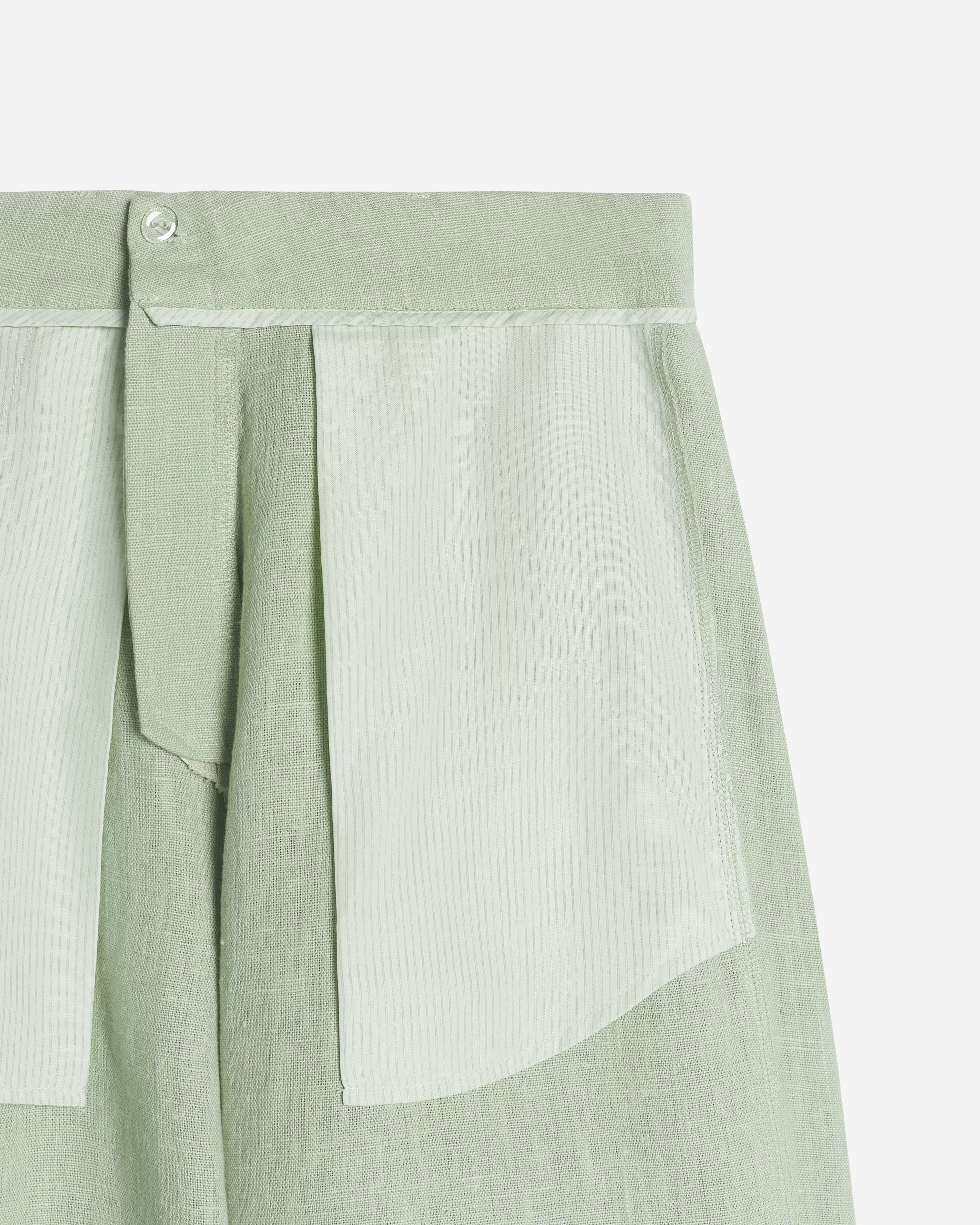 Прямые двухсторонние шорты. Имеются классические брючные карманы, сзади — клапан, имитирующий карман. У модели усложненная застежка — на брючную молнию, крючки и пуговицу, — которой удобно пользоваться и в вывернутом наизнанку виде. Шлевки для пояса есть только с лицевой стороны. У изделия низкий шов сидения, что говорит об универсальной агендерной посадке. Шорты имеют удлиненный силуэт, поэтому их комфортно носить не только на отдыхе, но и в городе.