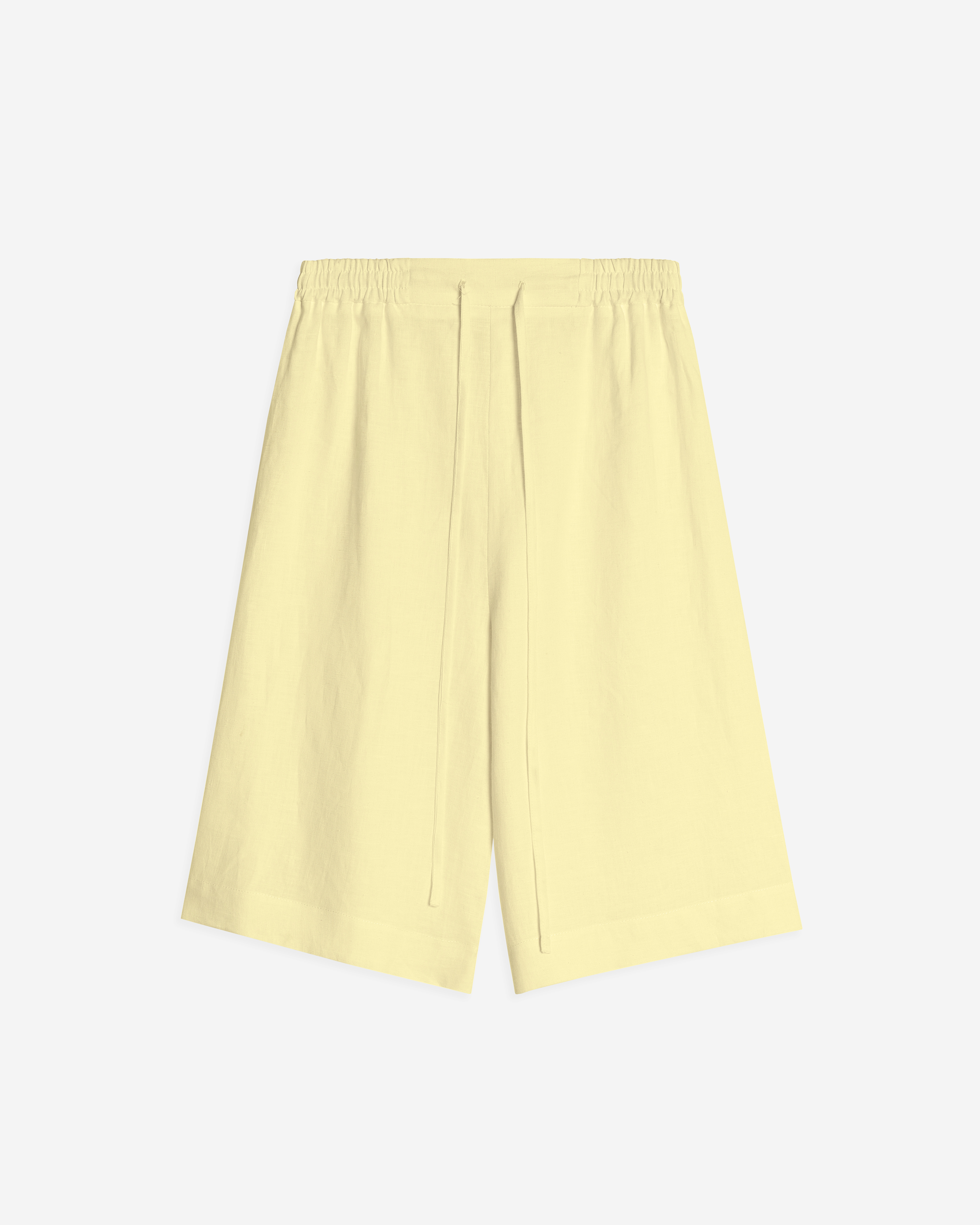 Свободные, имеют низкий шов сидения, позволяющий носить шорты как женщинам, так и мужчинам. За счет комфортной длины они будут одинаково уместны в пляжном и городском образе. Внутри пояса — отстроченная резинка со шнурком, фиксирующим изделие на талии или бедрах. Тонкий лен, из которого сшиты шорты, — гладкий, однородный по фактуре и дышащий материал, в котором особенно комфортно переносить жару.