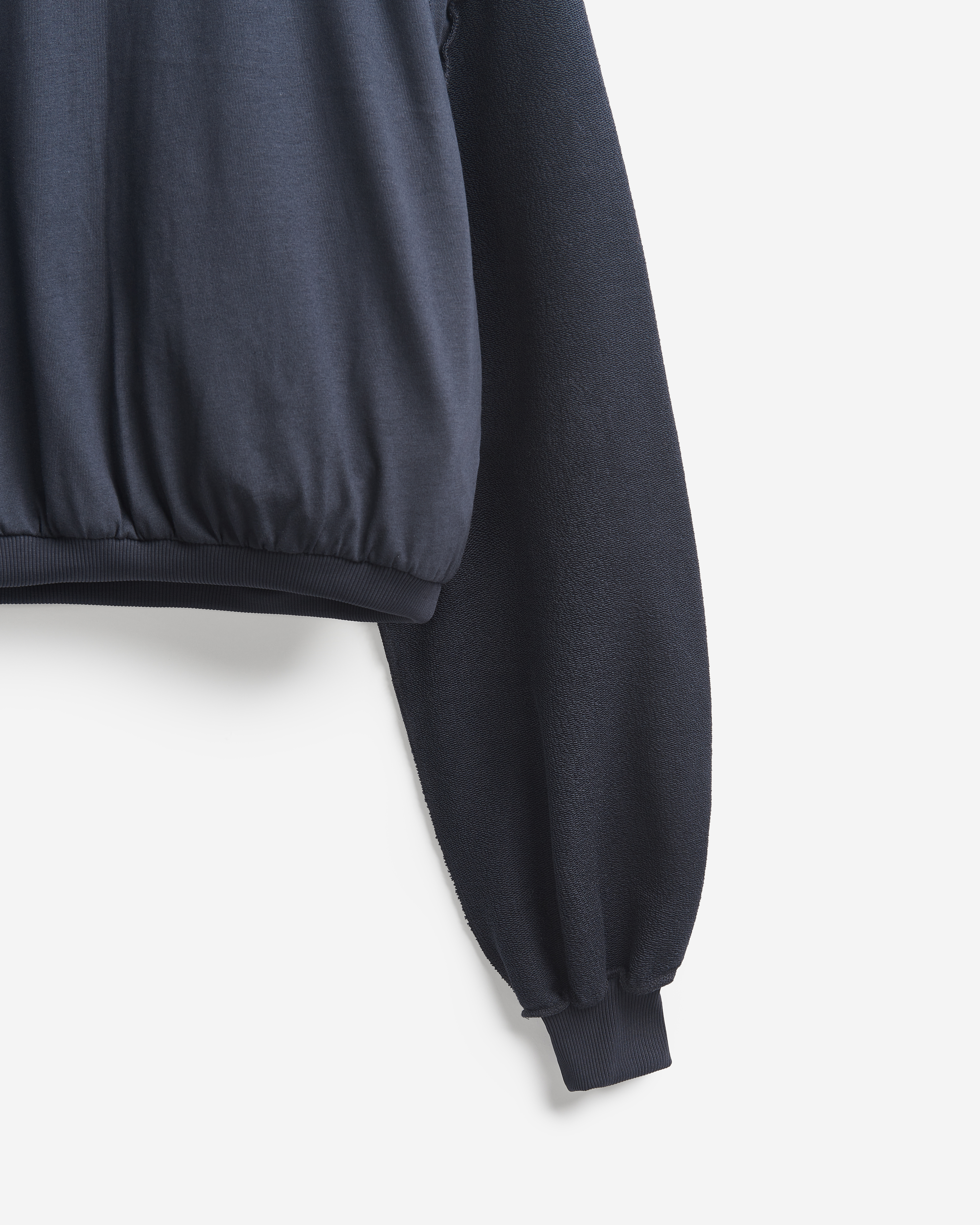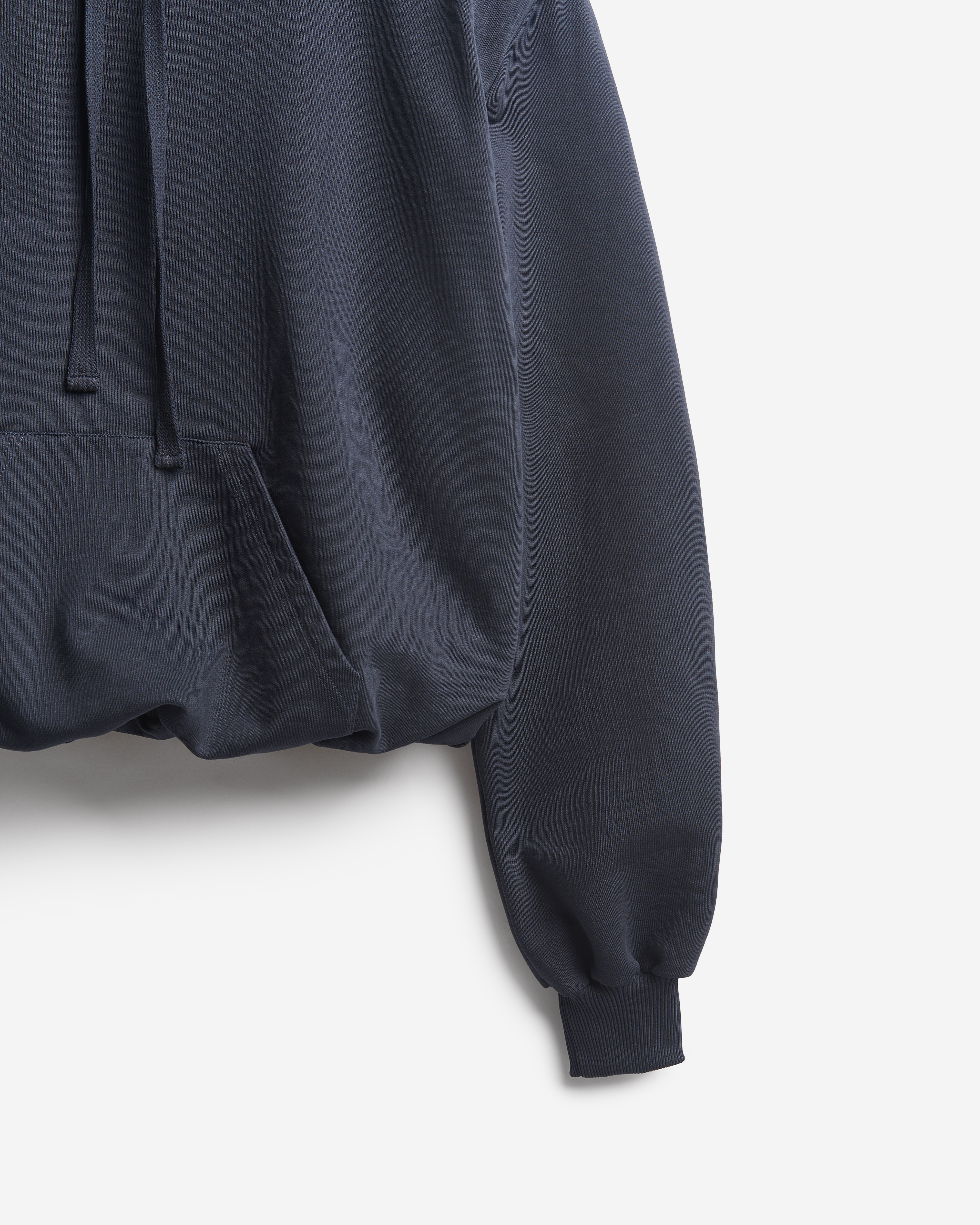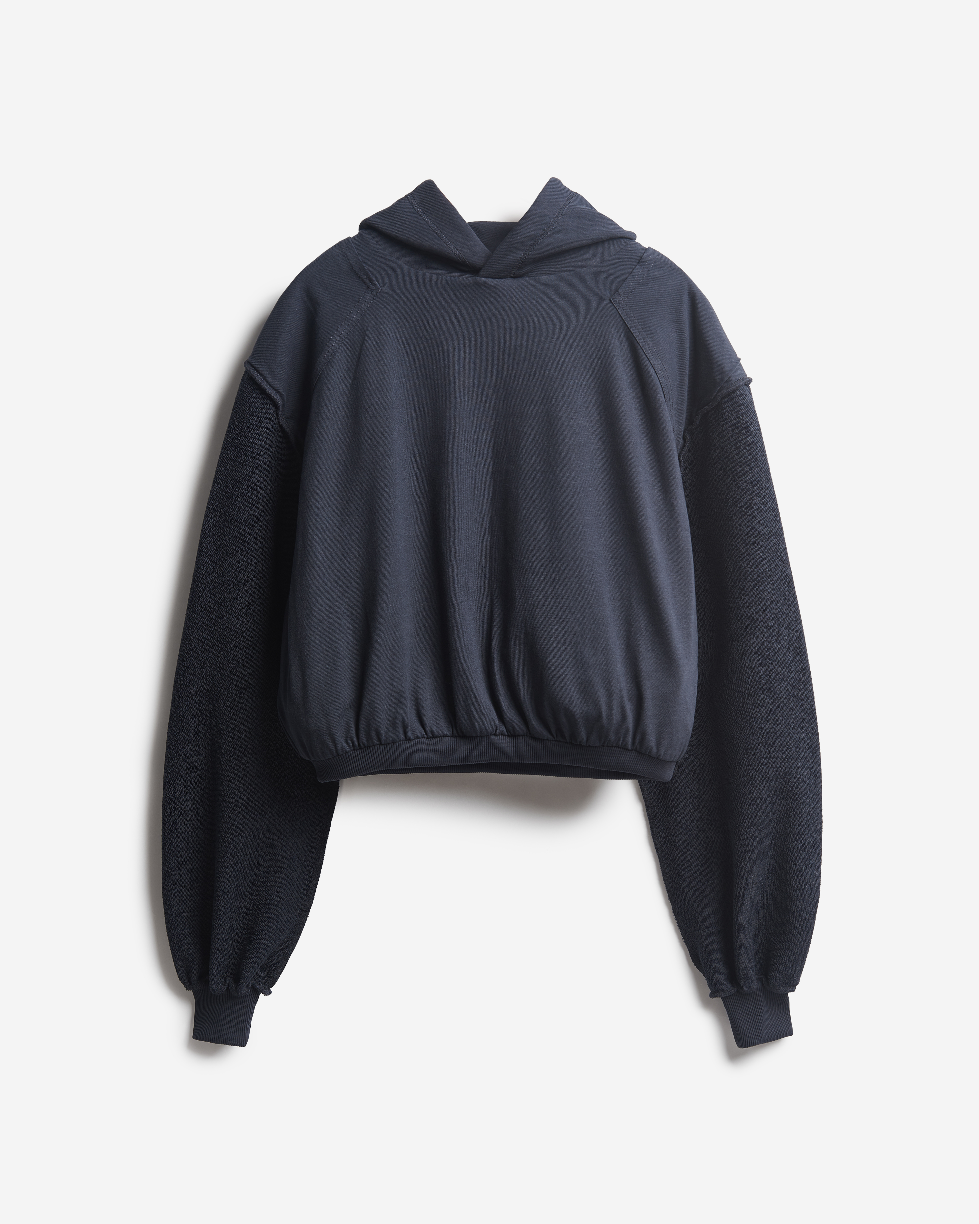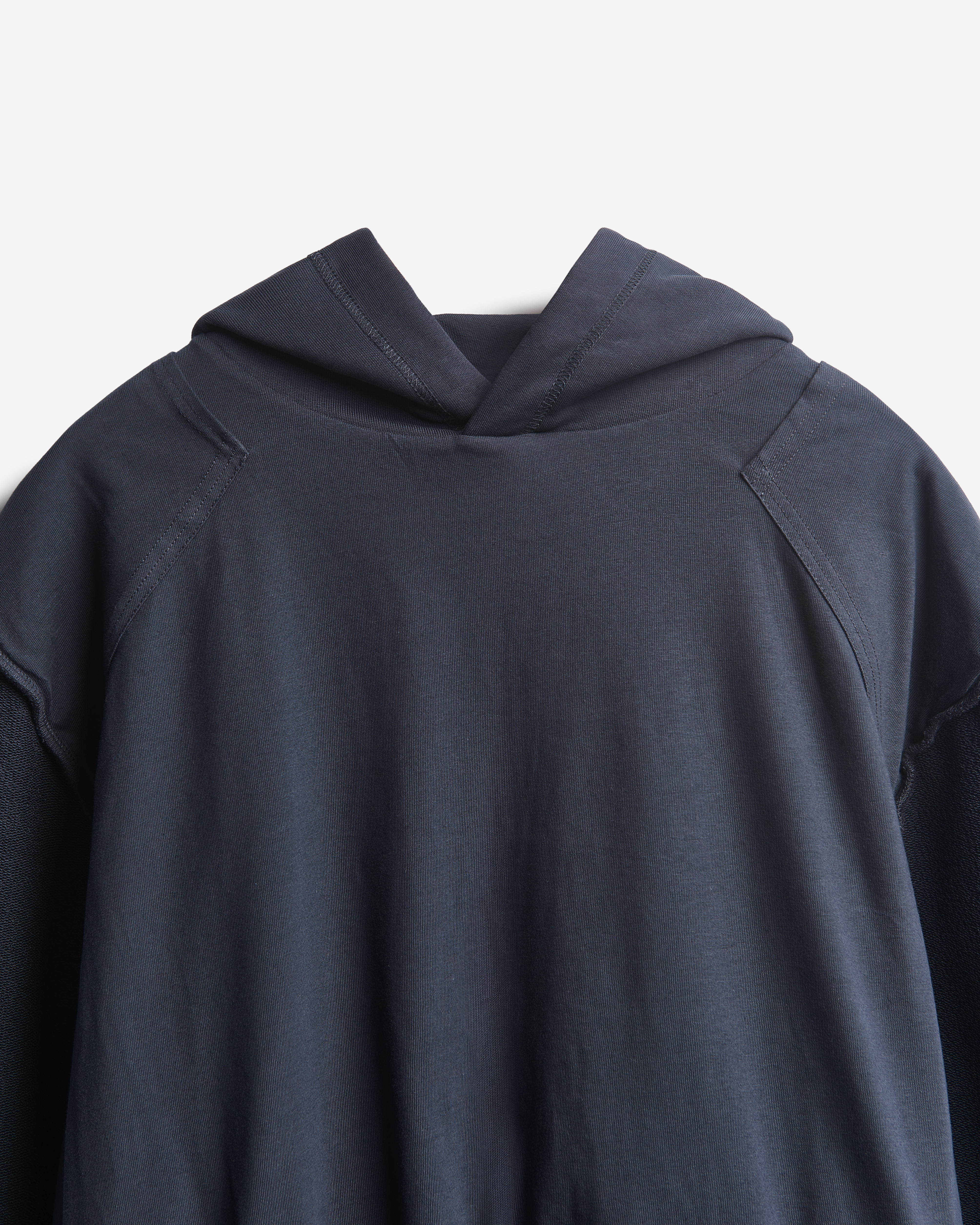 Это худи оверсайз-силуэта можно носить на две стороны. Изделие выполнено из футера, а внутри обработано тонким трикотажем. Вывернутая наизнанку, эта вещь выглядит так, будто поверх худи надели футболку. На подкладке находятся плечевые карманы, предназначенные для фиксации мягких подплечников, которые при желании можно убрать. Удлиненный рукав и низ изделия обработаны резинкой из кашкорсе. Спинка худи украшена фирменной нашивкой Ushatava. Из деталей: карман-кенгуру, капюшон на шнурке.