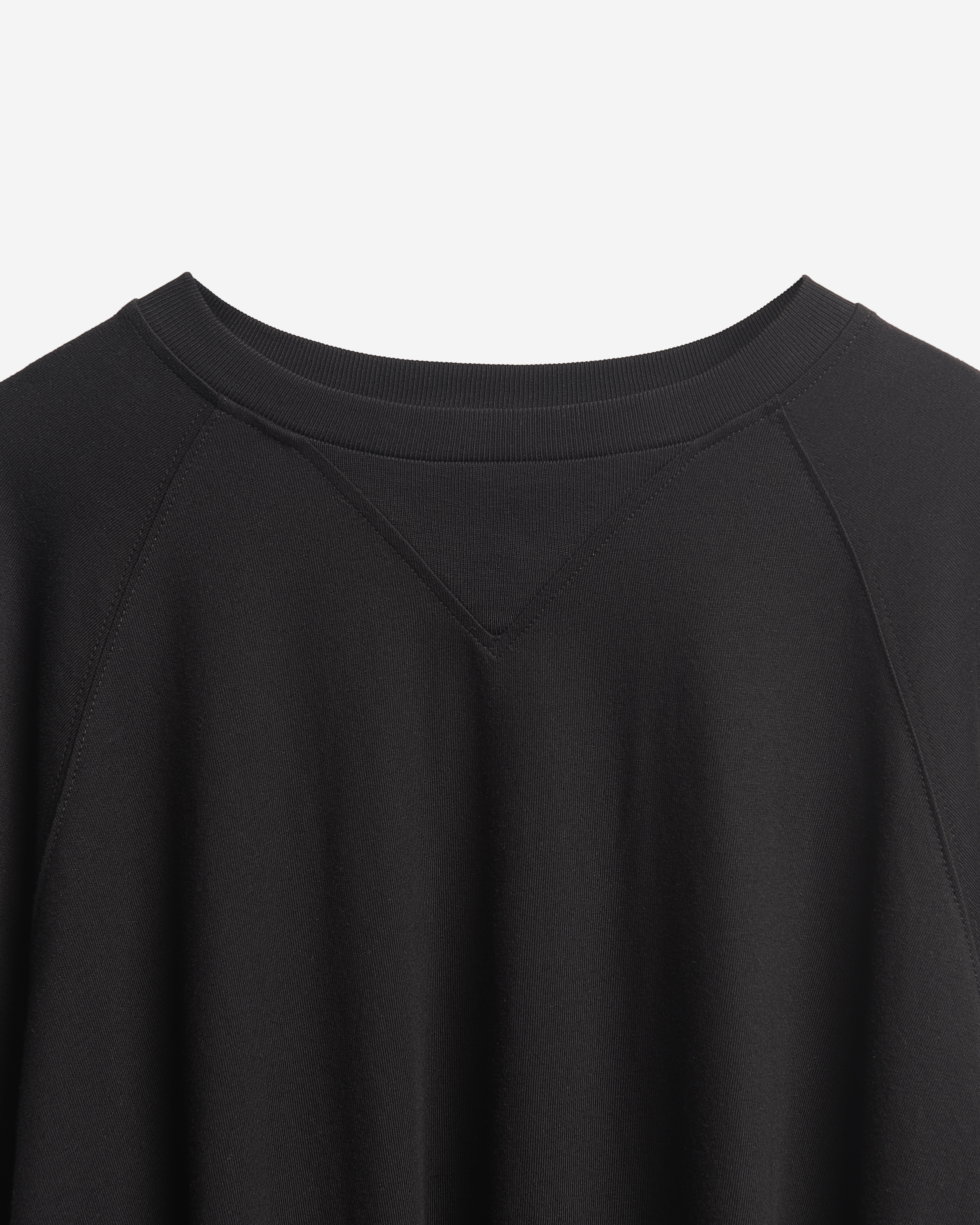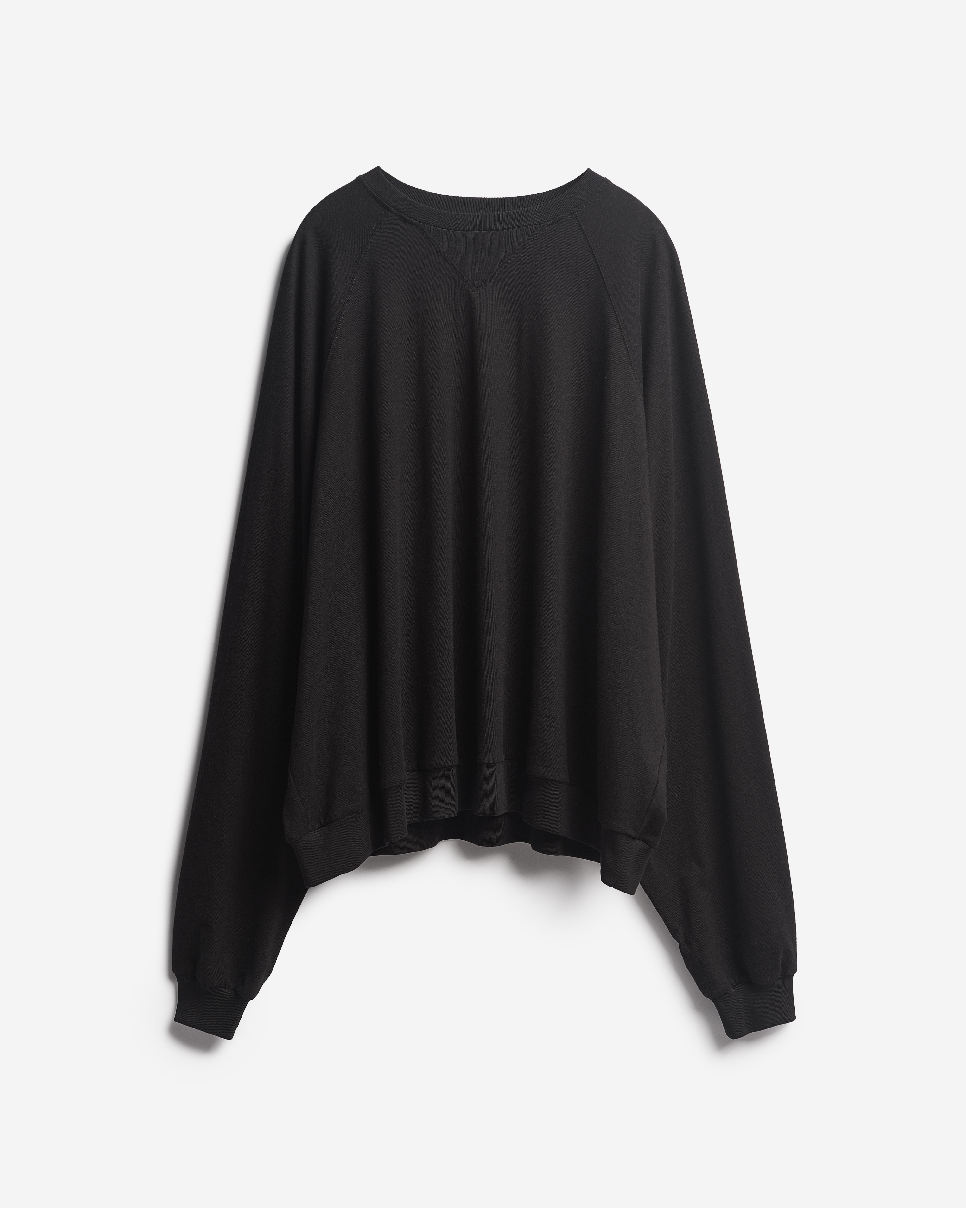 Свитшот оверсайз-силуэта. К внутреннему шву экстрадлинных рукавов пришиты тонкие резинки — если надеть их на руку, ткань соберется в мягкие складки, а рукава уменьшаться в длине. Горловина, манжеты и пояс обработаны рибаной в цвет ткани.