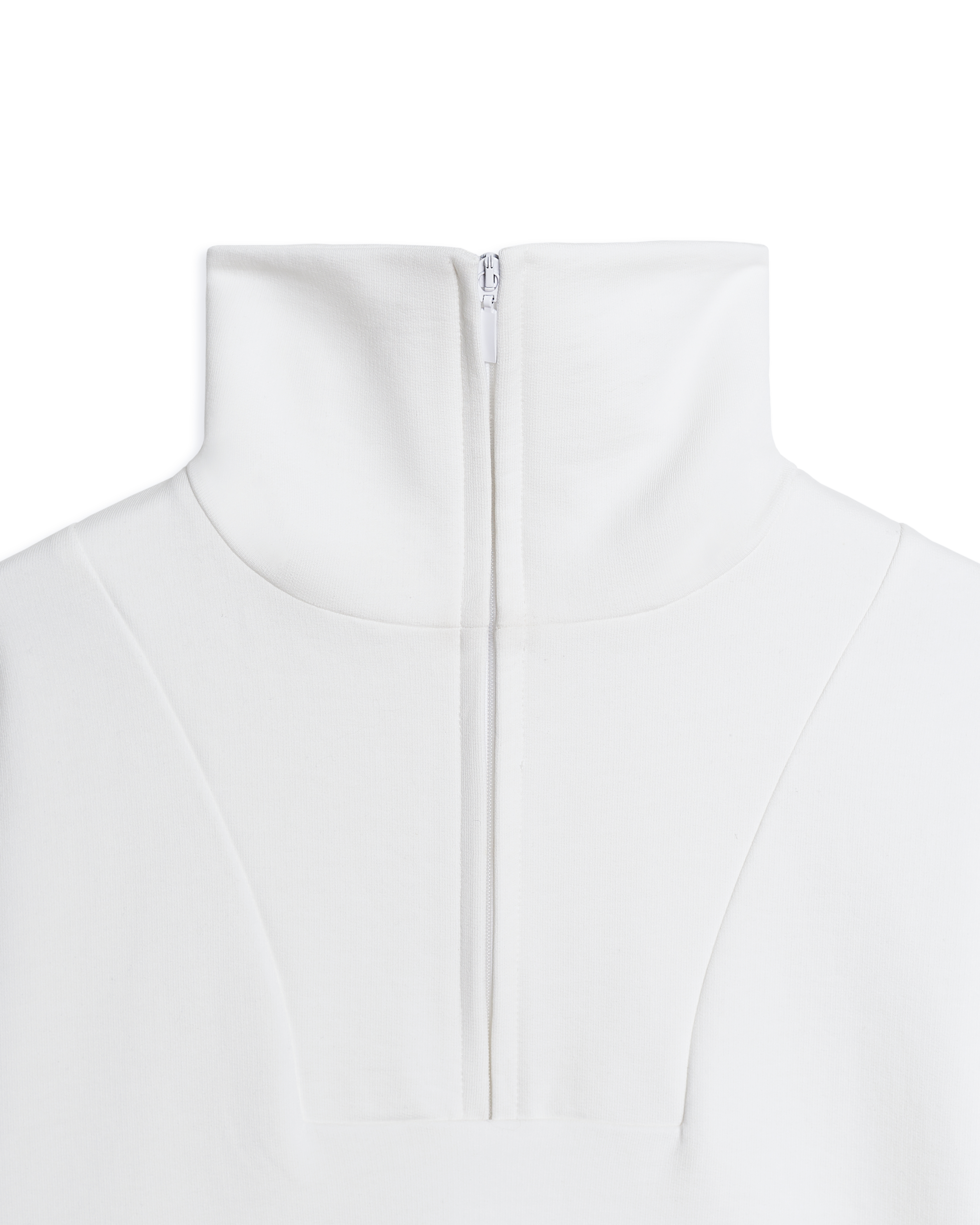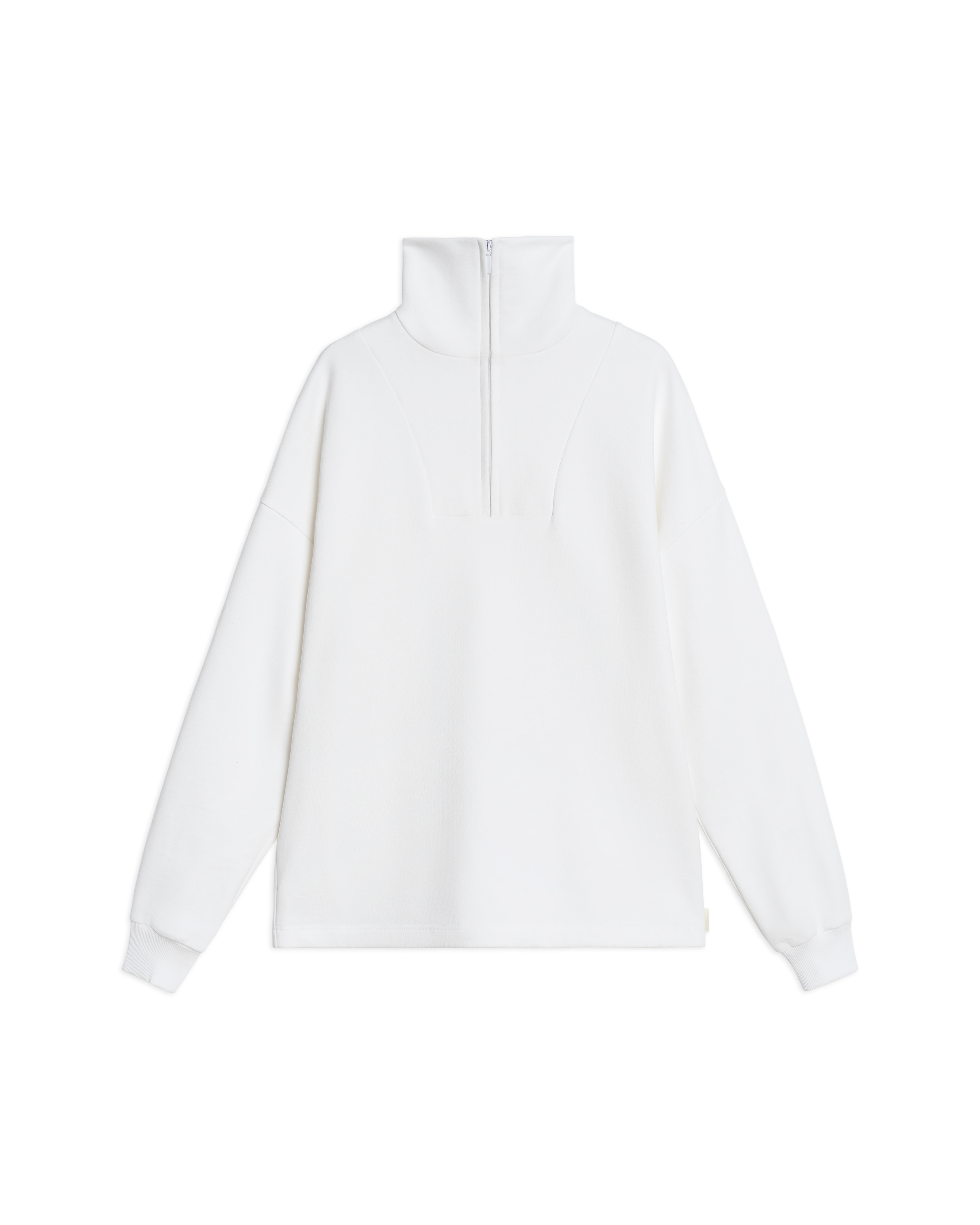 Свитшот оверсайз-силуэта. Выполнен из плотного формоустойчивого футера. Удлиненный рукав обработан резинкой из кашкорсе. Высокий воротник застегивается на молнию.