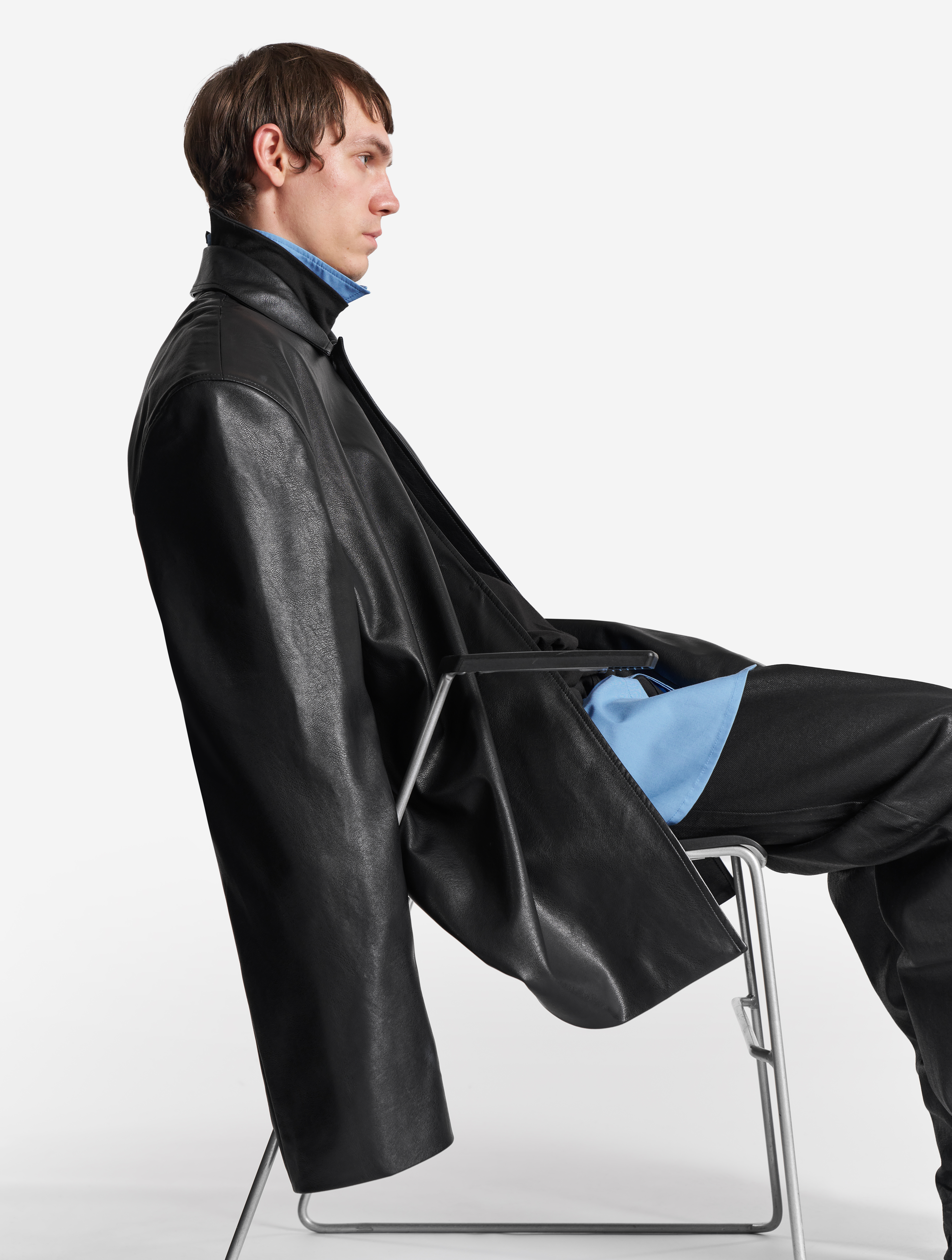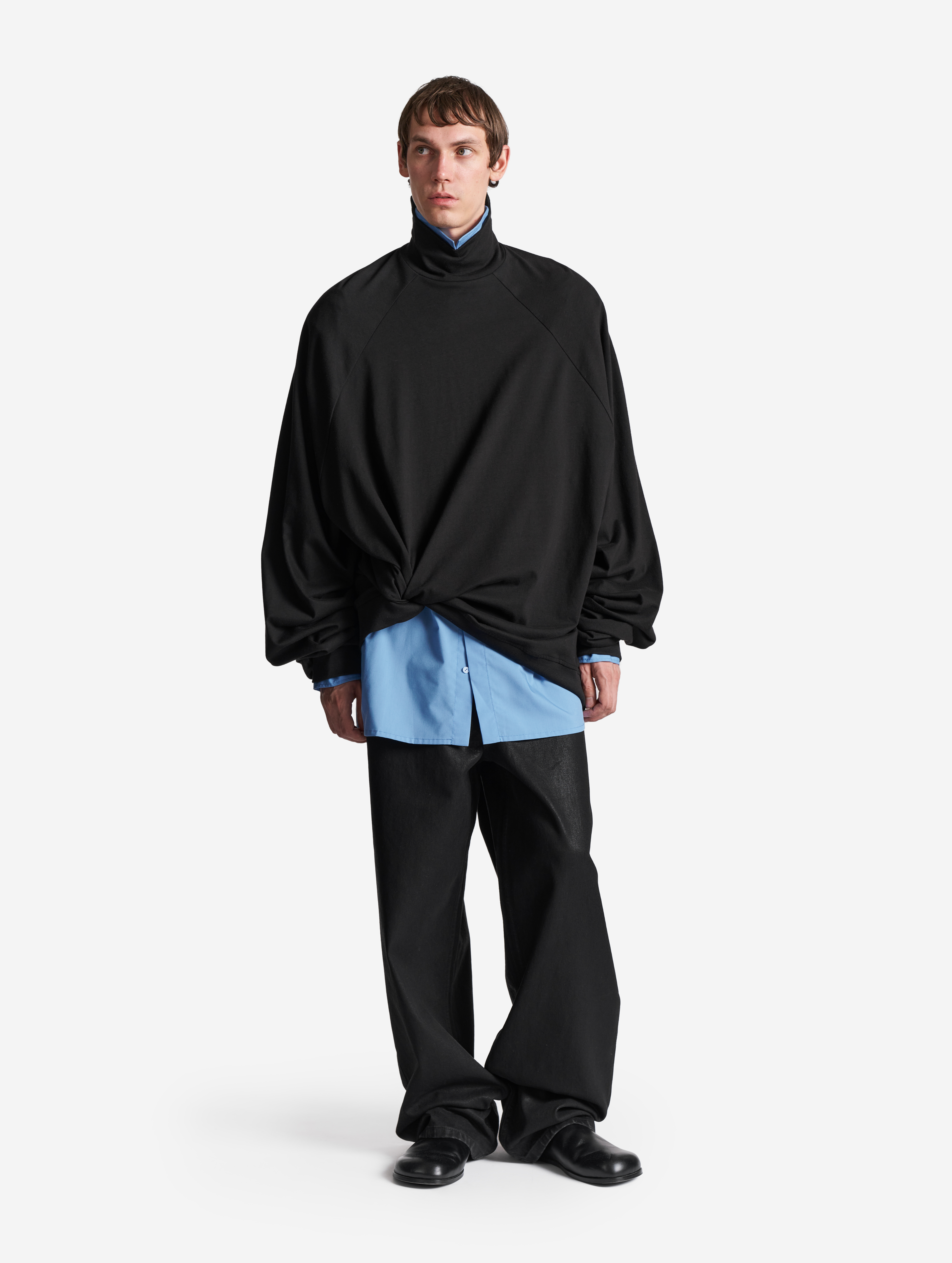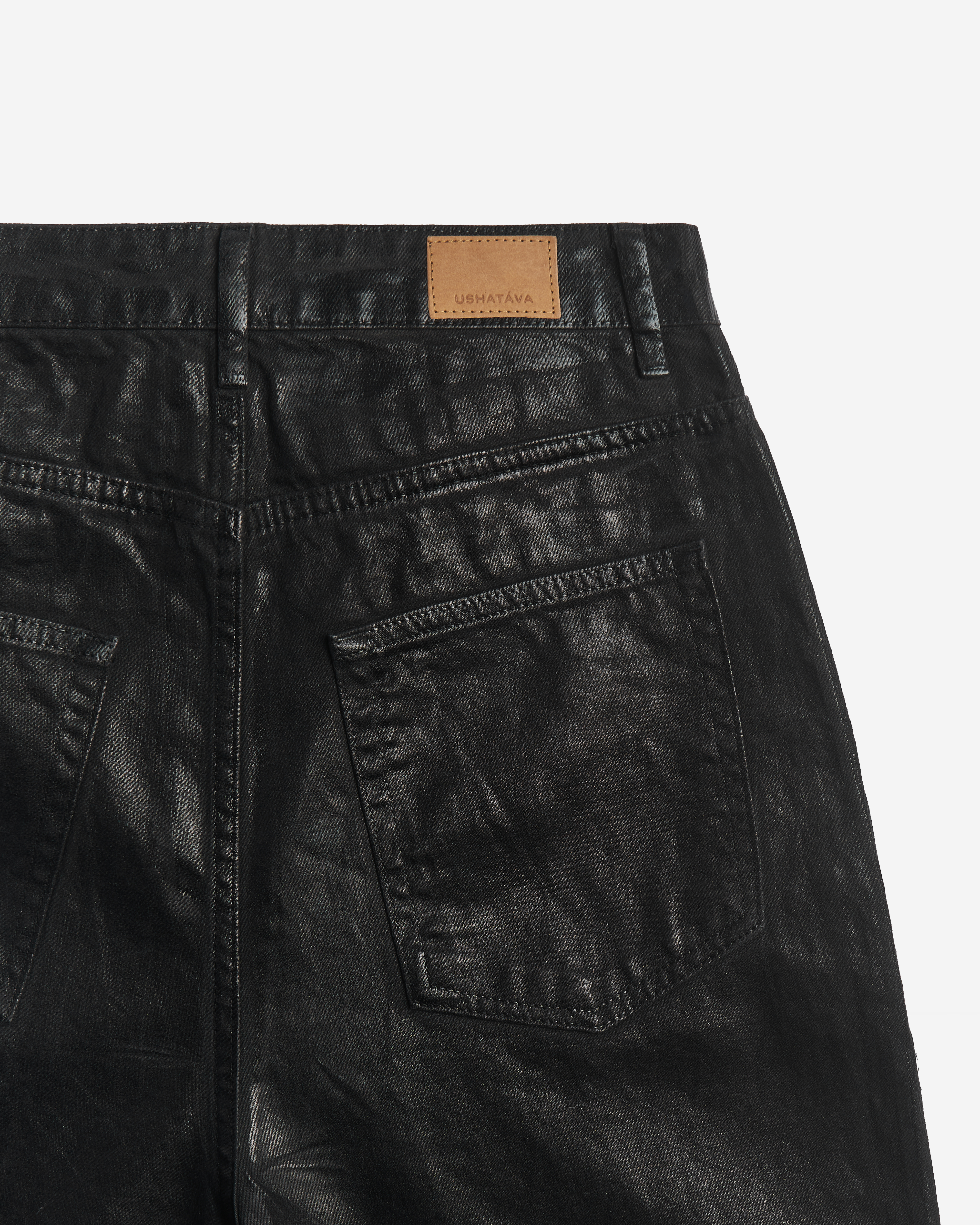 Широкие джинсы с равномерным клешем, идущим от бедра и сужающимся книзу. Изделие выполнено из плотного денима, покрытого воском, — благодаря ему джинсы получают характерный блеск, а ткань становится водонепроницаемой. Есть два кармана и один маленький для зажигалки спереди, а также два кармана сзади. Изделие маркируется только буквенной размерной сеткой и позиционируется нами как унисекс. Посадка варьируется в зависимости от выбранного размера. Модель застегивается на молнию и металлическую джинсовую пуговицу. Есть шлевки для ремня.