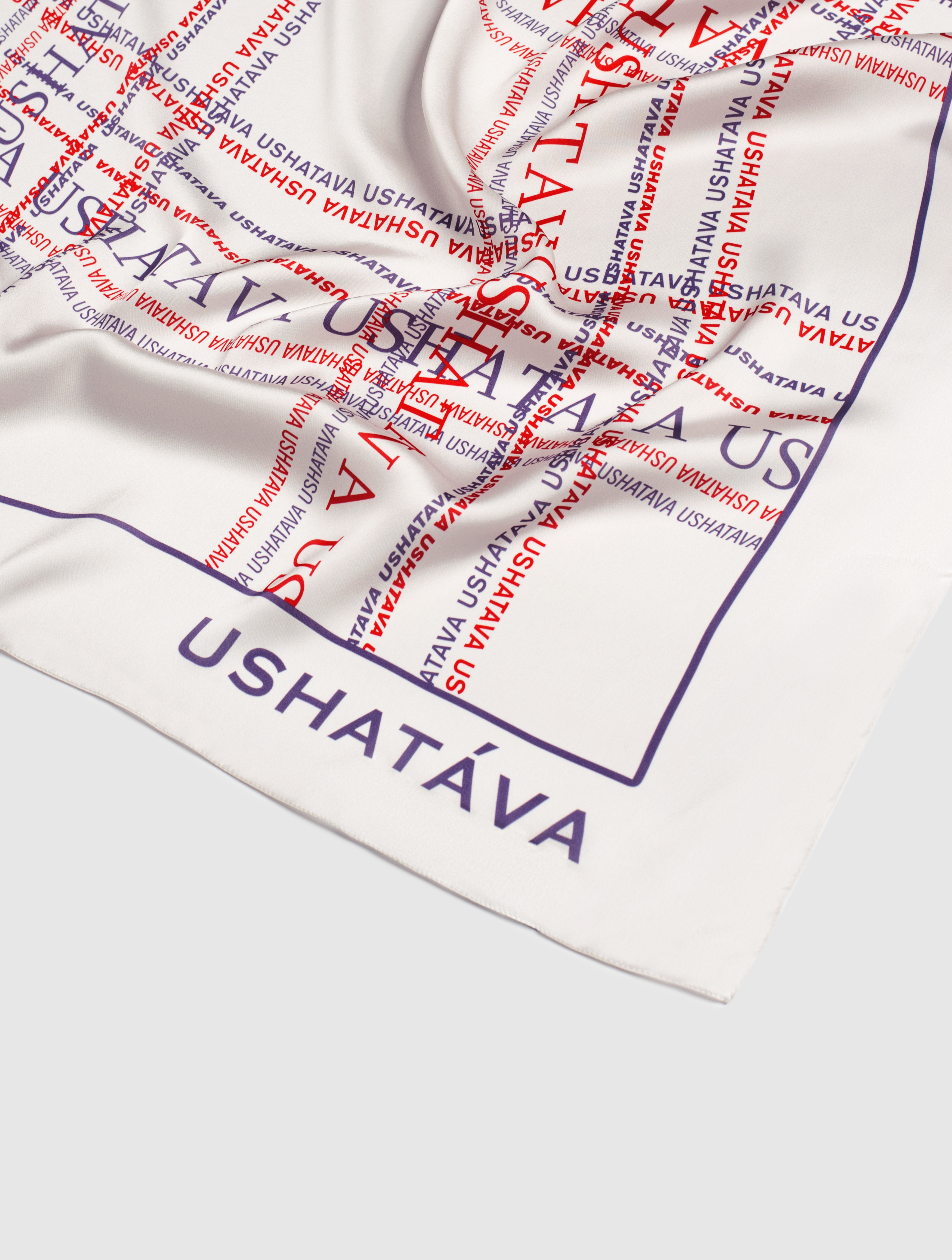 Поверхность платка украшает принт «клетка», составленный из размноженного лого Ushatava. Его расцветка отражает главные цвета Garderobe FW23/24: черный, графитовый, чернильный, голубой, красный. «В новом сезоне я предлагаю носить платки как юбки — с леггинсами, ботфортами, повязывать поверх платьев. Эту идею я планирую развивать и дальше», — говорит креативный директор модного Дома Нино Шаматава.