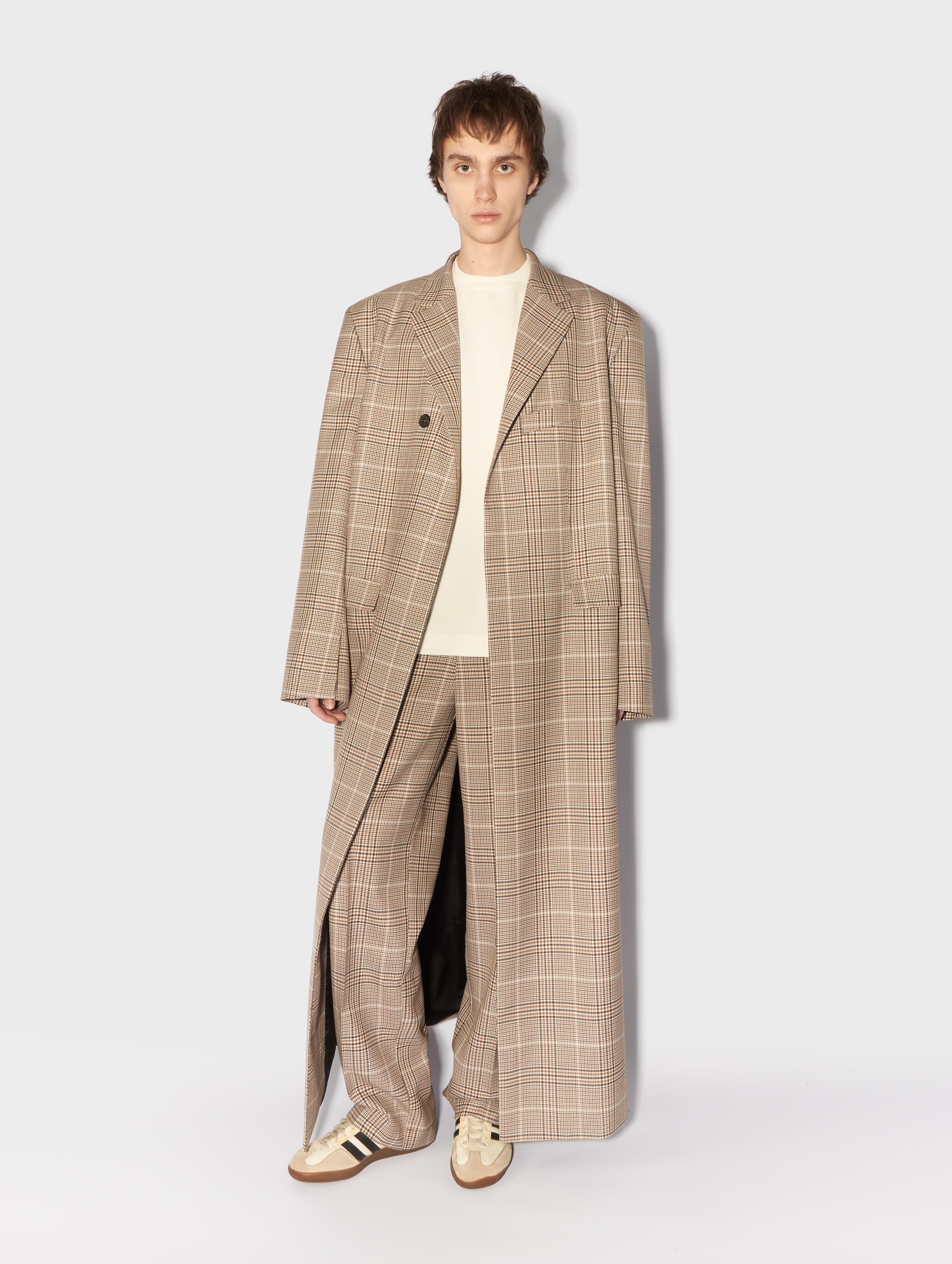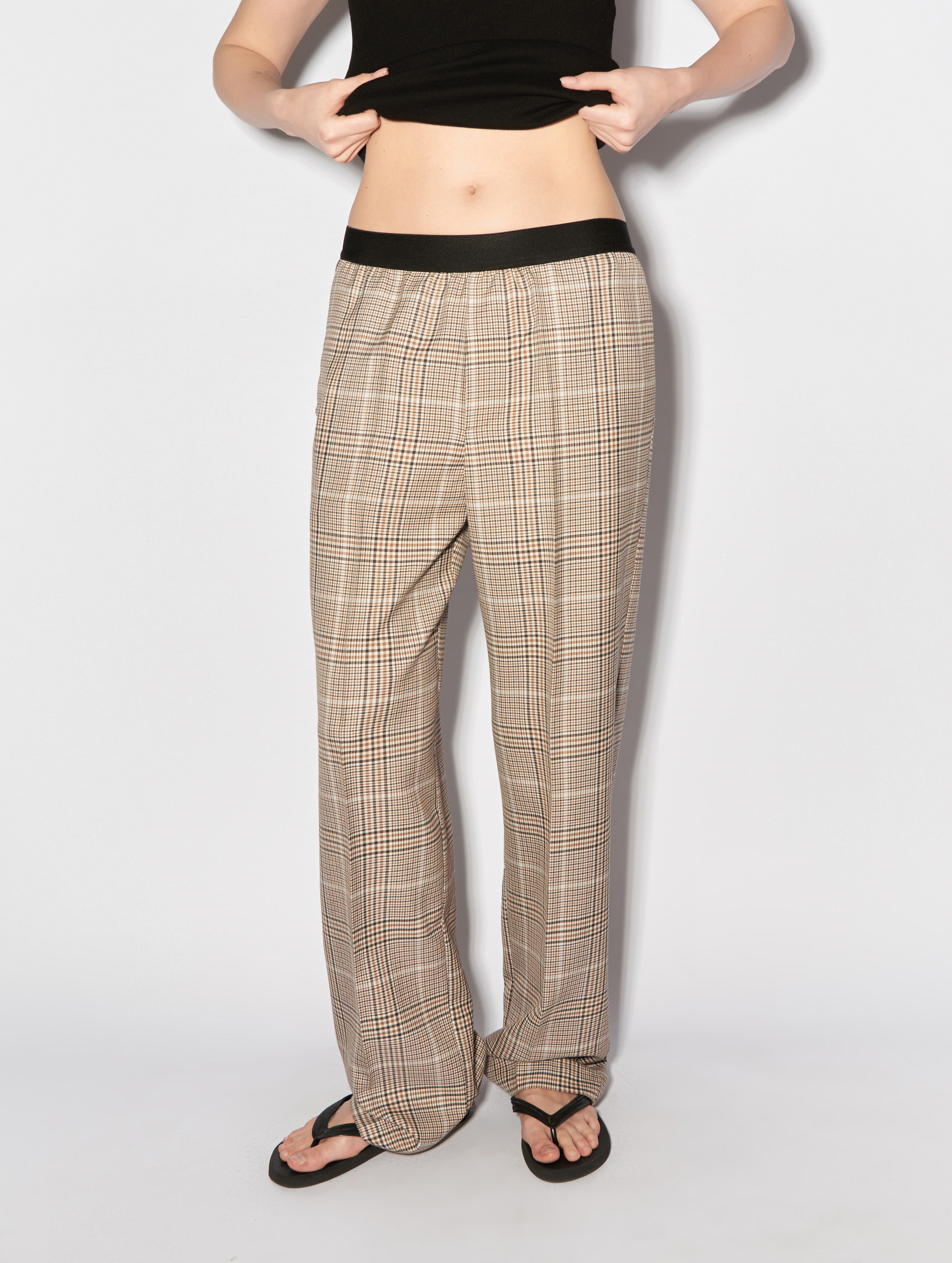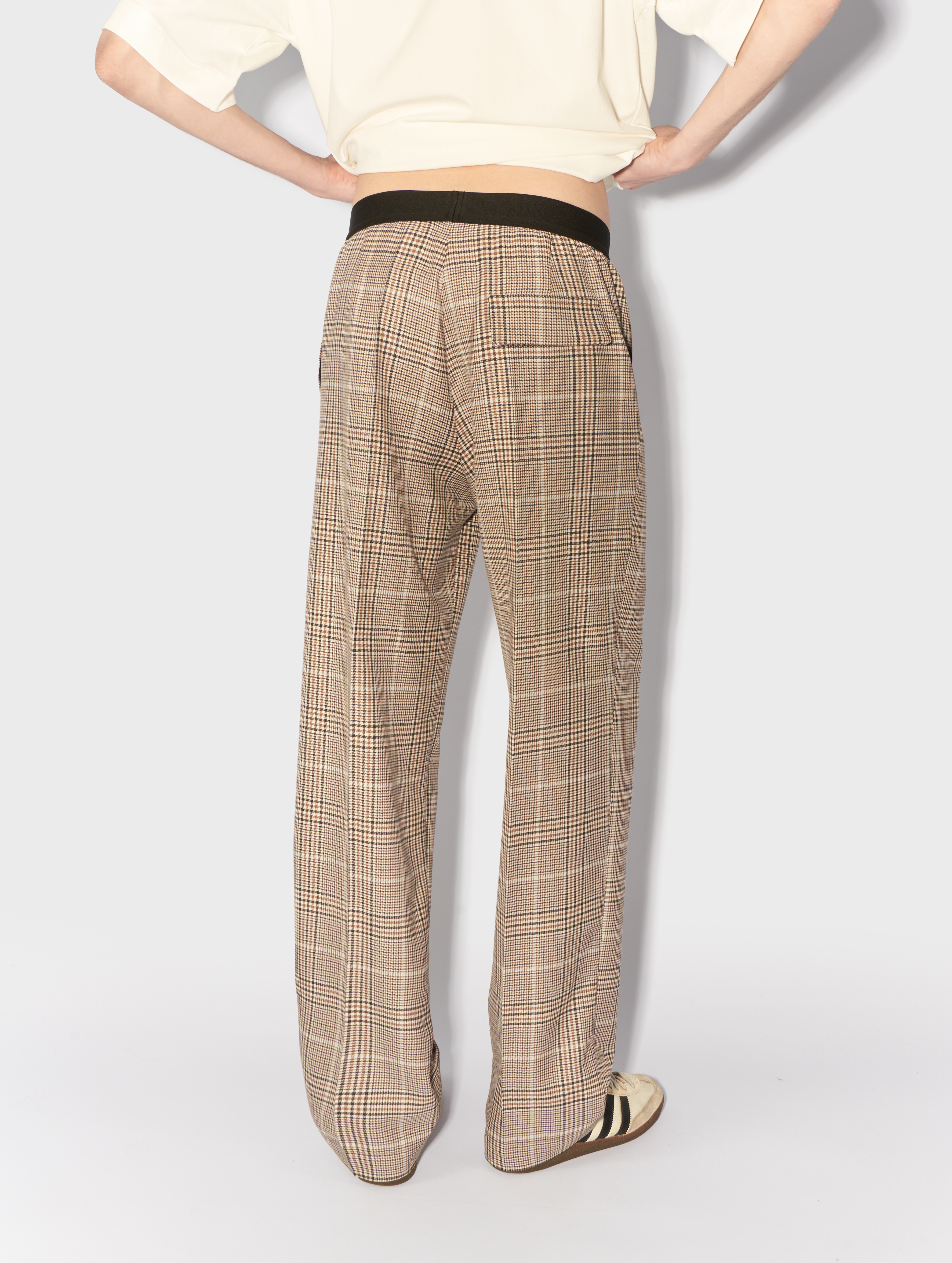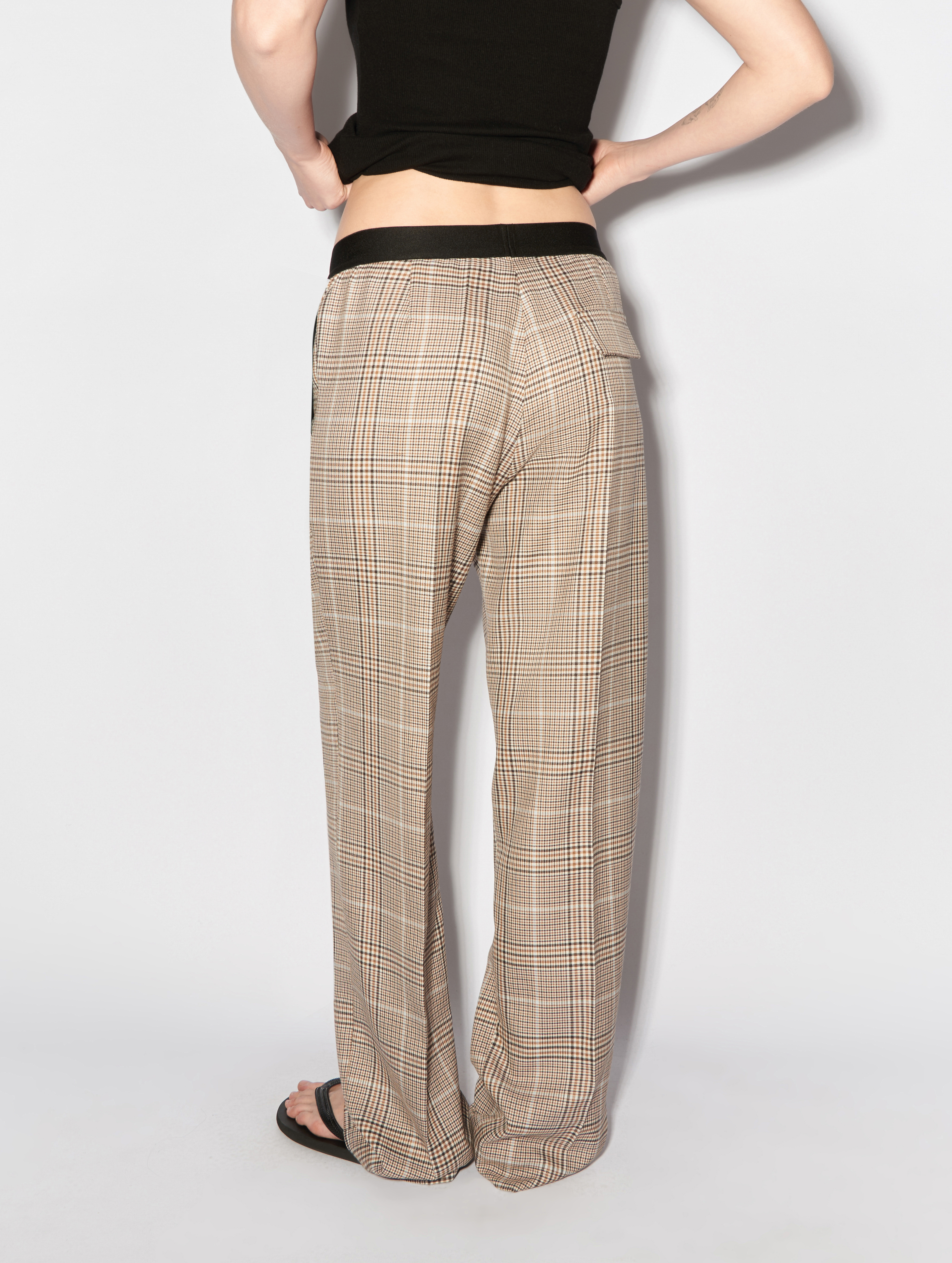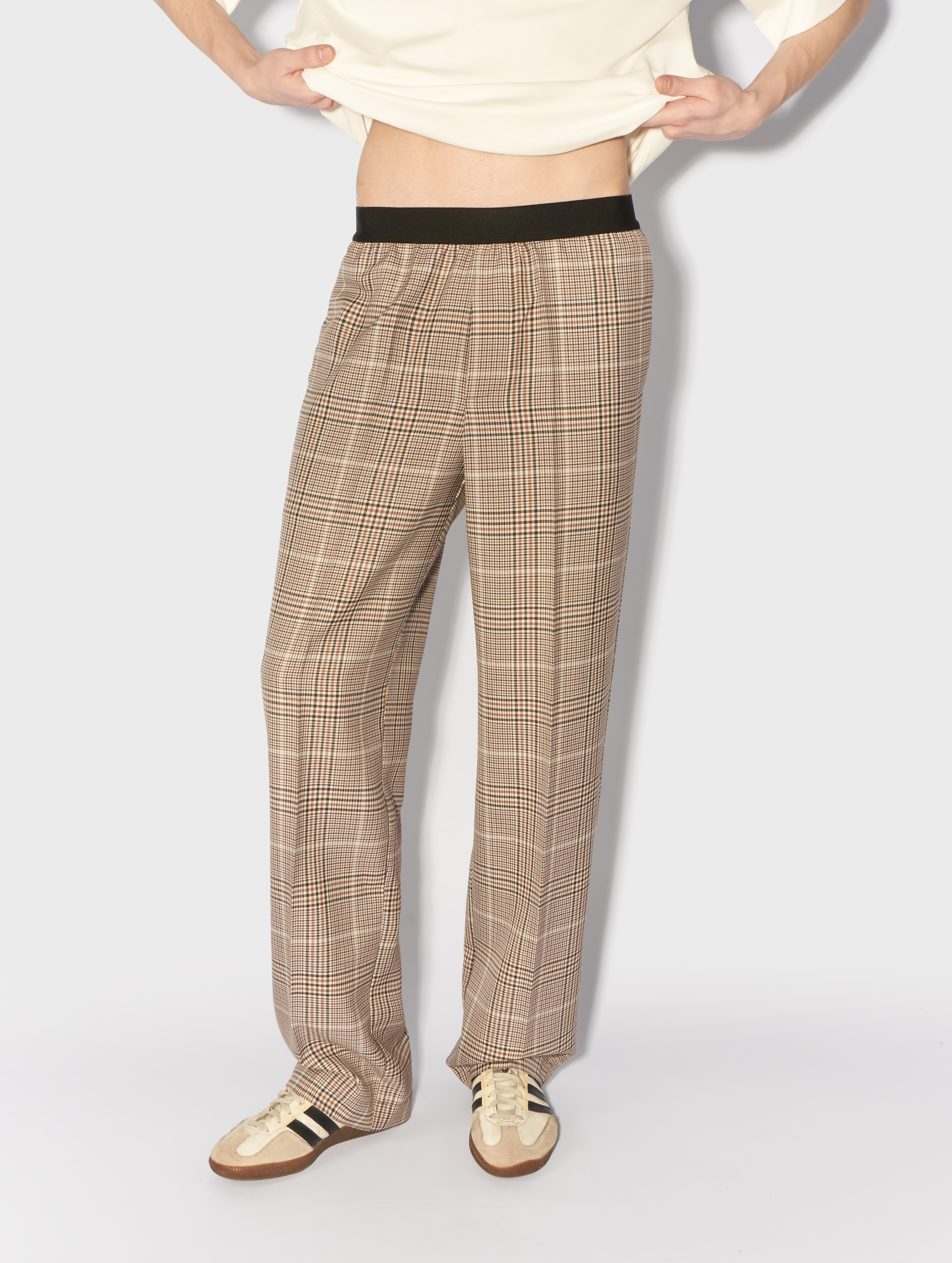Агендерные брюки классического силуэта, посаженные на неклассическую мягкую резинку. Комбинация casual, спортивного и делового стиля в одном изделии дают более расслабленную интерпретацию классики. Брюки заужены к низу, спереди и сзади имеют заутюженные классические стрелки, которые не будут расправляться после стирок. Имеются два функциональных боковых кармана, а на правой задней половине брюк есть настрочной клапан, имитирующий карман.