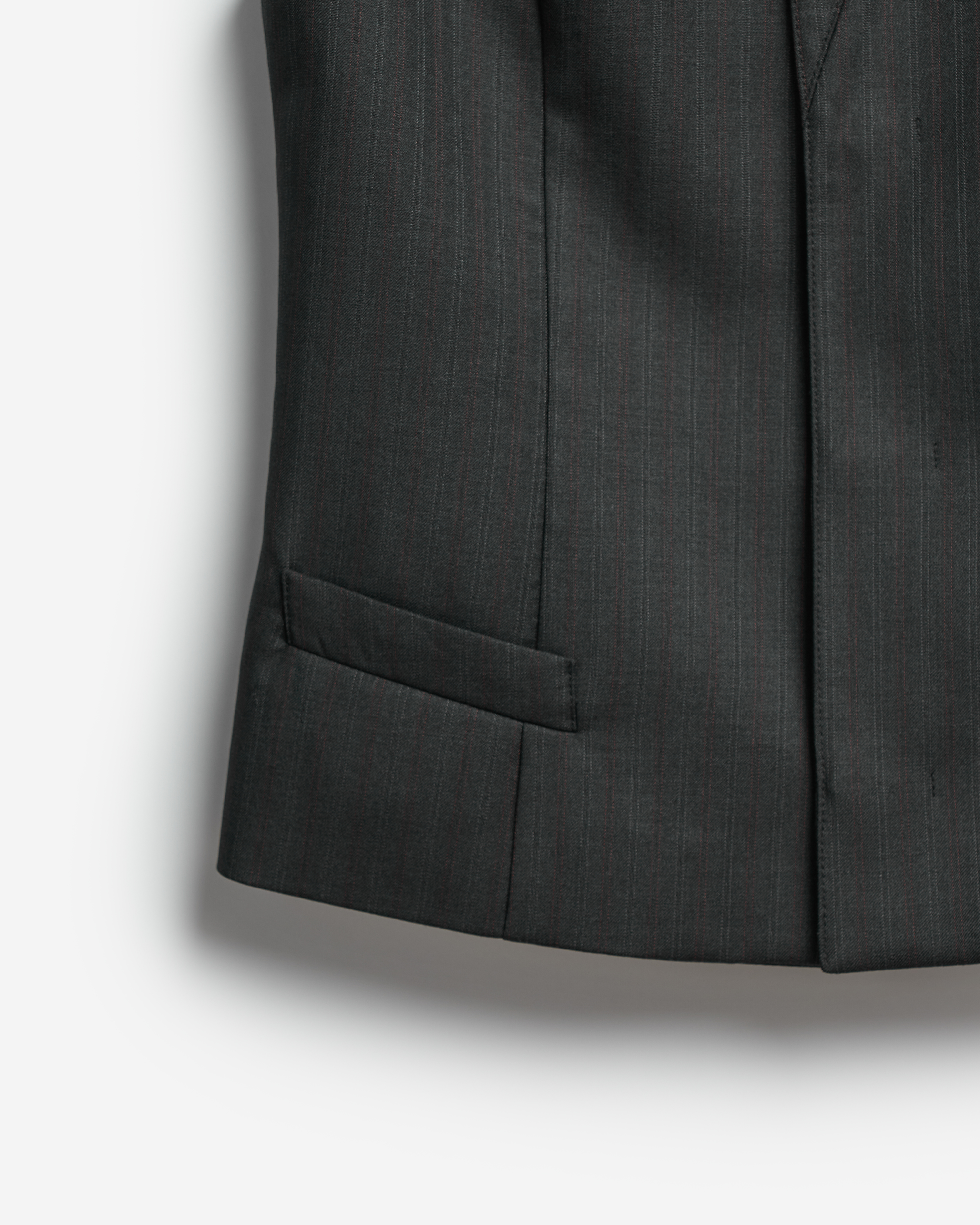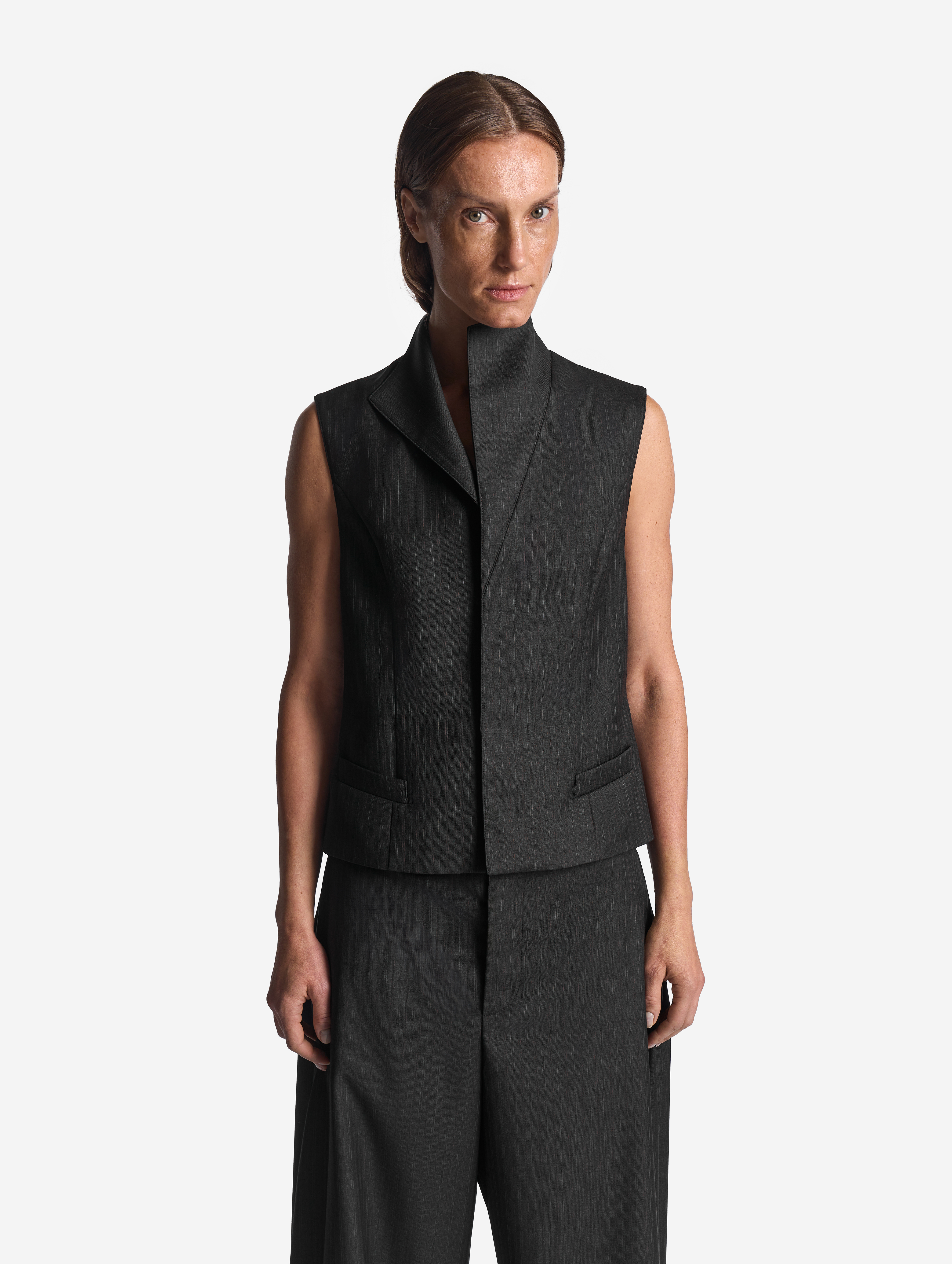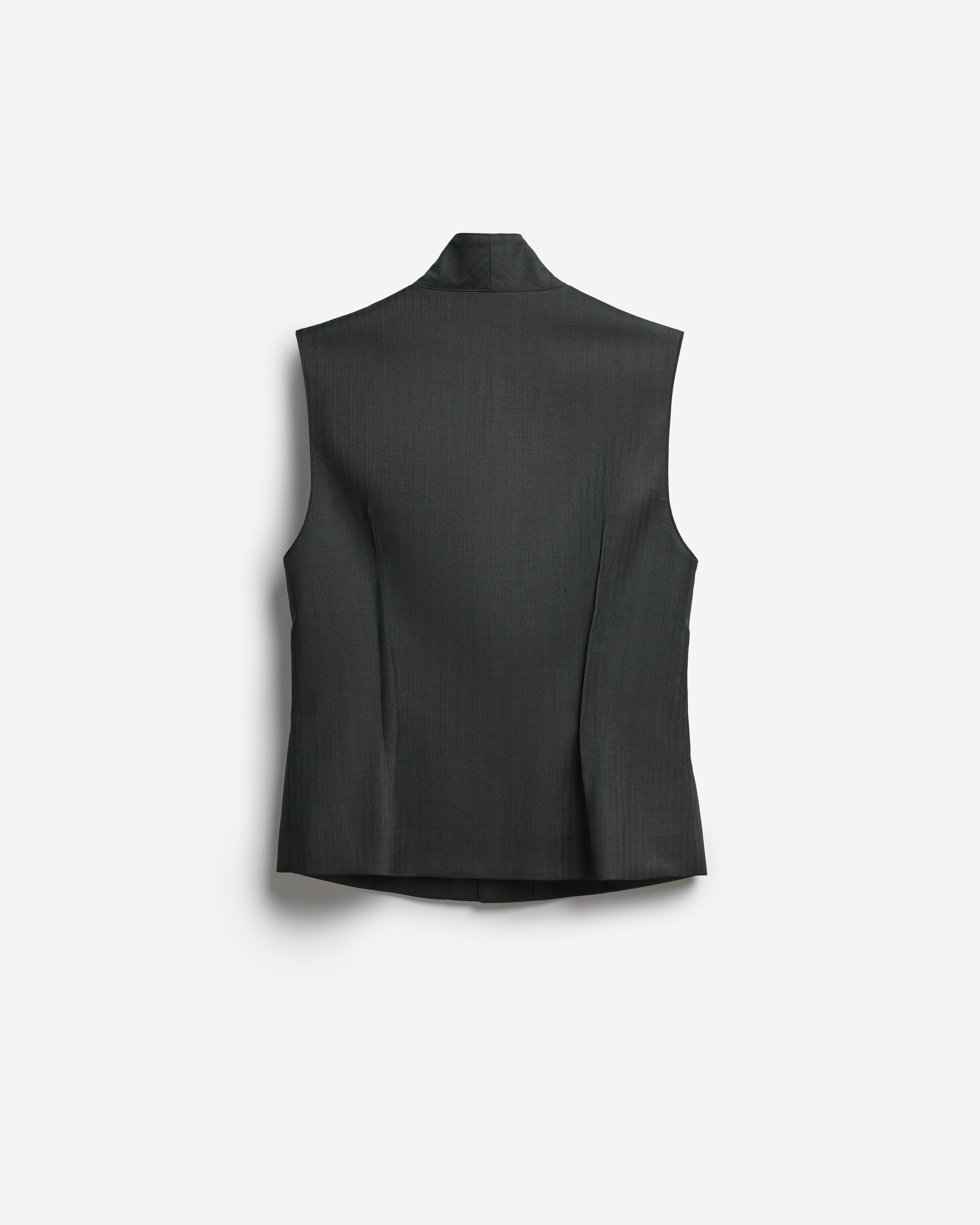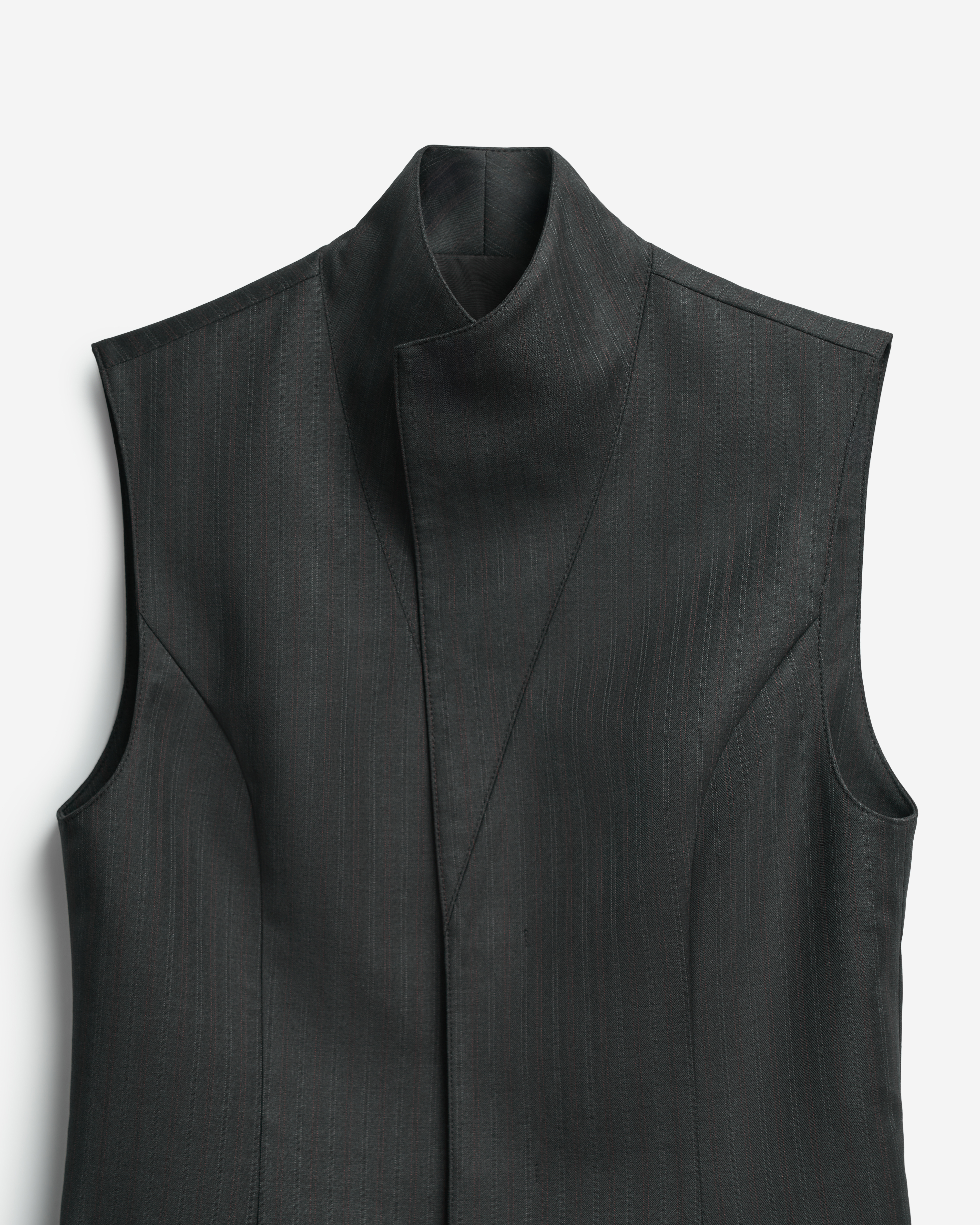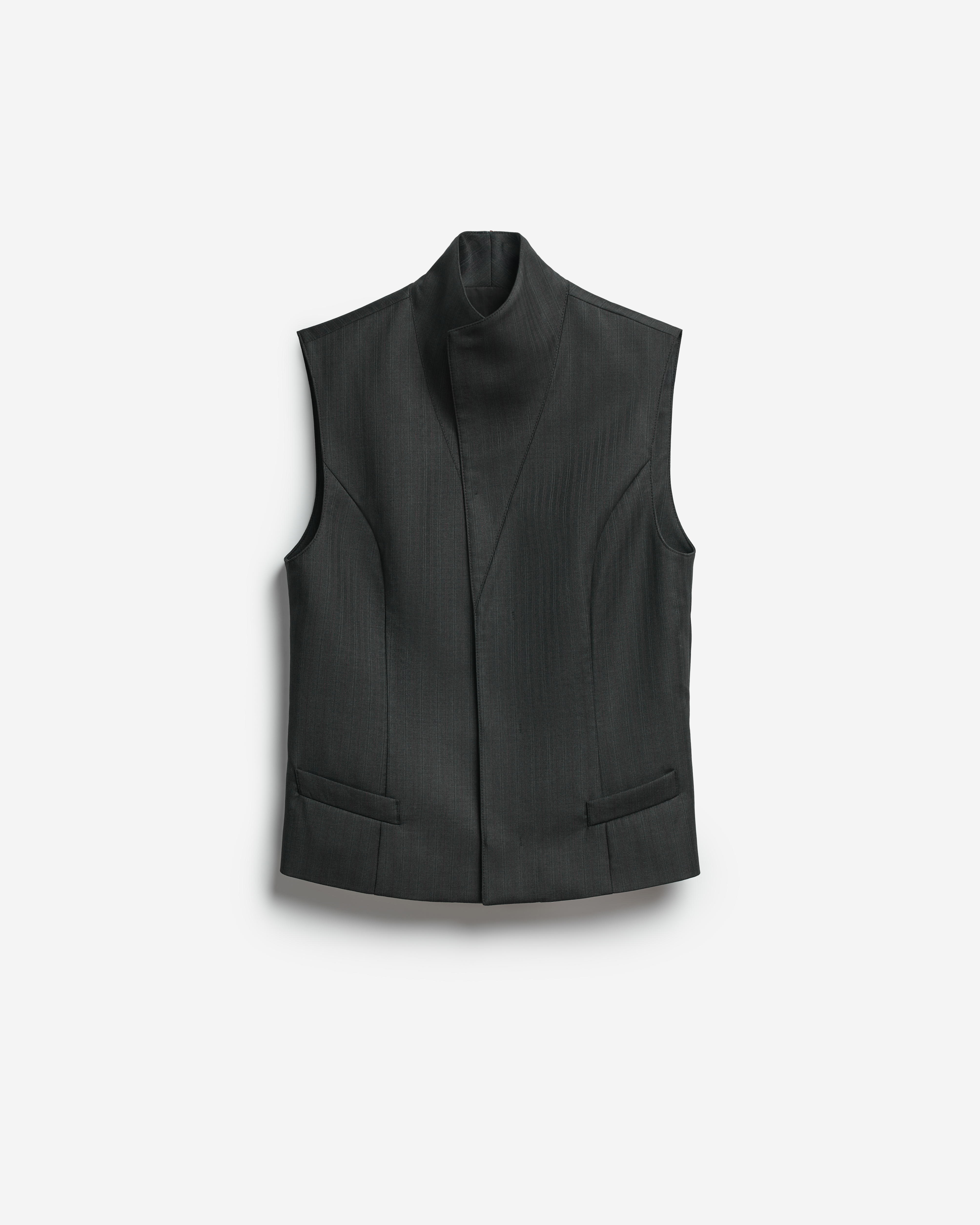 Внушительная часть коллекции I am that I am наполнена воспоминаниями креативного директора Ushatava Нино Шаматава о своих грузинских корнях, семье и гардеробе родителей. Один из результатов такого взгляда внутрь себя — строгий жилет, отсылающий к чохе, традиционному элементу костюма некоторых народов Кавказа. Верхняя одежда для грузинских мужчин традиционно подчеркивала широкие плечи ее обладателя — акцент усиливали на контрасте с талией, туго перехваченной ремнем. В этом изделии подобный силуэт формируют вытачки, сделанные по всему объему жилета. Еще одна отсылка к традиционному костюму — высокий воротник-стойка, который при желании можно распахнуть.