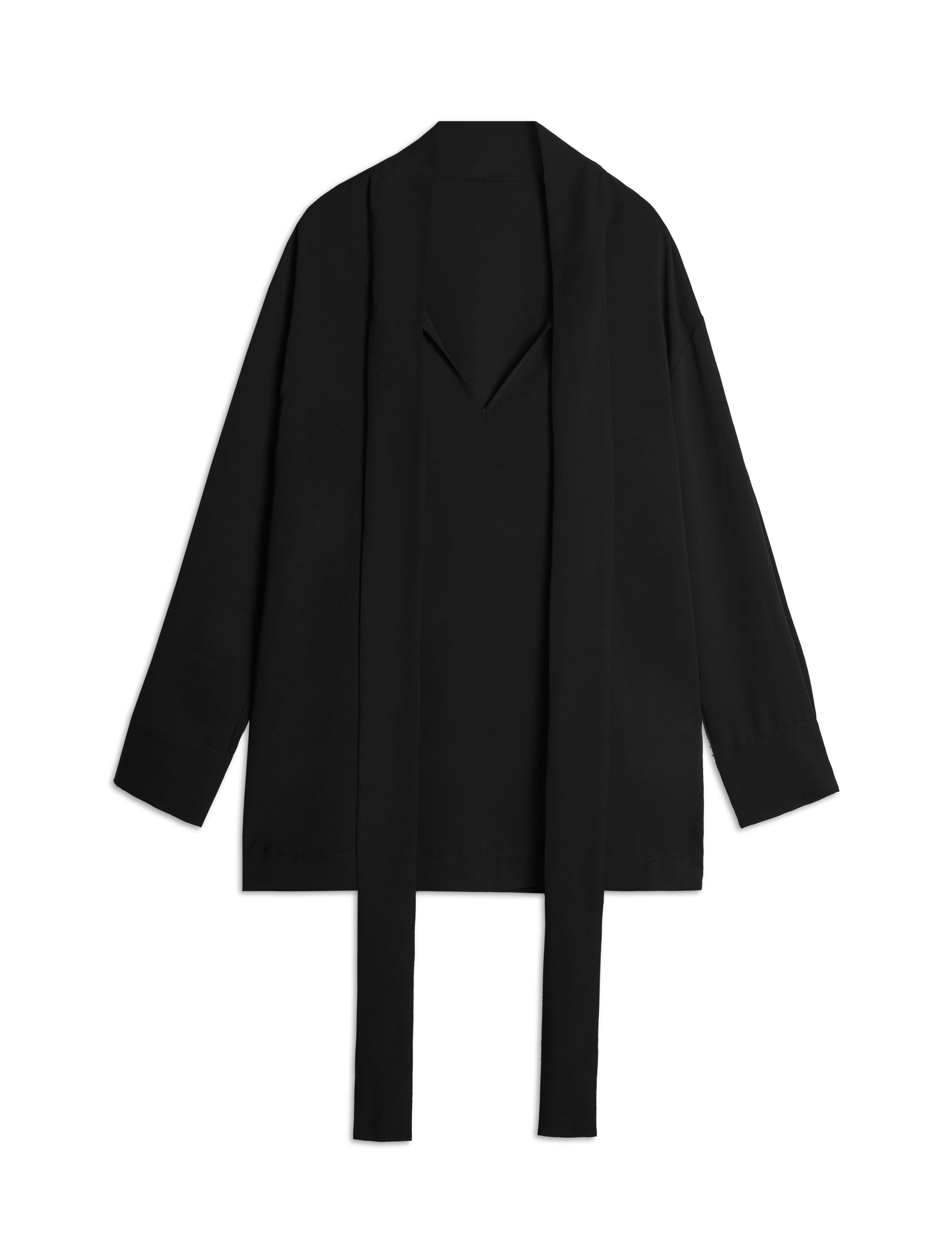 Блузка воплощает идею модели-трансформера. Ленты являются продолжением воротника, их можно оставить в расслабленном виде или перекрестить на груди (внутреннее название этого стайлинга, которым пользуется design team, — грузинское платье). Блузка имеет V-образный вырез, на манжетах есть пуговицы. Застегивается на бельевой крючок.