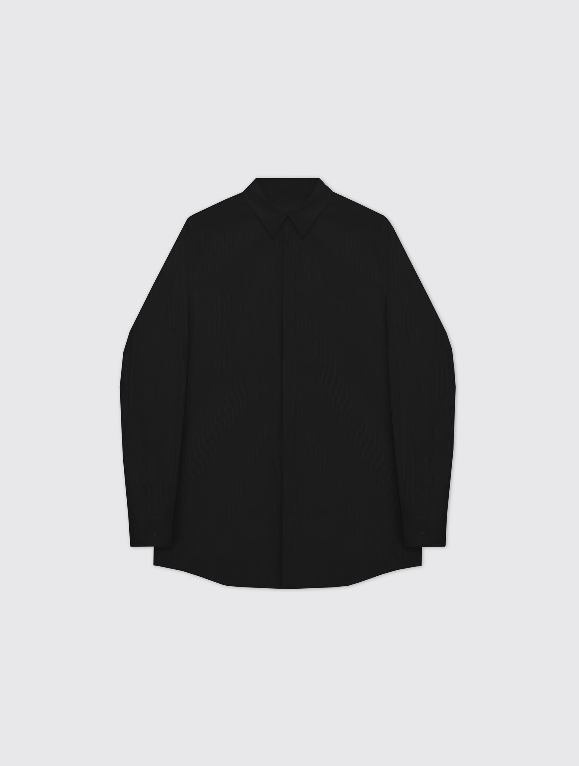 Рубашка прямого кроя имеет вытянутый силуэт и свободную посадку. Посадка рассчитана на женскую и мужскую фигуры. У модели удлиненные рукава, плоская спинка с двумя заложенными складками, фигурный низ. Рубашка застегивается на пуговицы, есть нагрудный карман.
