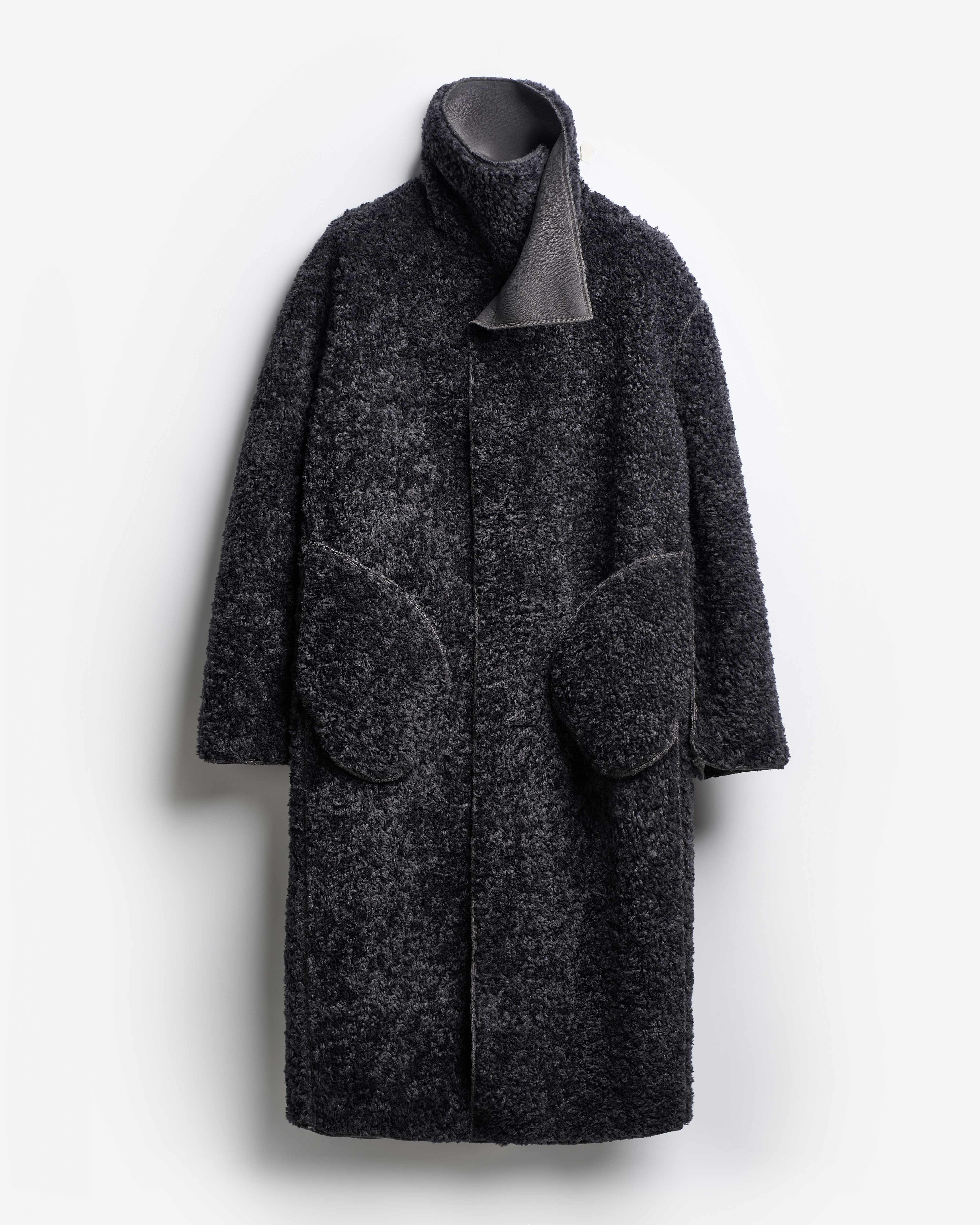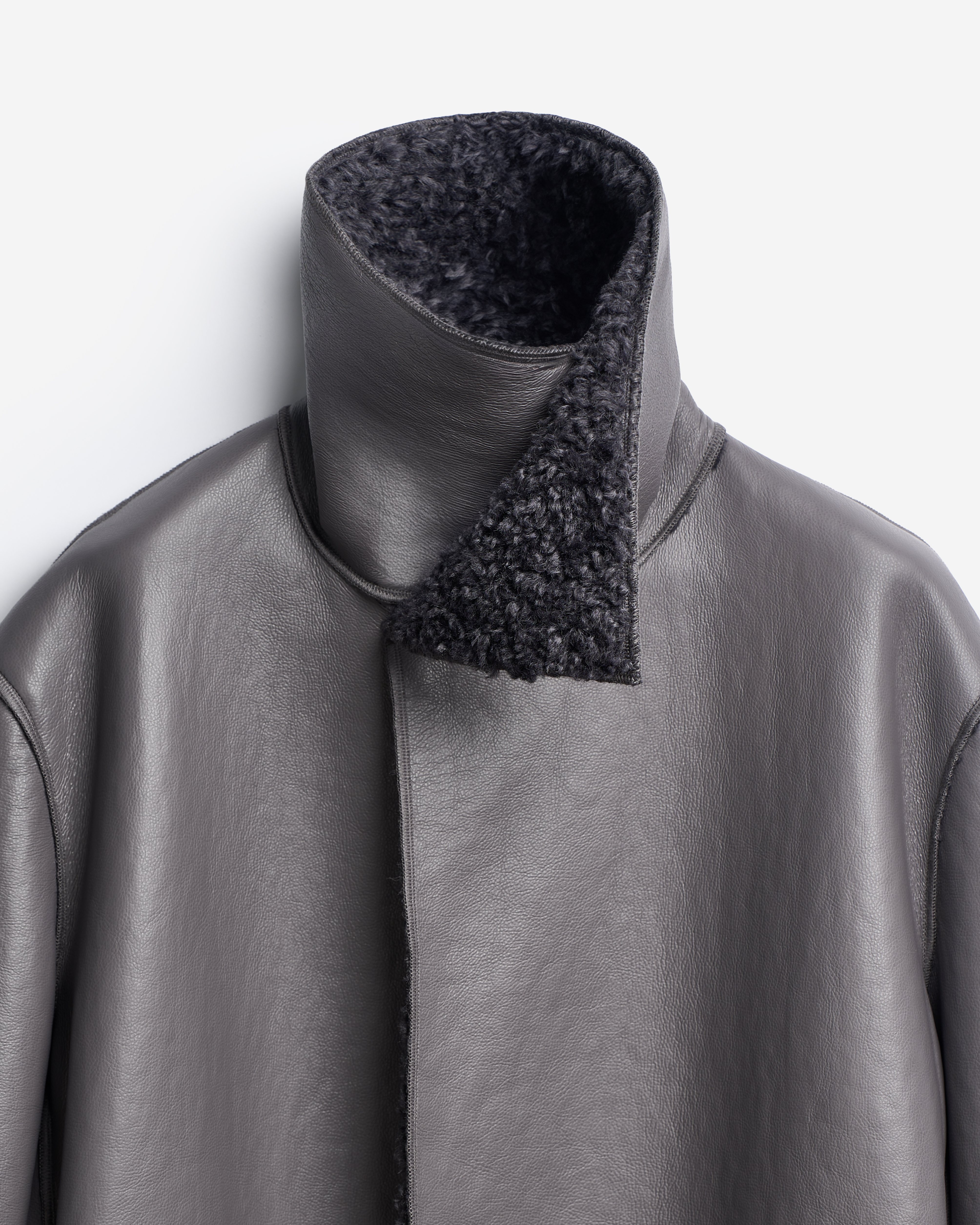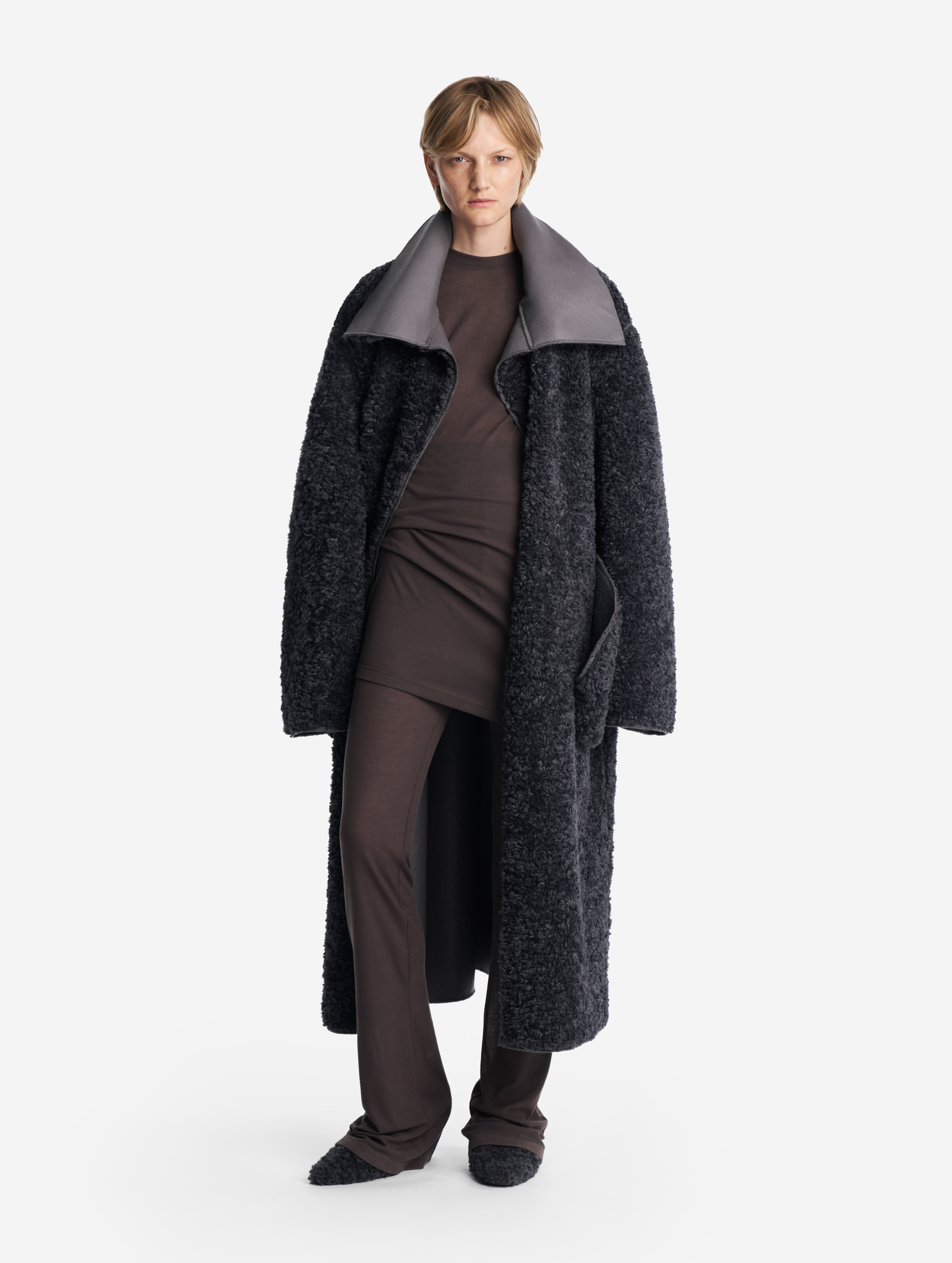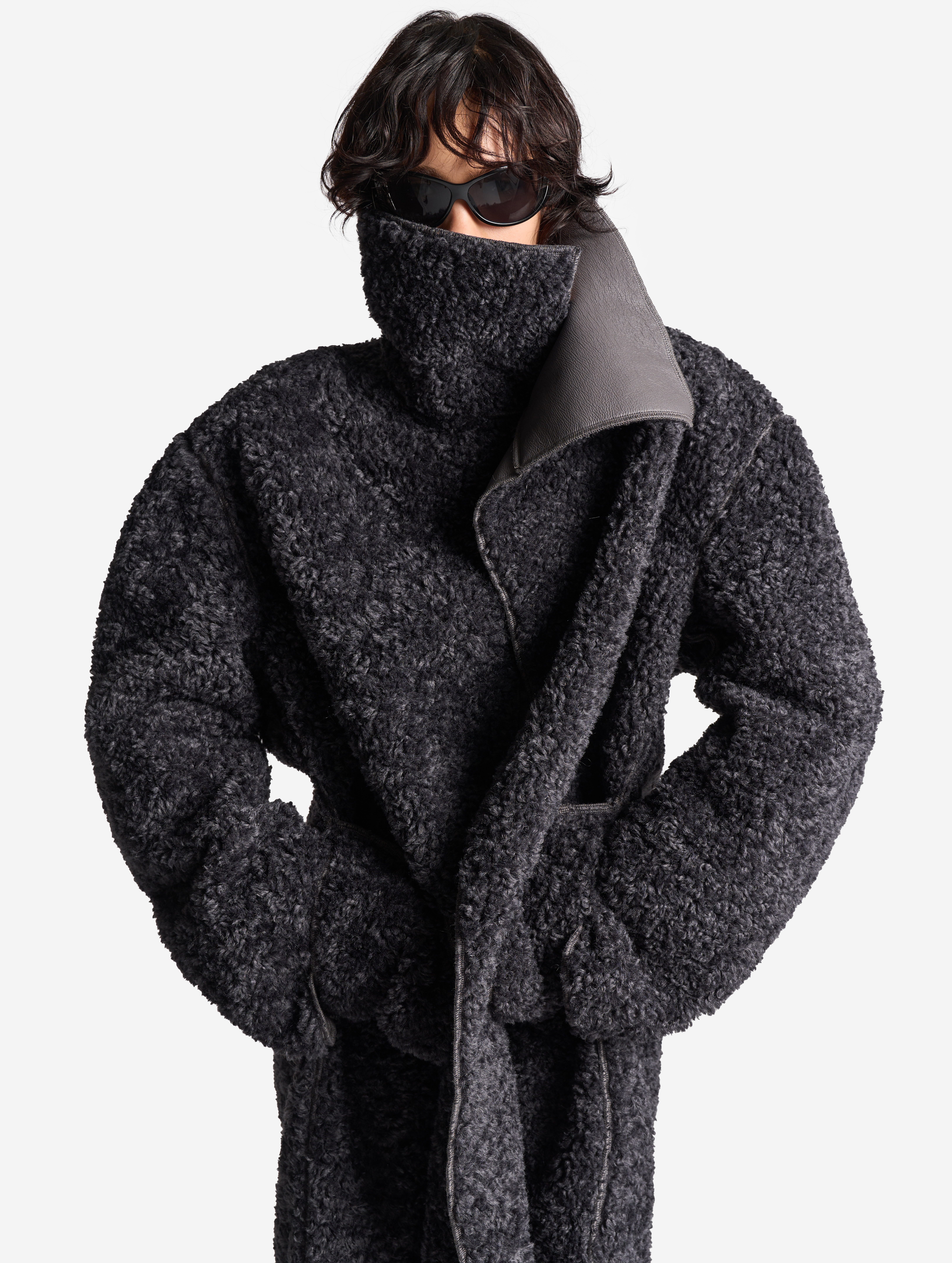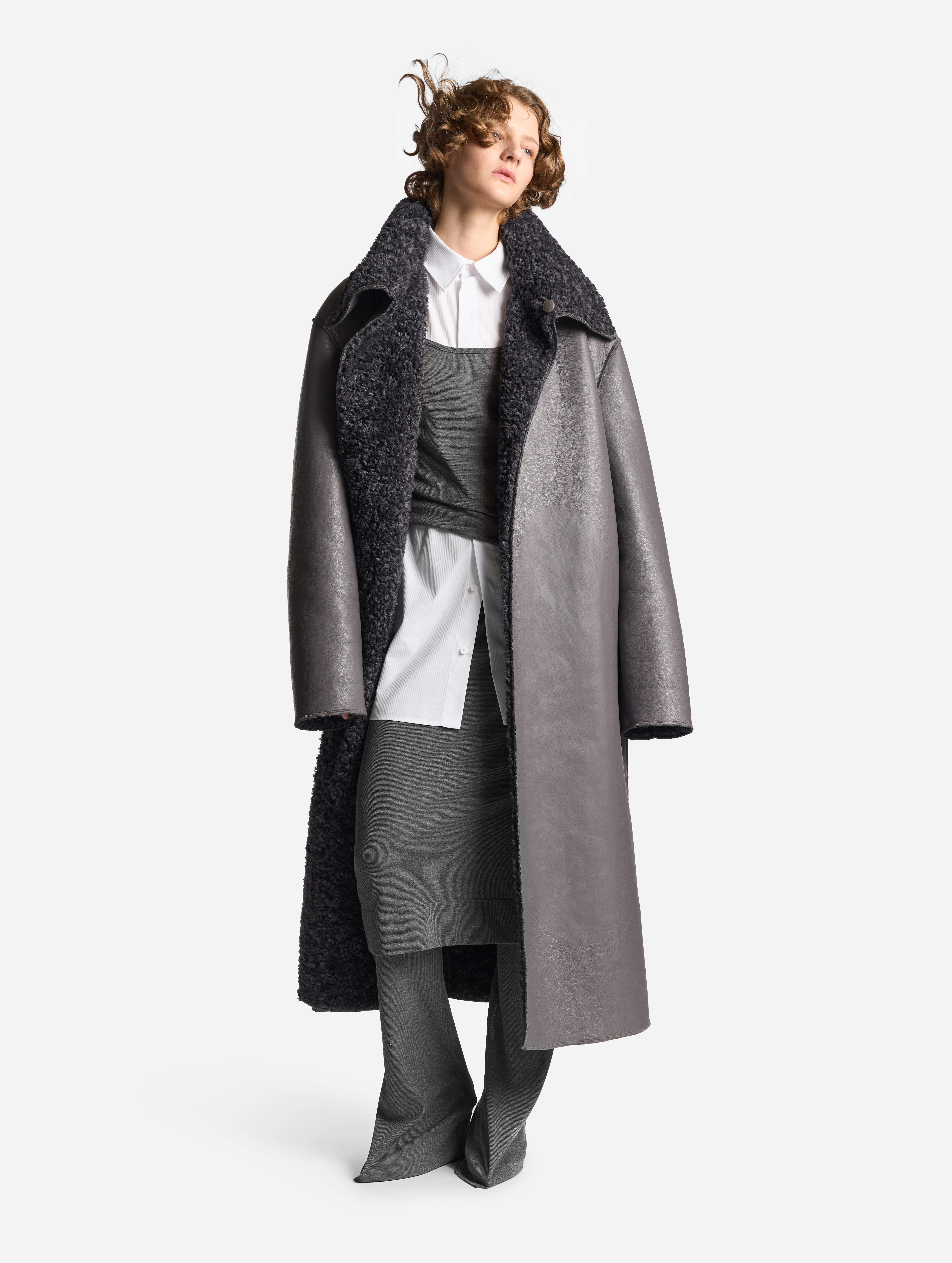 У дубленки расслабленная посадка и умеренный оверсайз-силуэт. Одна из ключевых особенностей этого изделия — мягкое, скатное плечо. В терминологии Ushatava оно называется humble shoulder, что в переводе с английского означает «скромный, смиренный, спокойный». Воротник апаш в поднятом виде надежно закрывает горло и шею, исключая необходимость в шарфе. Для сохранения минималистичного облика изделия мы использовали одну застежку на пуговицу, обтянутую экокожей. Есть два боковых кармана, которые сохраняют свою функциональность независимо от того, какой стороной надета дубленка.