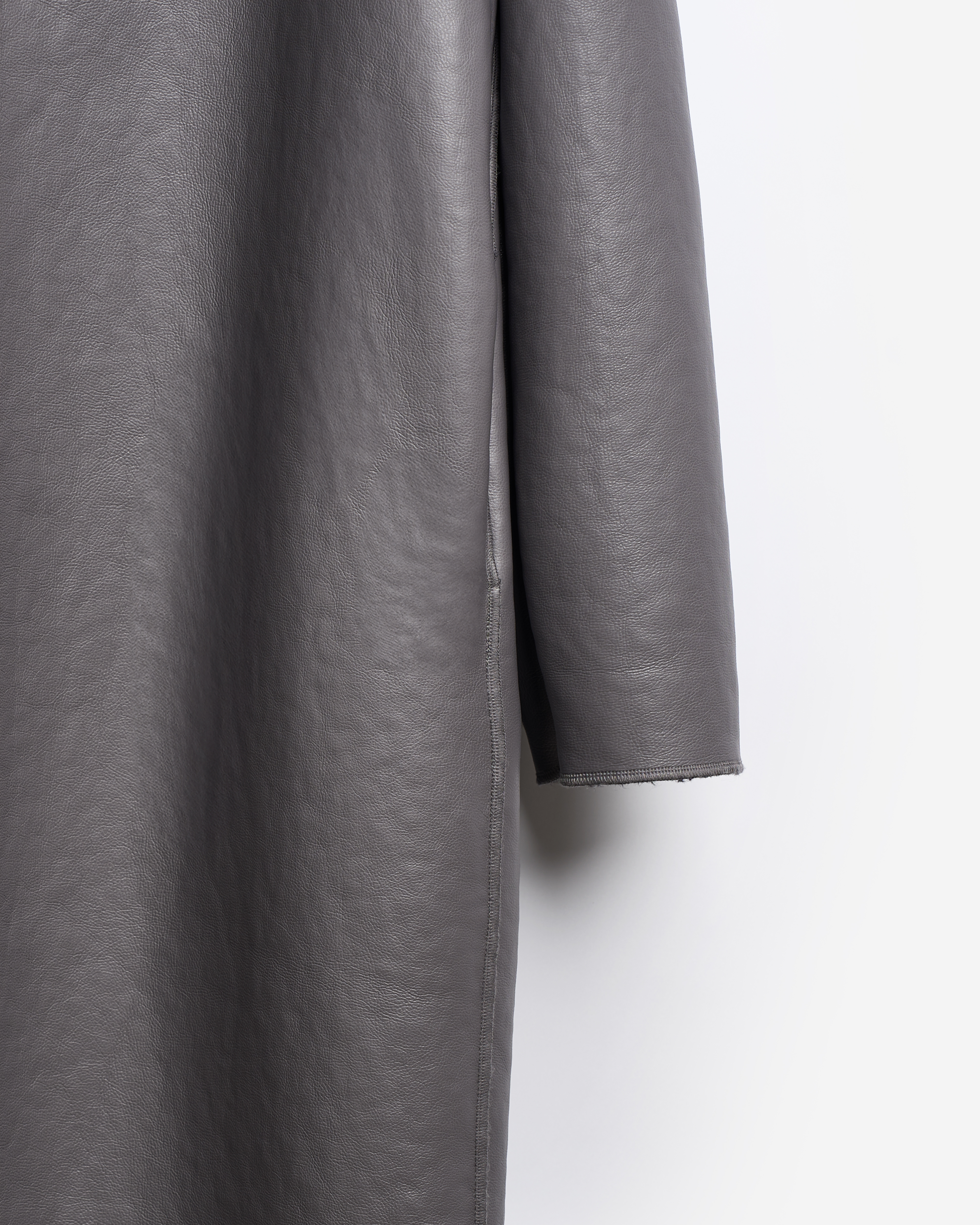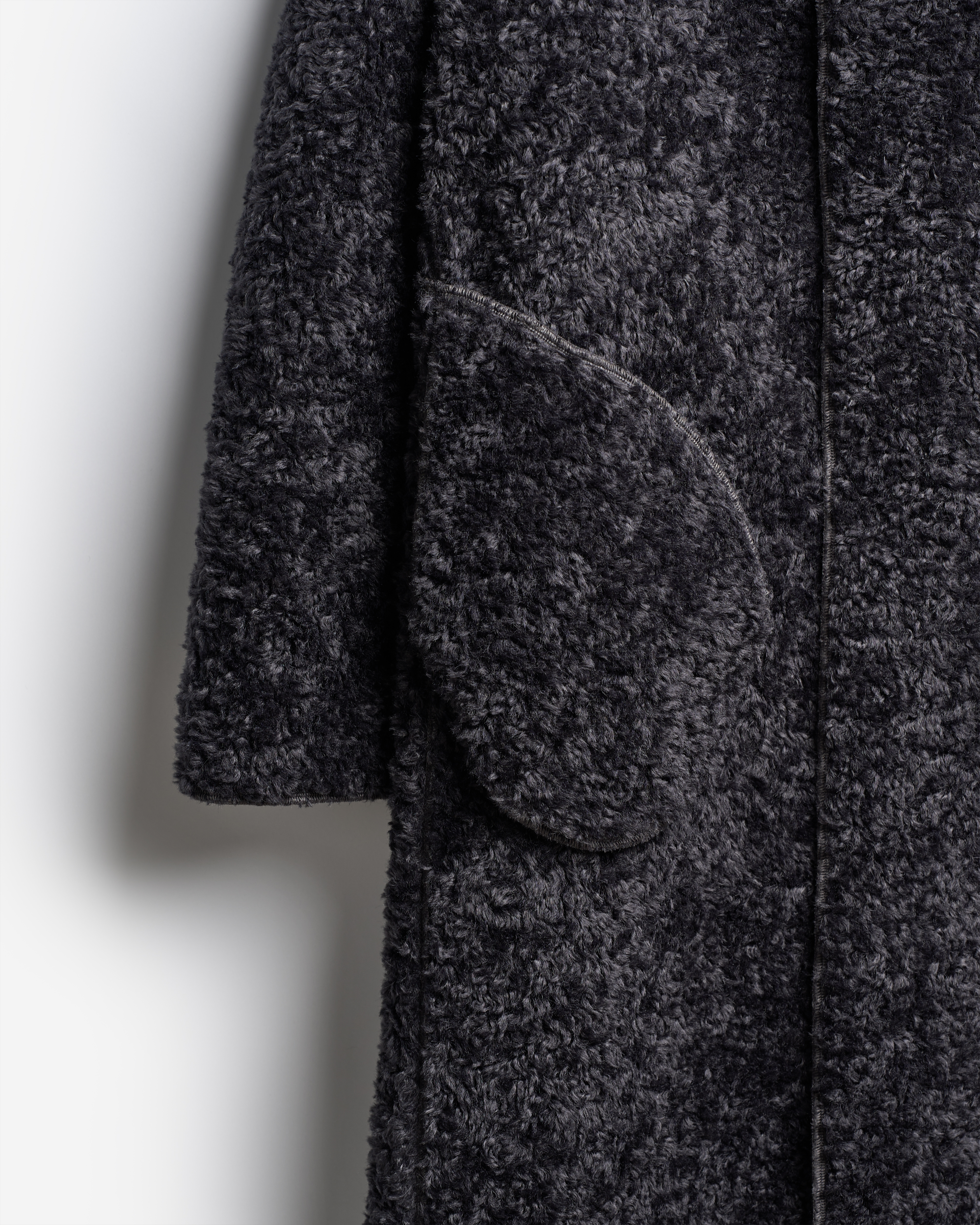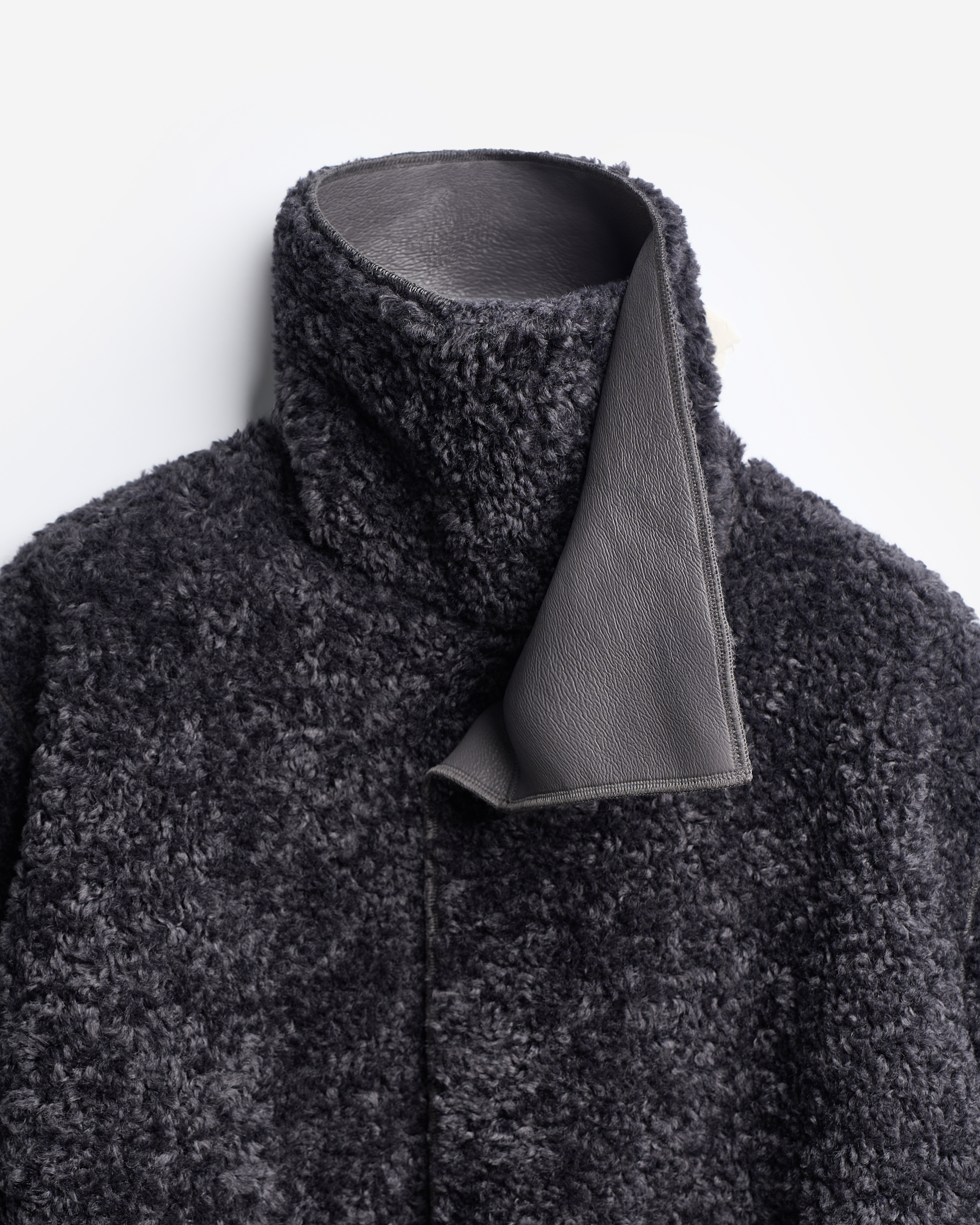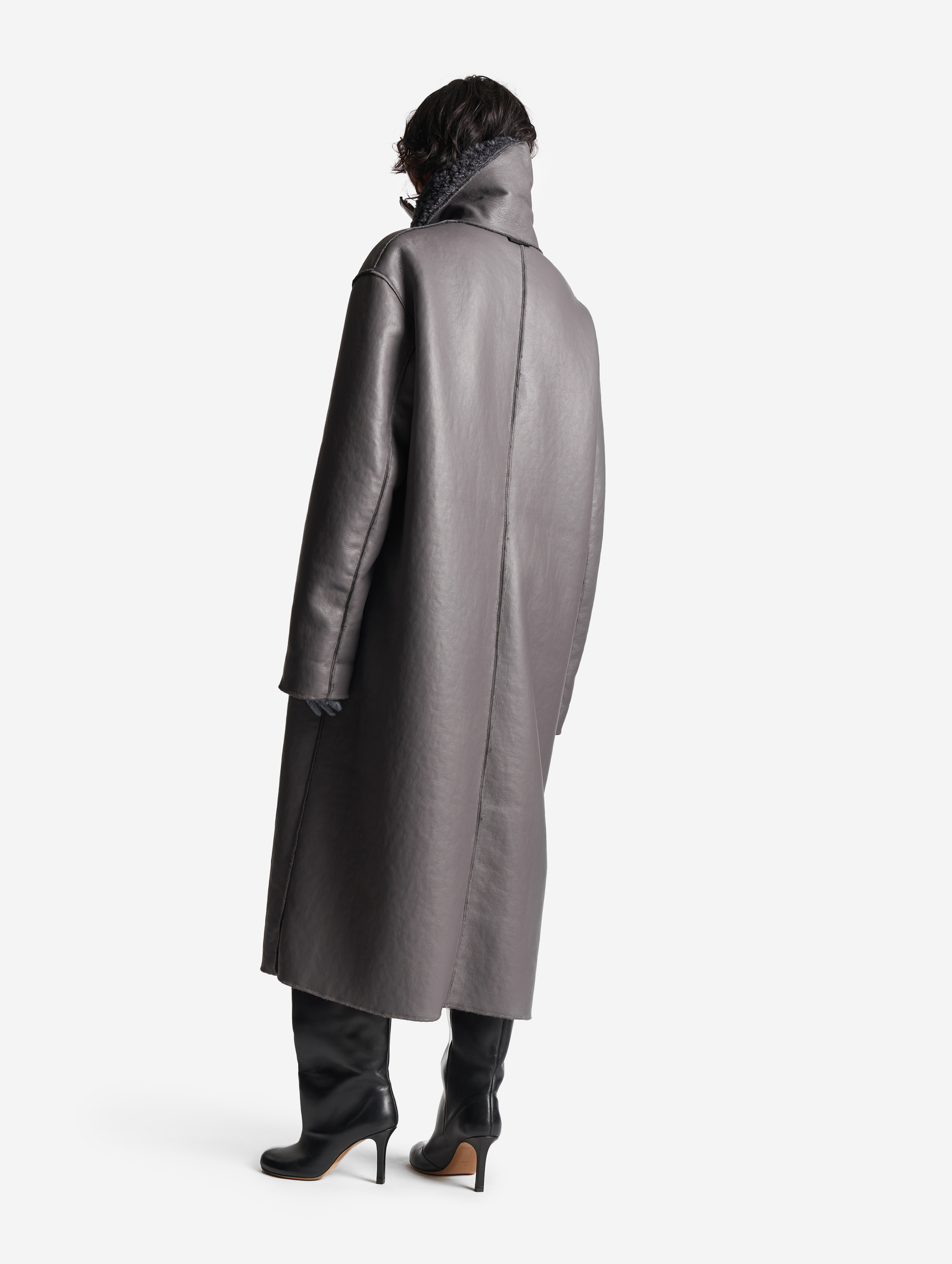 У дубленки расслабленная посадка и умеренный оверсайз-силуэт. Одна из ключевых особенностей этого изделия — мягкое, скатное плечо. В терминологии Ushatava оно называется humble shoulder, что в переводе с английского означает «скромный, смиренный, спокойный». Воротник апаш в поднятом виде надежно закрывает горло и шею, исключая необходимость в шарфе. Для сохранения минималистичного облика изделия мы использовали одну застежку на пуговицу, обтянутую экокожей. Есть два боковых кармана, которые сохраняют свою функциональность независимо от того, какой стороной надета дубленка.